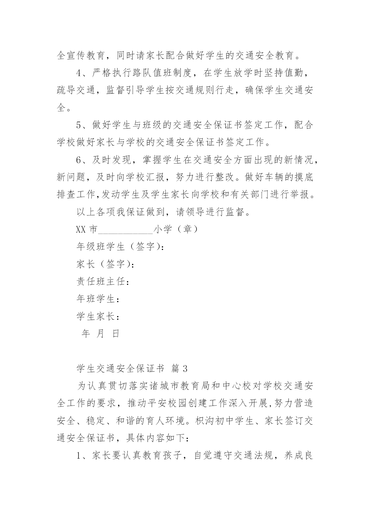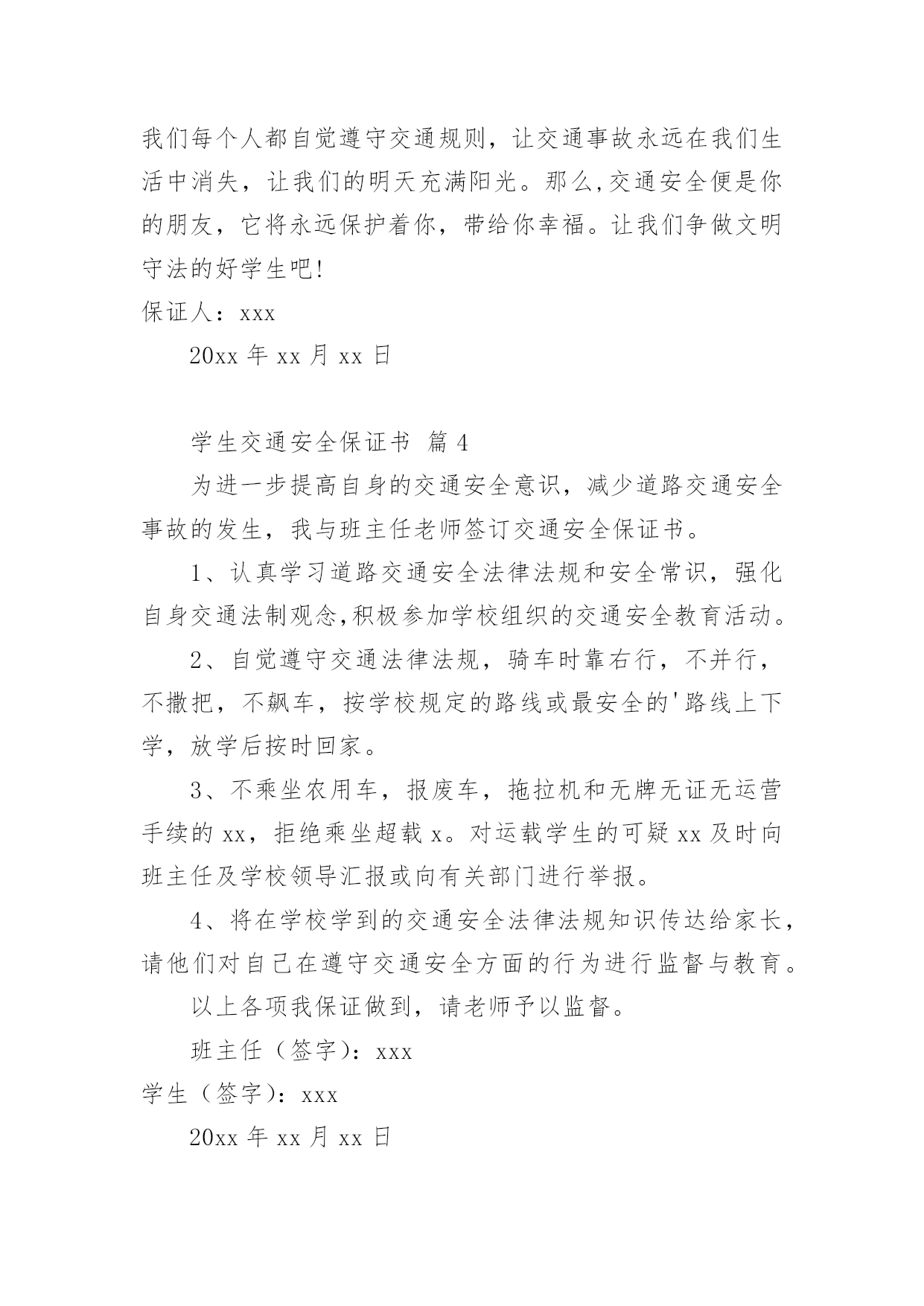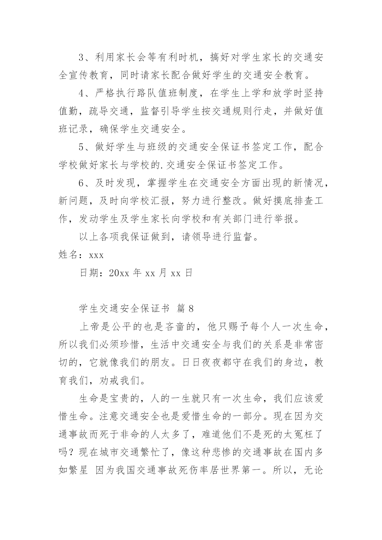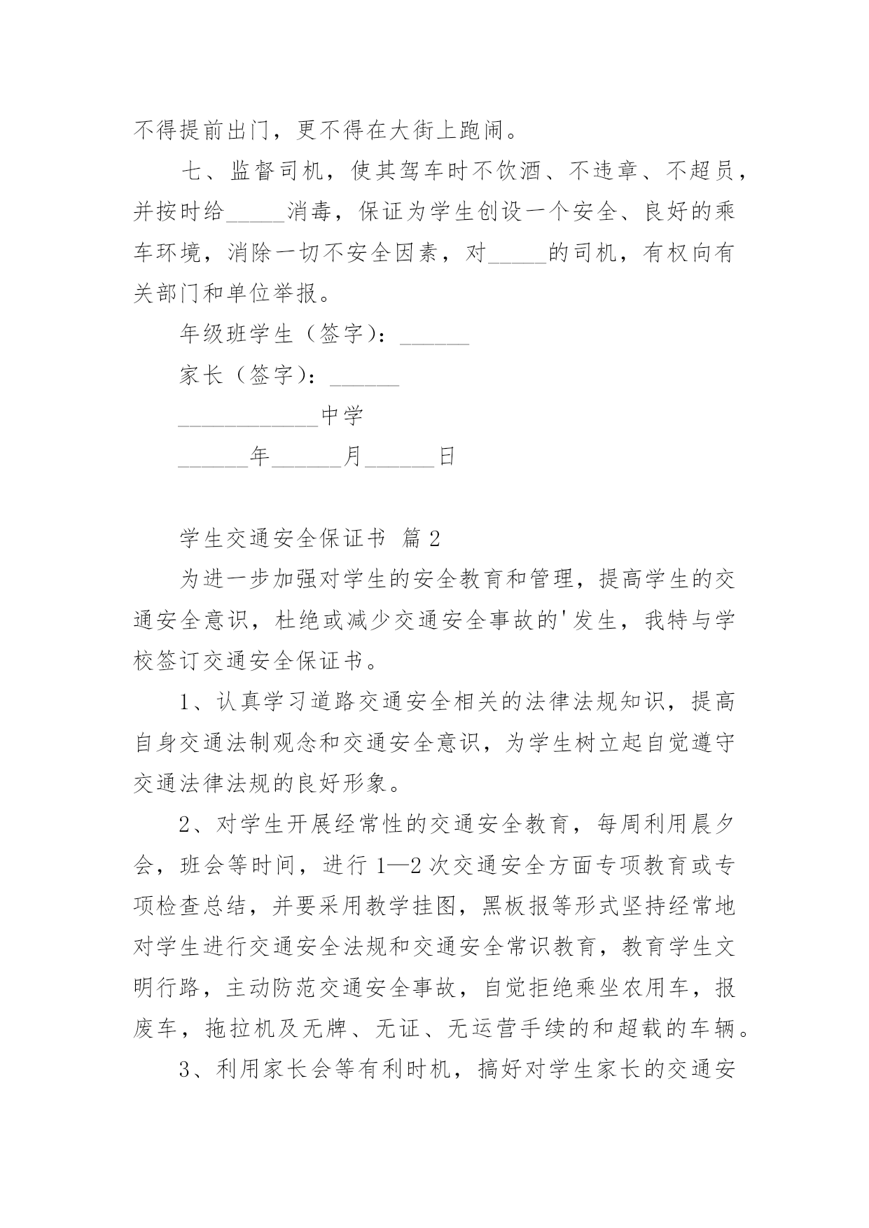 学生交通安全保证书学生交通安全保证书14篇随着社会一步步向前发展,我们使用保证书的情况越来越多,保证书一般是个人或单位在有所保证时向上级组织或集体发出的一种文书。你还在对写保证书感到一筹莫展吗?下面是小编为大家收集的学生交通安全保证书,仅供参考,大家一起来看看吧。学生交通安全保证书篇1为保证学生的交通安全,我保证做到:一、认真教育孩子,自觉遵守交通法规,养成良好的行为习惯、不在公路上踢球、游玩、戏闹。上学、放学时时处处注意交通安全。二、教育孩子乘车时要遵守秩序,注意乘车安全。三、作为孩子的第一监护人,我保证孩子不乘坐无标识、无证、无牌或不合手续的'报废车、农用车及个别私自组织的无运营手续的违规_____。否则发生问题,后果自负。四、教育孩子文明乘车,不拥挤,不抢座,不打架,自觉遵守乘车纪律,确保乘车期间的人身安全。五、现在个别接送学生的_____超员严重,保证自己的孩子不乘坐超员的_____。否则由此引发的各种问题,后果由自负。六、监督孩子在规定的时间内到指定的地点等车、坐车。不得提前出门,更不得在大街上跑闹。七、监督司机,使其驾车时不饮酒、不违章、不超员,并按时给_____消毒,保证为学生创设一个安全、良好的乘车环境,消除一切不安全因素,对_____的司机,有权向有关部门和单位举报。年级班学生(签字):______家长(签字):__________________中学______年______月______日学生交通安全保证书篇2为进一步加强对学生的安全教育和管理,提高学生的交通安全意识,杜绝或减少交通安全事故的'发生,我特与学校签订交通安全保证书。1、认真学习道路交通安全相关的法律法规知识,提高自身交通法制观念和交通安全意识,为学生树立起自觉遵守交通法律法规的良好形象。2、对学生开展经常性的交通安全教育,每周利用晨夕会,班会等时间,进行1—2次交通安全方面专项教育或专项检查总结,并要采用教学挂图,黑板报等形式坚持经常地对学生进行交通安全法规和交通安全常识教育,教育学生文明行路,主动防范交通安全事故,自觉拒绝乘坐农用车,报废车,拖拉机及无牌、无证、无运营手续的和超载的车辆。3、利用家长会等有利时机,搞好对学生家长的交通安全宣传教育,同时请家长配合做好学生的交通安全教育。4、严格执行路队值班制度,在学生放学时坚持值勤,疏导交通,监督引导学生按交通规则行走,确保学生交通安全。5、做好学生与班级的交通安全保证书签定工作,配合学校做好家长与学校的交通安全保证书签定工作。6、及时发现,掌握学生在交通安全方面出现的新情况,新问题,及时向学校汇报,努力进行整改。做好车辆的摸底排查工作,发动学生及学生家长向学校和有关部门进行举报。以上各项我保证做到,请领导进行监督。XX市___________小学(章)年级班学生(签字):家长(签字):责任班主任:年班学生:学生家长:年月日学生交通安全保证书篇3为认真贯切落实诸城市教育局和中心校对学校交通安全工作的要求,推动平安校园创建工作深入开展,努力营造安全、稳定、和谐的育人环境。枳沟初中学生、家长签订交通安全保证书,具体内容如下:1、家长要认真教育孩子,自觉遵守交通法规,养成良好的行为习惯.不在公路上踢球、游玩、戏闹。放学途中不准购物、串门、并排走,时时处处注意交通安全。2、教育孩子乘车时要遵守秩序,注意乘车安全。认真学习道路交通安全法律法规和安全常识,强化自身交通法制观念,积极参加学校组织的交通安全教育活动。3、家长作为孩子的第一监护人,必须保证孩子不乘坐农用车、报废车、拖拉机和无牌、无证或不合手续的.报废车及个别家长私自组织的无运营手续的违规车辆。4、家长要教育孩子文明乘车,不拥挤,不抢座,不打架,自觉遵守乘车纪律,确保乘车期间的人身安全。拒绝乘坐超载车辆。对运载学生的可疑车辆及时向班主任及学校领导汇报或向有关部门进行举报。5、家长要督促孩子准时上学,学生不能乘车,但有条件的家长可亲自接送,学校严禁学生独自骑自行车上学。如果家长违背学校规定,纵容学生违纪、独自骑自行车上学,那么发生的一切问题均有家长负责。6、自觉遵守交通法律法规,骑车时靠右行,不并行,不撒把,不飙车,按学校规定的路线或最安全的路线上下学,放学后按时回家。7、家长有权监督司机,使其驾车时不饮酒、不违章、不超员,保证为学生创设一个安全、良好的乘车环境,消除一切不安全因素,对违纪的司机,家长有权向有关部门和单位举报。让我们把“交通安全”这四个字在心里永远扎下根,让我们每个人都自觉遵守交通规则,让交通事故永远在我们生活中消失,让我们的明天充满阳光。那么,交通安全便是你的朋友,它将永远保护着你,带给你幸福。让我们争做文明守法的好学生吧!保证人:xxx20xx年xx月xx日学生交通安全保证书篇4为进一步提高自身的交通安全意识,减少道路交通
