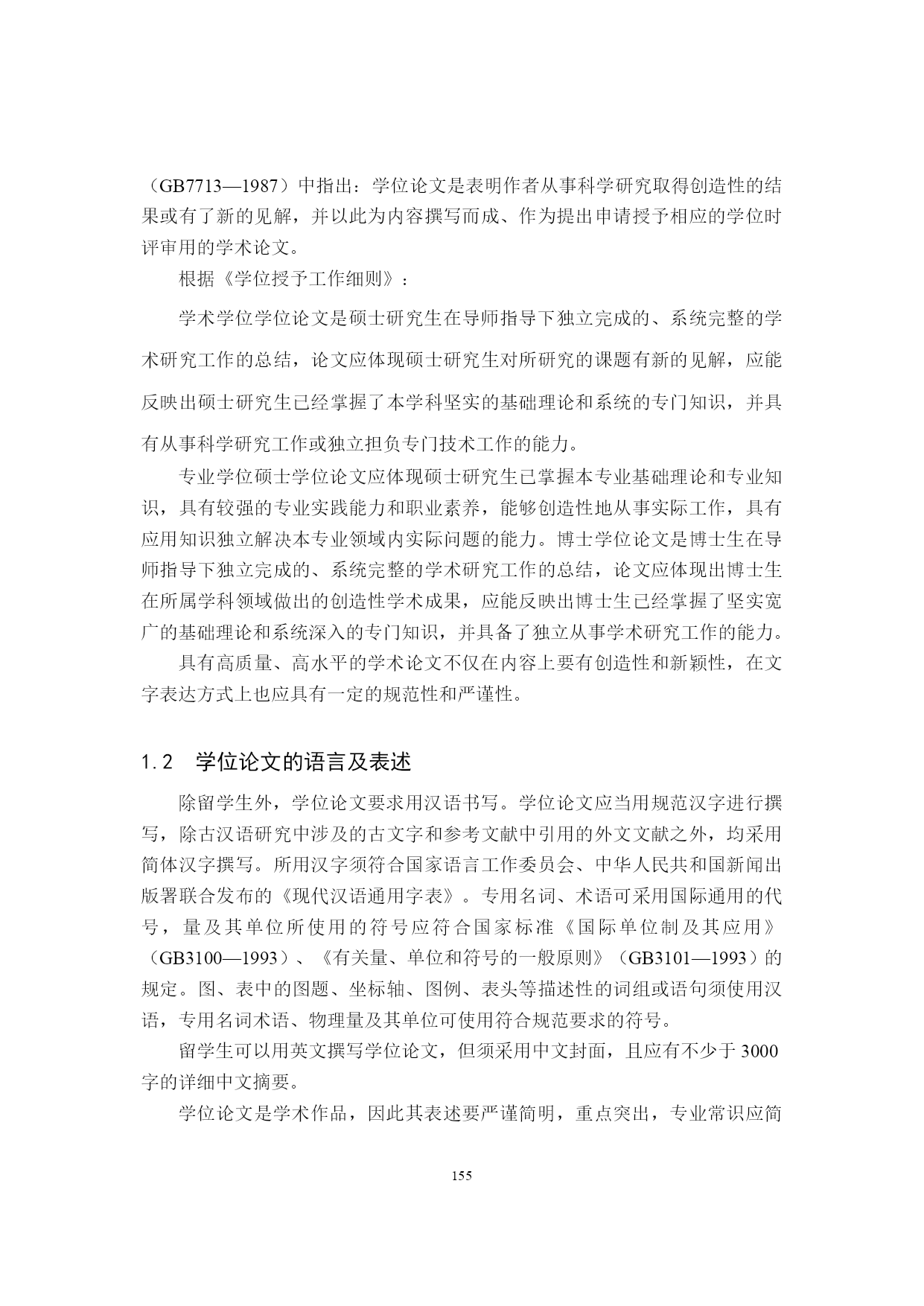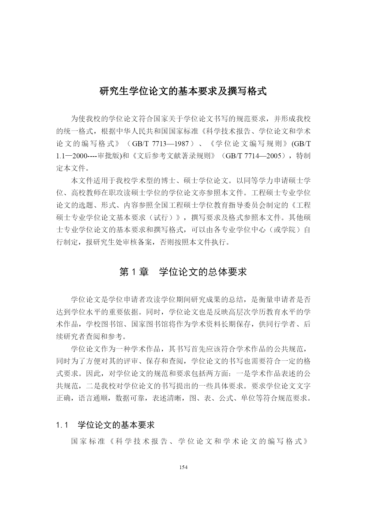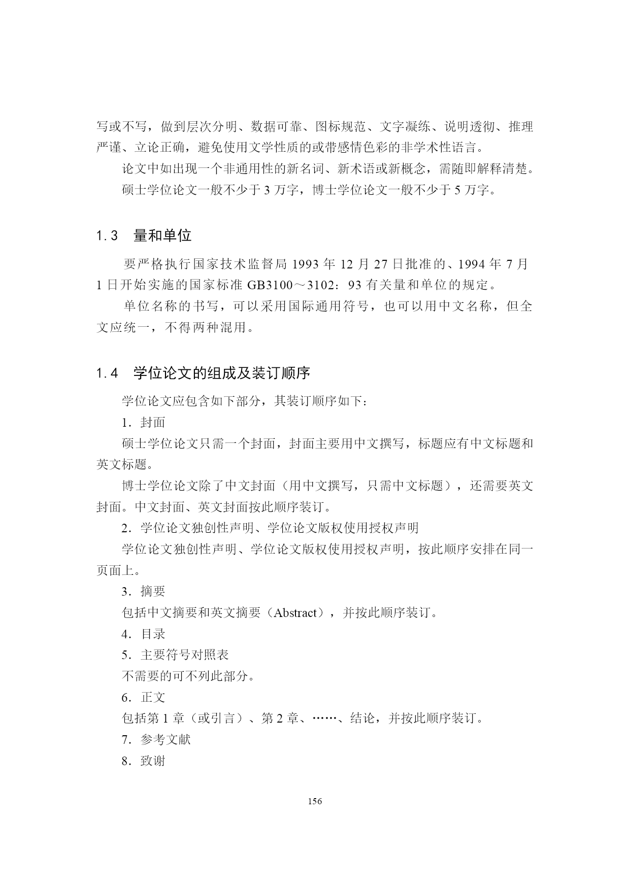 华侨大学研究生学位论文的基本要求及撰写格式PAGE154PAGE181研究生学位论文的基本要求及撰写格式为使我校的学位论文符合国家关于学位论文书写的规范要求,并形成我校的统一格式,根据中华人民共和国国家标准《科学技术报告、学位论文和学术论文的编写格式》(GB/T7713—1987)、《学位论文编写规则》(GB/T1.1—2000----审批版)和《文后参考文献著录规则》(GB/T7714—2005),特制定本文件。本文件适用于我校学术型的博士、硕士学位论文。以同等学力申请硕士学位、高校教师在职攻读硕士学位的学位论文亦参照本文件。工程硕士专业学位论文的选题、形式、内容参照全国工程硕士学位教育指导委员会制定的《工程硕士专业学位论文基本要求(试行)》,撰写要求及格式参照本文件。其他硕士专业学位论文的基本要求和撰写格式,可以由各专业学位中心(或学院)自行制定,报研究生处审核备案,否则按照本文件执行。第1章学位论文的总体要求学位论文是学位申请者攻读学位期间研究成果的总结,是衡量申请者是否达到学位水平的重要依据。同时,学位论文也是反映高层次学历教育水平的学术作品,学校图书馆、国家图书馆将作为学术资料长期保存,供同行学者、后续研究者查阅和参考。学位论文作为一种学术作品,其书写首先应该符合学术作品的公共规范,同时为了方便对其的评审、保存和查阅,学位论文的书写也需要符合一定的格式要求。因此,对学位论文的规范和要求包括两方面:一是学术作品表述的公共规范,二是我校对学位论文的书写提出的一些具体要求。要求学位论文文字正确,语言通顺,数据可靠,表述清晰,图、表、公式、单位等符合规范要求。1.1学位论文的基本要求国家标准《科学技术报告、学位论文和学术论文的编写格式》(GB7713—1987)中指出:学位论文是表明作者从事科学研究取得创造性的结果或有了新的见解,并以此为内容撰写而成、作为提出申请授予相应的学位时评审用的学术论文。根据《学位授予工作细则》:学术学位学位论文是硕士研究生在导师指导下独立完成的、系统完整的学术研究工作的总结,论文应体现硕士研究生对所研究的课题有新的见解,应能反映出硕士研究生已经掌握了本学科坚实的基础理论和系统的专门知识,并具有从事科学研究工作或独立担负专门技术工作的能力。专业学位硕士学位论文应体现硕士研究生已掌握本专业基础理论和专业知识,具有较强的专业实践能力和职业素养,能够创造性地从事实际工作,具有应用知识独立解决本专业领域内实际问题的能力。博士学位论文是博士生在导师指导下独立完成的、系统完整的学术研究工作的总结,论文应体现出博士生在所属学科领域做出的创造性学术成果,应能反映出博士生已经掌握了坚实宽广的基础理论和系统深入的专门知识,并具备了独立从事学术研究工作的能力。具有高质量、高水平的学术论文不仅在内容上要有创造性和新颖性,在文字表达方式上也应具有一定的规范性和严谨性。1.2学位论文的语言及表述除留学生外,学位论文要求用汉语书写。学位论文应当用规范汉字进行撰写,除古汉语研究中涉及的古文字和参考文献中引用的外文文献之外,均采用简体汉字撰写。所用汉字须符合国家语言工作委员会、中华人民共和国新闻出版署联合发布的《现代汉语通用字表》。专用名词、术语可采用国际通用的代号,量及其单位所使用的符号应符合国家标准《国际单位制及其应用》(GB3100—1993)、《有关量、单位和符号的一般原则》(GB3101—1993)的规定。图、表中的图题、坐标轴、图例、表头等描述性的词组或语句须使用汉语,专用名词术语、物理量及其单位可使用符合规范要求的符号。留学生可以用英文撰写学位论文,但须采用中文封面,且应有不少于3000字的详细中文摘要。学位论文是学术作品,因此其表述要严谨简明,重点突出,专业常识应简写或不写,做到层次分明、数据可靠、图标规范、文字凝练、说明透彻、推理严谨、立论正确,避免使用文学性质的或带感情色彩的非学术性语言。论文中如出现一个非通用性的新名词、新术语或新概念,需随即解释清楚。硕士学位论文一般不少于3万字,博士学位论文一般不少于5万字。1.3量和单位要严格执行国家技术监督局1993年12月27日批准的、1994年7月1日开始实施的国家标准GB3100~3102:93有关量和单位的规定。单位名称的书写,可以采用国际通用符号,也可以用中文名称,但全文应统一,不得两种混用。1.4学位论文的组成及装订顺序学位论文应包含如下部分,其装订顺序如下:1.封面硕士学位论文只需一个封面,封面主要用中文撰写,标题应有中文标题和英文标题。博士学位论文除了中文封面(用中文撰写,只需中文标题),还需要英文封面。中文封面、英文封面按此顺序装订。2.学位论文独创性声明、学位论文版权使用授权声明