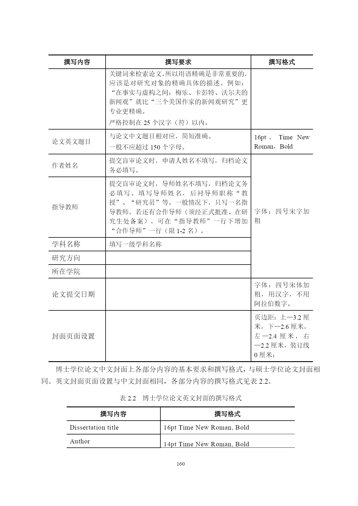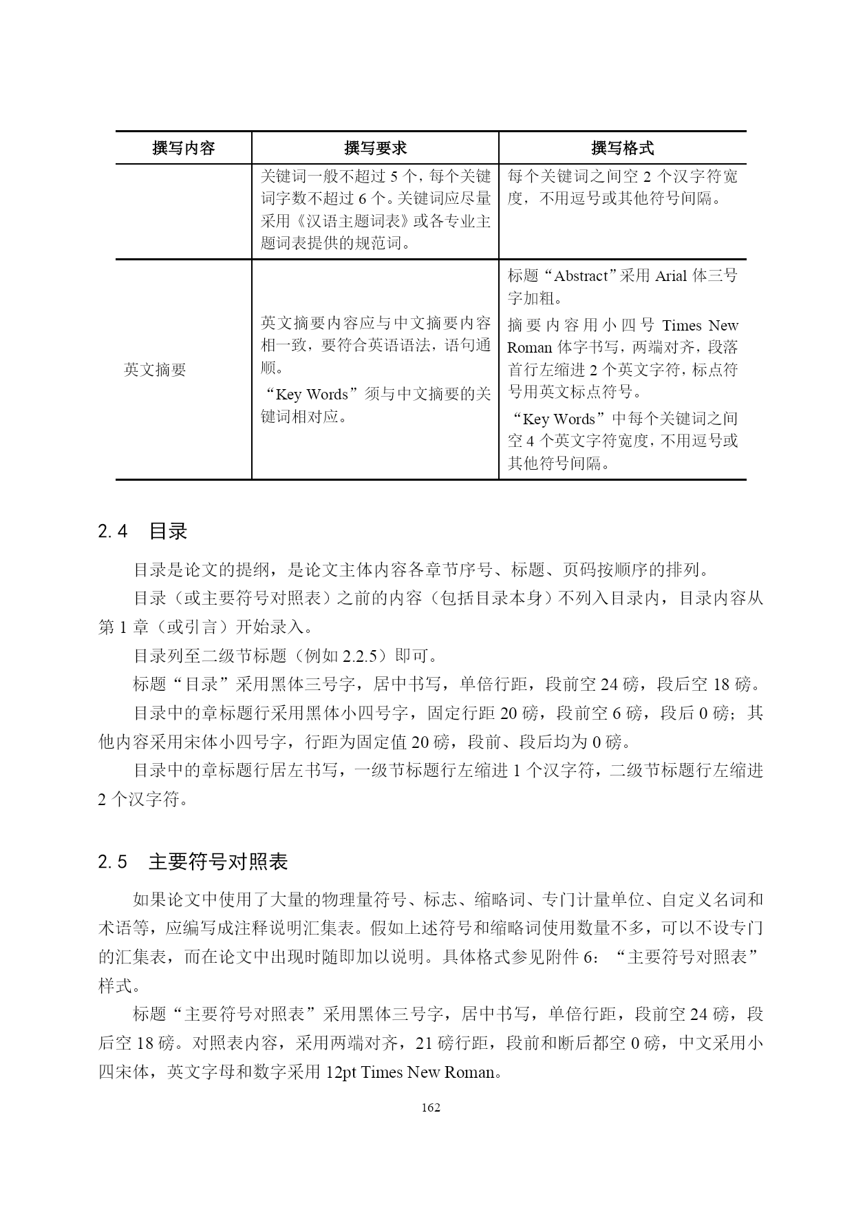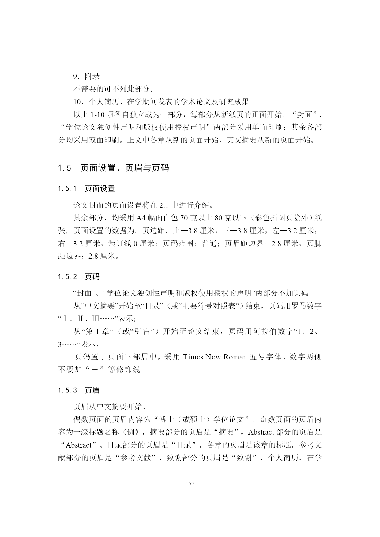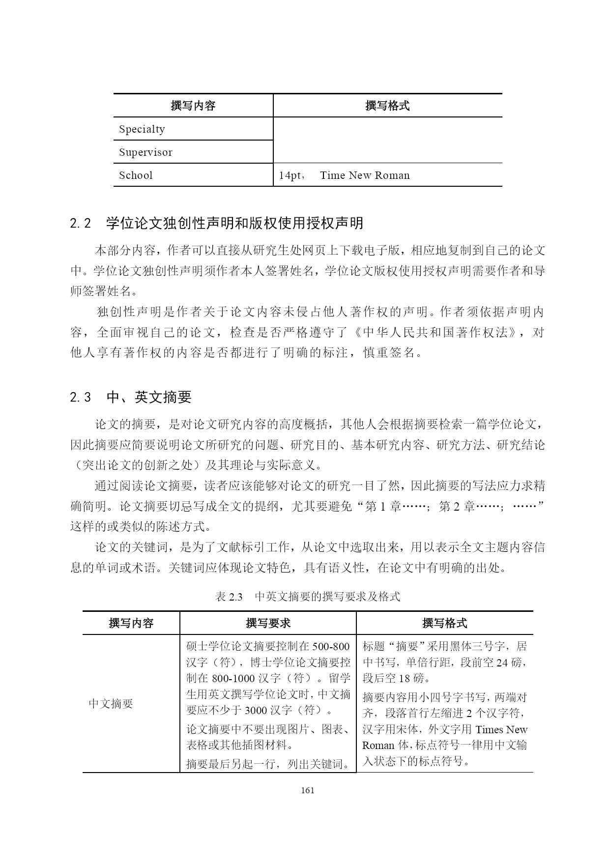 华侨大学研究生学位论文的基本要求及撰写格式PAGE154PAGE181研究生学位论文的基本要求及撰写格式为使我校的学位论文符合国家关于学位论文书写的规范要求,并形成我校的统一格式,根据中华人民共和国国家标准《科学技术报告、学位论文和学术论文的编写格式》(GB/T7713—1987)、《学位论文编写规则》(GB/T1.1—2000----审批版)和《文后参考文献著录规则》(GB/T7714—2005),特制定本文件。本文件适用于我校学术型的博士、硕士学位论文。以同等学力申请硕士学位、高校教师在职攻读硕士学位的学位论文亦参照本文件。工程硕士专业学位论文的选题、形式、内容参照全国工程硕士学位教育指导委员会制定的《工程硕士专业学位论文基本要求(试行)》,撰写要求及格式参照本文件。其他硕士专业学位论文的基本要求和撰写格式,可以由各专业学位中心(或学院)自行制定,报研究生处审核备案,否则按照本文件执行。第1章学位论文的总体要求学位论文是学位申请者攻读学位期间研究成果的总结,是衡量申请者是否达到学位水平的重要依据。同时,学位论文也是反映高层次学历教育水平的学术作品,学校图书馆、国家图书馆将作为学术资料长期保存,供同行学者、后续研究者查阅和参考。学位论文作为一种学术作品,其书写首先应该符合学术作品的公共规范,同时为了方便对其的评审、保存和查阅,学位论文的书写也需要符合一定的格式要求。因此,对学位论文的规范和要求包括两方面:一是学术作品表述的公共规范,二是我校对学位论文的书写提出的一些具体要求。要求学位论文文字正确,语言通顺,数据可靠,表述清晰,图、表、公式、单位等符合规范要求。1.1学位论文的基本要求国家标准《科学技术报告、学位论文和学术论文的编写格式》(GB7713—1987)中指出:学位论文是表明作者从事科学研究取得创造性的结果或有了新的见解,并以此为内容撰写而成、作为提出申请授予相应的学位时评审用的学术论文。根据《学位授予工作细则》:学术学位学位论文是硕士研究生在导师指导下独立完成的、系统完整的学术研究工作的总结,论文应体现硕士研究生对所研究的课题有新的见解,应能反映出硕士研究生已经掌握了本学科坚实的基础理论和系统的专门知识,并具有从事科学研究工作或独立担负专门技术工作的能力。专业学位硕士学位论文应体现硕士研究生已掌握本专业基础理论和专业知识,具有较强的专业实践能力和职业素养,能够创造性地从事实际工作,具有应用知识独立解决本专业领域内实际问题的能力。博士学位论文是博士生在导师指导下独立完成的、系统完整的学术研究工作的总结,论文应体现出博士生在所属学科领域做出的创造性学术成果,应能反映出博士生已经掌握了坚实宽广的基础理论和系统深入的专门知识,并具备了独立从事学术研究工作的能力。具有高质量、高水平的学术论文不仅在内容上要有创造性和新颖性,在文字表达方式上也应具有一定的规范性和严谨性。1.2学位论文的语言及表述除留学生外,学位论文要求用汉语书写。学位论文应当用规范汉字进行撰写,除古汉语研究中涉及的古文字和参考文献中引用的外文文献之外,均采用简体汉字撰写。所用汉字须符合国家语言工作委员会、中华人民共和国新闻出版署联合发布的《现代汉语通用字表》。专用名词、术语可采用国际通用的代号,量及其单位所使用的符号应符合国家标准《国际单位制及其应用》(GB3100—1993)、《有关量、单位和符号的一般原则》(GB3101—1993)的规定。图、表中的图题、坐标轴、图例、表头等描述性的词组或语句须使用汉语,专用名词术语、物理量及其单位可使用符合规范要求的符号。留学生可以用英文撰写学位论文,但须采用中文封面,且应有不少于3000字的详细中文摘要。学位论文是学术作品,因此其表述要严谨简明,重点突出,专业常识应简写或不写,做到层次分明、数据可靠、图标规范、文字凝练、说明透彻、推理严谨、立论正确,避免使用文学性质的或带感情色彩的非学术性语言。论文中如出现一个非通用性的新名词、新术语或新概念,需随即解释清楚。硕士学位论文一般不少于3万字,博士学位论文一般不少于5万字。1.3量和单位要严格执行国家技术监督局1993年12月27日批准的、1994年7月1日开始实施的国家标准GB3100~3102:93有关量和单位的规定。单位名称的书写,可以采用国际通用符号,也可以用中文名称,但全文应统一,不得两种混用。1.4学位论文的组成及装订顺序学位论文应包含如下部分,其装订顺序如下:1.封面硕士学位论文只需一个封面,封面主要用中文撰写,标题应有中文标题和英文标题。博士学位论文除了中文封面(用中文撰写,只需中文标题),还需要英文封面。中文封面、英文封面按此顺序装订。2.学位论文独创性声明、学位论文版权使用授权声明