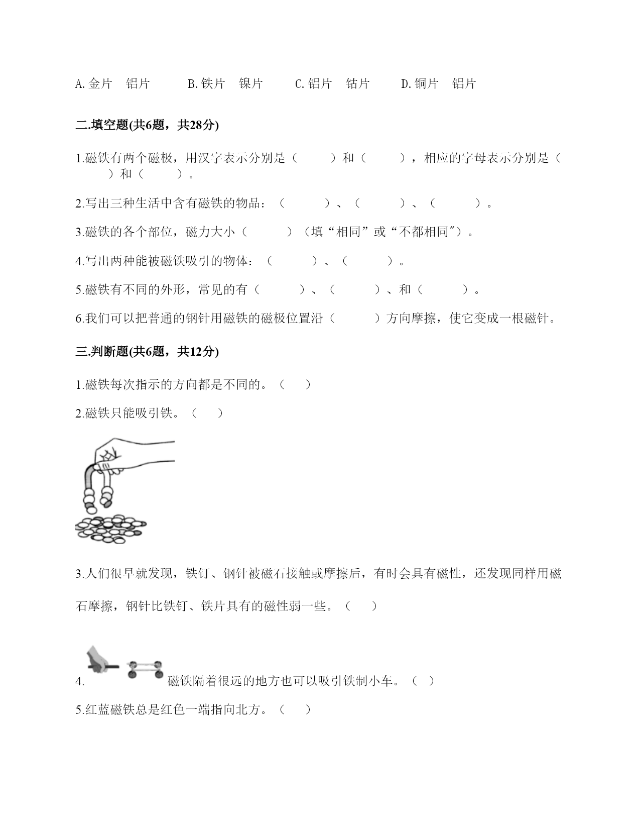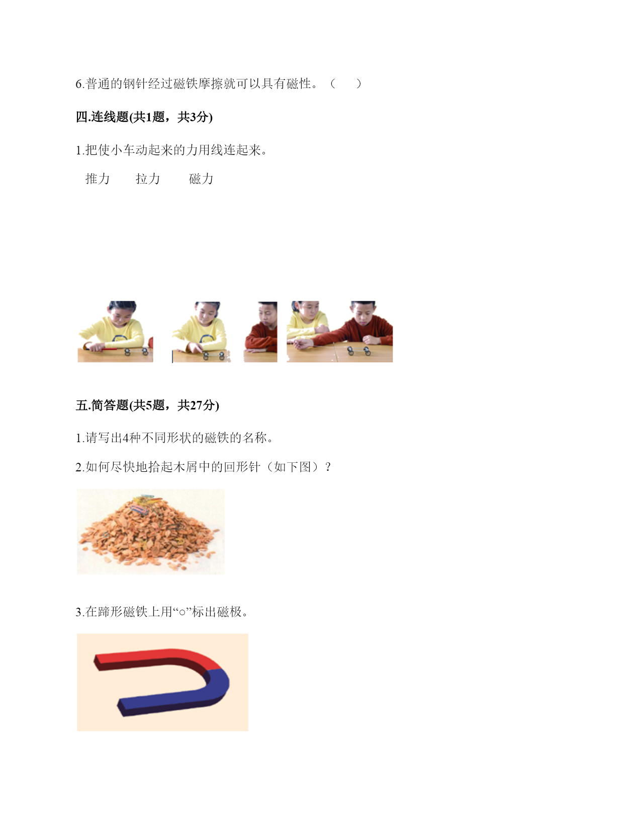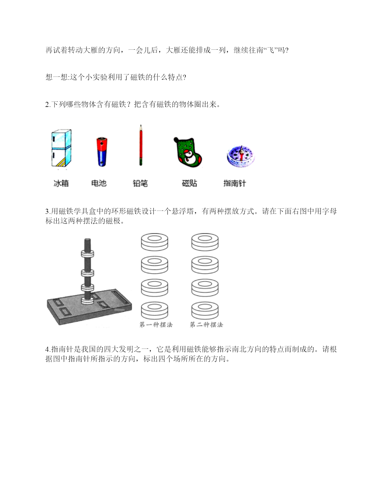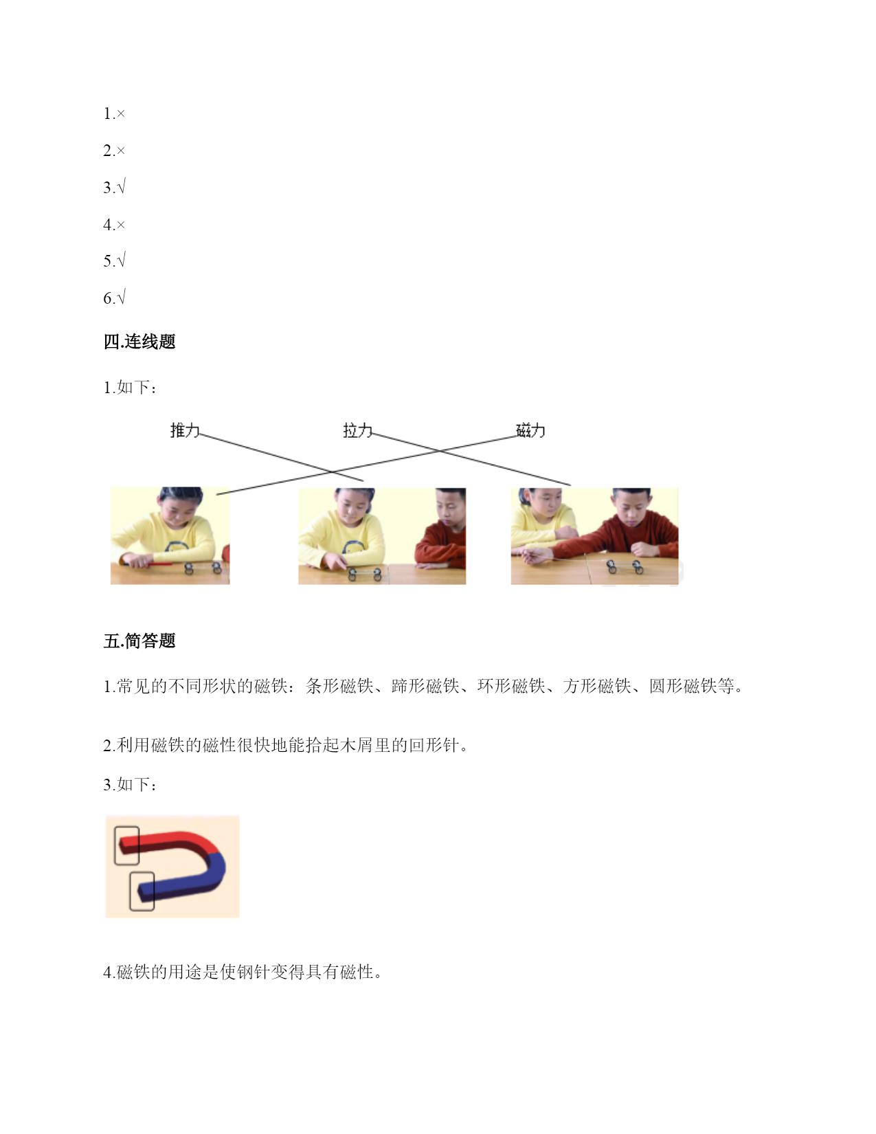 小学科学《磁铁》练习题一.选择题(共6题,共12分)1.现在很多门都会装上门吸,门吸利用的是磁铁磁极间()的性质。A.同极相互排斥B.异极相互吸引C.异极相互排斥2.天琪先用纸片和回形针做了一个小鸭子,然后用磁铁在纸板下方让小鸭子“游泳”,如图所示,这个实验说明磁铁()。A.有魔力B.能吸引纸板C.隔着纸板也能吸引物体3.把一颗小钢珠放在磁性比较强的蹄形磁铁上,松开手,可能发生的现象是()。A.小钢珠不动B.小钢珠会掉下来C.小钢珠会滚向蹄形磁铁的磁极部位4.冰箱门里安装磁铁,起的作用是()。A.既可以吸住又方便开关B.牢牢吸住C.防止食物变质5.磁力黑板擦(如图)的发明,利用了()。A.磁铁能指示方向的特点B.磁极相互排斥的原理C.磁铁可以吸引铁的性质6.下列物体中,磁铁能够吸引的一组是()。A.金片铝片B.铁片镍片C.铝片钴片D.铜片铝片二.填空题(共6题,共28分)1.磁铁有两个磁极,用汉字表示分别是()和(),相应的字母表示分别是()和()。2.写出三种生活中含有磁铁的物品:()、()、()。3.磁铁的各个部位,磁力大小()(填“相同”或“不都相同")。4.写出两种能被磁铁吸引的物体:()、()。5.磁铁有不同的外形,常见的有()、()、和()。6.我们可以把普通的钢针用磁铁的磁极位置沿()方向摩擦,使它变成一根磁针。三.判断题(共6题,共12分)1.磁铁每次指示的方向都是不同的。()2.磁铁只能吸引铁。()3.人们很早就发现,铁钉、钢针被磁石接触或摩擦后,有时会具有磁性,还发现同样用磁石摩擦,钢针比铁钉、铁片具有的磁性弱一些。()4.磁铁隔着很远的地方也可以吸引铁制小车。()5.红蓝磁铁总是红色一端指向北方。()6.普通的钢针经过磁铁摩擦就可以具有磁性。()四.连线题(共1题,共3分)1.把使小车动起来的力用线连起来。推力拉力磁力五.简答题(共5题,共27分)1.请写出4种不同形状的磁铁的名称。2.如何尽快地拾起木屑中的回形针(如下图)?3.在蹄形磁铁上用“○”标出磁极。4.在制作水浮式指南针时,我们会用到一块磁铁,请问磁铁的用途是什么?5.我们在游乐场会看到有卖向上漂浮的气球,这是因为里面装入了比空气轻的氢气或氦气,你能用磁铁的原理代替氢气做出漂浮气球的效果吗?(请想一想,画出你的设计想法)六.综合题(共5题,共32分)1.深秋季节,你看到过大雁南飞的景象吗?原来,大雁南飞也与“磁”有关。在大雁的身体里,有一套天然的“地磁导航系统”。利用磁铁,我们可以模拟大雁南飞。实验材料:条形磁铁3块,棉线3根,纸、笔、剪刀、双面胶等。实验过程:①剪。在纸上画3只大雁,并用剪刀剪下。②贴。把系着棉线的条形磁铁粘在大雁的反面。S极朝着大雁的头部。③挂。把制作好的大雁挂起来,观察大雁的头是不是朝向南方。④排。把制作好的3只大雁排成一列。静止后,大雁们是不是都朝着南方“飞行”了?再试着转动大雁的方向,一会儿后,大雁还能排成一列,继续往南“飞”吗?想一想:这个小实验利用了磁铁的什么特点?2.下列哪些物体含有磁铁?把含有磁铁的物体圈出来。3.用磁铁学具盒中的环形磁铁设计一个悬浮塔,有两种摆放方式。请在下面右图中用字母标出这两种摆法的磁极。4.指南针是我国的四大发明之一,它是利用磁铁能够指示南北方向的特点而制成的。请根据图中指南针所指示的方向,标出四个场所所在的方向。游泳馆()学校()邮局()书店()5.子枫想用钢针制作一个指南针,他的操作过程如下图所示,请仔细观察,并解决问题。1.如图所示的步骤叫做()。A.消磁B.磁化C.加磁2.制作磁针时,要用磁铁的磁极位置在钢针上()。A.来回反复摩擦B.沿一个方向反复摩擦C.先沿一个方向摩擦几次,再沿反方向摩擦几次3.制作磁针时,用磁铁的()在钢针上反复摩擦。A.一个磁极B.两个磁极C.中间部位4.如图是子枫在()。A.固定钢针B.测试钢针的磁性如图是子枫在用真正的指南针()。A.确定方向B.测量方向参考答案一.选择题1.B2.C3.C4.A5.C6.B二.填空题1.南极;北极;S;N2.冰箱门;磁力扣;门吸3.不都相同4.回形针;一元硬币5.条形磁铁;蹄形磁铁;环形磁铁6.一个三.判断题1.×2.×3.√4.×5.√6.√四.连线题1.如下:五.简答题1.常见的不同形状的磁铁:条形磁铁、蹄形磁铁、环形磁铁、方形磁铁、圆形磁铁等。2.利用磁铁的磁性很快地能拾起木屑里的回形针。3.如下:4.磁铁的用途是使钢针变得具有磁性。5.在气球顶上粘一个回形针,在气球上方的盒子上粘一块磁铁,让气球
