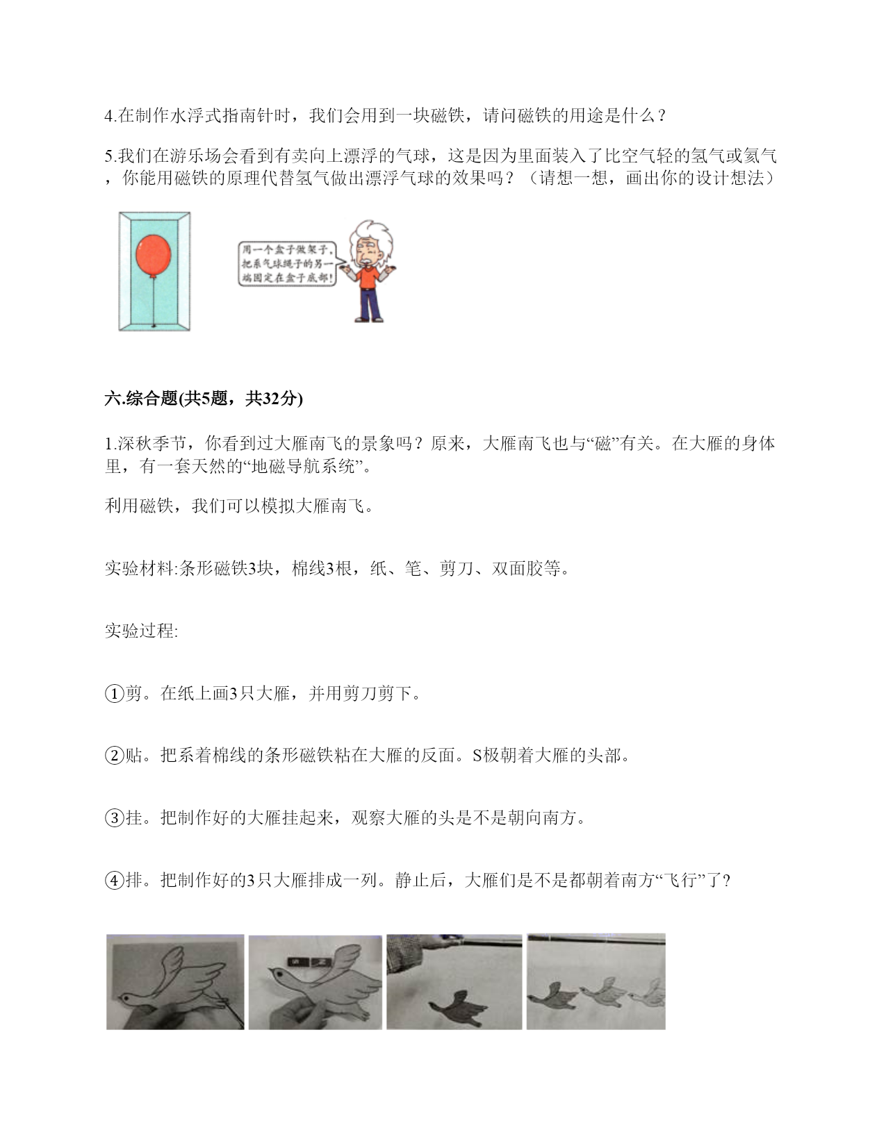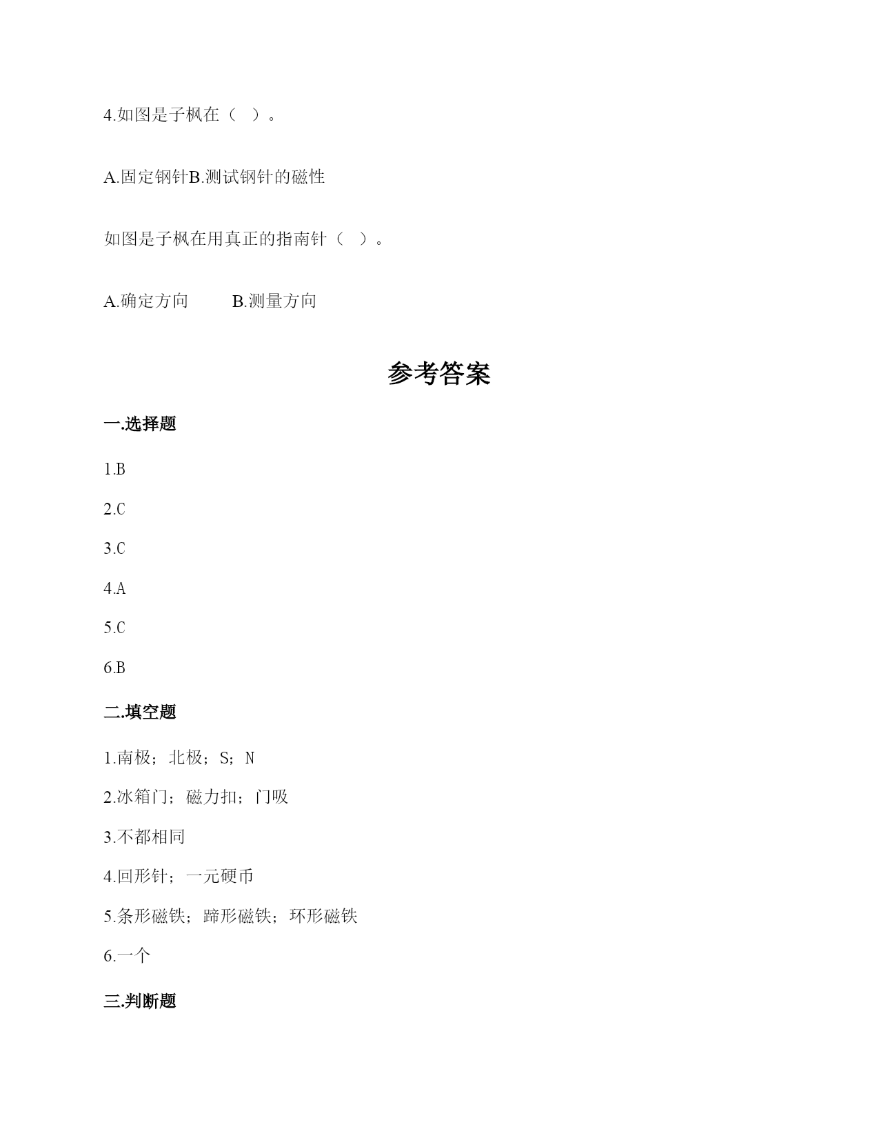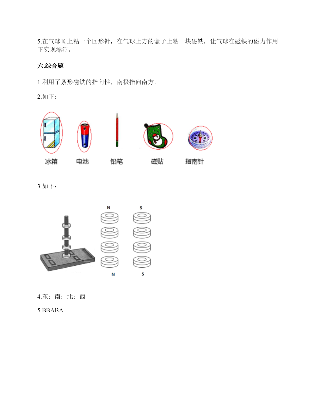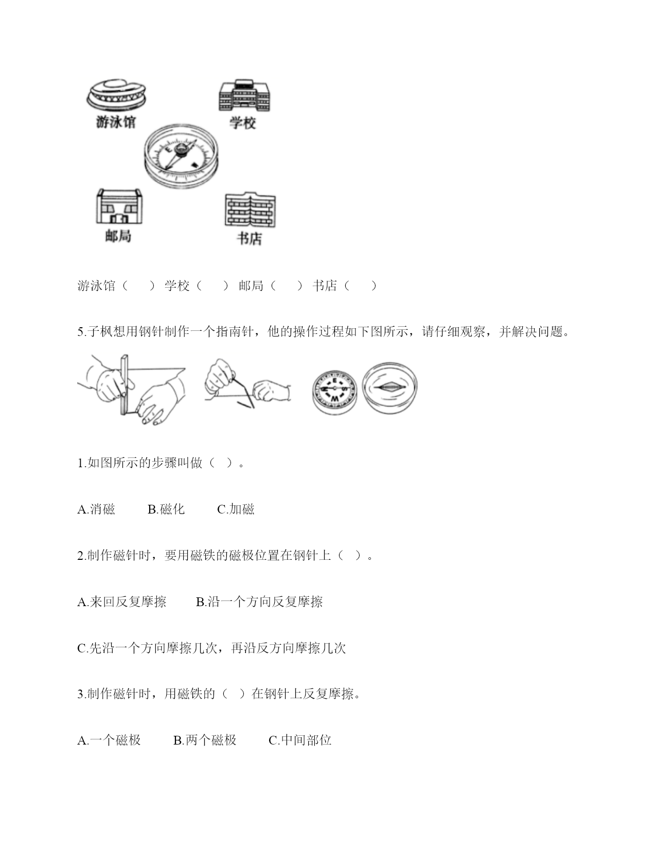 小学科学《磁铁》练习题一.选择题(共6题,共12分)1.现在很多门都会装上门吸,门吸利用的是磁铁磁极间()的性质。A.同极相互排斥B.异极相互吸引C.异极相互排斥2.天琪先用纸片和回形针做了一个小鸭子,然后用磁铁在纸板下方让小鸭子“游泳”,如图所示,这个实验说明磁铁()。A.有魔力B.能吸引纸板C.隔着纸板也能吸引物体3.把一颗小钢珠放在磁性比较强的蹄形磁铁上,松开手,可能发生的现象是()。A.小钢珠不动B.小钢珠会掉下来C.小钢珠会滚向蹄形磁铁的磁极部位4.冰箱门里安装磁铁,起的作用是()。A.既可以吸住又方便开关B.牢牢吸住C.防止食物变质5.磁力黑板擦(如图)的发明,利用了()。A.磁铁能指示方向的特点B.磁极相互排斥的原理C.磁铁可以吸引铁的性质6.下列物体中,磁铁能够吸引的一组是()。A.金片铝片B.铁片镍片C.铝片钴片D.铜片铝片二.填空题(共6题,共28分)1.磁铁有两个磁极,用汉字表示分别是()和(),相应的字母表示分别是()和()。2.写出三种生活中含有磁铁的物品:()、()、()。3.磁铁的各个部位,磁力大小()(填“相同”或“不都相同")。4.写出两种能被磁铁吸引的物体:()、()。5.磁铁有不同的外形,常见的有()、()、和()。6.我们可以把普通的钢针用磁铁的磁极位置沿()方向摩擦,使它变成一根磁针。三.判断题(共6题,共12分)1.磁铁每次指示的方向都是不同的。()2.磁铁只能吸引铁。()3.人们很早就发现,铁钉、钢针被磁石接触或摩擦后,有时会具有磁性,还发现同样用磁石摩擦,钢针比铁钉、铁片具有的磁性弱一些。()4.磁铁隔着很远的地方也可以吸引铁制小车。()5.红蓝磁铁总是红色一端指向北方。()6.普通的钢针经过磁铁摩擦就可以具有磁性。()四.连线题(共1题,共3分)1.把使小车动起来的力用线连起来。推力拉力磁力五.简答题(共5题,共27分)1.请写出4种不同形状的磁铁的名称。2.如何尽快地拾起木屑中的回形针(如下图)?3.在蹄形磁铁上用“○”标出磁极。4.在制作水浮式指南针时,我们会用到一块磁铁,请问磁铁的用途是什么?5.我们在游乐场会看到有卖向上漂浮的气球,这是因为里面装入了比空气轻的氢气或氦气,你能用磁铁的原理代替氢气做出漂浮气球的效果吗?(请想一想,画出你的设计想法)六.综合题(共5题,共32分)1.深秋季节,你看到过大雁南飞的景象吗?原来,大雁南飞也与“磁”有关。在大雁的身体里,有一套天然的“地磁导航系统”。利用磁铁,我们可以模拟大雁南飞。实验材料:条形磁铁3块,棉线3根,纸、笔、剪刀、双面胶等。实验过程:①剪。在纸上画3只大雁,并用剪刀剪下。②贴。把系着棉线的条形磁铁粘在大雁的反面。S极朝着大雁的头部。③挂。把制作好的大雁挂起来,观察大雁的头是不是朝向南方。④排。把制作好的3只大雁排成一列。静止后,大雁们是不是都朝着南方“飞行”了?再试着转动大雁的方向,一会儿后,大雁还能排成一列,继续往南“飞”吗?想一想:这个小实验利用了磁铁的什么特点?2.下列哪些物体含有磁铁?把含有磁铁的物体圈出来。3.用磁铁学具盒中的环形磁铁设计一个悬浮塔,有两种摆放方式。请在下面右图中用字母标出这两种摆法的磁极。4.指南针是我国的四大发明之一,它是利用磁铁能够指示南北方向的特点而制成的。请根据图中指南针所指示的方向,标出四个场所所在的方向。游泳馆()学校()邮局()书店()5.子枫想用钢针制作一个指南针,他的操作过程如下图所示,请仔细观察,并解决问题。1.如图所示的步骤叫做()。A.消磁B.磁化C.加磁2.制作磁针时,要用磁铁的磁极位置在钢针上()。A.来回反复摩擦B.沿一个方向反复摩擦C.先沿一个方向摩擦几次,再沿反方向摩擦几次3.制作磁针时,用磁铁的()在钢针上反复摩擦。A.一个磁极B.两个磁极C.中间部位4.如图是子枫在()。A.固定钢针B.测试钢针的磁性如图是子枫在用真正的指南针()。A.确定方向B.测量方向参考答案一.选择题1.B2.C3.C4.A5.C6.B二.填空题1.南极;北极;S;N2.冰箱门;磁力扣;门吸3.不都相同4.回形针;一元硬币5.条形磁铁;蹄形磁铁;环形磁铁6.一个三.判断题1.×2.×3.√4.×5.√6.√四.连线题1.如下:五.简答题1.常见的不同形状的磁铁:条形磁铁、蹄形磁铁、环形磁铁、方形磁铁、圆形磁铁等。2.利用磁铁的磁性很快地能拾起木屑里的回形针。3.如下:4.磁铁的用途是使钢针变得具有磁性。5.在气球顶上粘一个回形针,在气球上方的盒子上粘一块磁铁,让气球