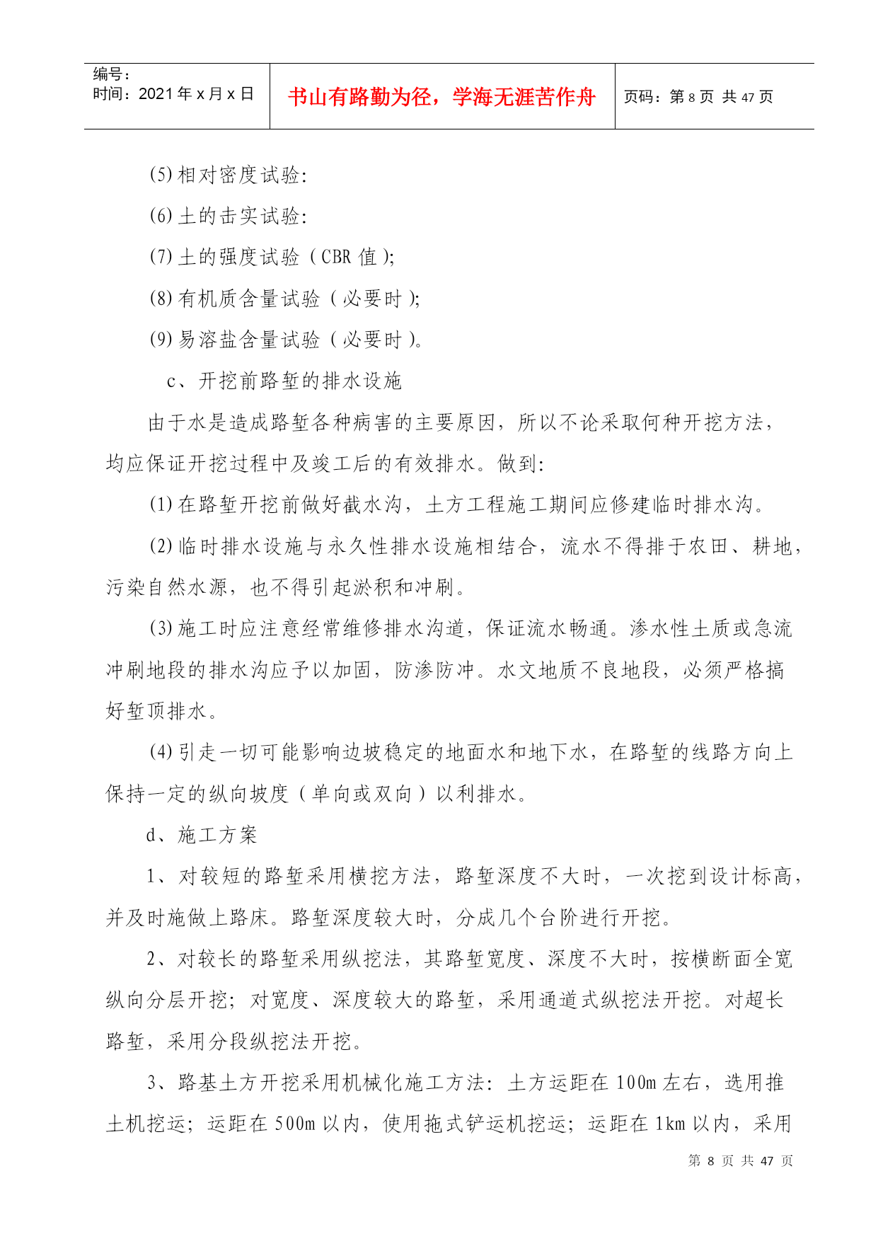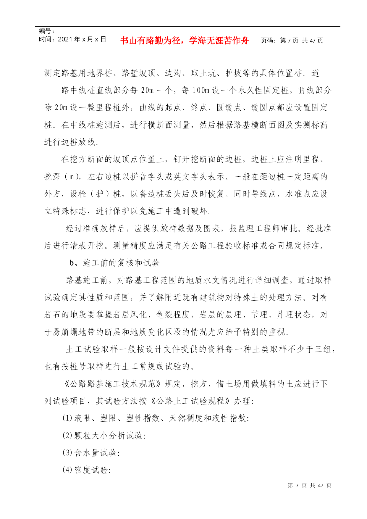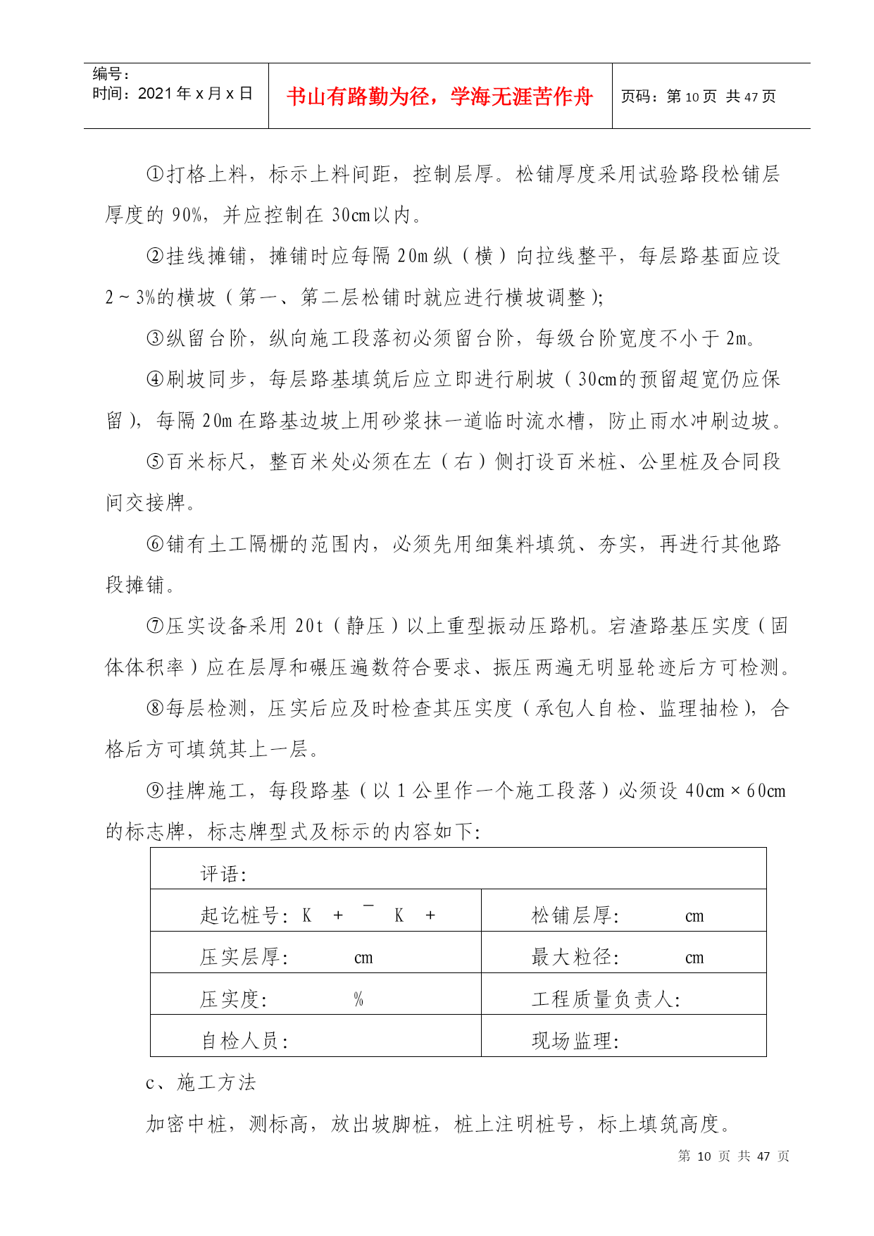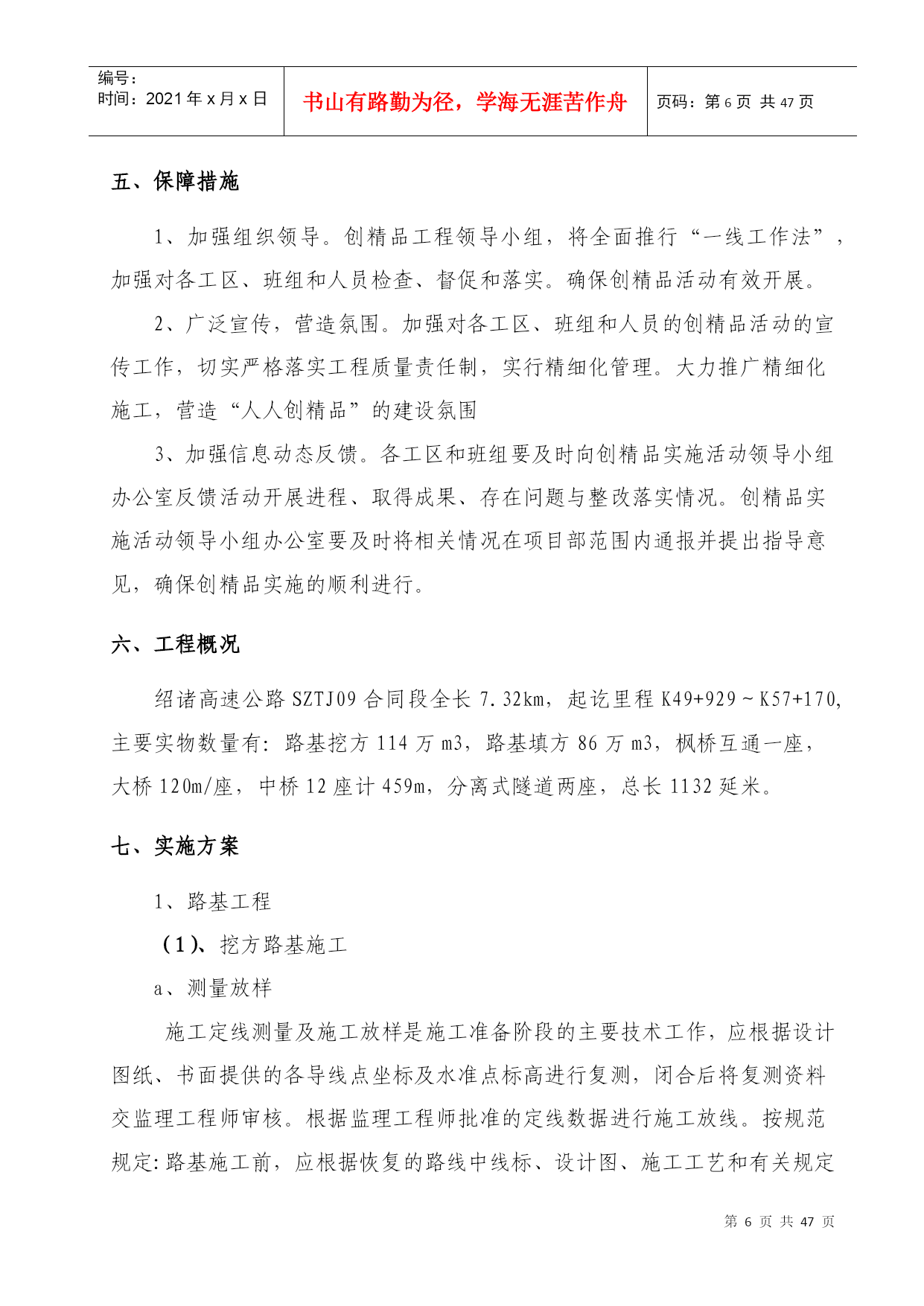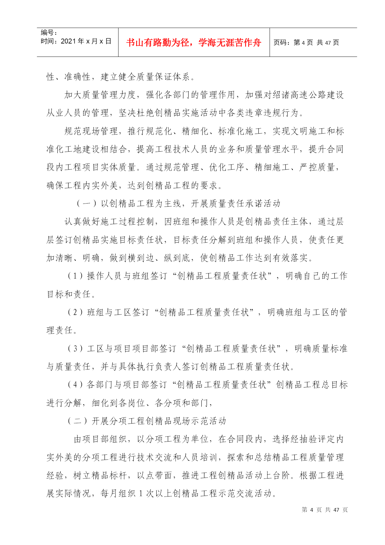 编号:时间:2021年x月x日书山有路勤为径,学海无涯苦作舟页码:第PAGE47页共NUMPAGES47页第PAGE\*MERGEFORMAT47页共NUMPAGES\*MERGEFORMAT47页绍诸高速公路SZTJ09合同段中国●顺吉集团创精品工程实施方案编制:林仙明审核:王如喜顺吉集团有限公司绍诸高速SZTJ09合同段项目部二OO九年九月十日创精品工程实施方案为进一步落实绍诸高速公路指挥部《关于绍诸高速公路建设项目创精品工程实施方案的通知》精神,加强我合同段高速公路建设工程质量,强化质量意识,落实质量责任制,树立质量形象,提高社会和经济效益,实现绍诸高速公路建设优质高效的目标,以争创精品工程为目标,特制订本实施方案。一、指导思想:以科学发展观为宗旨,以“建一流工程,铸精品工程,创质量品牌,树顺吉形象”为指导,以实现企业发展为目的,以更新理念为先导,以提升质量为核心,以加强管理为手段,坚持精细施工,严格管理,打造精品工程。二、组织机构:成立由项目经理金秀乐任组长,项目部相关部门参与的“绍诸高速公路创精品工程实施活动领导小组”。组长:金秀乐副组长:王如喜成员:金秀江陈志平夏文江田春厚林仙明陆海峰王成兰国根侯仁富谢孝选孙胜利陈迪文金建祥张亚超马禄明徐玲富邹金安领导小组办公室设在项目部质检科,由陈志平负责创精品工程活动的日常工作。领导小组成员负责制定创建精品工程实施方案,并对施工的项目进行进行检查指导,对成功的经验进行总结交流和推广,对工程质量及管理情况进行监督、检查。领导小组办公室负责创精品工程考核、评比等具体工作。召开合同段内绍诸高速公路建设创精品实施活动大会,部署安排创精品工程活动,结合本合同段内开展广泛深入的活动宣传,完成质量责任状的签订工作。通过积极宣传,广泛发动,形成关心绍诸高速公路公路建设精品项目的良好氛围。按照确定创精品工程实施方案,开展质量通病治理等活动,推行工程质量责任制等制度,定期召开施工现场现场交流会,以点带面,力促工程质量实现新突破。各参与班组和部门认真总结经验和教训,要总结探索建立创精品工程实施持续改进的长效机制,召开创精品实施活动总结表彰大会,对在活动中获得精品工程的项目、班组和个人进行表彰。三、实施质量目标:在我合同段内全面开展以“质量优良、外观优美、生态环保、科技创新、人文和谐”为主要内涵的创建精品工程活动,认真贯彻“严格管理、精细施工、规范作业、典型示范”的思路,力争在绍诸高速公路项目建设中创出精品工程,做到工程内在质量及外观质量优良,且分项工程、分部工程合格率100%,单位工程优良率95%以上,促进我公司管理水平再上新的台阶。单位工程划分按公路工程质量检验评定标准执行(具体划分已另册上报)四、总体要求严格质量行为,规范施工管理,强化质量责任制度,提高过程控制质量,注重精细施工,规范施工,认真执行国家和交通部及省、市有关高速公路的质量规范标准和要求,加强试验检测管理,保证试验检测结果的科学性、准确性,建立健全质量保证体系。加大质量管理力度,强化各部门的管理作用,加强对绍诸高速公路建设从业人员的管理,坚决杜绝创精品实施活动中各类违章违规行为。规范现场管理,推行规范化、精细化、标准化施工,实现文明施工和标准化工地建设相结合,提高工程技术人员的业务和质量管理水平,提升合同段内工程项目实体质量。通过规范管理、优化工序、精细施工、严控质量,确保工程内实外美,达到创精品工程的要求。(一)以创精品工程为主线,开展质量责任承诺活动认真做好施工过程控制,因班组和操作人员是创精品责任主体,通过层层签订创精品实施目标责任状,目标责任分解到班组和操作人员,使责任更加清晰、明确,做到横到边、纵到底,使创精品工作达到有效落实。(1)操作人员与班组签订“创精品工程质量责任状”,明确自己的工作目标和责任。(2)班组与工区签订“创精品工程质量责任状”,明确班组与工区的管理责任。(3)工区与项目项目部签订“创精品工程质量责任状”,明确质量标准与质量责任,并与具体执行负责人签订创精品工程质量责任状。(4)各部门与项目部签订“创精品工程质量责任状”创精品工程总目标进行分解,细化到各岗位、各分项和部门,(二)开展分项工程创精品现场示范活动由项目部组织,以分项工程为单位,在合同段内,选择经抽验评定内实外美的分项工程进行技术交流和人员培训,探索和总结精品工程质量管理经验,树立精品标杆,以点带面,推进工程创精品活动上台阶。根据工程进展实际情况,每月组织1次以上创精品工程示范交流活动。(三)开展质量通病治理活动针对高速公路工程建设中存在的质量通病,结合工程实际和浙江省公路水运混凝土通病治理活动宣贯活动,制定本合同段工程