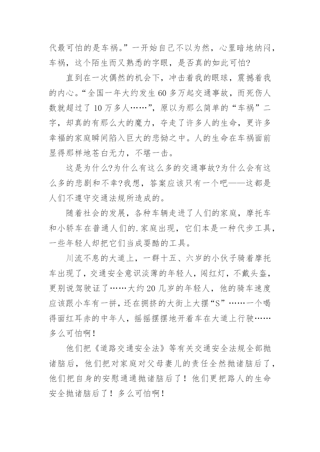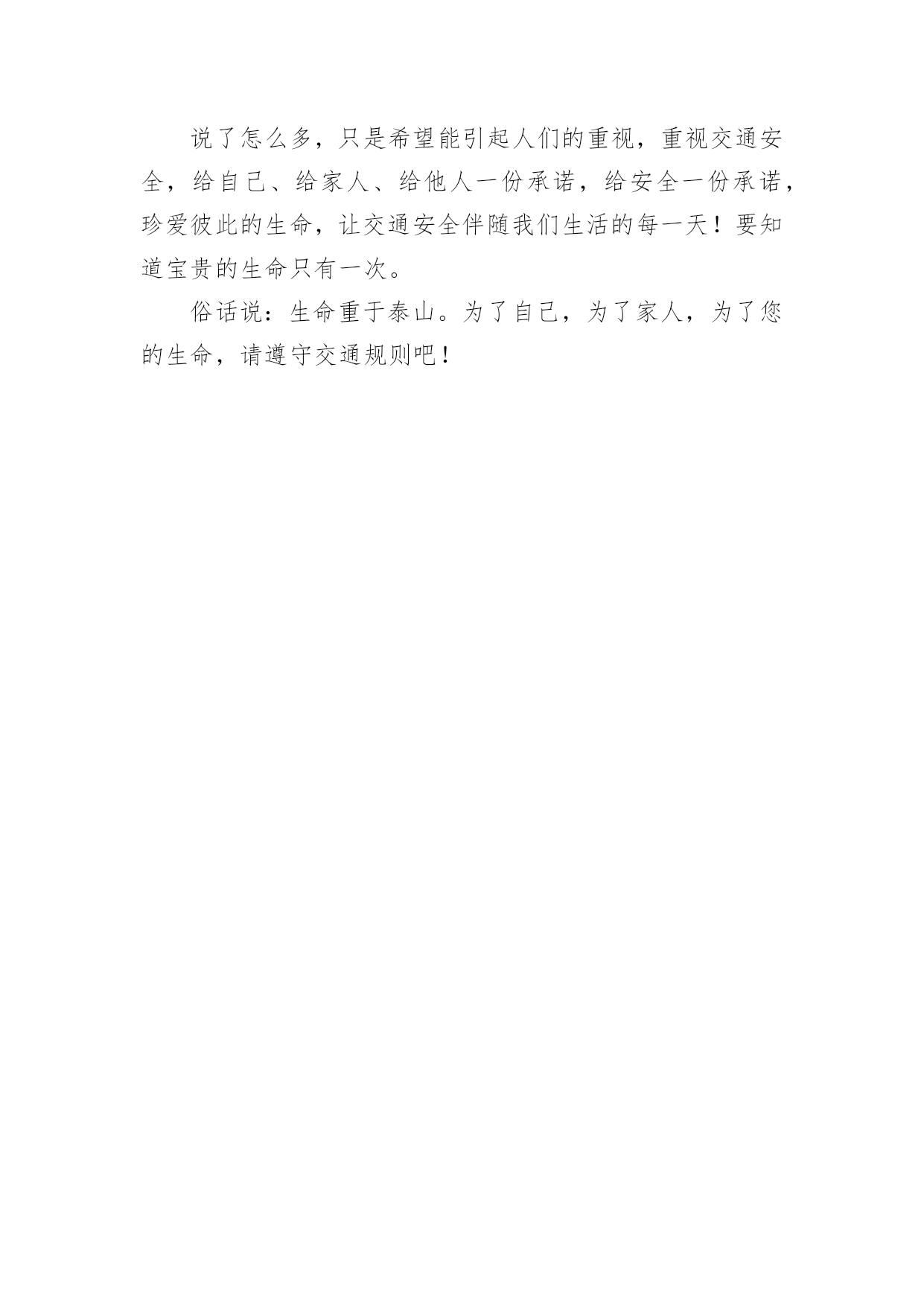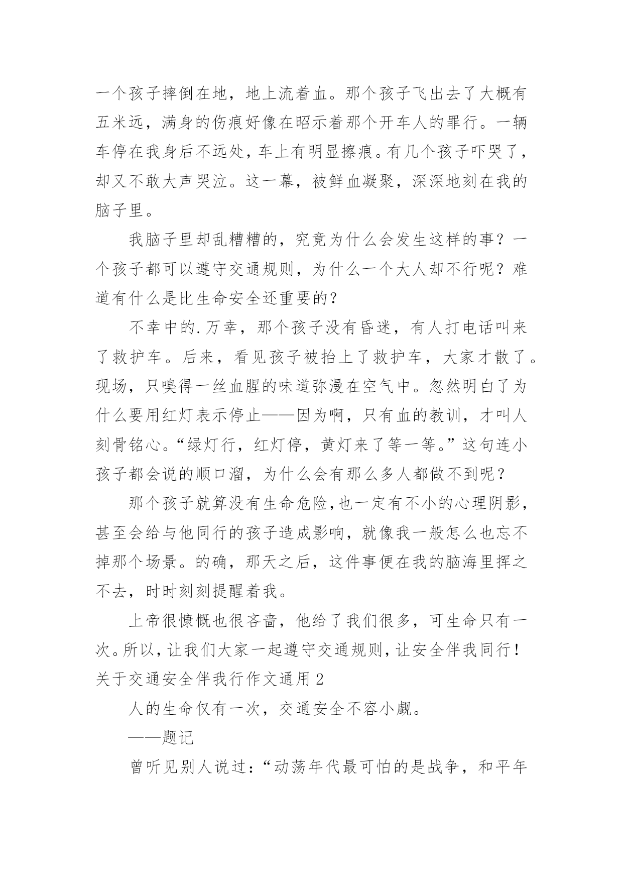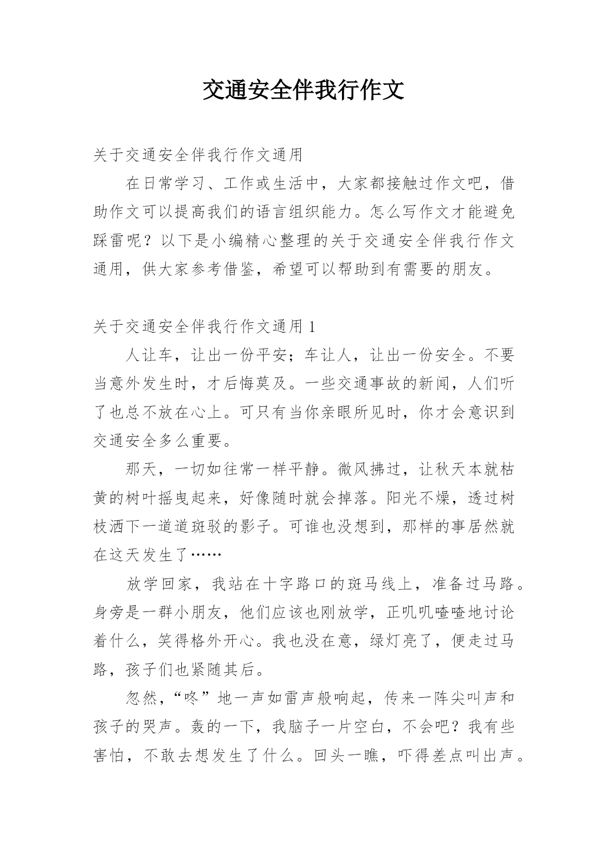 交通安全伴我行作文关于交通安全伴我行作文通用在日常学习、工作或生活中,大家都接触过作文吧,借助作文可以提高我们的语言组织能力。怎么写作文才能避免踩雷呢?以下是小编精心整理的关于交通安全伴我行作文通用,供大家参考借鉴,希望可以帮助到有需要的朋友。关于交通安全伴我行作文通用1人让车,让出一份平安;车让人,让出一份安全。不要当意外发生时,才后悔莫及。一些交通事故的新闻,人们听了也总不放在心上。可只有当你亲眼所见时,你才会意识到交通安全多么重要。那天,一切如往常一样平静。微风拂过,让秋天本就枯黄的树叶摇曳起来,好像随时就会掉落。阳光不燥,透过树枝洒下一道道斑驳的影子。可谁也没想到,那样的事居然就在这天发生了……放学回家,我站在十字路口的斑马线上,准备过马路。身旁是一群小朋友,他们应该也刚放学,正叽叽喳喳地讨论着什么,笑得格外开心。我也没在意,绿灯亮了,便走过马路,孩子们也紧随其后。忽然,“咚”地一声如雷声般响起,传来一阵尖叫声和孩子的哭声。轰的一下,我脑子一片空白,不会吧?我有些害怕,不敢去想发生了什么。回头一瞧,吓得差点叫出声。一个孩子摔倒在地,地上流着血。那个孩子飞出去了大概有五米远,满身的伤痕好像在昭示着那个开车人的罪行。一辆车停在我身后不远处,车上有明显擦痕。有几个孩子吓哭了,却又不敢大声哭泣。这一幕,被鲜血凝聚,深深地刻在我的脑子里。我脑子里却乱糟糟的,究竟为什么会发生这样的事?一个孩子都可以遵守交通规则,为什么一个大人却不行呢?难道有什么是比生命安全还重要的?不幸中的.万幸,那个孩子没有昏迷,有人打电话叫来了救护车。后来,看见孩子被抬上了救护车,大家才散了。现场,只嗅得一丝血腥的味道弥漫在空气中。忽然明白了为什么要用红灯表示停止——因为啊,只有血的教训,才叫人刻骨铭心。“绿灯行,红灯停,黄灯来了等一等。”这句连小孩子都会说的顺口溜,为什么会有那么多人都做不到呢?那个孩子就算没有生命危险,也一定有不小的心理阴影,甚至会给与他同行的孩子造成影响,就像我一般怎么也忘不掉那个场景。的确,那天之后,这件事便在我的脑海里挥之不去,时时刻刻提醒着我。上帝很慷慨也很吝啬,他给了我们很多,可生命只有一次。所以,让我们大家一起遵守交通规则,让安全伴我同行!关于交通安全伴我行作文通用2人的生命仅有一次,交通安全不容小觑。——题记曾听见别人说过:“动荡年代最可怕的是战争,和平年代最可怕的是车祸。”一开始自己不以为然,心里暗地纳闷,车祸,这个陌生而又熟悉的字眼,是否真的如此可怕?直到在一次偶然的机会下,冲击着我的眼球,震撼着我的内心。“全国一年大约发生60多万起交通事故,而死伤人数就超过了10万多人……”,原以为那么简单的“车祸”二字,却真的有那么大的魔力,夺走了许多人的生命,更许多幸福的家庭瞬间陷入巨大的悲恸之中。人的生命在车祸面前显得那样地苍白无力,不堪一击。这是为什么?为什么有这么多的交通事故?为什么会有这么多的悲剧和不幸?我想,答案应该只有一个吧——这都是人们不遵守交通法规所造成的。随着社会的发展,各种车辆走进了人们的家庭,摩托车和小轿车在普通人们的.家庭出现,它们本是一种代步工具,一些年轻人却把它们当成耍酷的工具。川流不息的大道上,一群十五、六岁的小伙子骑着摩托车出现了,交通安全意识淡薄的年轻人,闯红灯,不戴头盔,更别说驾驶证了……大约20几岁的年轻人,他的骑车速度应该跟小车有一拼,还在拥挤的大街上大摆“S”……一个喝得面红耳赤的中年人,摇摇摆摆地开着车在大道上行驶……多么可怕啊!他们把《道路交通安全法》等有关交通安全法规全部抛诸脑后,他们把对家庭对父母妻儿的责任全然抛诸脑后了,他们把自身的安慰通通抛诸脑后了!他们更把路人的生命安全抛诸脑后了!多么可怕啊!说了怎么多,只是希望能引起人们的重视,重视交通安全,给自己、给家人、给他人一份承诺,给安全一份承诺,珍爱彼此的生命,让交通安全伴随我们生活的每一天!要知道宝贵的生命只有一次。俗话说:生命重于泰山。为了自己,为了家人,为了您的生命,请遵守交通规则吧!
