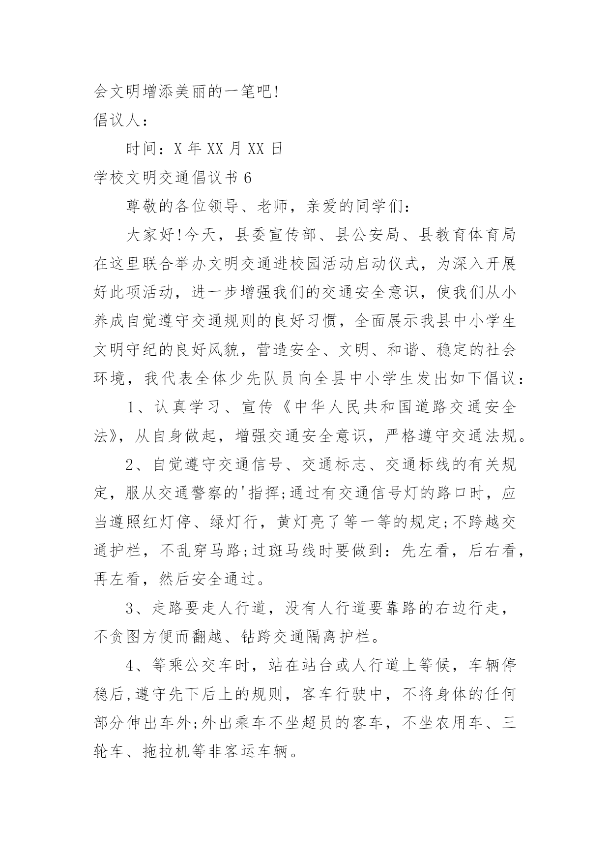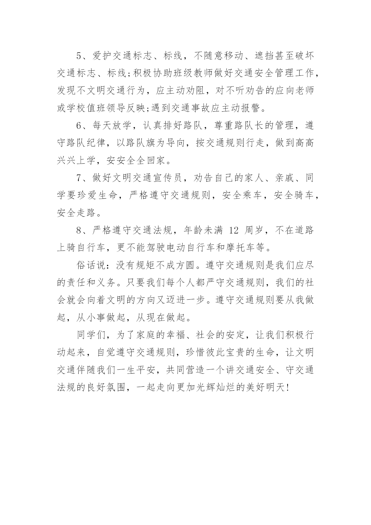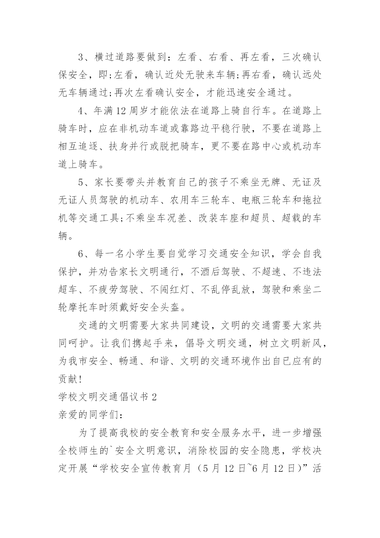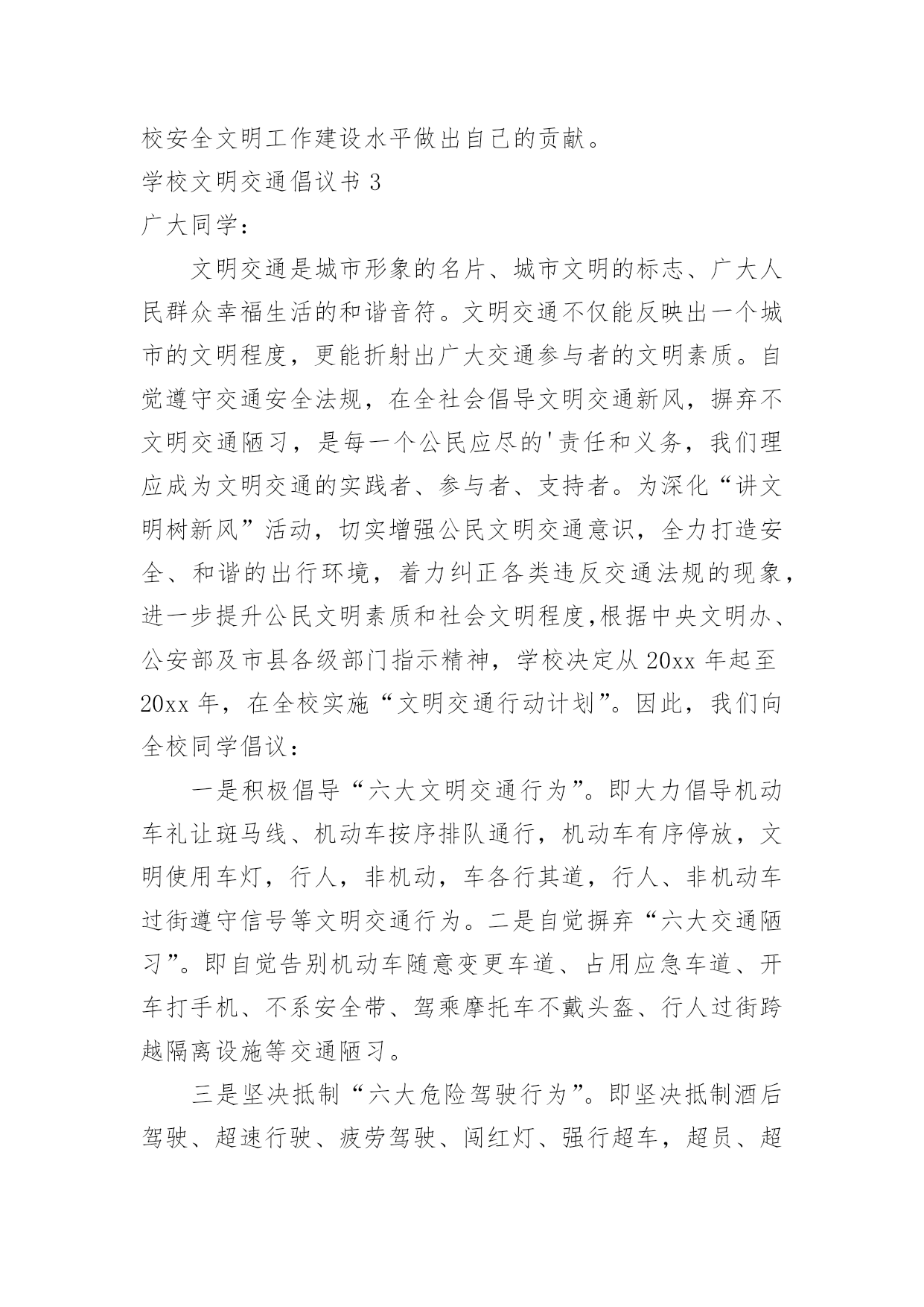 学校文明交通倡议书学校文明交通倡议书6篇在不断进步的时代,倡议书与我们的生活息息相关,通过倡议书可以激起更多的人响应,在最大的范围内引人们起共鸣。在写之前,可以先参考范文,以下是小编帮大家整理的学校文明交通倡议书,欢迎阅读与收藏。学校文明交通倡议书1尊敬的家长朋友、亲爱的同学们:为确保学生的出行安全,我校开展“文明交通进校园”的活动,因此我们请家长教育引导孩子认真学习交通安全知识,提高交通安全意识和自我防护能力,同时要规范自己的交通行为,以自身的一言一行引导孩子养成良好的交通习惯。为此,我们倡议全校学生、家长做到:1、在道路上行走时,要在人行道内行走或靠路边行走。不要在道路两侧嬉戏、追逐或长时间逗留,不要突然横过道路。横过道路时,必须从人行横道、天桥及其他行人过街设施通过;在通过人行横道时,也要注意观察来往车辆,加强自身安全防范。2、通过设有交通信号灯和人行横道的'路口时,应当注意观察人行横道指示灯,在绿灯亮时通行;通过没有交通信号灯或人行横道的路口,应注意避让通行的车辆,在没有车辆通行的前提下安全通行。3、横过道路要做到:左看、右看、再左看,三次确认保安全,即;左看,确认近处无驶来车辆;再右看,确认远处无车辆通过;再次左看确认安全,才能迅速安全通过。4、年满12周岁才能依法在道路上骑自行车。在道路上骑车时,应在非机动车道或靠路边平稳行驶,不要在道路上相互追逐、扶身并行或脱把骑车,更不要在路中心或机动车道上骑车。5、家长要带头并教育自己的孩子不乘坐无牌、无证及无证人员驾驶的机动车、农用车三轮车、电瓶三轮车和拖拉机等交通工具;不乘坐车况差、改装车座和超员、超载的车辆。6、每一名小学生要自觉学习交通安全知识,学会自我保护,并劝告家长文明通行,不酒后驾驶、不超速、不违法超车、不疲劳驾驶、不闯红灯、不乱停乱放,驾驶和乘坐二轮摩托车时须戴好安全头盔。交通的文明需要大家共同建设,文明的交通需要大家共同呵护。让我们携起手来,倡导文明交通,树立文明新风,为我市安全、畅通、和谐、文明的交通环境作出自已应有的贡献!学校文明交通倡议书2亲爱的同学们:为了提高我校的安全教育和安全服务水平,进一步增强全校师生的`安全文明意识,消除校园的安全隐患,学校决定开展“学校安全宣传教育月(5月12日~6月12日)”活动。为落实学校的工作部署,保持安全和谐的校园环境,积极营造“求真、求精、求新”的学习氛围,树立“安全第一、生命可贵、遵纪守法、和谐共处”的意识,校团委、学生会特向广大同学们发出如下倡议:一、居安思危,增强忧患意识。珍爱生命,深刻认识生命高于一切,安全重于泰山,时刻把安全放在首位;二、积极响应号召,认真学习安全知识读本,掌握基础安全知识,增强安全防范意识,树立科学安全理念;三、加强自我防范,做到防溺水、防火、防震减灾、防交通事故、防中毒、防盗窃、防诈骗等,形成“人人讲安全、事事想安全、处处要安全”的良好氛围;四、树立主人翁意识,积极参与“应急疏散演练”、“自救、互救演练”。不断提高应对突发事件的避险自救能力,最大限度地预防和减少各种安全事故的发生;五、自觉倡导“八荣八耻”,弘扬新时代大学生风范。不酗酒,不在宿舍抽烟,文明着装,举止端庄。抵制穿拖鞋进教室、带早点进课堂、校园内勾肩搭背、“墙壁、课桌”文化等各种不文明现象;六、内化社会主义核心价值观,树立远大理想,不断提升自身素质,自觉参加学校学风建设主题活动,健康成长、努力成才。同学们,安全需要维护,文明需要养成,安全文明需要奉献。希望广大同学从现在做起,从小事做起,从自我做起,为营建安全、文明、和谐的生活、学习环境,为全面提升我校安全文明工作建设水平做出自己的贡献。学校文明交通倡议书3广大同学:文明交通是城市形象的名片、城市文明的标志、广大人民群众幸福生活的和谐音符。文明交通不仅能反映出一个城市的文明程度,更能折射出广大交通参与者的文明素质。自觉遵守交通安全法规,在全社会倡导文明交通新风,摒弃不文明交通陋习,是每一个公民应尽的'责任和义务,我们理应成为文明交通的实践者、参与者、支持者。为深化“讲文明树新风”活动,切实增强公民文明交通意识,全力打造安全、和谐的出行环境,着力纠正各类违反交通法规的现象,进一步提升公民文明素质和社会文明程度,根据中央文明办、公安部及市县各级部门指示精神,学校决定从20xx年起至20xx年,在全校实施“文明交通行动计划”。因此,我们向全校同学倡议:一是积极倡导“六大文明交通行为”。即大力倡导机动车礼让斑马线、机动车按序排队通行,机动车有序停放,文明使用车灯,行人,非机动,车各行其道,行人、非机动车过街遵守信号等文明交通行为。二是自觉摒弃“六大交通陋习”。即自觉告别机动车随意变更车道、占用应急车道、开车打手机、不系安全带、驾乘摩托车不戴头盔、行人过街跨越隔离设施等交通陋习。三