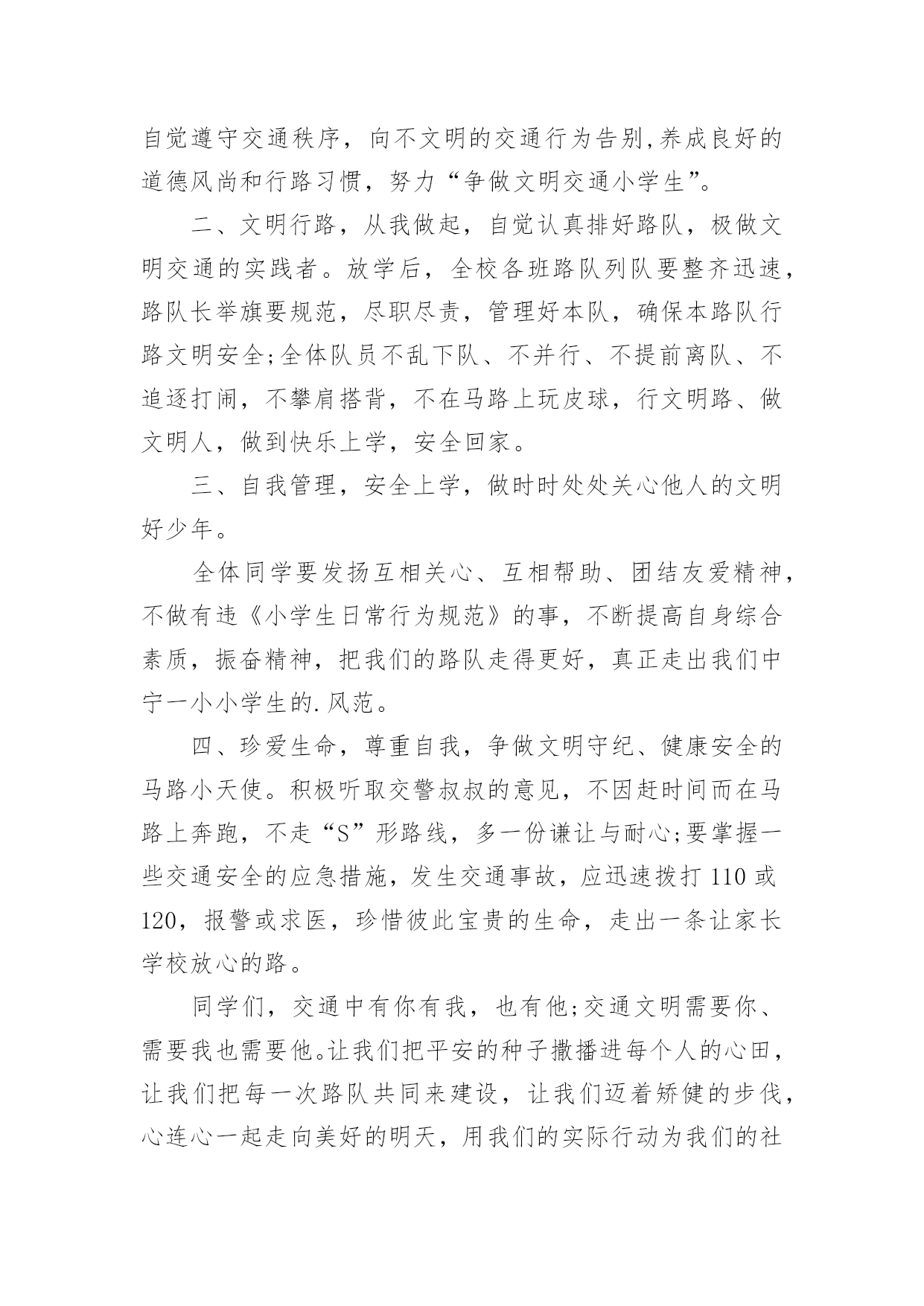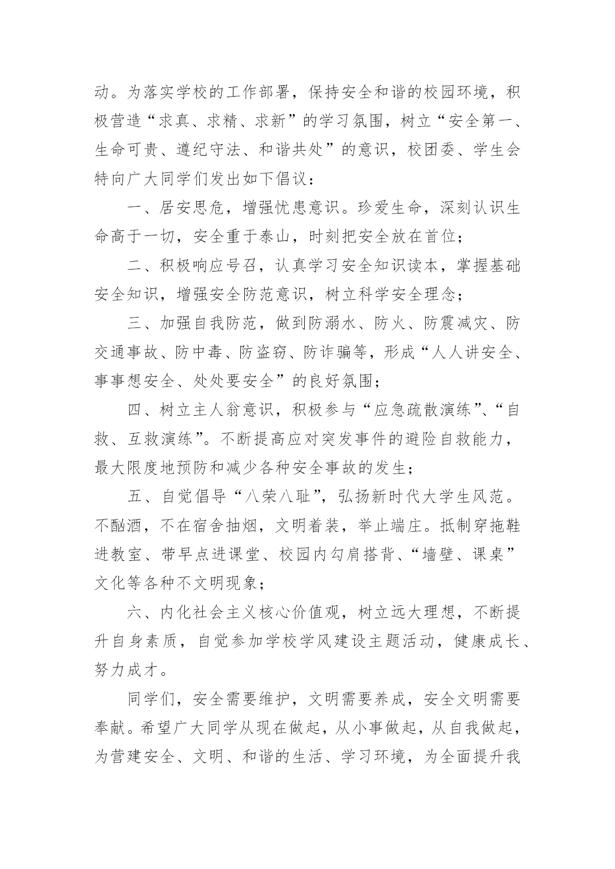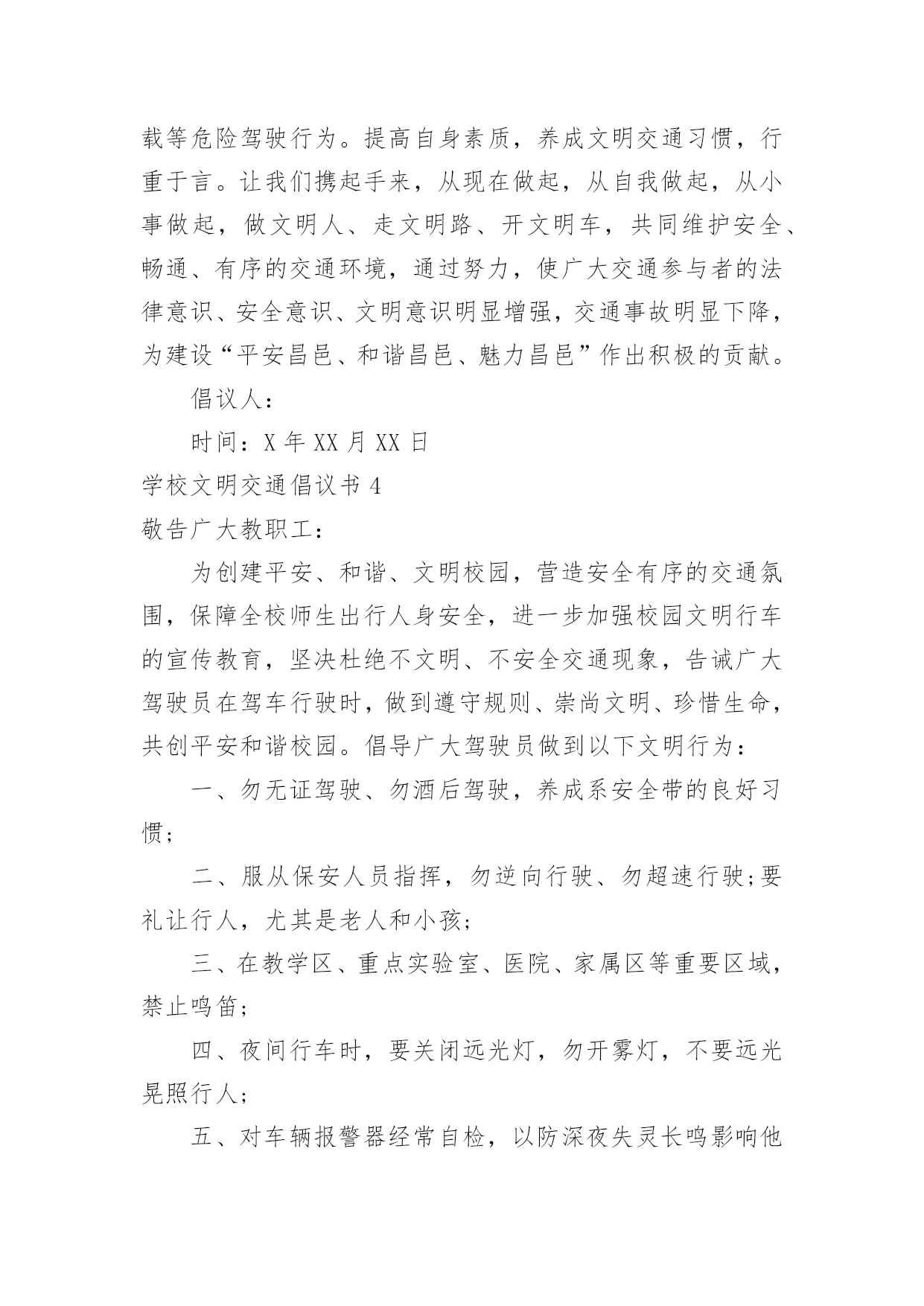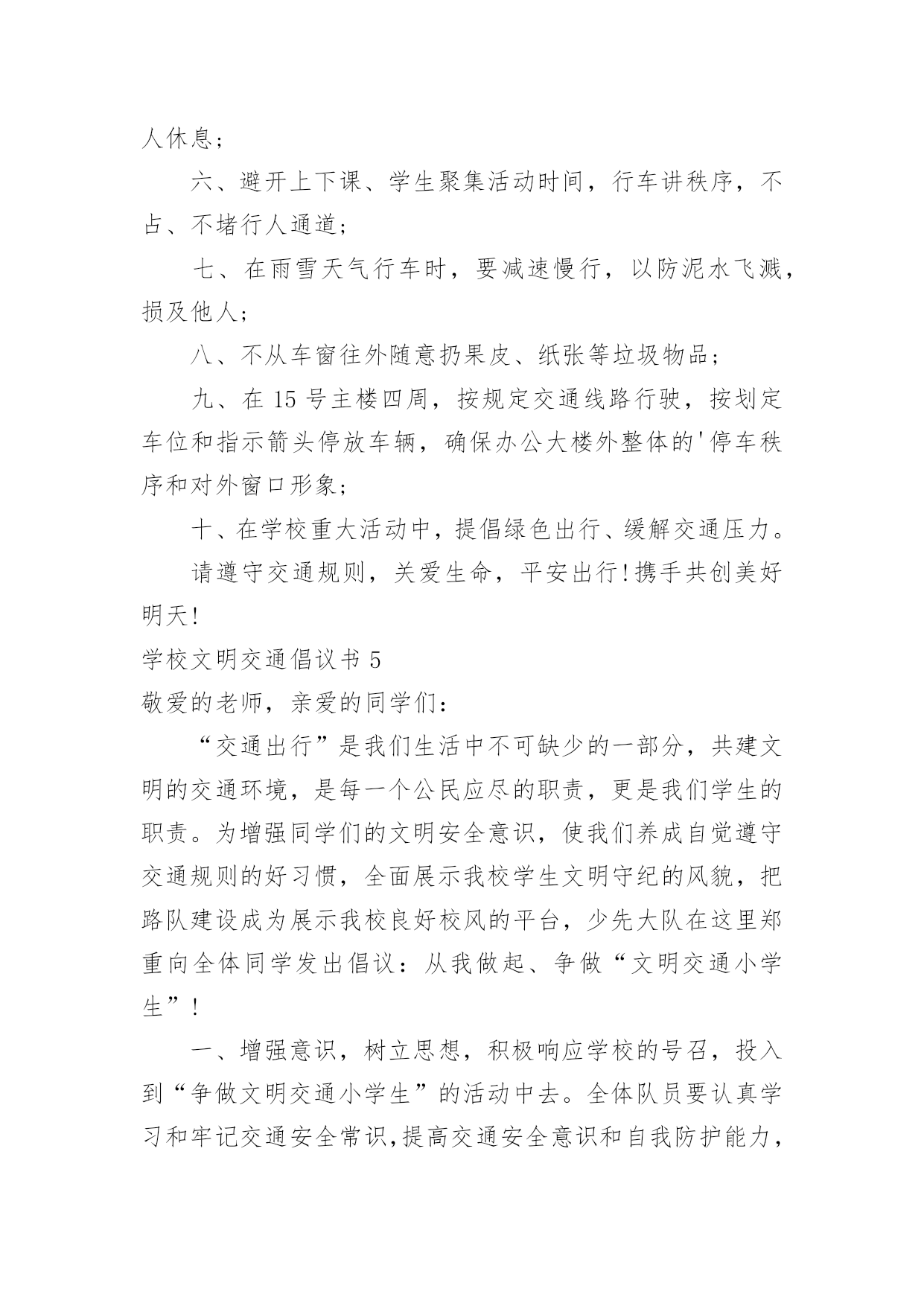 学校文明交通倡议书学校文明交通倡议书6篇在不断进步的时代,倡议书与我们的生活息息相关,通过倡议书可以激起更多的人响应,在最大的范围内引人们起共鸣。在写之前,可以先参考范文,以下是小编帮大家整理的学校文明交通倡议书,欢迎阅读与收藏。学校文明交通倡议书1尊敬的家长朋友、亲爱的同学们:为确保学生的出行安全,我校开展“文明交通进校园”的活动,因此我们请家长教育引导孩子认真学习交通安全知识,提高交通安全意识和自我防护能力,同时要规范自己的交通行为,以自身的一言一行引导孩子养成良好的交通习惯。为此,我们倡议全校学生、家长做到:1、在道路上行走时,要在人行道内行走或靠路边行走。不要在道路两侧嬉戏、追逐或长时间逗留,不要突然横过道路。横过道路时,必须从人行横道、天桥及其他行人过街设施通过;在通过人行横道时,也要注意观察来往车辆,加强自身安全防范。2、通过设有交通信号灯和人行横道的'路口时,应当注意观察人行横道指示灯,在绿灯亮时通行;通过没有交通信号灯或人行横道的路口,应注意避让通行的车辆,在没有车辆通行的前提下安全通行。3、横过道路要做到:左看、右看、再左看,三次确认保安全,即;左看,确认近处无驶来车辆;再右看,确认远处无车辆通过;再次左看确认安全,才能迅速安全通过。4、年满12周岁才能依法在道路上骑自行车。在道路上骑车时,应在非机动车道或靠路边平稳行驶,不要在道路上相互追逐、扶身并行或脱把骑车,更不要在路中心或机动车道上骑车。5、家长要带头并教育自己的孩子不乘坐无牌、无证及无证人员驾驶的机动车、农用车三轮车、电瓶三轮车和拖拉机等交通工具;不乘坐车况差、改装车座和超员、超载的车辆。6、每一名小学生要自觉学习交通安全知识,学会自我保护,并劝告家长文明通行,不酒后驾驶、不超速、不违法超车、不疲劳驾驶、不闯红灯、不乱停乱放,驾驶和乘坐二轮摩托车时须戴好安全头盔。交通的文明需要大家共同建设,文明的交通需要大家共同呵护。让我们携起手来,倡导文明交通,树立文明新风,为我市安全、畅通、和谐、文明的交通环境作出自已应有的贡献!学校文明交通倡议书2亲爱的同学们:为了提高我校的安全教育和安全服务水平,进一步增强全校师生的`安全文明意识,消除校园的安全隐患,学校决定开展“学校安全宣传教育月(5月12日~6月12日)”活动。为落实学校的工作部署,保持安全和谐的校园环境,积极营造“求真、求精、求新”的学习氛围,树立“安全第一、生命可贵、遵纪守法、和谐共处”的意识,校团委、学生会特向广大同学们发出如下倡议:一、居安思危,增强忧患意识。珍爱生命,深刻认识生命高于一切,安全重于泰山,时刻把安全放在首位;二、积极响应号召,认真学习安全知识读本,掌握基础安全知识,增强安全防范意识,树立科学安全理念;三、加强自我防范,做到防溺水、防火、防震减灾、防交通事故、防中毒、防盗窃、防诈骗等,形成“人人讲安全、事事想安全、处处要安全”的良好氛围;四、树立主人翁意识,积极参与“应急疏散演练”、“自救、互救演练”。不断提高应对突发事件的避险自救能力,最大限度地预防和减少各种安全事故的发生;五、自觉倡导“八荣八耻”,弘扬新时代大学生风范。不酗酒,不在宿舍抽烟,文明着装,举止端庄。抵制穿拖鞋进教室、带早点进课堂、校园内勾肩搭背、“墙壁、课桌”文化等各种不文明现象;六、内化社会主义核心价值观,树立远大理想,不断提升自身素质,自觉参加学校学风建设主题活动,健康成长、努力成才。同学们,安全需要维护,文明需要养成,安全文明需要奉献。希望广大同学从现在做起,从小事做起,从自我做起,为营建安全、文明、和谐的生活、学习环境,为全面提升我校安全文明工作建设水平做出自己的贡献。学校文明交通倡议书3广大同学:文明交通是城市形象的名片、城市文明的标志、广大人民群众幸福生活的和谐音符。文明交通不仅能反映出一个城市的文明程度,更能折射出广大交通参与者的文明素质。自觉遵守交通安全法规,在全社会倡导文明交通新风,摒弃不文明交通陋习,是每一个公民应尽的'责任和义务,我们理应成为文明交通的实践者、参与者、支持者。为深化“讲文明树新风”活动,切实增强公民文明交通意识,全力打造安全、和谐的出行环境,着力纠正各类违反交通法规的现象,进一步提升公民文明素质和社会文明程度,根据中央文明办、公安部及市县各级部门指示精神,学校决定从20xx年起至20xx年,在全校实施“文明交通行动计划”。因此,我们向全校同学倡议:一是积极倡导“六大文明交通行为”。即大力倡导机动车礼让斑马线、机动车按序排队通行,机动车有序停放,文明使用车灯,行人,非机动,车各行其道,行人、非机动车过街遵守信号等文明交通行为。二是自觉摒弃“六大交通陋习”。即自觉告别机动车随意变更车道、占用应急车道、开车打手机、不系安全带、驾乘摩托车不戴头盔、行人过街跨越隔离设施等交通陋习。三