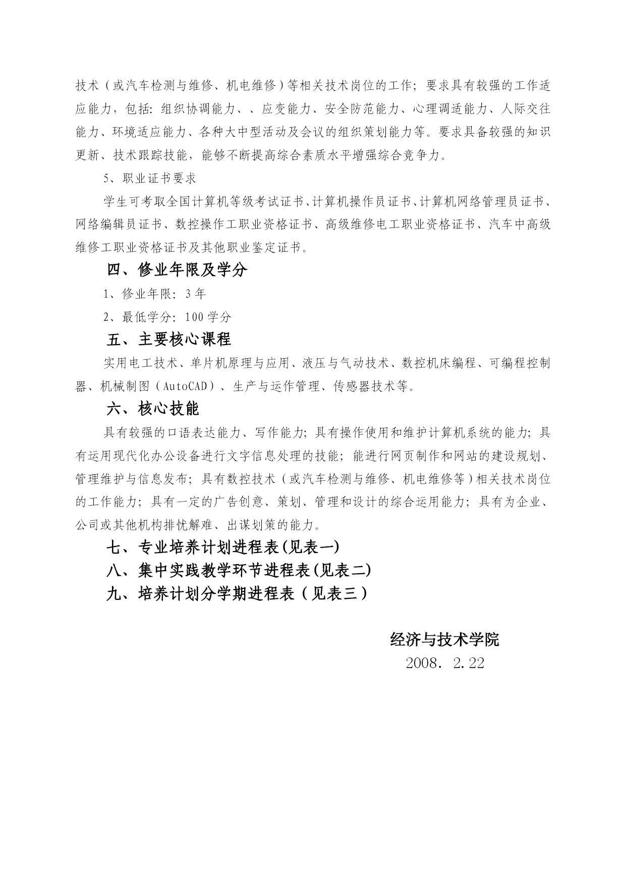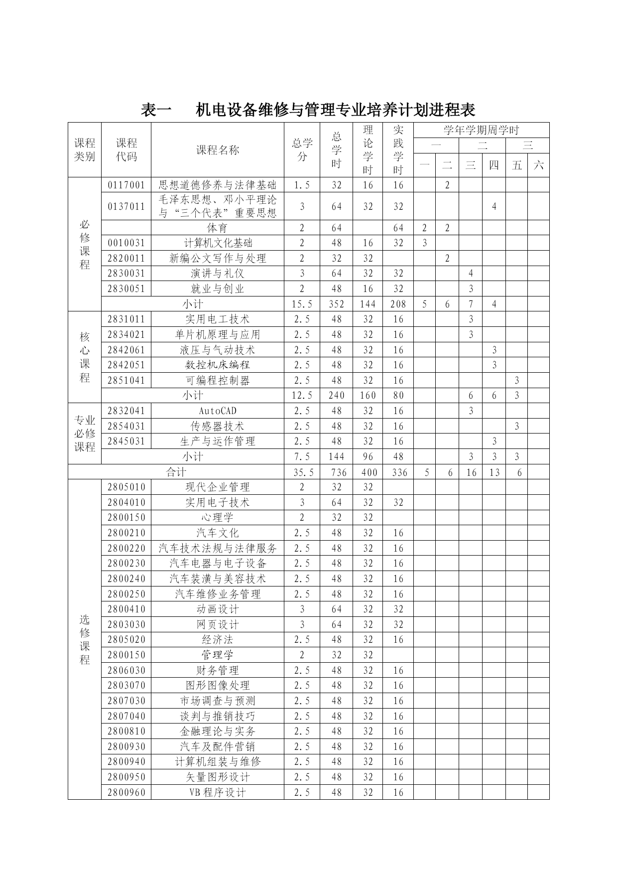 机电设备维修与管理专业培养计划(试行)一、专业代码与专业名称1、专业代码:5803012、专业名称:机电设备维修与管理二、专业培养目标本着注重能力、强化实践的人才培养思想,适应社会经济发展需求,培养德、智、体、美全面发展,具有较高的文化素养、计算机应用能力和组织协调能力,掌握机电设备的应用、维修及管理等方面的高等技术应用型人才。本专业学生,应具备在企业从事机电设备的安装、调试、维修及售后服务的能力,具备从事传统设备的机电一体化改造、企业设备管理、现场生产技术的组织与管理等技术岗位工作的能力。本专业学生,还应能熟练使用各种办公软件和现代办公设备,应能进行中小网站的建设及维护,并具备一定的自学能力以及跟踪新技术的能力。三、业务培养要求1、知识要求本专业采取理论与实践相结合的教学方法,使学生系统掌握:中文、法律领域的相关知识;计算机组成、常用软件的使用等基本知识;网站建设、网络管理与维护知识;平面图形设计、动画设计和立体图形设计等工具的使用知识;数控技术(或汽车检测与维修、机电维修)相关知识;电子商务以及广告策划与制作等相关知识。2、基本技能要求要求通过一系列的专业训练,使学生具有:较熟练的计算机、现代办公设备的操作使用能力;较好的语言与文字表达、应用文写作能力;较强的人际沟通、组织协调以及基本的组织领导能力。3、专业技能要求通过计算机课程系列实训,熟悉系统软硬件结构,培养计算机软硬件维护的技能;通过网络维护和组网的学习和训练,熟悉计算机网络系统的开发、维护、管理等方法和技术;结合所学的网页设计、平面设计、动画设计知识能够制作出精美的网页;能运用AUTOCAD等图形设计工具进行模具设计;经实践训练能够进行现代广告策划并运用计算机进行图文广告设计、制作。4、综合技能要求要求具备良好的文化素质、应有的法律知识、较强的改革意识和创新精神;能够熟练运用电脑软件处理日常事务;能够利用互联网快速获取所需信息;能够直接从事数控技术(或汽车检测与维修、机电维修)等相关技术岗位的工作;要求具有较强的工作适应能力,包括:组织协调能力、、应变能力、安全防范能力、心理调适能力、人际交往能力、环境适应能力、各种大中型活动及会议的组织策划能力等。要求具备较强的知识更新、技术跟踪技能,能够不断提高综合素质水平增强综合竞争力。5、职业证书要求学生可考取全国计算机等级考试证书、计算机操作员证书、计算机网络管理员证书、网络编辑员证书、数控操作工职业资格证书、高级维修电工职业资格证书、汽车中高级维修工职业资格证书及其他职业鉴定证书。四、修业年限及学分1、修业年限:3年2、最低学分:100学分五、主要核心课程实用电工技术、单片机原理与应用、液压与气动技术、数控机床编程、可编程控制器、机械制图(AutoCAD)、生产与运作管理、传感器技术等。六、核心技能具有较强的口语表达能力、写作能力;具有操作使用和维护计算机系统的能力;具有运用现代化办公设备进行文字信息处理的技能;能进行网页制作和网站的建设规划、管理维护与信息发布;具有数控技术(或汽车检测与维修、机电维修等)相关技术岗位的工作能力;具有一定的广告创意、策划、管理和设计的综合运用能力;具有为企业、公司或其他机构排忧解难、出谋划策的能力。七、专业培养计划进程表(见表一)八、集中实践教学环节进程表(见表二)九、培养计划分学期进程表(见表三)经济与技术学院2008.2.22表一机电设备维修与管理专业培养计划进程表课程类别课程代码课程名称总学分总学时理论学时实践学时学年学期周学时一二三一二三四五六必修课程0117001思想道德修养与法律基础1.532161620137011毛泽东思想、邓小平理论与“三个代表”重要思想36432324体育26464220010031计算机文化基础248163232820011新编公文写作与处理2323222830031演讲与礼仪364323242830051就业与创业24816323小计15.53521442085674核心课程2831011实用电工技术2.548321632834021单片机原理与应用2.548321632842061液压与气动技术2.548321632842051数控机床编程2.548321632851041可编程控制器2.54832163小计12.524016080663专业必修课程2832041AutoCAD2.548321632854031传感器技术2.548321632845031生产与运作管理2.54832163小计7.51449648333合计35.57364003365616136选修课程2805010现代企业管理232322804010实用电子技术364323228
