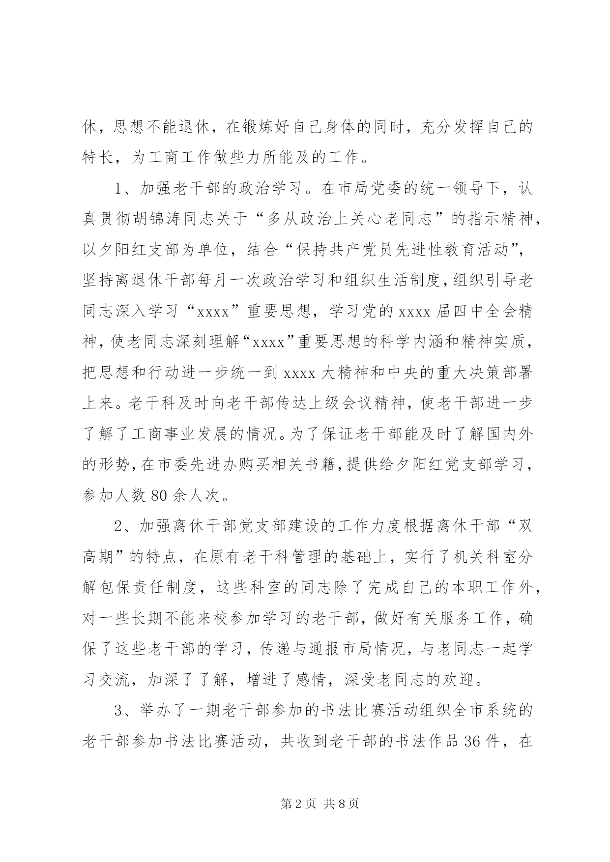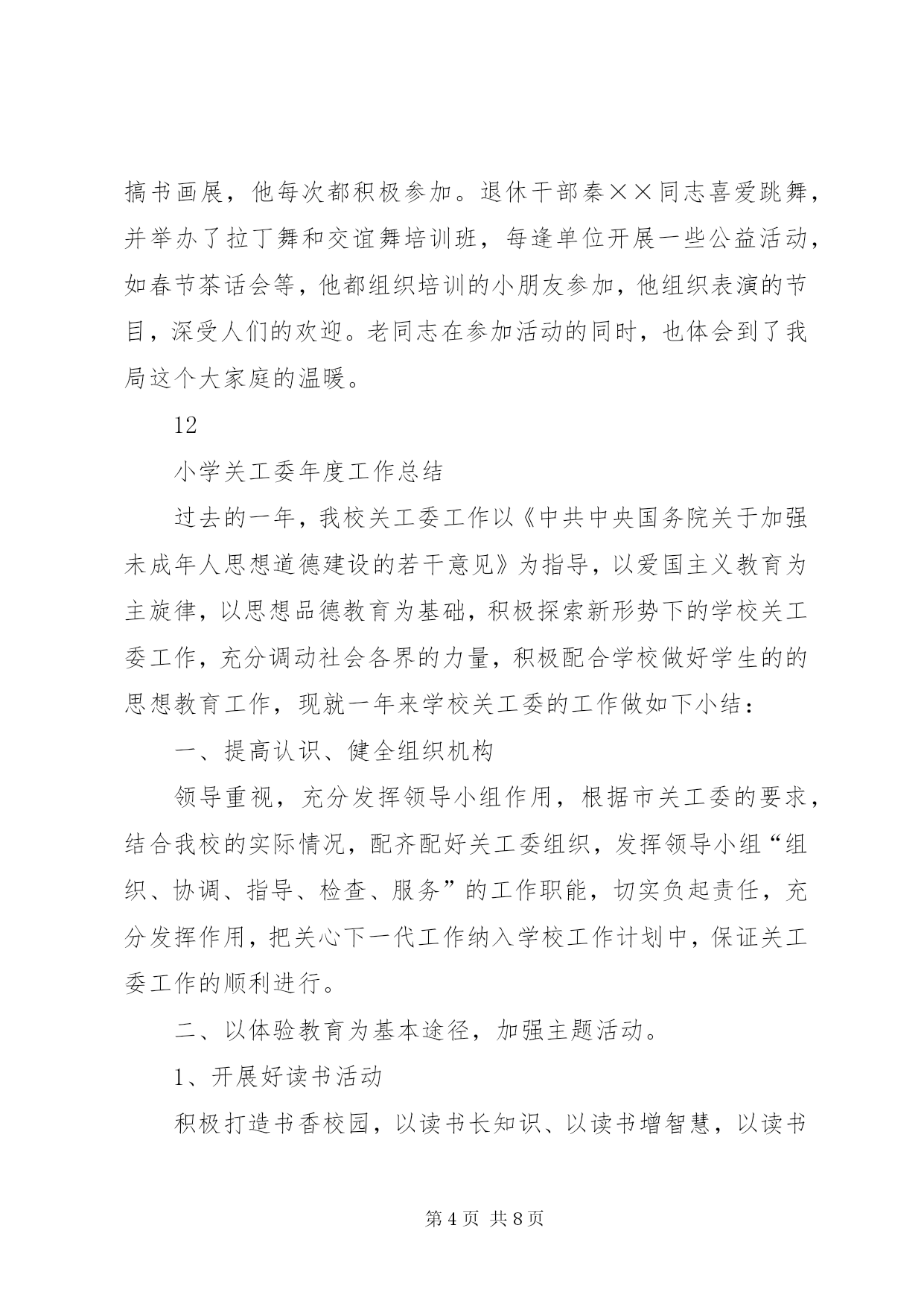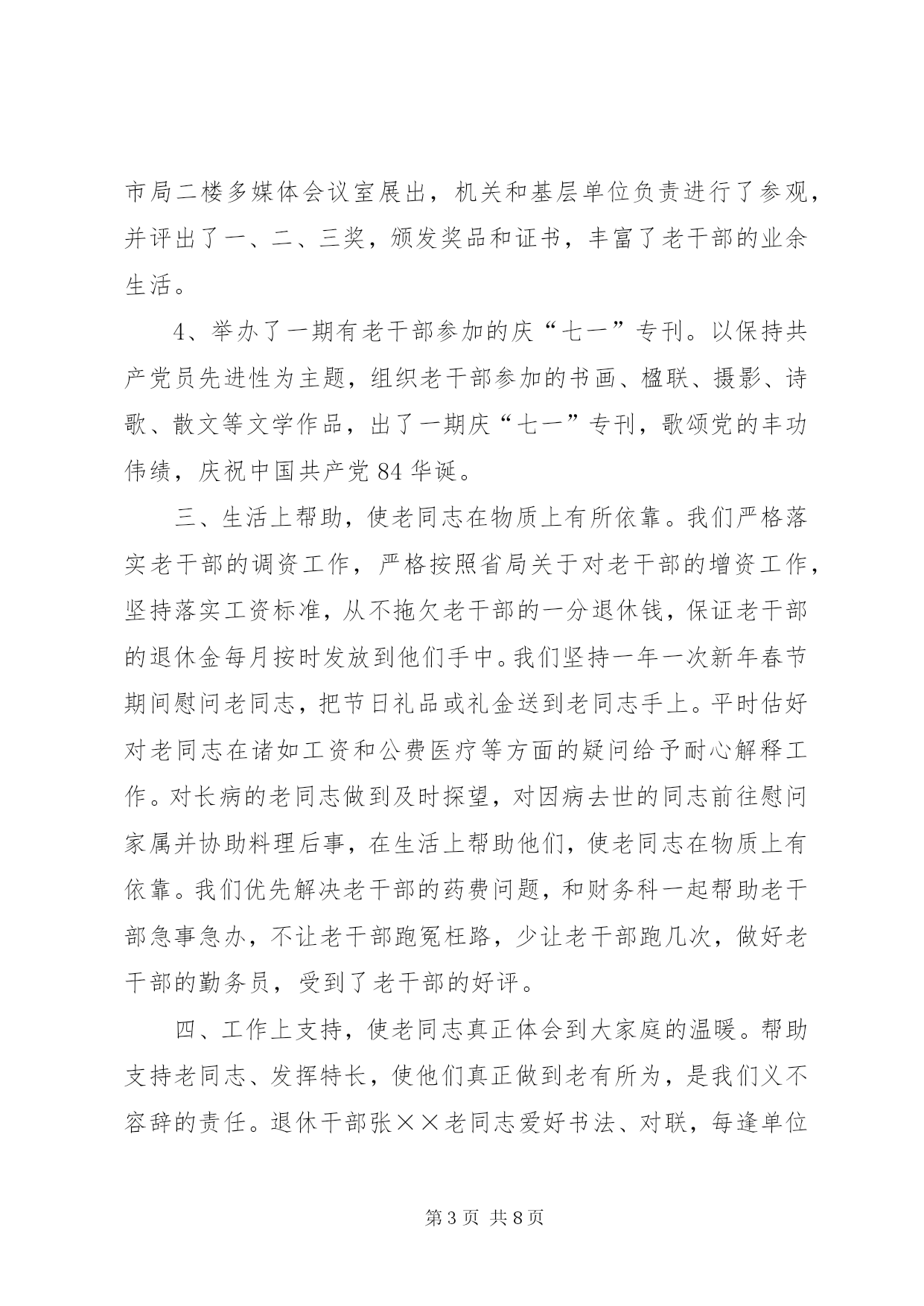 第PAGE\*Arabic\*MERGEFORMAT8页共NUMPAGES\*MERGEFORMAT8页工商局机关老干部工作总结20xx年,在市局党组的正确领导下,老干部工作坚持“xxxx”重要思想和党的xxxx届四中全会精神为指导,认真贯彻全市系统会议精神,坚持从我局实际出发和老干部高龄化的实际出发,以高度的政治责任感,充分在政治上尊重、思想上关心、生活上照顾老干部,正确处理老干部与人事业务工作的关系,推动了老干部工作开展,在为老干部服务和管理工作上取得了新的成绩,使老干部老有所养、老有所学、老有所乐、老有所为,促进了工商事业发展,保持了工商系统稳定。现总结如下:一、积极宣传,营造良好的尊老重老氛围。尊老重老,是中华民族的传统美德。我局现在被评为省级先进单位,市级五优机关、党风廉政建设先进单位、打假先进单位等等,其中浸透着老干部的心血和汗水,因此可以说没有老同志昨天的努力奋斗,就没有我局现在的辉煌。为此,我局利用一切机会,宣传尊老重老的重大意义,使大家认识到尊重爱护老同志的今天,也就是尊重爱护我们自己的明天,使全体干部职工形成尊老敬老、养老爱老的自觉行动,从而为老同志真正做到老有所为,老有所养,老有所乐奠定了良好的思想基础。二、政治上关心,使老同志在精神上有所寄托。市局利用春节茶话会、举办书法比赛等形式召开老干部座谈会,肯定老干部所做的贡献,征求他们对我局工作的意见和建议,鼓励他们人退休,思想不能退休,在锻炼好自己身体的同时,充分发挥自己的特长,为工商工作做些力所能及的工作。1、加强老干部的政治学习。在市局党委的统一领导下,认真贯彻胡锦涛同志关于“多从政治上关心老同志”的指示精神,以夕阳红支部为单位,结合“保持共产党员先进性教育活动”,坚持离退休干部每月一次政治学习和组织生活制度,组织引导老同志深入学习“xxxx”重要思想,学习党的xxxx届四中全会精神,使老同志深刻理解“xxxx”重要思想的科学内涵和精神实质,把思想和行动进一步统一到xxxx大精神和中央的重大决策部署上来。老干科及时向老干部传达上级会议精神,使老干部进一步了解了工商事业发展的情况。为了保证老干部能及时了解国内外的形势,在市委先进办购买相关书籍,提供给夕阳红党支部学习,参加人数80余人次。2、加强离休干部党支部建设的工作力度根据离休干部“双高期”的特点,在原有老干科管理的基础上,实行了机关科室分解包保责任制度,这些科室的同志除了完成自己的本职工作外,对一些长期不能来校参加学习的老干部,做好有关服务工作,确保了这些老干部的学习,传递与通报市局情况,与老同志一起学习交流,加深了了解,增进了感情,深受老同志的欢迎。3、举办了一期老干部参加的书法比赛活动组织全市系统的老干部参加书法比赛活动,共收到老干部的书法作品36件,在市局二楼多媒体会议室展出,机关和基层单位负责进行了参观,并评出了一、二、三奖,颁发奖品和证书,丰富了老干部的业余生活。4、举办了一期有老干部参加的庆“七一”专刊。以保持共产党员先进性为主题,组织老干部参加的书画、楹联、摄影、诗歌、散文等文学作品,出了一期庆“七一”专刊,歌颂党的丰功伟绩,庆祝中国共产党84华诞。三、生活上帮助,使老同志在物质上有所依靠。我们严格落实老干部的调资工作,严格按照省局关于对老干部的增资工作,坚持落实工资标准,从不拖欠老干部的一分退休钱,保证老干部的退休金每月按时发放到他们手中。我们坚持一年一次新年春节期间慰问老同志,把节日礼品或礼金送到老同志手上。平时估好对老同志在诸如工资和公费医疗等方面的疑问给予耐心解释工作。对长病的老同志做到及时探望,对因病去世的同志前往慰问家属并协助料理后事,在生活上帮助他们,使老同志在物质上有依靠。我们优先解决老干部的药费问题,和财务科一起帮助老干部急事急办,不让老干部跑冤枉路,少让老干部跑几次,做好老干部的勤务员,受到了老干部的好评。四、工作上支持,使老同志真正体会到大家庭的温暖。帮助支持老同志、发挥特长,使他们真正做到老有所为,是我们义不容辞的责任。退休干部张××老同志爱好书法、对联,每逢单位搞书画展,他每次都积极参加。退休干部秦××同志喜爱跳舞,并举办了拉丁舞和交谊舞培训班,每逢单位开展一些公益活动,如春节茶话会等,他都组织培训的小朋友参加,他组织表演的节目,深受人们的欢迎。老同志在参加活动的同时,也体会到了我局这个大家庭的温暖。12小学关工委年度工作总结过去的一年,我校关工委工作以《中共中央国务院关于加强未成年人思想道德建设的若干意见》为指导,以爱国主义教育为主旋律,以思想品德教育为基础,积极探索新形势下的学校关工委工作,充分调动社会各界的力量,积极配合学校做好学生的的思想教育工作,现就一年来学校关工委的工作做如下小结:一、提高认识、健全组织机构领导重视,充分发挥