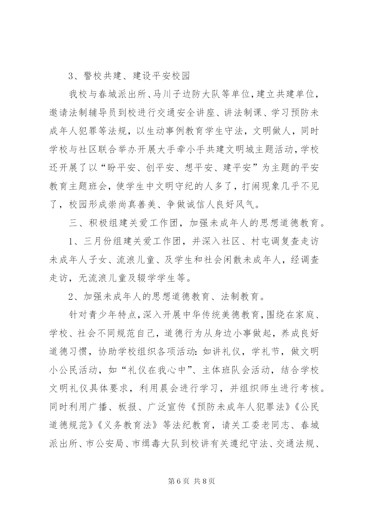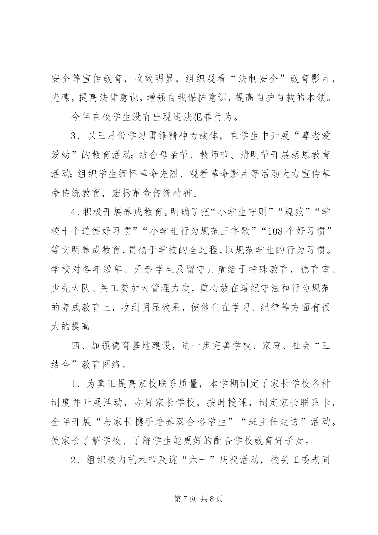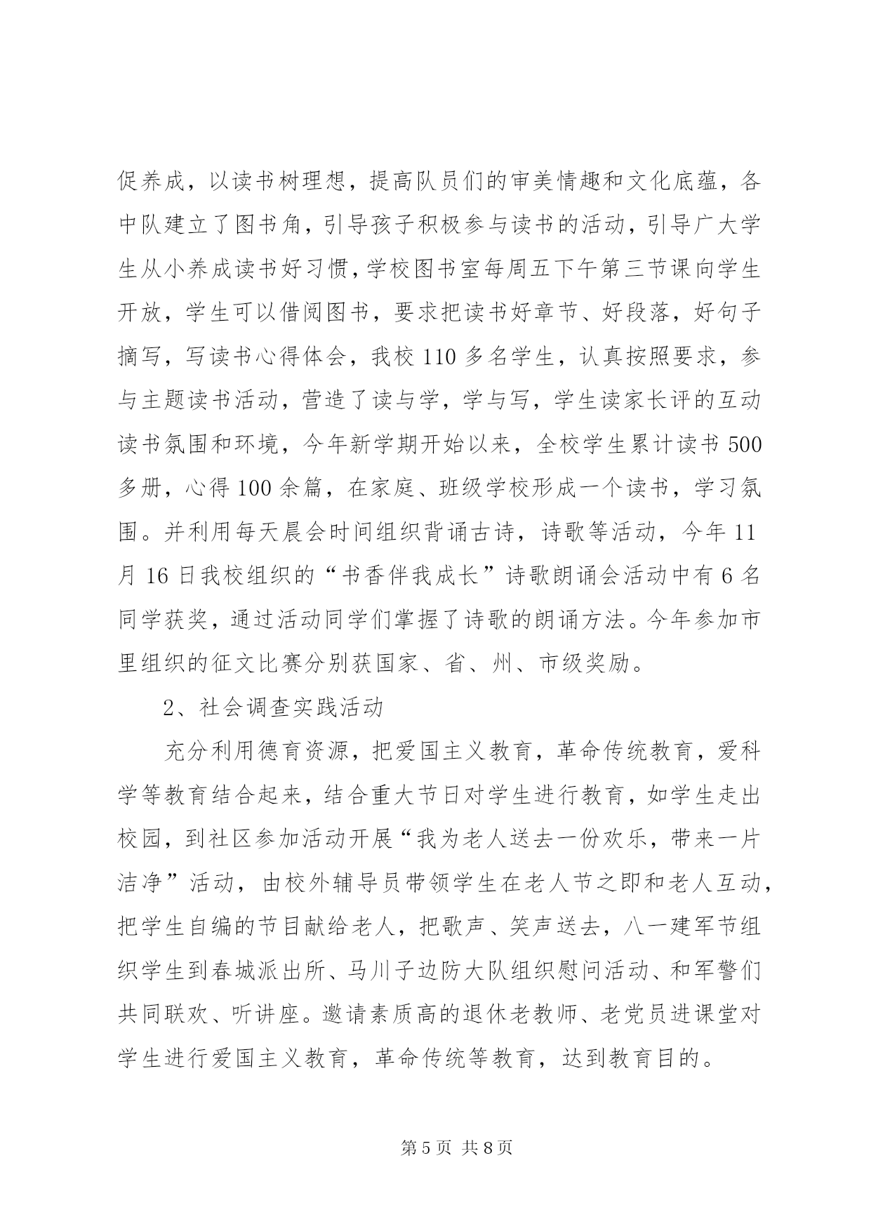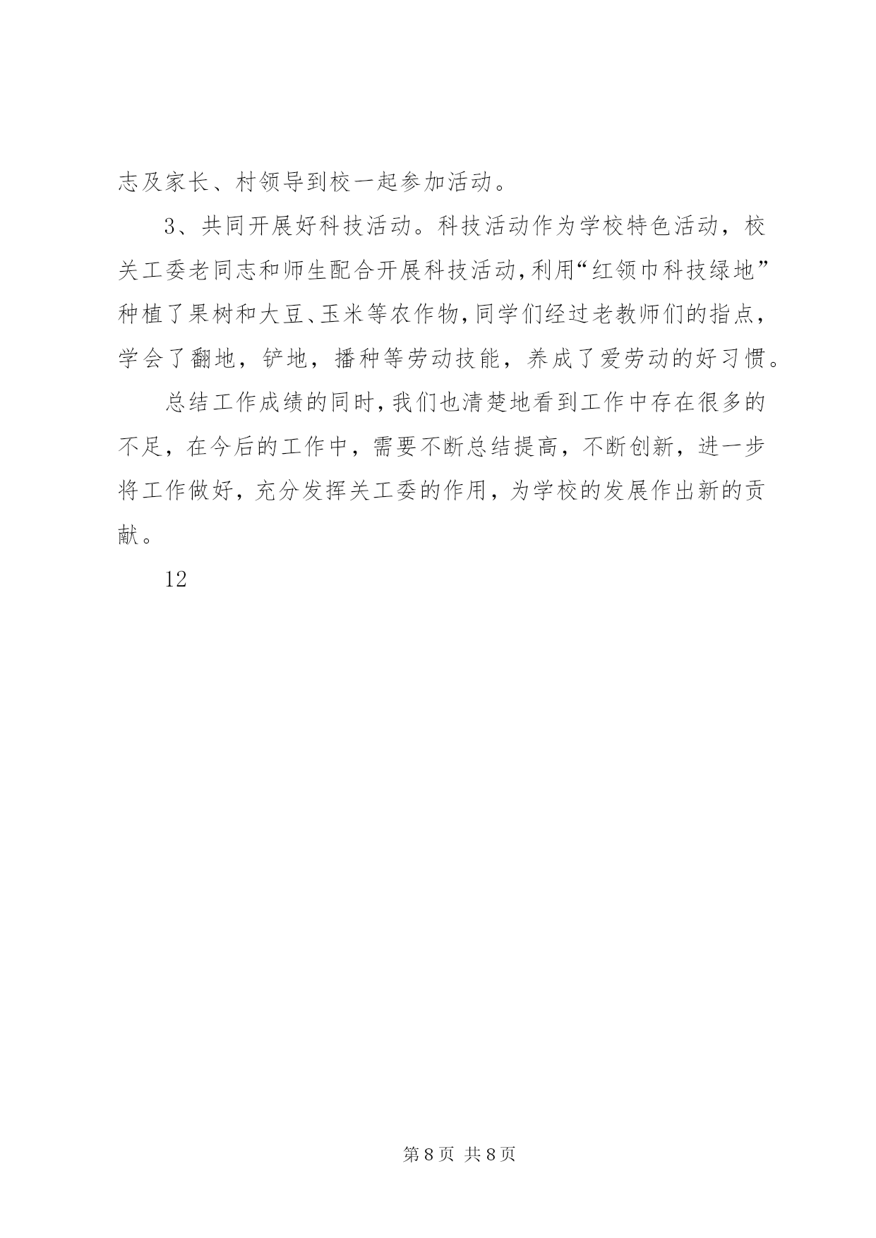 第PAGE\*Arabic\*MERGEFORMAT8页共NUMPAGES\*MERGEFORMAT8页工商局机关老干部工作总结20xx年,在市局党组的正确领导下,老干部工作坚持“xxxx”重要思想和党的xxxx届四中全会精神为指导,认真贯彻全市系统会议精神,坚持从我局实际出发和老干部高龄化的实际出发,以高度的政治责任感,充分在政治上尊重、思想上关心、生活上照顾老干部,正确处理老干部与人事业务工作的关系,推动了老干部工作开展,在为老干部服务和管理工作上取得了新的成绩,使老干部老有所养、老有所学、老有所乐、老有所为,促进了工商事业发展,保持了工商系统稳定。现总结如下:一、积极宣传,营造良好的尊老重老氛围。尊老重老,是中华民族的传统美德。我局现在被评为省级先进单位,市级五优机关、党风廉政建设先进单位、打假先进单位等等,其中浸透着老干部的心血和汗水,因此可以说没有老同志昨天的努力奋斗,就没有我局现在的辉煌。为此,我局利用一切机会,宣传尊老重老的重大意义,使大家认识到尊重爱护老同志的今天,也就是尊重爱护我们自己的明天,使全体干部职工形成尊老敬老、养老爱老的自觉行动,从而为老同志真正做到老有所为,老有所养,老有所乐奠定了良好的思想基础。二、政治上关心,使老同志在精神上有所寄托。市局利用春节茶话会、举办书法比赛等形式召开老干部座谈会,肯定老干部所做的贡献,征求他们对我局工作的意见和建议,鼓励他们人退休,思想不能退休,在锻炼好自己身体的同时,充分发挥自己的特长,为工商工作做些力所能及的工作。1、加强老干部的政治学习。在市局党委的统一领导下,认真贯彻胡锦涛同志关于“多从政治上关心老同志”的指示精神,以夕阳红支部为单位,结合“保持共产党员先进性教育活动”,坚持离退休干部每月一次政治学习和组织生活制度,组织引导老同志深入学习“xxxx”重要思想,学习党的xxxx届四中全会精神,使老同志深刻理解“xxxx”重要思想的科学内涵和精神实质,把思想和行动进一步统一到xxxx大精神和中央的重大决策部署上来。老干科及时向老干部传达上级会议精神,使老干部进一步了解了工商事业发展的情况。为了保证老干部能及时了解国内外的形势,在市委先进办购买相关书籍,提供给夕阳红党支部学习,参加人数80余人次。2、加强离休干部党支部建设的工作力度根据离休干部“双高期”的特点,在原有老干科管理的基础上,实行了机关科室分解包保责任制度,这些科室的同志除了完成自己的本职工作外,对一些长期不能来校参加学习的老干部,做好有关服务工作,确保了这些老干部的学习,传递与通报市局情况,与老同志一起学习交流,加深了了解,增进了感情,深受老同志的欢迎。3、举办了一期老干部参加的书法比赛活动组织全市系统的老干部参加书法比赛活动,共收到老干部的书法作品36件,在市局二楼多媒体会议室展出,机关和基层单位负责进行了参观,并评出了一、二、三奖,颁发奖品和证书,丰富了老干部的业余生活。4、举办了一期有老干部参加的庆“七一”专刊。以保持共产党员先进性为主题,组织老干部参加的书画、楹联、摄影、诗歌、散文等文学作品,出了一期庆“七一”专刊,歌颂党的丰功伟绩,庆祝中国共产党84华诞。三、生活上帮助,使老同志在物质上有所依靠。我们严格落实老干部的调资工作,严格按照省局关于对老干部的增资工作,坚持落实工资标准,从不拖欠老干部的一分退休钱,保证老干部的退休金每月按时发放到他们手中。我们坚持一年一次新年春节期间慰问老同志,把节日礼品或礼金送到老同志手上。平时估好对老同志在诸如工资和公费医疗等方面的疑问给予耐心解释工作。对长病的老同志做到及时探望,对因病去世的同志前往慰问家属并协助料理后事,在生活上帮助他们,使老同志在物质上有依靠。我们优先解决老干部的药费问题,和财务科一起帮助老干部急事急办,不让老干部跑冤枉路,少让老干部跑几次,做好老干部的勤务员,受到了老干部的好评。四、工作上支持,使老同志真正体会到大家庭的温暖。帮助支持老同志、发挥特长,使他们真正做到老有所为,是我们义不容辞的责任。退休干部张××老同志爱好书法、对联,每逢单位搞书画展,他每次都积极参加。退休干部秦××同志喜爱跳舞,并举办了拉丁舞和交谊舞培训班,每逢单位开展一些公益活动,如春节茶话会等,他都组织培训的小朋友参加,他组织表演的节目,深受人们的欢迎。老同志在参加活动的同时,也体会到了我局这个大家庭的温暖。12小学关工委年度工作总结过去的一年,我校关工委工作以《中共中央国务院关于加强未成年人思想道德建设的若干意见》为指导,以爱国主义教育为主旋律,以思想品德教育为基础,积极探索新形势下的学校关工委工作,充分调动社会各界的力量,积极配合学校做好学生的的思想教育工作,现就一年来学校关工委的工作做如下小结:一、提高认识、健全组织机构领导重视,充分发挥