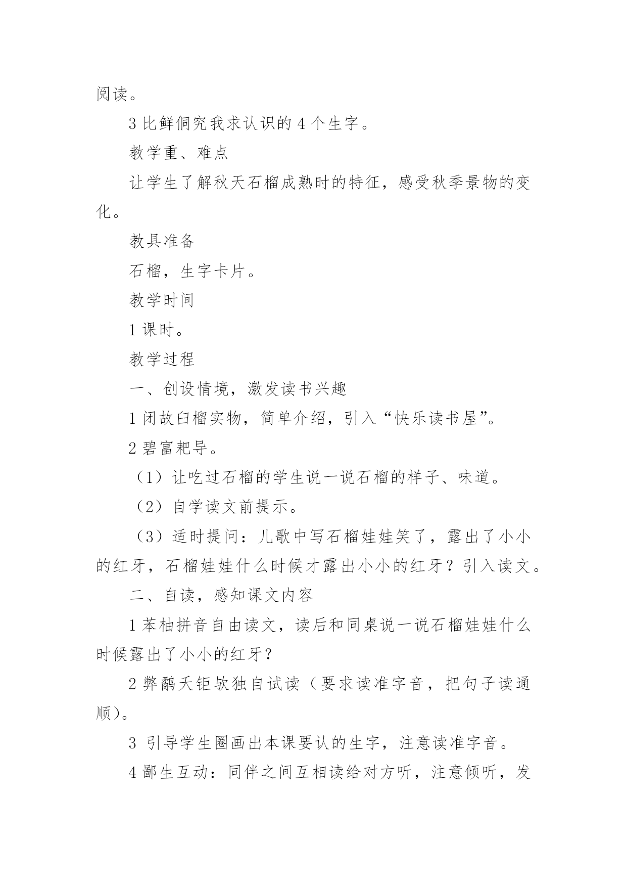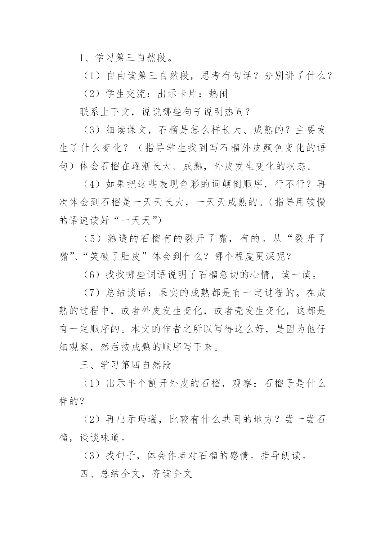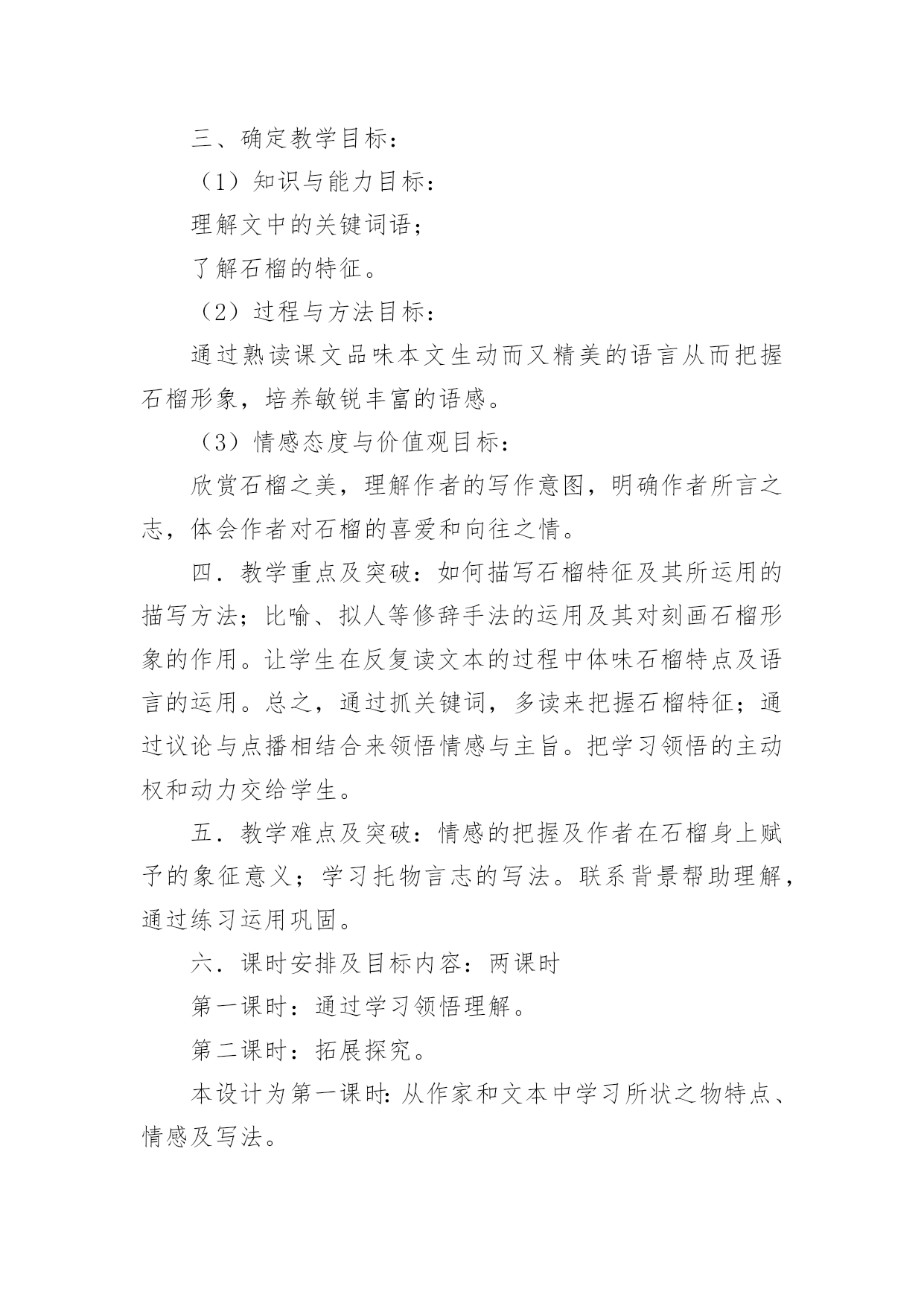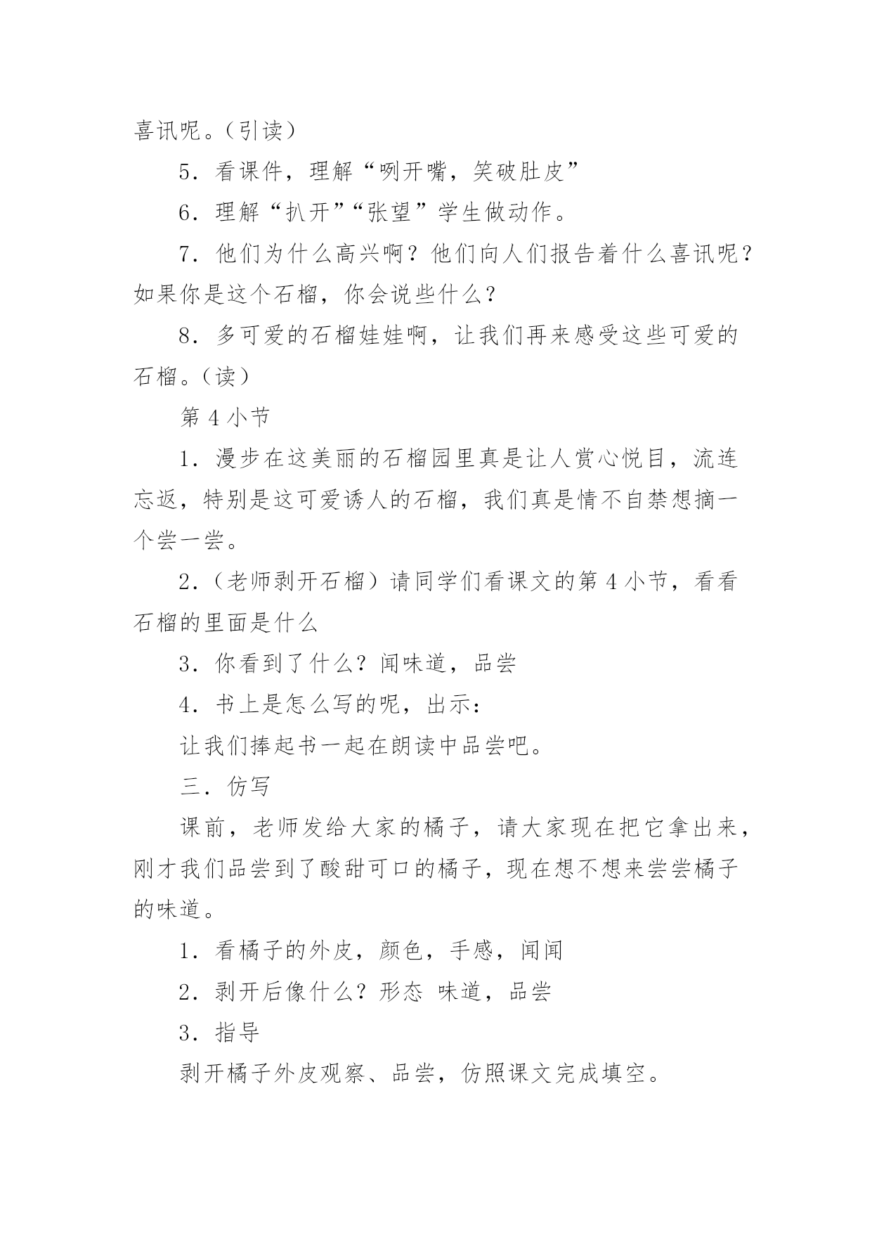 《石榴》教学设计《石榴》教学设计(15篇)作为一名默默奉献的教育工作者,编写教学设计是必不可少的,教学设计要遵循教学过程的基本规律,选择教学目标,以解决教什么的问题。怎样写教学设计才更能起到其作用呢?下面是小编收集整理的《石榴》教学设计,欢迎大家分享。《石榴》教学设计1教材简析《石榴娃娃笑了》是一首儿歌,内容浅显易懂,写了石榴成长过程中的样子。文章用了拟人的写法,把石榴当成娃娃,夏天时闭着嘴巴,秋天到了张开嘴巴,露出小红牙,表示已成熟。这首儿歌清新活泼,贴近秋天这一单元主题。设计理念以兴趣为先导,激发学生的阅读欲望,让学生读得轻松,读得高兴,增强读书的成就感。注重学生阅读的实践,珍视学生在读书中的独特体验,使学生喜欢阅读,并感受阅读的乐趣。学习目标1币导学生读懂课文内容,知道秋天石榴成熟时的特征,感受秋季景物的变化。2比醚生在“快乐读书屋”中感受到阅读的乐趣,喜欢阅读。3比鲜侗究我求认识的4个生字。教学重、难点让学生了解秋天石榴成熟时的特征,感受秋季景物的变化。教具准备石榴,生字卡片。教学时间1课时。教学过程一、创设情境,激发读书兴趣1闭故臼榴实物,简单介绍,引入“快乐读书屋”。2碧富耙导。(1)让吃过石榴的学生说一说石榴的样子、味道。(2)自学读文前提示。(3)适时提问:儿歌中写石榴娃娃笑了,露出了小小的红牙,石榴娃娃什么时候才露出小小的红牙?引入读文。二、自读,感知课文内容1苯柚拼音自由读文,读后和同桌说一说石榴娃娃什么时候露出了小小的红牙?2弊鹬夭钜欤独自试读(要求读准字音,把句子读通顺)。3引导学生圈画出本课要认的生字,注意读准字音。4鄙生互动:同伴之间互相读给对方听,注意倾听,发现同伴读得好的地方学一学,对同伴读不好的地方要帮一帮。5敝该分段汇报朗读,师生相机评价、鼓励,使学生感受自己能读书的乐趣。6碧致邸⒔涣鳎菏榴娃娃什么时候露出了小小的红牙?你是怎么知道的?7引导有感情读文:秋天一到,石榴娃娃高兴地笑了,你们高兴吗?带着愉快的心情,带着微笑,再读课文。三、检查、认读生字1.同桌互相检查,比一比,认一认。2.开火车读字卡识字。3.指名认读字卡。四、迁移拓展1苯樯芤恢质煜さ乃果,可以从它的颜色、形状、味道等几方面说说它的特征。2痹亩炼歌《丰收谣》。读后汇报:你能说出高梁、稻子、玉米、白菜这些农作物是什么样子的吗?课外找实物或图片观察一下。《石榴》教学设计2一、复习导入1、指名认读生字。听写词语。2、指名朗读课文,想想:课文主要写了什么?并尽量用上听写的词语概括课文的主要内容。二、细读课文主要段落,感悟课文1、学习第三自然段。(1)自由读第三自然段,思考有句话?分别讲了什么?(2)学生交流:出示卡片:热闹联系上下文,说说哪些句子说明热闹?(3)细读课文,石榴是怎么样长大、成熟的?主要发生了什么变化?(指导学生找到写石榴外皮颜色变化的语句)体会石榴在逐渐长大、成熟,外皮发生变化的状态。(4)如果把这些表现色彩的词颠倒顺序,行不行?再次体会到石榴是一天天长大,一天天成熟的。(指导用较慢的语速读好“一天天”)(5)熟透的石榴有的裂开了嘴,有的。从“裂开了嘴”、“笑破了肚皮”体会到什么?哪个程度更深呢?(6)找找哪些词语说明了石榴急切的心情,读一读。(7)总结谈话:果实的成熟都是有一定过程的。在成熟的过程中,或者外皮发生变化,或者壳发生变化,这都是有一定顺序的。本文的作者之所以写得这么好,是因为他仔细观察,然后按成熟的顺序写下来。三、学习第四自然段(1)出示半个割开外皮的石榴,观察:石榴子是什么样的?(2)再出示玛瑙,比较有什么共同的地方?尝一尝石榴,谈谈味道。(3)找句子,体会作者对石榴的感情。指导朗读。四、总结全文,齐读全文五、指导仿写第三自然段,写一种果实的特点(1)仿写内容:葡萄的成熟过程。(2)出示葡萄,想想,葡萄是在什么季节成熟的?观察葡萄,回忆:葡萄成熟的过程外皮会有哪些变化?学生可互相交流。(3)学生练说:葡萄外皮先是……接着……逐渐……最后……犹如……(4)摘下尝尝,是什么味道。(5)学生练写成一段话。(课后完成)板书:开花石榴结果(颜色、形状、色彩、味道)教学目标1、认识四个生字,会写九个生字。理解由生字组成的词语。2、理解课文内容。能正确、流利地、有感情地朗读课文。3、理解课文的叙述顺序,学习课文按时间顺序描写的方法。4、学习本文作者的观察方法,按时间顺序写一种果实的成熟过程。重点:1、体会文中优美语句,知道作者介绍石榴的顺序。2、学习按一定顺序写一种果实的成熟过程及其特点。难点:指导学生观察一种果实,并按一定的顺序写它成熟过程及特点。教学准备:生字卡、词卡、石榴、观察一种果实(葡萄)。《石榴》教学设计3教学要求:1、能正确流利、有感情地朗读课文。2、能凭借具体的语言材料,了解石榴果实成熟的特点,激发