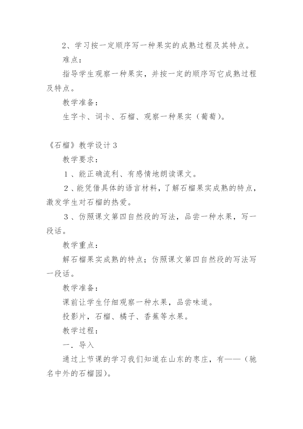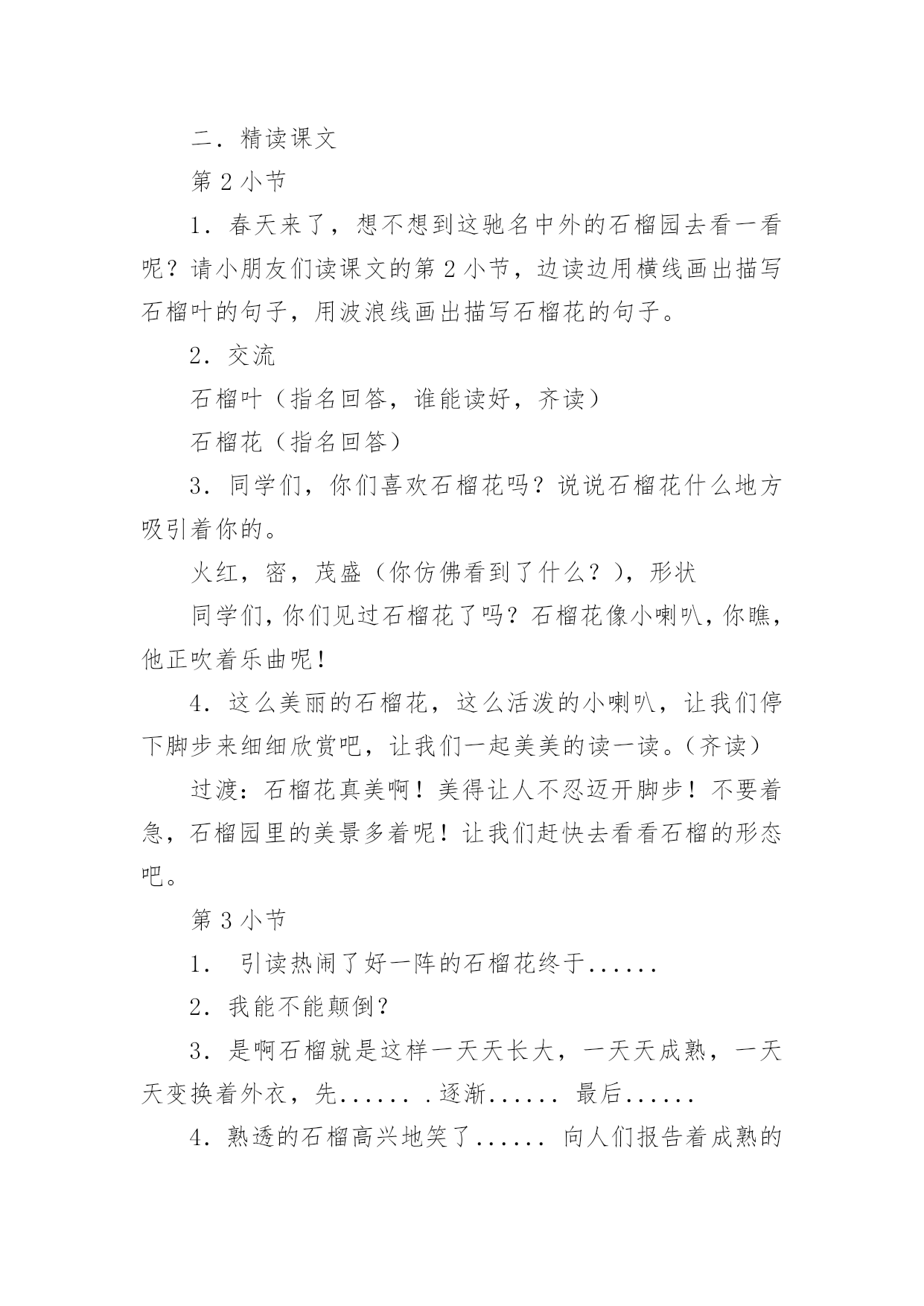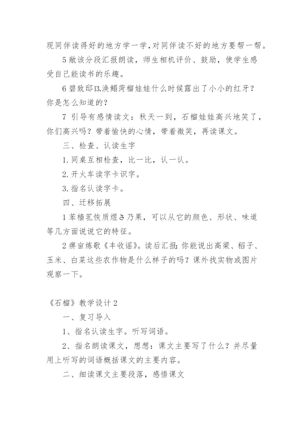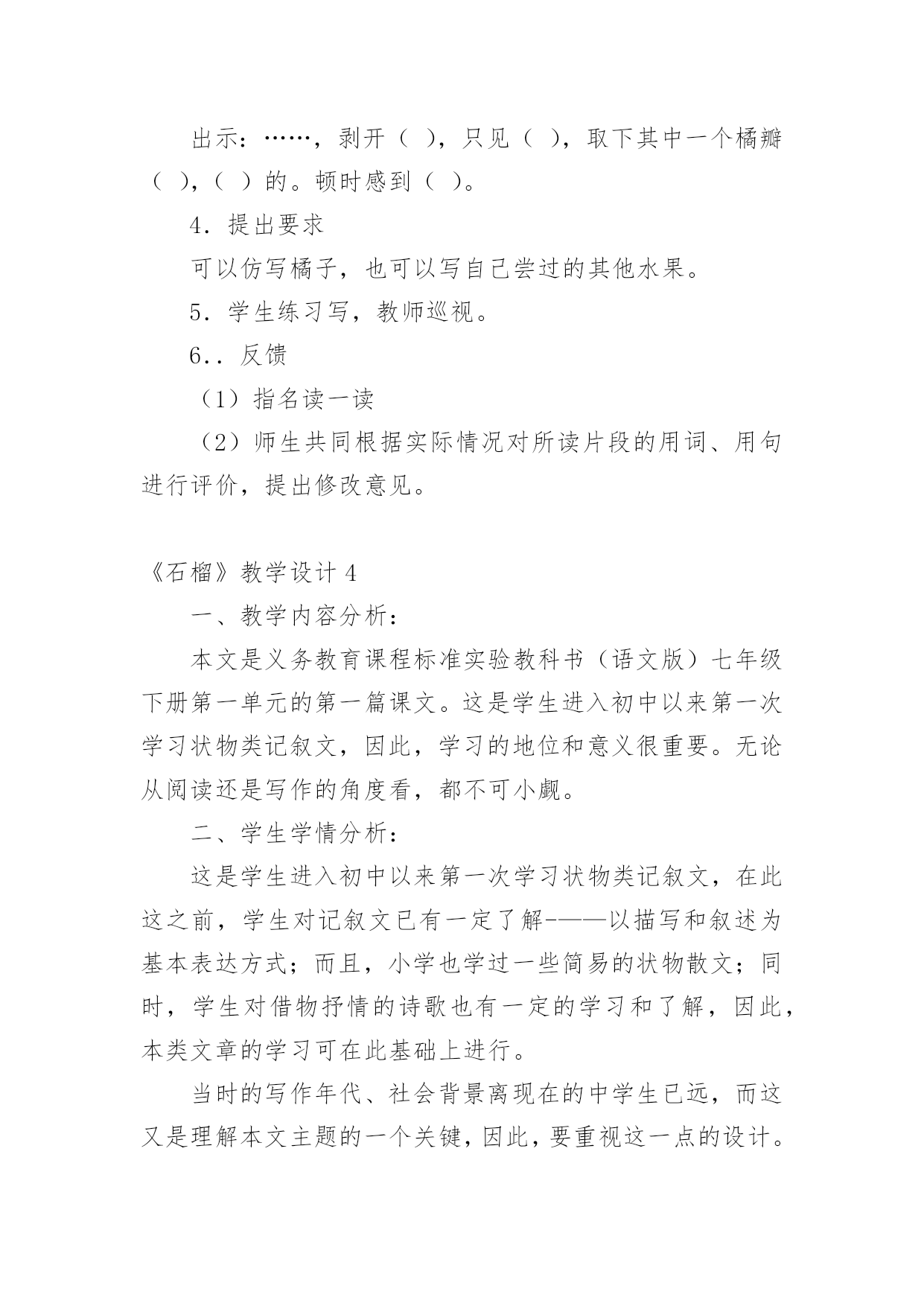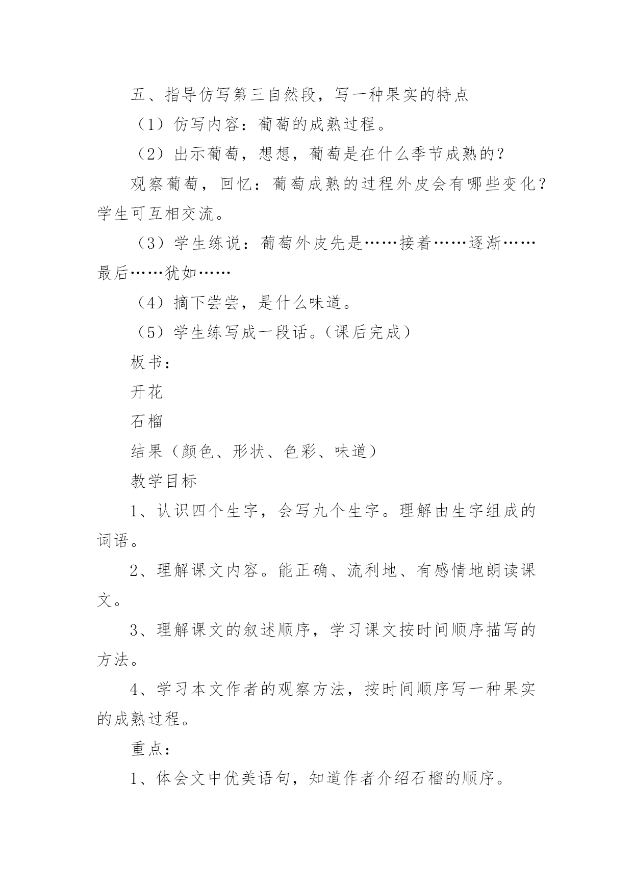 《石榴》教学设计《石榴》教学设计(15篇)作为一名默默奉献的教育工作者,编写教学设计是必不可少的,教学设计要遵循教学过程的基本规律,选择教学目标,以解决教什么的问题。怎样写教学设计才更能起到其作用呢?下面是小编收集整理的《石榴》教学设计,欢迎大家分享。《石榴》教学设计1教材简析《石榴娃娃笑了》是一首儿歌,内容浅显易懂,写了石榴成长过程中的样子。文章用了拟人的写法,把石榴当成娃娃,夏天时闭着嘴巴,秋天到了张开嘴巴,露出小红牙,表示已成熟。这首儿歌清新活泼,贴近秋天这一单元主题。设计理念以兴趣为先导,激发学生的阅读欲望,让学生读得轻松,读得高兴,增强读书的成就感。注重学生阅读的实践,珍视学生在读书中的独特体验,使学生喜欢阅读,并感受阅读的乐趣。学习目标1币导学生读懂课文内容,知道秋天石榴成熟时的特征,感受秋季景物的变化。2比醚生在“快乐读书屋”中感受到阅读的乐趣,喜欢阅读。3比鲜侗究我求认识的4个生字。教学重、难点让学生了解秋天石榴成熟时的特征,感受秋季景物的变化。教具准备石榴,生字卡片。教学时间1课时。教学过程一、创设情境,激发读书兴趣1闭故臼榴实物,简单介绍,引入“快乐读书屋”。2碧富耙导。(1)让吃过石榴的学生说一说石榴的样子、味道。(2)自学读文前提示。(3)适时提问:儿歌中写石榴娃娃笑了,露出了小小的红牙,石榴娃娃什么时候才露出小小的红牙?引入读文。二、自读,感知课文内容1苯柚拼音自由读文,读后和同桌说一说石榴娃娃什么时候露出了小小的红牙?2弊鹬夭钜欤独自试读(要求读准字音,把句子读通顺)。3引导学生圈画出本课要认的生字,注意读准字音。4鄙生互动:同伴之间互相读给对方听,注意倾听,发现同伴读得好的地方学一学,对同伴读不好的地方要帮一帮。5敝该分段汇报朗读,师生相机评价、鼓励,使学生感受自己能读书的乐趣。6碧致邸⒔涣鳎菏榴娃娃什么时候露出了小小的红牙?你是怎么知道的?7引导有感情读文:秋天一到,石榴娃娃高兴地笑了,你们高兴吗?带着愉快的心情,带着微笑,再读课文。三、检查、认读生字1.同桌互相检查,比一比,认一认。2.开火车读字卡识字。3.指名认读字卡。四、迁移拓展1苯樯芤恢质煜さ乃果,可以从它的颜色、形状、味道等几方面说说它的特征。2痹亩炼歌《丰收谣》。读后汇报:你能说出高梁、稻子、玉米、白菜这些农作物是什么样子的吗?课外找实物或图片观察一下。《石榴》教学设计2一、复习导入1、指名认读生字。听写词语。2、指名朗读课文,想想:课文主要写了什么?并尽量用上听写的词语概括课文的主要内容。二、细读课文主要段落,感悟课文1、学习第三自然段。(1)自由读第三自然段,思考有句话?分别讲了什么?(2)学生交流:出示卡片:热闹联系上下文,说说哪些句子说明热闹?(3)细读课文,石榴是怎么样长大、成熟的?主要发生了什么变化?(指导学生找到写石榴外皮颜色变化的语句)体会石榴在逐渐长大、成熟,外皮发生变化的状态。(4)如果把这些表现色彩的词颠倒顺序,行不行?再次体会到石榴是一天天长大,一天天成熟的。(指导用较慢的语速读好“一天天”)(5)熟透的石榴有的裂开了嘴,有的。从“裂开了嘴”、“笑破了肚皮”体会到什么?哪个程度更深呢?(6)找找哪些词语说明了石榴急切的心情,读一读。(7)总结谈话:果实的成熟都是有一定过程的。在成熟的过程中,或者外皮发生变化,或者壳发生变化,这都是有一定顺序的。本文的作者之所以写得这么好,是因为他仔细观察,然后按成熟的顺序写下来。三、学习第四自然段(1)出示半个割开外皮的石榴,观察:石榴子是什么样的?(2)再出示玛瑙,比较有什么共同的地方?尝一尝石榴,谈谈味道。(3)找句子,体会作者对石榴的感情。指导朗读。四、总结全文,齐读全文五、指导仿写第三自然段,写一种果实的特点(1)仿写内容:葡萄的成熟过程。(2)出示葡萄,想想,葡萄是在什么季节成熟的?观察葡萄,回忆:葡萄成熟的过程外皮会有哪些变化?学生可互相交流。(3)学生练说:葡萄外皮先是……接着……逐渐……最后……犹如……(4)摘下尝尝,是什么味道。(5)学生练写成一段话。(课后完成)板书:开花石榴结果(颜色、形状、色彩、味道)教学目标1、认识四个生字,会写九个生字。理解由生字组成的词语。2、理解课文内容。能正确、流利地、有感情地朗读课文。3、理解课文的叙述顺序,学习课文按时间顺序描写的方法。4、学习本文作者的观察方法,按时间顺序写一种果实的成熟过程。重点:1、体会文中优美语句,知道作者介绍石榴的顺序。2、学习按一定顺序写一种果实的成熟过程及其特点。难点:指导学生观察一种果实,并按一定的顺序写它成熟过程及特点。教学准备:生字卡、词卡、石榴、观察一种果实(葡萄)。《石榴》教学设计3教学要求:1、能正确流利、有感情地朗读课文。2、能凭借具体的语言材料,了解石榴果实成熟的特点,激发