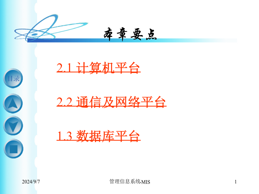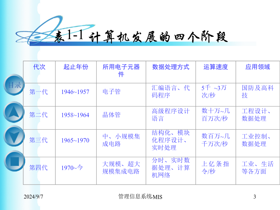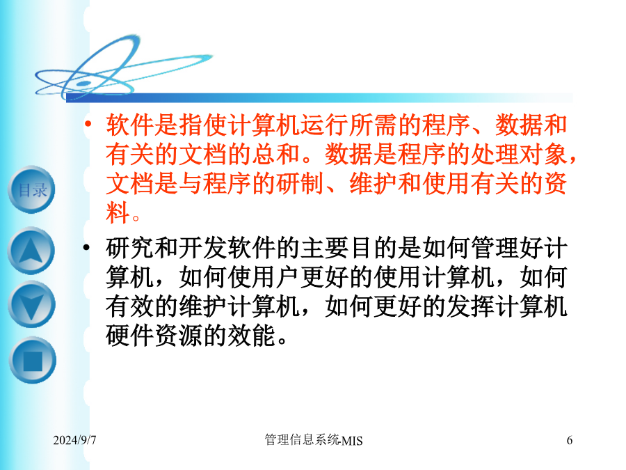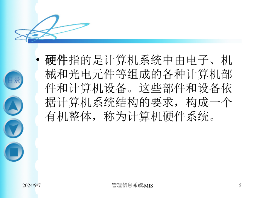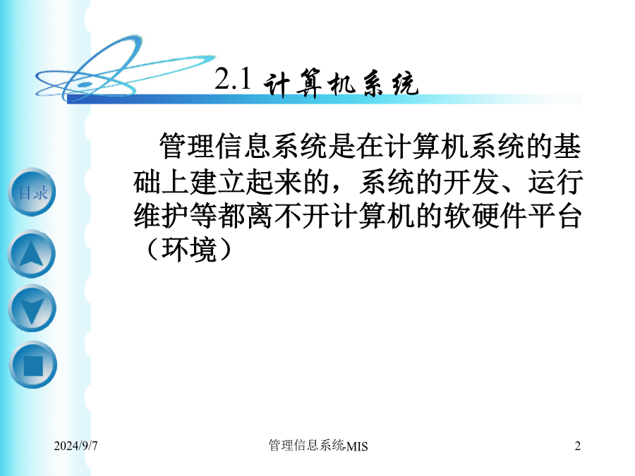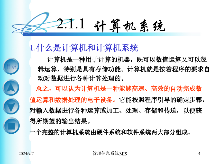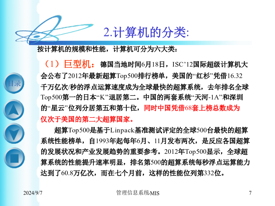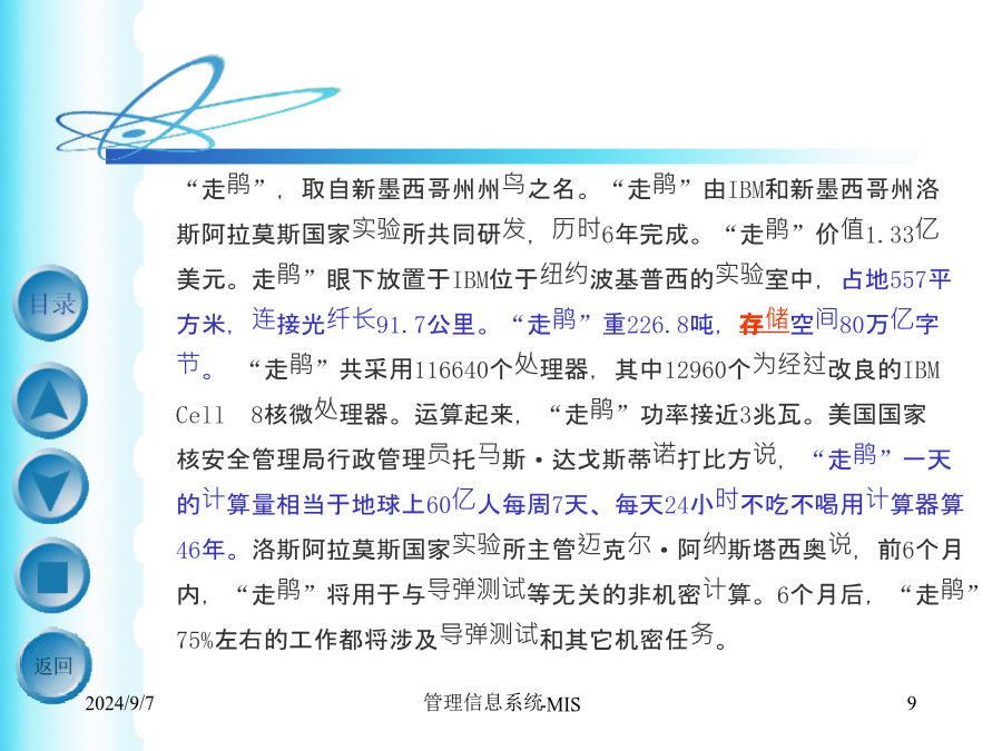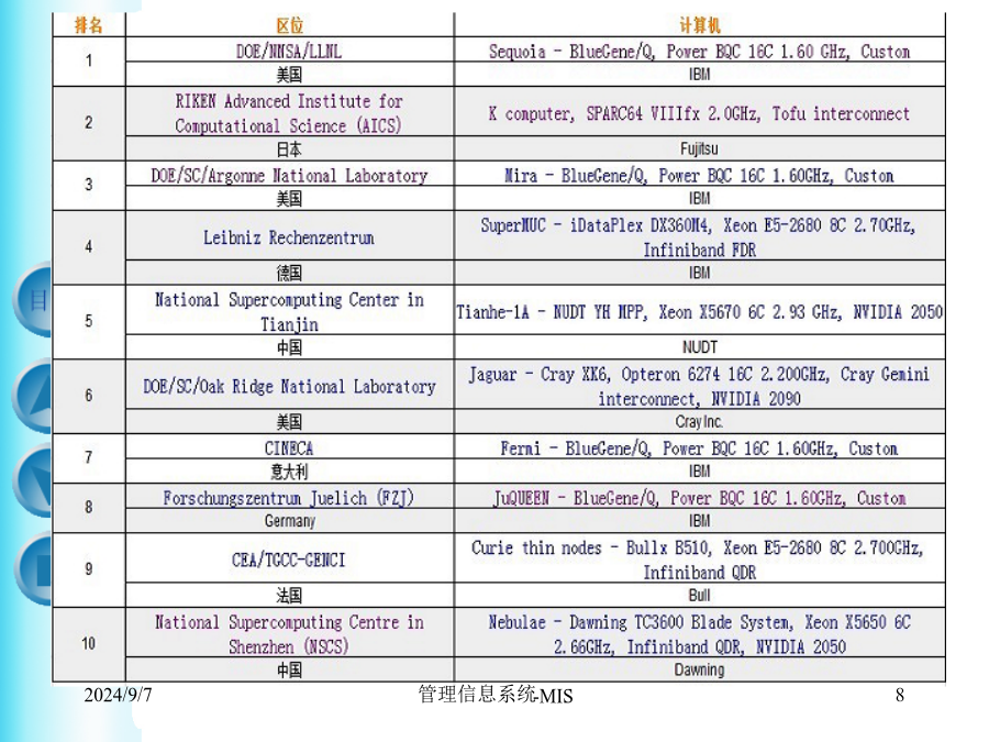 第2章企业管理的信息化平台本章要点2.1计算机系统表1-1计算机发展的四个阶段2.1.1计算机系统硬件指的是计算机系统中由电子、机械和光电元件等组成的各种计算机部件和计算机设备。这些部件和设备依据计算机系统结构的要求,构成一个有机整体,称为计算机硬件系统。软件是指使计算机运行所需的程序、数据和有关的文档的总和。数据是程序的处理对象,文档是与程序的研制、维护和使用有关的资料。研究和开发软件的主要目的是如何管理好计算机,如何使用户更好的使用计算机,如何有效的维护计算机,如何更好的发挥计算机硬件资源的效能。按计算机的规模和性能,计算机可分为六大类:(1)巨型机:德国当地时间6月18日,ISC’12国际超级计算机大会公布了2012年最新超算Top500排行榜单,美国的“红杉”凭借16.32千万亿次/秒的浮点运算速度成为全球最快的超算系统,去年排名全球Top500第一的日本“K”退居第二。中国的两套系统“天河-1A”和深圳的“星云”位列分居第五和第十位,同时中国凭借68套上榜总数成为仅次于美国的第二大超算国家。超算Top500是基于Linpack基准测试评定的全球500台最快的超算系统性能榜单,自1993年起每年6月、11月发布两次,是反应各国超算的发展状况和产业发展趋势的重要参考。2012年Top500显示,全球超算系统的性能提升速率明显,排名第500的超算系统每秒浮点运算能力达到了60.8万亿次,而在七个月前,这样的性能位列第332位。2024/9/7“走鹃”,取自新墨西哥州州鸟之名。“走鹃”由IBM和新墨西哥州洛斯阿拉莫斯国家实验所共同研发,历时6年完成。“走鹃”价值1.33亿美元。走鹃”眼下放置于IBM位于纽约波基普西的实验室中,占地557平方米,连接光纤长91.7公里。“走鹃”重226.8吨,存储空间80万亿字节。“走鹃”共采用116640个处理器,其中12960个为经过改良的IBMCell8核微处理器。运算起来,“走鹃”功率接近3兆瓦。美国国家核安全管理局行政管理员托马斯·达戈斯蒂诺打比方说,“走鹃”一天的计算量相当于地球上60亿人每周7天、每天24小时不吃不喝用计算器算46年。洛斯阿拉莫斯国家实验所主管迈克尔·阿纳斯塔西奥说,前6个月内,“走鹃”将用于与导弹测试等无关的非机密计算。6个月后,“走鹃”75%左右的工作都将涉及导弹测试和其它机密任务。新浪科技讯北京时间2011.8月2日晚间消息,据国外媒体报道,全球超级计算机500强排名今年11月将进行更新,而中国的超级计算机“星云”(Nebulae)届时可能问鼎冠军宝座。全球超级计算机500强排行榜每年更新两次,分别在每年的5月和11月发布。在今年5月份的排行榜中,位于中国深圳国家超级计算机中心的“星云”排名第二,而排名首位的是美国橡树岭国家实验室的“美洲虎”(Jaguar)['dʒægwɑr]。“美洲虎”的计算速度为每秒钟1.76千万亿次(PFlops)浮点运算,而“星云”的计算速度为每秒钟1.27千万亿次(PFlops)浮点运算。但是,“星云”的理论最高计算速度为每秒钟2.98千万亿次(PFlops)。而近期的测试结果也显示,“星云”的实际计算速度也趋于该理论最高速度。因此,在11月即将推出的新一期全球超级计算机500强排名中,“星云”很可能问鼎冠军宝座。至于“美洲虎”,有报道称将在未来五年内进行重大升级。否则,“美洲虎”在未来几年的排名可能要在下半区了(250名之后)。当然,中国的“星云”也许不会称霸很久,因为美国劳伦斯里弗莫尔国家实验室(LawrenceLivermoreNationalLaboratory)和IBM将于2011年部署Sequoia超级计算机,计算速度高达每秒钟20千万亿次(PFlops)浮点运算。Sequoia将拥有98304个计算机节点,处理器内核总数为160万个,每个内核拥有16GBRAM。而中国的“星云”采用英特尔至强X56502.66GHz六核处理器和NVIDIATeslaC2050图形处理器,总计120640个计算核心。(李明)2024/9/72024/9/72024/9/7“走鹃”,取自新墨西哥州州鸟之名。“走鹃”由IBM和新墨西哥州洛斯阿拉莫斯国家实验所共同研发,历时6年完成。“走鹃”价值1.33亿美元。走鹃”眼下放置于IBM位于纽约波基普西的实验室中,占地557平方米,连接光纤长91.7公里。“走鹃”重226.8吨,存储空间80万亿字节。“走鹃”共采用116640个处理器,其中12960个为经过改良的IBMCell8核微处理器。运算起来,“走鹃”功率接近3兆瓦。美国国家核安全管理局行政管理员托马斯·达戈斯蒂诺打比方说,“走鹃”一天的计算量相当于地球上60亿人每周7天、每天24小时不吃不