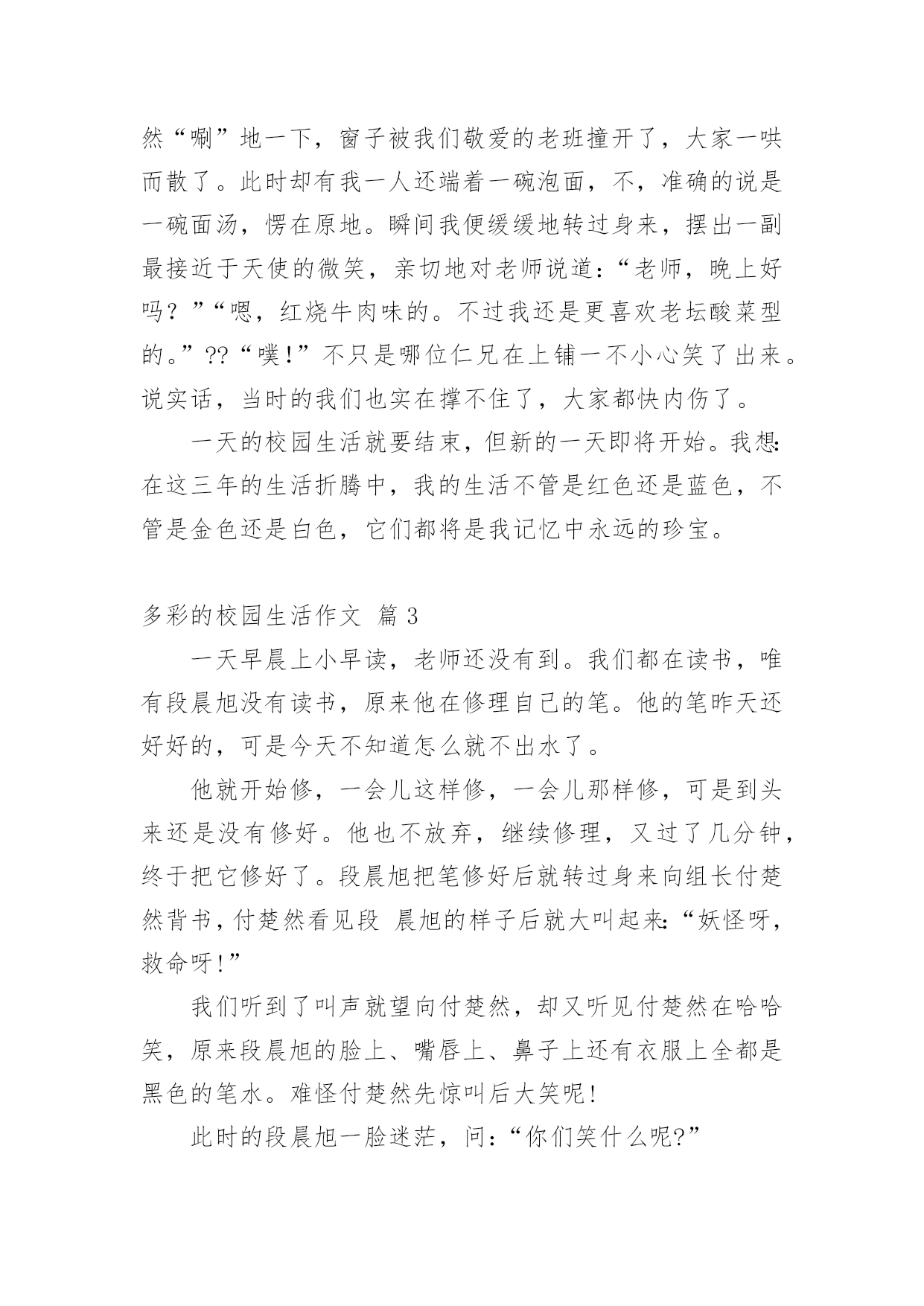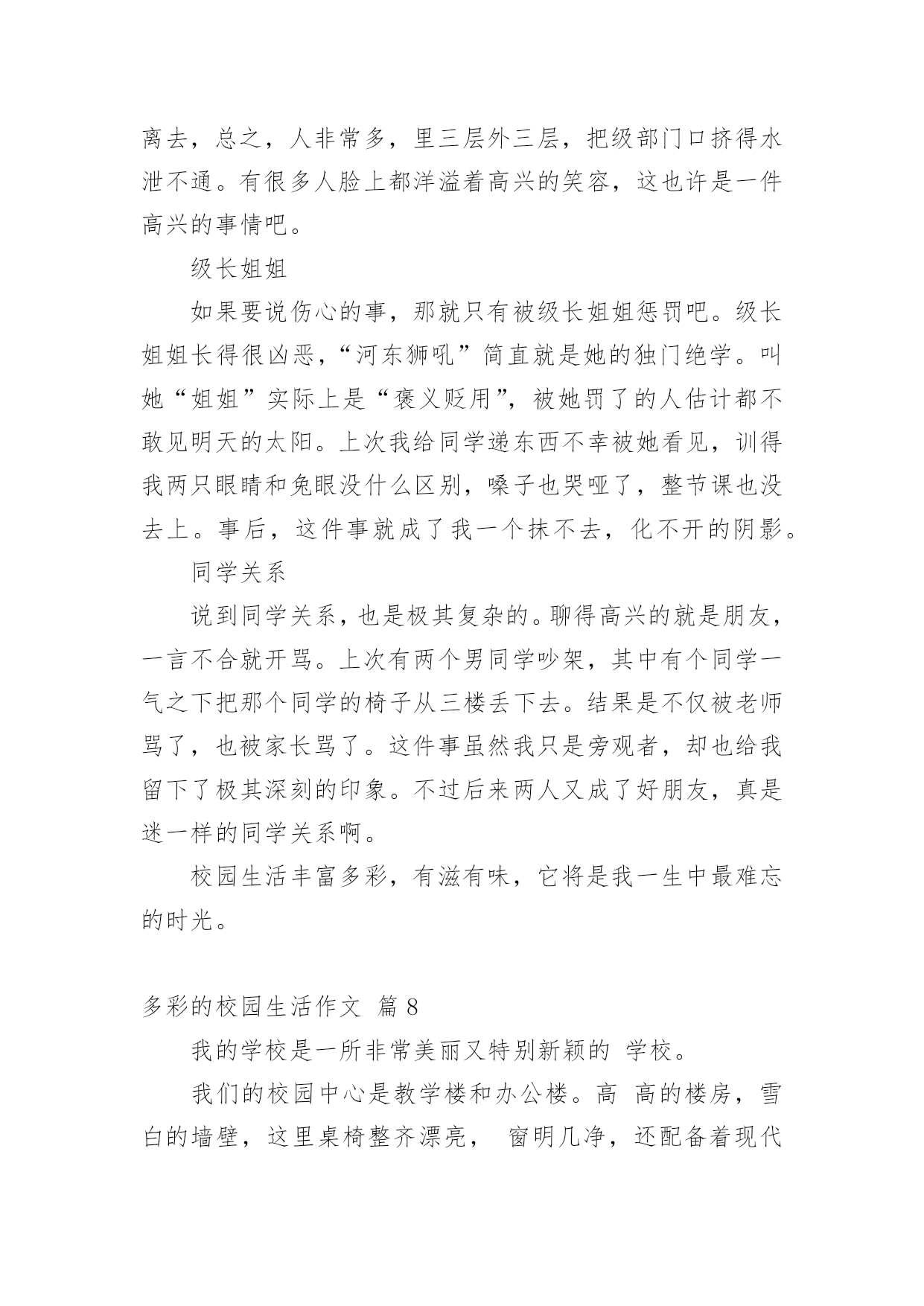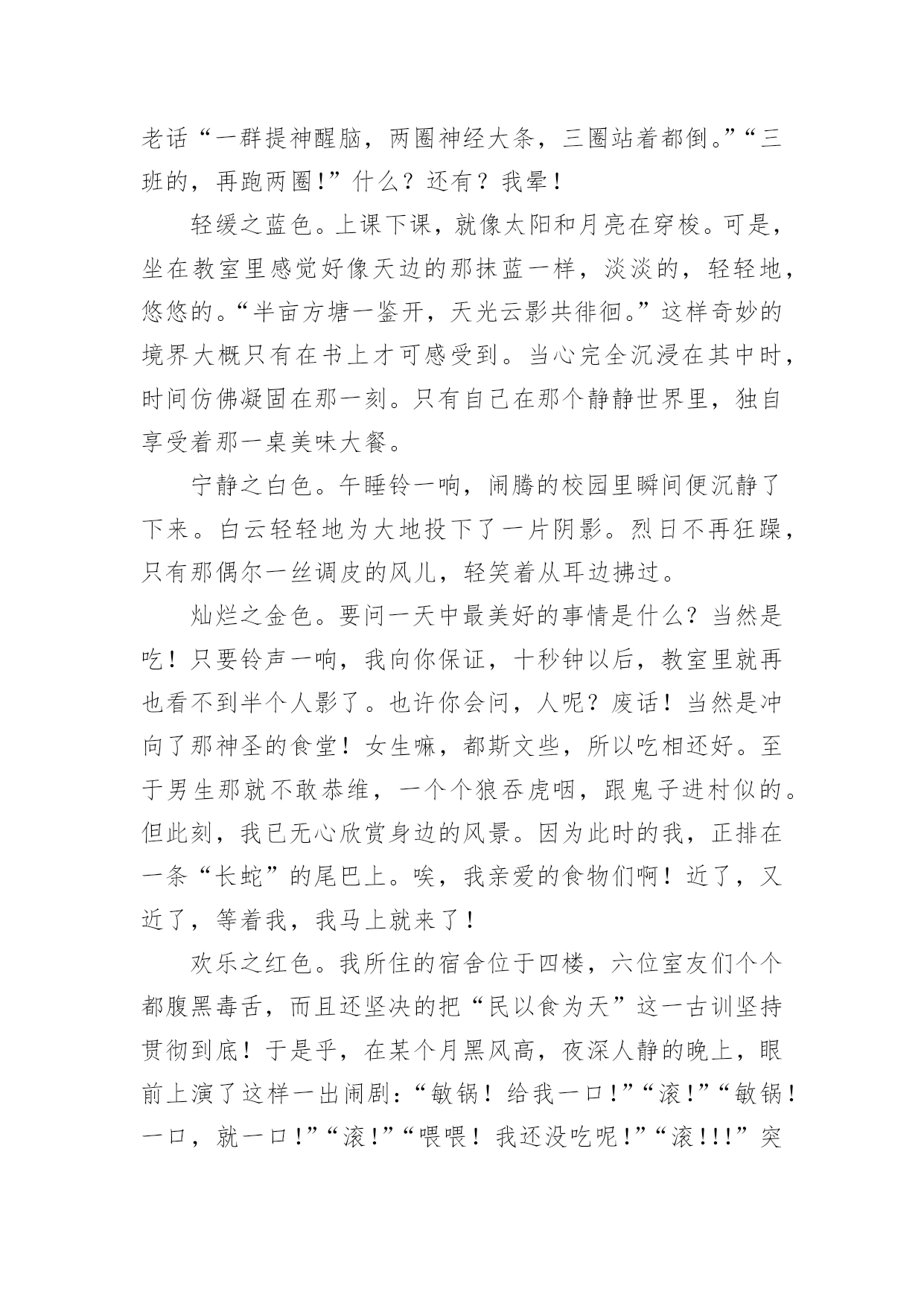 多彩的校园生活作文实用的多彩的校园生活作文八篇在平日的学习、工作和生活里,大家一定都接触过作文吧,写作文是培养人们的观察力、联想力、想象力、思考力和记忆力的重要手段。你所见过的作文是什么样的呢?以下是小编整理的多彩的校园生活作文8篇,仅供参考,大家一起来看看吧。多彩的校园生活作文篇1缤纷的校园生活是个无形的调色盘,而我们则是一位位画家,调配出各种鲜艳的色彩,释放着年轻活力。这些色彩时而热情奔放,时而冷若冰霜,时而朝气蓬勃……瞧,它们一蹦一跳地走来了。走在第一个的是红色,它永远都那么快乐,那么激情四溢。这是运动健将们用自己的汗水涂抹而成。他们在跑道上驰骋,你追我赶,毫不相让。他们在篮球场上拼搏,奋力争抢,生龙活虎。他们好似一个个跳跃的音符,用青春活力为校园涂上一抹亮丽的色彩。走在第二个的是天蓝色,远远看去,柔柔的,依依的。那是阳光少年用歌声组成的旋律。在合唱节上,我们伴着蓝天小鸟,用最纯真的歌声抒发着自己的情感,用最甜美的微笑表达着自己的祝愿。微风拂过,歌声飘得很远很远……在队伍里蹦蹦跳跳的是代表智慧的绿色。那是“小巧手”比赛留下的痕迹。此番比赛一开打,各路好手都倾尽所能,演出了一场场好戏。“小科学家”们在一台台仪器旁认真地做着,任凭细细密密的汗水沾满额头,成功了,才露出幸福的微笑。“小厨师”们一改往日的娇气,与锅碗瓢盆打上了交道。虽闹出了不少笑话,但终归还是捧出了一道道香甜可口的佳肴,引得评委老师直夸棒。“小画家”们也不闲着,用手中的画笔描绘出一幅幅精美的图画。那一刻,每一个人都体会到了成功的喜悦,欢笑在校园内回响。调色盘里别的颜色也憋不住了,那就让它们一一亮相吧。有点魔力的紫色是童话节大家编织的.梦幻;带些调皮的橙色是海洋节时一张张古怪的面具;写满诗情画意的白色是玻璃窗上留下的小手印……我们用想象的翅膀书写童年的欢笑,我们用灵巧的双手描绘美好的未来;我们用缤纷的梦想编织多彩的校园。多彩的校园生活作文篇2熬过漫长的暑假升入了初中,生活一下子变得丰富起来。早晨操练是黑色的;上课学习是蓝色的;中午午睡是白色的;食堂进餐是金色的;寝室生活是红色的。悲催之黑色。这要说初中最苦的是真么莫过于每天早晨的必修课——晨跑了。外面天空还被黑幕罩着,“每班间隔距离五米,每班跑五圈!”听,这魔音!一圈又一圈,我的`呼吸开始变得急促起来,心跳也慢慢加速。还真是应了那句老话“一群提神醒脑,两圈神经大条,三圈站着都倒。”“三班的,再跑两圈!”什么?还有?我晕!轻缓之蓝色。上课下课,就像太阳和月亮在穿梭。可是,坐在教室里感觉好像天边的那抹蓝一样,淡淡的,轻轻地,悠悠的。“半亩方塘一鉴开,天光云影共徘徊。”这样奇妙的境界大概只有在书上才可感受到。当心完全沉浸在其中时,时间仿佛凝固在那一刻。只有自己在那个静静世界里,独自享受着那一桌美味大餐。宁静之白色。午睡铃一响,闹腾的校园里瞬间便沉静了下来。白云轻轻地为大地投下了一片阴影。烈日不再狂躁,只有那偶尔一丝调皮的风儿,轻笑着从耳边拂过。灿烂之金色。要问一天中最美好的事情是什么?当然是吃!只要铃声一响,我向你保证,十秒钟以后,教室里就再也看不到半个人影了。也许你会问,人呢?废话!当然是冲向了那神圣的食堂!女生嘛,都斯文些,所以吃相还好。至于男生那就不敢恭维,一个个狼吞虎咽,跟鬼子进村似的。但此刻,我已无心欣赏身边的风景。因为此时的我,正排在一条“长蛇”的尾巴上。唉,我亲爱的食物们啊!近了,又近了,等着我,我马上就来了!欢乐之红色。我所住的宿舍位于四楼,六位室友们个个都腹黑毒舌,而且还坚决的把“民以食为天”这一古训坚持贯彻到底!于是乎,在某个月黑风高,夜深人静的晚上,眼前上演了这样一出闹剧:“敏锅!给我一口!”“滚!”“敏锅!一口,就一口!”“滚!”“喂喂!我还没吃呢!”“滚!!!”突然“唰”地一下,窗子被我们敬爱的老班撞开了,大家一哄而散了。此时却有我一人还端着一碗泡面,不,准确的说是一碗面汤,愣在原地。瞬间我便缓缓地转过身来,摆出一副最接近于天使的微笑,亲切地对老师说道:“老师,晚上好吗?”“嗯,红烧牛肉味的。不过我还是更喜欢老坛酸菜型的。”??“噗!”不只是哪位仁兄在上铺一不小心笑了出来。说实话,当时的我们也实在撑不住了,大家都快内伤了。一天的校园生活就要结束,但新的一天即将开始。我想:在这三年的生活折腾中,我的生活不管是红色还是蓝色,不管是金色还是白色,它们都将是我记忆中永远的珍宝。多彩的校园生活作文篇3一天早晨上小早读,老师还没有到。我们都在读书,唯有段晨旭没有读书,原来他在修理自己的笔。他的笔昨天还好好的,可是今天不知道怎么就不出水了。他就开始修,一会儿这样修,一会儿那样修,可是到头来还是没有修好。他也不放弃,继续修理,又过了几分钟,终于把它修好了。段晨旭把笔修好后就转过身来向组长付楚然背书,付楚然看