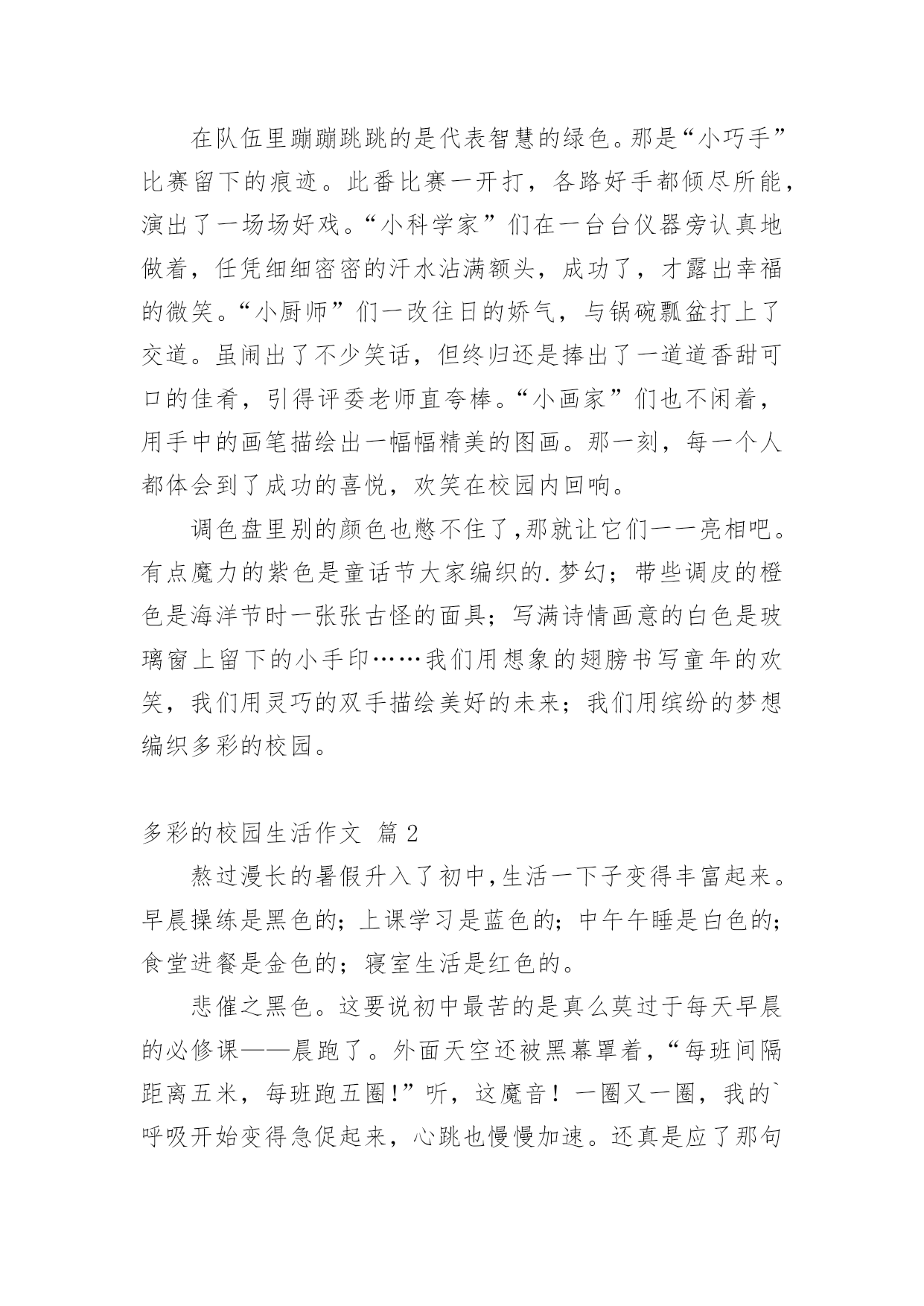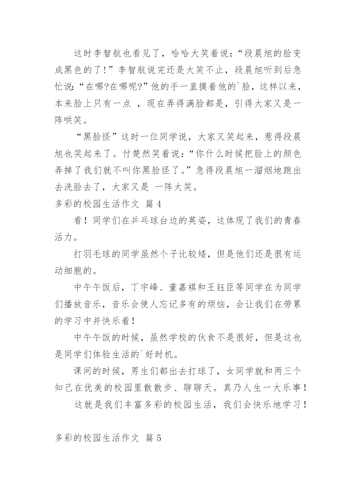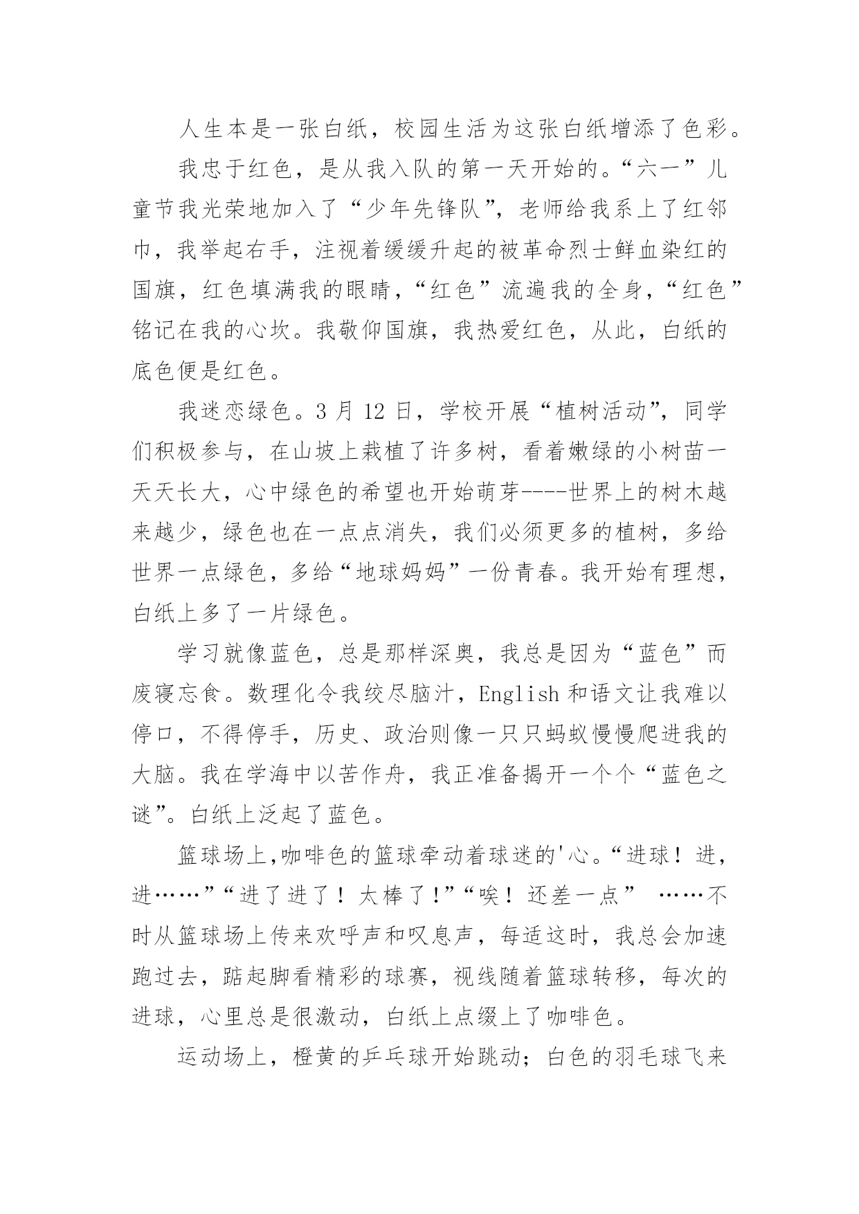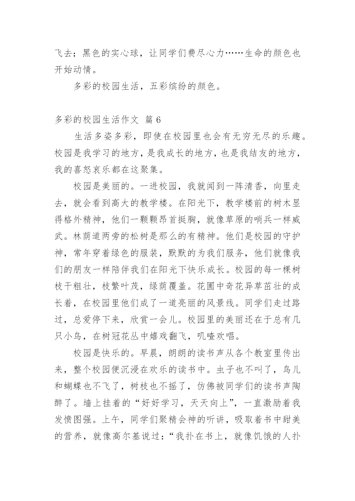 多彩的校园生活作文实用的多彩的校园生活作文八篇在平日的学习、工作和生活里,大家一定都接触过作文吧,写作文是培养人们的观察力、联想力、想象力、思考力和记忆力的重要手段。你所见过的作文是什么样的呢?以下是小编整理的多彩的校园生活作文8篇,仅供参考,大家一起来看看吧。多彩的校园生活作文篇1缤纷的校园生活是个无形的调色盘,而我们则是一位位画家,调配出各种鲜艳的色彩,释放着年轻活力。这些色彩时而热情奔放,时而冷若冰霜,时而朝气蓬勃……瞧,它们一蹦一跳地走来了。走在第一个的是红色,它永远都那么快乐,那么激情四溢。这是运动健将们用自己的汗水涂抹而成。他们在跑道上驰骋,你追我赶,毫不相让。他们在篮球场上拼搏,奋力争抢,生龙活虎。他们好似一个个跳跃的音符,用青春活力为校园涂上一抹亮丽的色彩。走在第二个的是天蓝色,远远看去,柔柔的,依依的。那是阳光少年用歌声组成的旋律。在合唱节上,我们伴着蓝天小鸟,用最纯真的歌声抒发着自己的情感,用最甜美的微笑表达着自己的祝愿。微风拂过,歌声飘得很远很远……在队伍里蹦蹦跳跳的是代表智慧的绿色。那是“小巧手”比赛留下的痕迹。此番比赛一开打,各路好手都倾尽所能,演出了一场场好戏。“小科学家”们在一台台仪器旁认真地做着,任凭细细密密的汗水沾满额头,成功了,才露出幸福的微笑。“小厨师”们一改往日的娇气,与锅碗瓢盆打上了交道。虽闹出了不少笑话,但终归还是捧出了一道道香甜可口的佳肴,引得评委老师直夸棒。“小画家”们也不闲着,用手中的画笔描绘出一幅幅精美的图画。那一刻,每一个人都体会到了成功的喜悦,欢笑在校园内回响。调色盘里别的颜色也憋不住了,那就让它们一一亮相吧。有点魔力的紫色是童话节大家编织的.梦幻;带些调皮的橙色是海洋节时一张张古怪的面具;写满诗情画意的白色是玻璃窗上留下的小手印……我们用想象的翅膀书写童年的欢笑,我们用灵巧的双手描绘美好的未来;我们用缤纷的梦想编织多彩的校园。多彩的校园生活作文篇2熬过漫长的暑假升入了初中,生活一下子变得丰富起来。早晨操练是黑色的;上课学习是蓝色的;中午午睡是白色的;食堂进餐是金色的;寝室生活是红色的。悲催之黑色。这要说初中最苦的是真么莫过于每天早晨的必修课——晨跑了。外面天空还被黑幕罩着,“每班间隔距离五米,每班跑五圈!”听,这魔音!一圈又一圈,我的`呼吸开始变得急促起来,心跳也慢慢加速。还真是应了那句老话“一群提神醒脑,两圈神经大条,三圈站着都倒。”“三班的,再跑两圈!”什么?还有?我晕!轻缓之蓝色。上课下课,就像太阳和月亮在穿梭。可是,坐在教室里感觉好像天边的那抹蓝一样,淡淡的,轻轻地,悠悠的。“半亩方塘一鉴开,天光云影共徘徊。”这样奇妙的境界大概只有在书上才可感受到。当心完全沉浸在其中时,时间仿佛凝固在那一刻。只有自己在那个静静世界里,独自享受着那一桌美味大餐。宁静之白色。午睡铃一响,闹腾的校园里瞬间便沉静了下来。白云轻轻地为大地投下了一片阴影。烈日不再狂躁,只有那偶尔一丝调皮的风儿,轻笑着从耳边拂过。灿烂之金色。要问一天中最美好的事情是什么?当然是吃!只要铃声一响,我向你保证,十秒钟以后,教室里就再也看不到半个人影了。也许你会问,人呢?废话!当然是冲向了那神圣的食堂!女生嘛,都斯文些,所以吃相还好。至于男生那就不敢恭维,一个个狼吞虎咽,跟鬼子进村似的。但此刻,我已无心欣赏身边的风景。因为此时的我,正排在一条“长蛇”的尾巴上。唉,我亲爱的食物们啊!近了,又近了,等着我,我马上就来了!欢乐之红色。我所住的宿舍位于四楼,六位室友们个个都腹黑毒舌,而且还坚决的把“民以食为天”这一古训坚持贯彻到底!于是乎,在某个月黑风高,夜深人静的晚上,眼前上演了这样一出闹剧:“敏锅!给我一口!”“滚!”“敏锅!一口,就一口!”“滚!”“喂喂!我还没吃呢!”“滚!!!”突然“唰”地一下,窗子被我们敬爱的老班撞开了,大家一哄而散了。此时却有我一人还端着一碗泡面,不,准确的说是一碗面汤,愣在原地。瞬间我便缓缓地转过身来,摆出一副最接近于天使的微笑,亲切地对老师说道:“老师,晚上好吗?”“嗯,红烧牛肉味的。不过我还是更喜欢老坛酸菜型的。”??“噗!”不只是哪位仁兄在上铺一不小心笑了出来。说实话,当时的我们也实在撑不住了,大家都快内伤了。一天的校园生活就要结束,但新的一天即将开始。我想:在这三年的生活折腾中,我的生活不管是红色还是蓝色,不管是金色还是白色,它们都将是我记忆中永远的珍宝。多彩的校园生活作文篇3一天早晨上小早读,老师还没有到。我们都在读书,唯有段晨旭没有读书,原来他在修理自己的笔。他的笔昨天还好好的,可是今天不知道怎么就不出水了。他就开始修,一会儿这样修,一会儿那样修,可是到头来还是没有修好。他也不放弃,继续修理,又过了几分钟,终于把它修好了。段晨旭把笔修好后就转过身来向组长付楚然背书,付楚然看