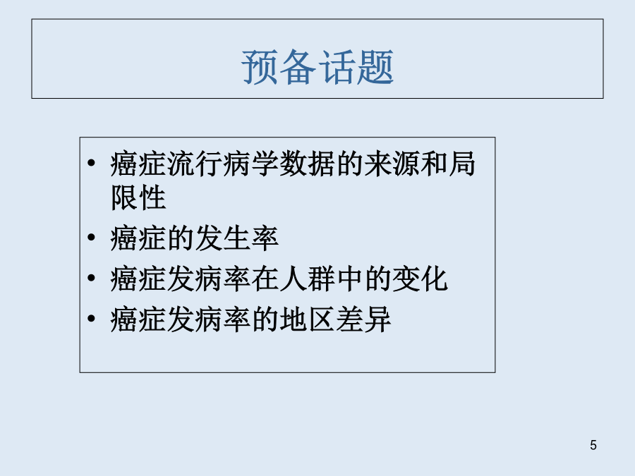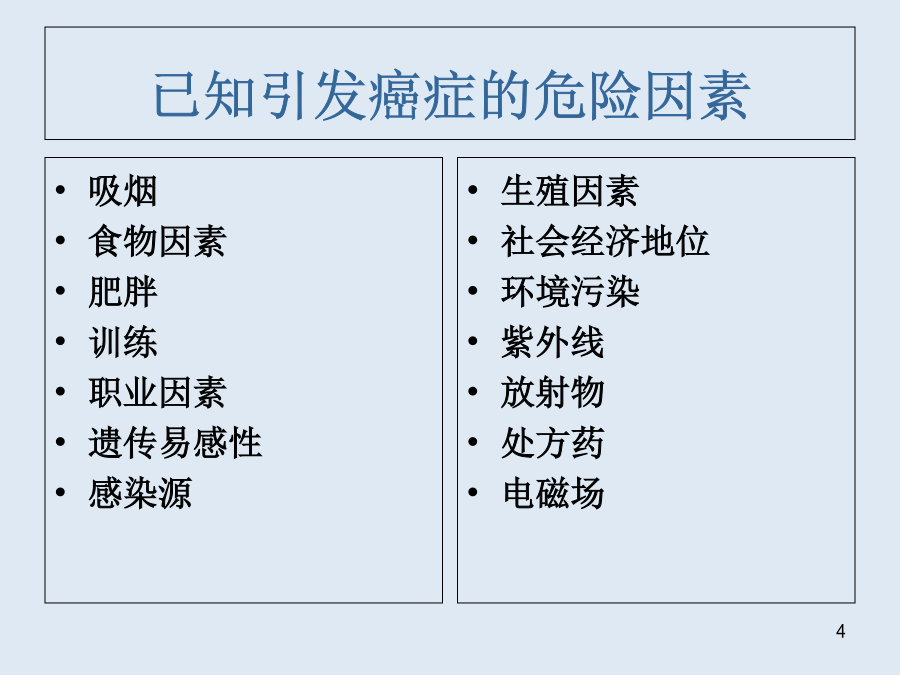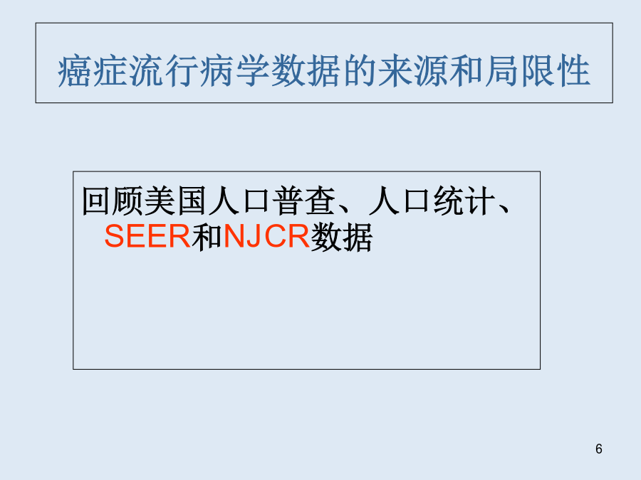 癌症的流行病学DonaSchneider理学博士,公共医学硕士,FACE美国新泽西州Rutgers大学EJBloustein规划与公共政策学院关于作者已知引发癌症的危险因素预备话题癌症流行病学数据的来源和局限性美国1860到2000年人口普查民族分类法管理和预算局(OMB)人口统计方针指示15号文件修订本,联邦统计和管理报告的民族和种族标准OMB的民族分类OMB的民族分类(续)人口普查数据美国人口普查局http://www.census.gov生命统计CDCWONDER国家疾病控制中心流行病研究在线数据库死亡数据登记处数据的局限性癌症的发生率?估测流行病学结果的方法定义发生率(Incidence)发生率(Incidence)=新病例数/该时期内危险人口流行率(prevalence)流行率(prevalence)=存在的病例数/总的危险人口流行率=发生率×时间发生率和流行率举例2000年美国男女性各种癌症发生的比例癌症发生率在人群中的变化结果估测发病人数没发病人数危险因素(研究对象)(对照)发生率I暴露(E)IE=A/(A+B)没暴露(N)IN=C/(C+D)相对危险度RR=IE/IN归因危险度AR=IE-IN发病人数没发病人数危险因素总数发生率I吸烟37070/370=189每千人不吸烟73030/730=41每千人1001,0001,100相对危险度RR=IE/IN=189/41=4.61归因危险度AR=IE-IN=189-41=148每千人相对危险度RR=IE/IN=189/41=4.61归因危险度AR=IE-IN=189-41=148每千人相对危险度(RR)的意义年死亡率/每100,000人RR127.2/12.8=9.91000/500=2AR127.2-12.8=114.4每十万人1000-500=500每十万人总结