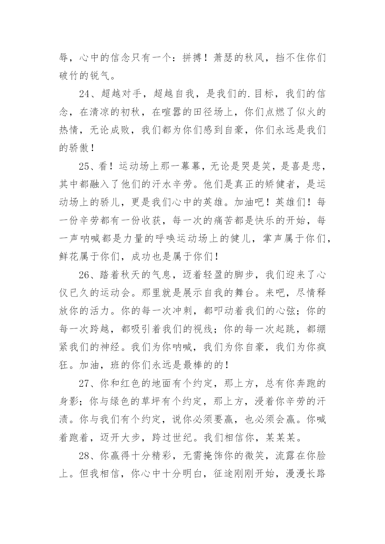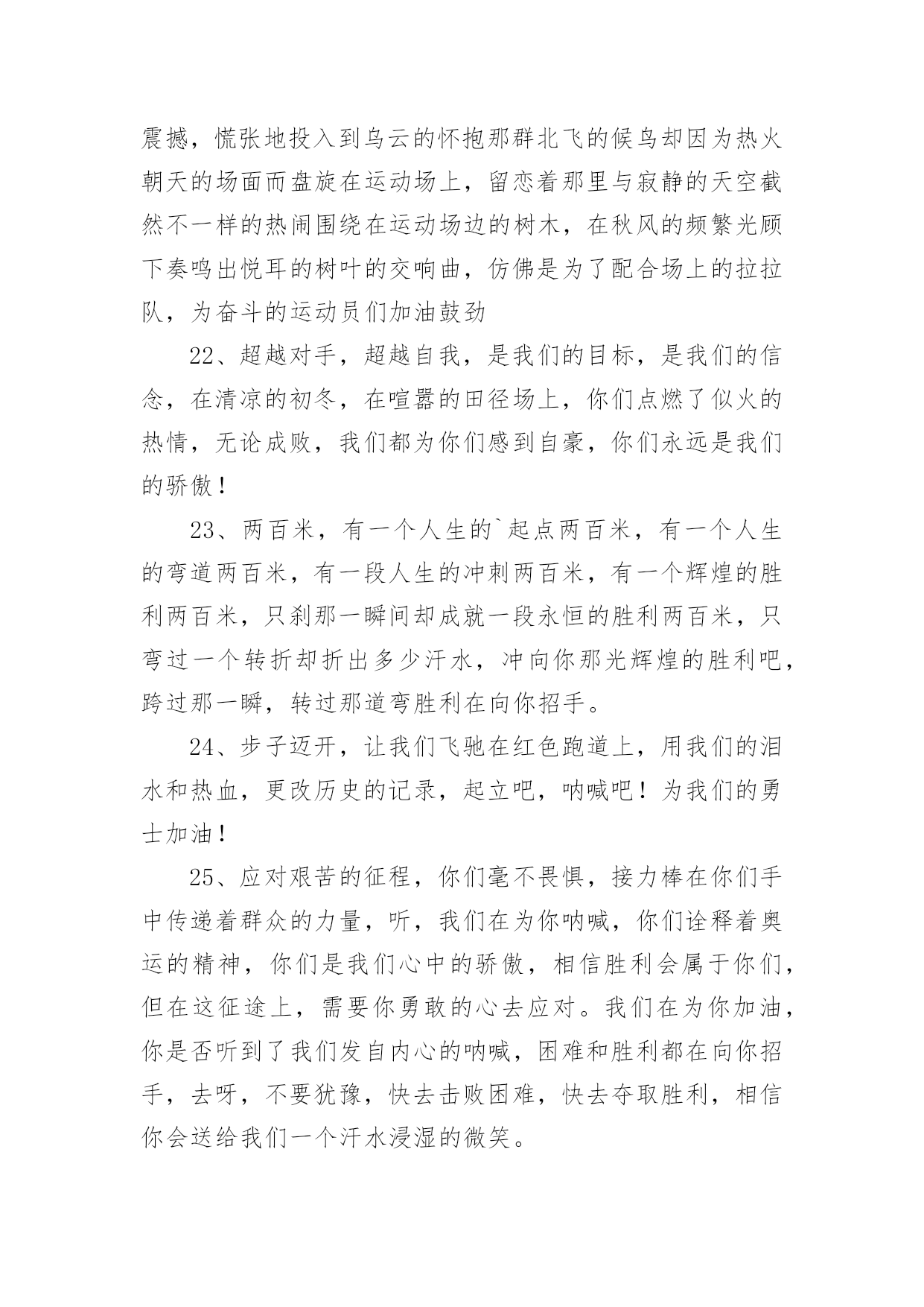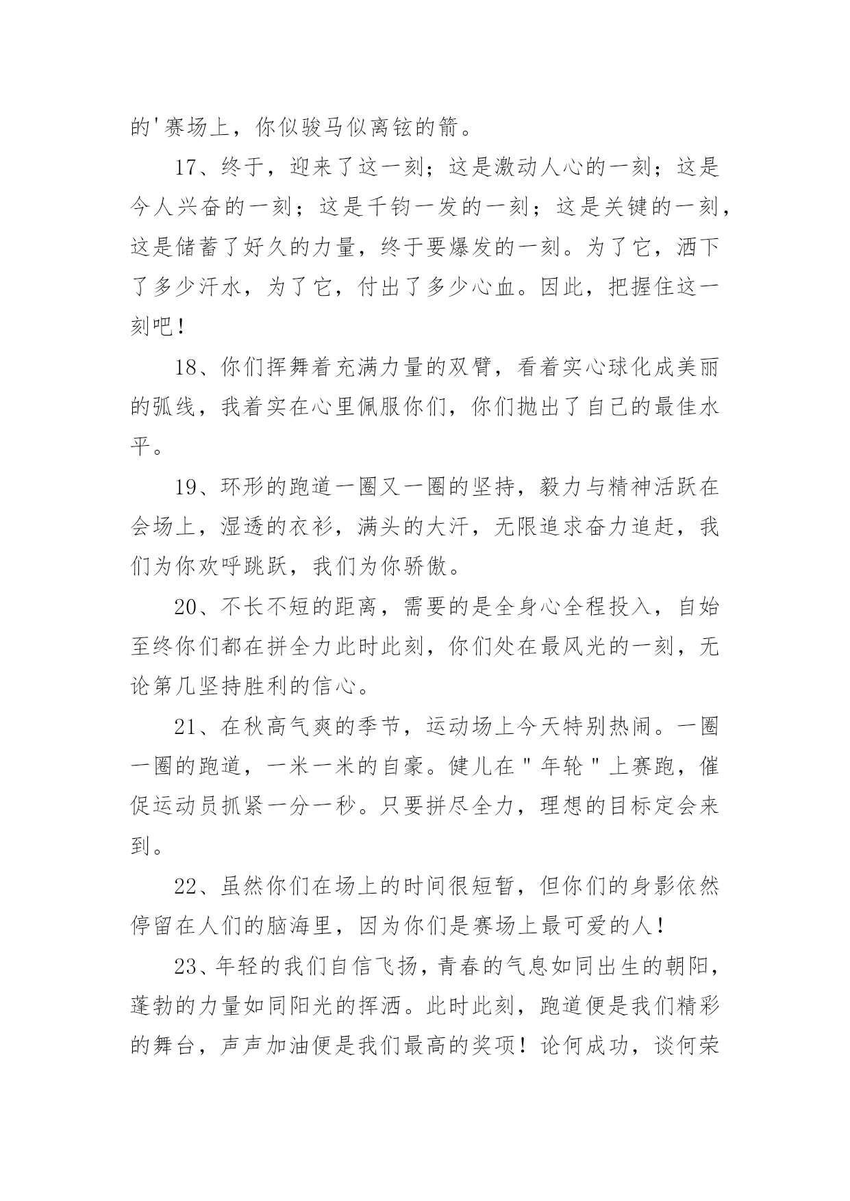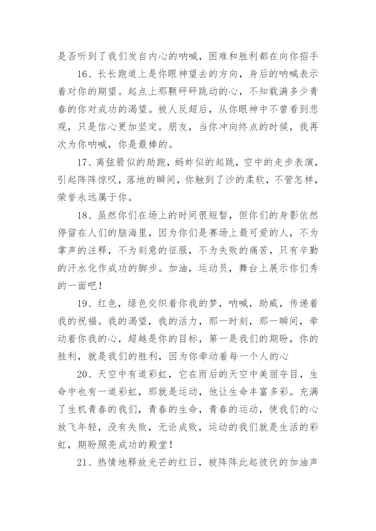 运动会加油稿运动会加油稿在社会发展不断提速的今天,我们都可能会用到加油稿,借助加油稿可以点燃对方的激情,激发对方的斗志。那么加油稿一般是怎么写的呢?下面是小编帮大家整理的运动会加油稿,欢迎大家分享。运动会加油稿11、美丽的花环是用荆棘编成的。不畏艰难,坚持不懈,斗志激昂群策群力,“友谊第一,比赛第二”用心拼搏,赛出成绩,赛出风格,蓬勃向上的精神面貌迎接崭新的未来吧!挑战运动极限,演绎健美人学!互相学习,取长补短,再接再厉,勇攀高峰!2、你们挥舞着充满力量的双臂,看着实心球化成美丽的弧线,我着实在心里佩服你们,你们抛出了自己的水平。3、步子迈开,让我们飞驰在红色跑道上,用我们的泪水和热血,更改历史的记录,起立吧,歌唱吧!为我们的勇士加油!4、场上英姿显自豪,脚下步伐在飞奔。你们是骄傲,你们是自豪,跑道因你幻彩,应对红色跑道,你们挥洒自如,不惧一切冲向终点!5、不为鲜花的围绕,不为刹那的荣耀,只有执着的信念,化作不停的奔跑,心中燃烧着梦想,脚下不停的步伐,你用行动述说着过程的重要,没有无尽的终点,没有无法攀登的险峰,希望载着终点在向你微笑,拼搏吧!经历是一种精彩,迸发你全部的能量,成功是你汗水的写照。6、时间在流逝,赛道在延伸,成功在你面前展现心脏的跳动,热血在沸腾,辉煌在你脚下铸就加油吧,健儿们,这是意志的拼搏。这是速度的挑战。胜利在向你们招手胜利在向你们呼唤。7、汗水,泪水;笑声,歌声;我们尽情挥洒。开幕式上,运动场上,我们尽情展现,多少艰辛,多少困苦,我们勇敢承担。因为年轻,因为张扬,因为我们知道:用今日的汗水换来明天的微笑。8、秋风习习,天气淡淡的转凉。然而这人的秋在今日更加迷人,不是因为它的秋高气爽,也不是因为它的明媚阳光,是因为今日的人儿倍加精神气爽。看!运动场上那一幕幕,一股股,无论是哭是笑,是喜是悲,其中都融入了他们的汗水辛劳。他们是真正的矫健者,是运动场上的骄儿,更是我们心中的英雄。加油吧!英雄们!9、惊天枪后疾如飞,勇往直前不后退。风驰电掣似闪电,勇士出发何言诲。加油!加油!!加油!!!10、一声枪响伴着飒爽的秋风,你们亮出自己的风采,在这短短的米中,你们与时间争分夺秒,只为了那最后的冲刺。不管结果如何,你们都是胜利者。因为,你们曾与时间竞赛。11、磨炼的是非凡的毅力,较量的是超常的体力,拼搏的是出类拔萃的耐力把长长的跑道跑成一段漫漫的征途,听!呼啸的风在为你喝彩,看!猎猎的彩旗在为你加油,加油吧!为了到达终点时那一刻的辉煌!米的跑道上,你正在飞驰,应对如此遥远的路途,你也许腿脚发麻,你也许有些茫然。但你可知道,在你身后,有同学们一双双期待的眼睛;在你身后,是你日日苦练的汗水。鼓起勇气,奋勇向前吧!为了群众的荣誉,为了同学们的殷切希望!12、“路上再多崎岖,我们有壮志雄心,就算跌倒也不放弃”GOGOGO拿出你们炽热的心,赛出崭新的自己,赢得最后的胜利瞧,胜利的光环离你们越来越近,相信自己,坚持就是胜利我们永远支持你们——运动员们13、场上英姿显自豪,脚下步伐在飞奔。你们是骄傲。你们是自豪,跑道因你幻彩,应对红色跑道,你们挥洒自如,不惧一切冲向终点。14、年轻的我们自信飞扬,青春的气息如同出生的朝阳,蓬勃的力量如同阳光的挥洒。此时此刻,跑道便是我们精彩的舞台,声声加油便是我们的奖项!论何成功,谈何荣辱,心中的信念只有一个:拼搏!萧瑟的秋风,挡不住你们破竹的锐气,广阔的绿茵场,是为你们搭建的舞台。张扬吧,年轻的心,我们将为你永远喝彩!15、应对艰苦的征程,你们毫不畏惧。听,我们在为你呐喊,你们诠释着奥运的精神,你们是我们心中的骄傲,深深的呼吸,等待你的是艰难的米。相信胜利会属于你们,但在这征途上,需要你勇敢的心去应对。我们在为你加油,你是否听到了我们发自内心的呐喊,困难和胜利都在向你招手16、长长跑道上是你眼神望去的方向,身后的呐喊表示着对你的期望。起点上那颗砰砰跳动的心,不知载满多少青春的你对成功的渴望。被人反超后,从你眼神中不曾看到悲观,只是信心更加坚定。朋友,当你冲向终点的时候,我再次为你呐喊,你是最棒的。17、离弦箭似的助跑,蚂蚱似的起跳,空中的走步表演,引起阵阵惊叹,落地的瞬间,你触到了沙的柔软,不管怎样,荣誉永远属于你。18、虽然你们在场上的时间很短暂,但你们的身影依然停留在人们的脑海里,因为你们是赛场上最可爱的人,不为掌声的注释,不为刻意的征服,不为失败的痛苦,只有辛勤的汗水化作成功的脚步。加油,运动员,舞台上展示你们秀的一面吧!19、红色,绿色交织着你我的梦,呐喊,助威,传递着我的祝福。我的渴望,我的活力,那一时刻,那一瞬间,牵动着你我的心,超越是你的目标,第一是我们的期盼,你的胜利,就是我们的胜利,因为你牵动着每一个人的心20、天空中有道彩虹,它在雨后的天空中美丽夺目,生命中也有一道彩虹,那就