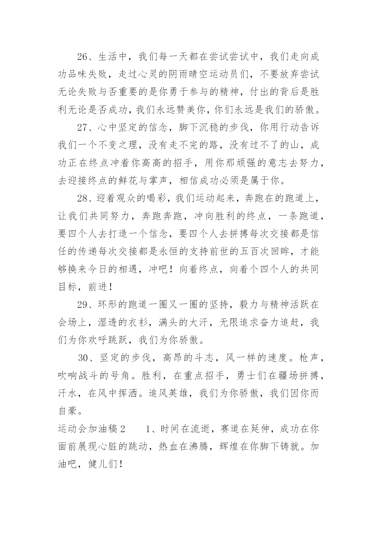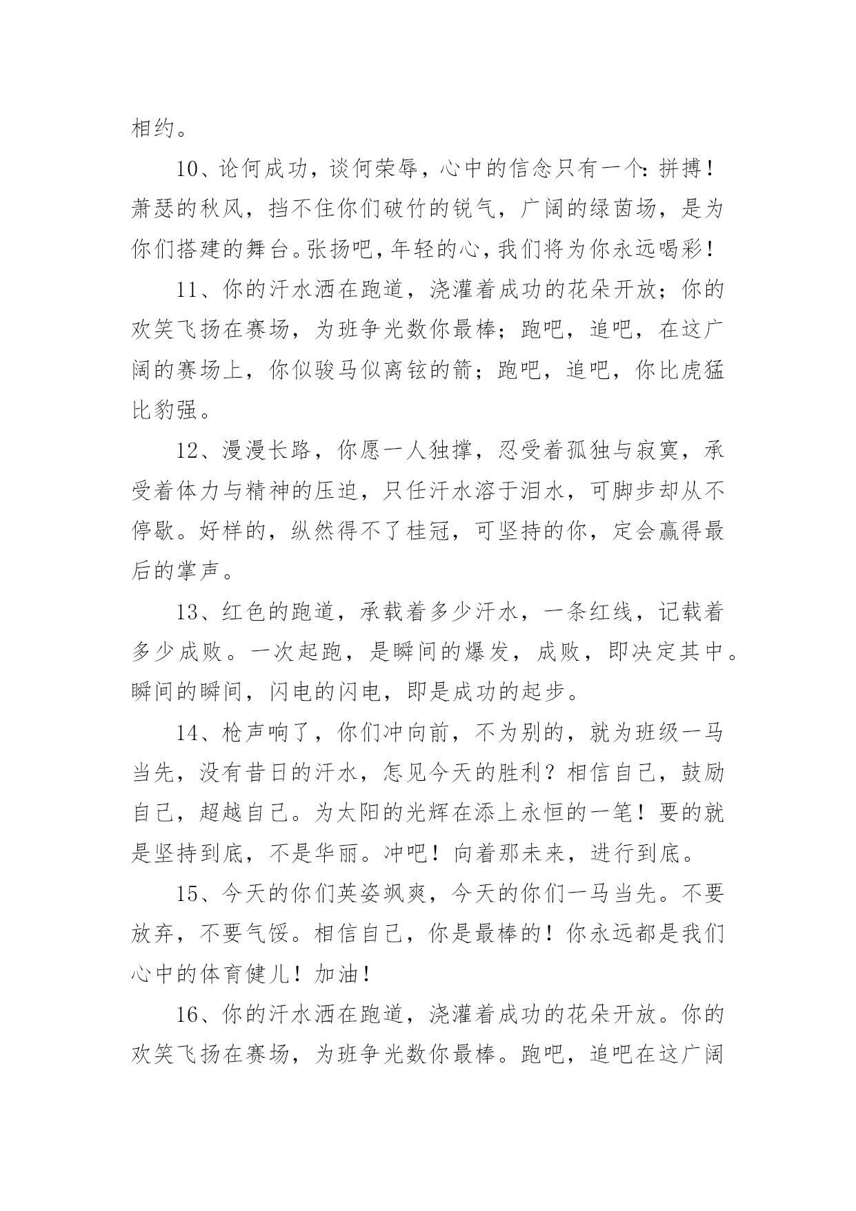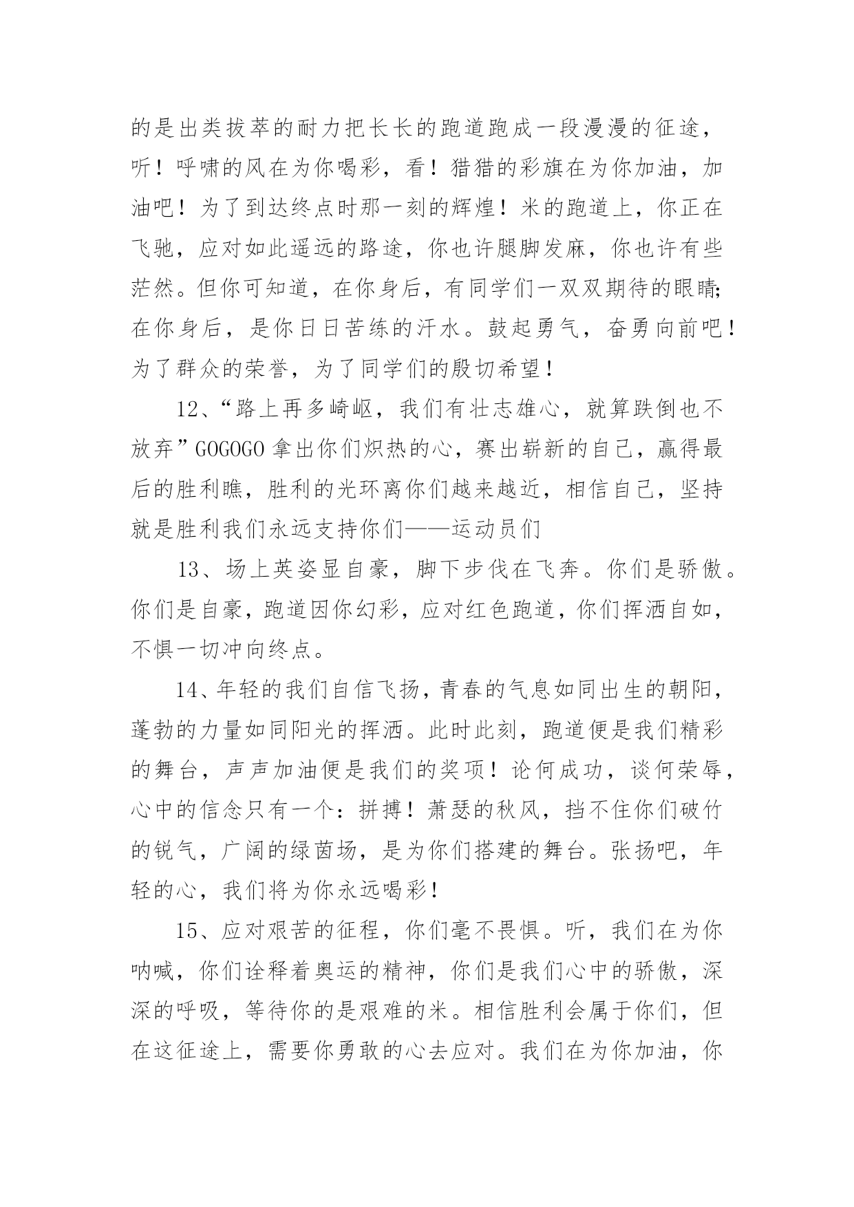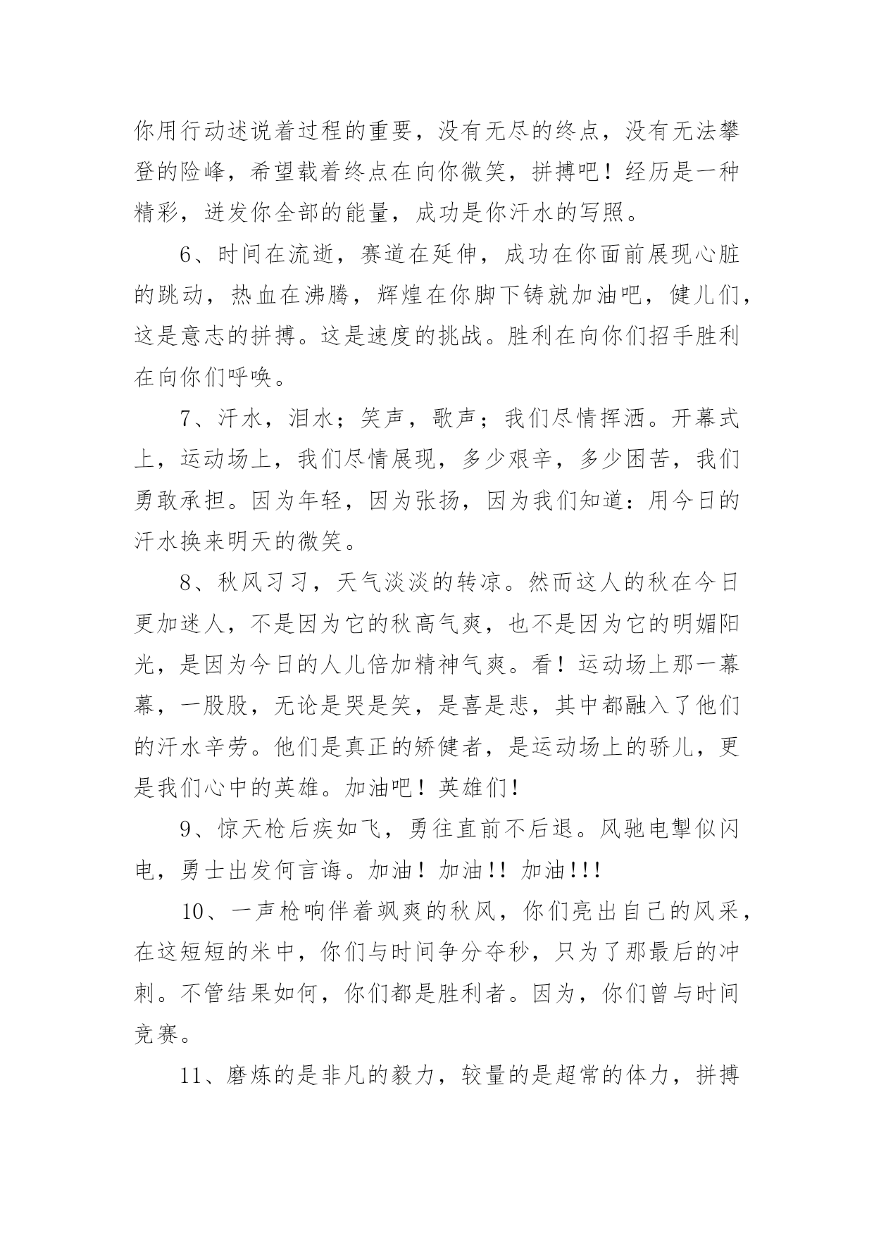 运动会加油稿运动会加油稿在社会发展不断提速的今天,我们都可能会用到加油稿,借助加油稿可以点燃对方的激情,激发对方的斗志。那么加油稿一般是怎么写的呢?下面是小编帮大家整理的运动会加油稿,欢迎大家分享。运动会加油稿11、美丽的花环是用荆棘编成的。不畏艰难,坚持不懈,斗志激昂群策群力,“友谊第一,比赛第二”用心拼搏,赛出成绩,赛出风格,蓬勃向上的精神面貌迎接崭新的未来吧!挑战运动极限,演绎健美人学!互相学习,取长补短,再接再厉,勇攀高峰!2、你们挥舞着充满力量的双臂,看着实心球化成美丽的弧线,我着实在心里佩服你们,你们抛出了自己的水平。3、步子迈开,让我们飞驰在红色跑道上,用我们的泪水和热血,更改历史的记录,起立吧,歌唱吧!为我们的勇士加油!4、场上英姿显自豪,脚下步伐在飞奔。你们是骄傲,你们是自豪,跑道因你幻彩,应对红色跑道,你们挥洒自如,不惧一切冲向终点!5、不为鲜花的围绕,不为刹那的荣耀,只有执着的信念,化作不停的奔跑,心中燃烧着梦想,脚下不停的步伐,你用行动述说着过程的重要,没有无尽的终点,没有无法攀登的险峰,希望载着终点在向你微笑,拼搏吧!经历是一种精彩,迸发你全部的能量,成功是你汗水的写照。6、时间在流逝,赛道在延伸,成功在你面前展现心脏的跳动,热血在沸腾,辉煌在你脚下铸就加油吧,健儿们,这是意志的拼搏。这是速度的挑战。胜利在向你们招手胜利在向你们呼唤。7、汗水,泪水;笑声,歌声;我们尽情挥洒。开幕式上,运动场上,我们尽情展现,多少艰辛,多少困苦,我们勇敢承担。因为年轻,因为张扬,因为我们知道:用今日的汗水换来明天的微笑。8、秋风习习,天气淡淡的转凉。然而这人的秋在今日更加迷人,不是因为它的秋高气爽,也不是因为它的明媚阳光,是因为今日的人儿倍加精神气爽。看!运动场上那一幕幕,一股股,无论是哭是笑,是喜是悲,其中都融入了他们的汗水辛劳。他们是真正的矫健者,是运动场上的骄儿,更是我们心中的英雄。加油吧!英雄们!9、惊天枪后疾如飞,勇往直前不后退。风驰电掣似闪电,勇士出发何言诲。加油!加油!!加油!!!10、一声枪响伴着飒爽的秋风,你们亮出自己的风采,在这短短的米中,你们与时间争分夺秒,只为了那最后的冲刺。不管结果如何,你们都是胜利者。因为,你们曾与时间竞赛。11、磨炼的是非凡的毅力,较量的是超常的体力,拼搏的是出类拔萃的耐力把长长的跑道跑成一段漫漫的征途,听!呼啸的风在为你喝彩,看!猎猎的彩旗在为你加油,加油吧!为了到达终点时那一刻的辉煌!米的跑道上,你正在飞驰,应对如此遥远的路途,你也许腿脚发麻,你也许有些茫然。但你可知道,在你身后,有同学们一双双期待的眼睛;在你身后,是你日日苦练的汗水。鼓起勇气,奋勇向前吧!为了群众的荣誉,为了同学们的殷切希望!12、“路上再多崎岖,我们有壮志雄心,就算跌倒也不放弃”GOGOGO拿出你们炽热的心,赛出崭新的自己,赢得最后的胜利瞧,胜利的光环离你们越来越近,相信自己,坚持就是胜利我们永远支持你们——运动员们13、场上英姿显自豪,脚下步伐在飞奔。你们是骄傲。你们是自豪,跑道因你幻彩,应对红色跑道,你们挥洒自如,不惧一切冲向终点。14、年轻的我们自信飞扬,青春的气息如同出生的朝阳,蓬勃的力量如同阳光的挥洒。此时此刻,跑道便是我们精彩的舞台,声声加油便是我们的奖项!论何成功,谈何荣辱,心中的信念只有一个:拼搏!萧瑟的秋风,挡不住你们破竹的锐气,广阔的绿茵场,是为你们搭建的舞台。张扬吧,年轻的心,我们将为你永远喝彩!15、应对艰苦的征程,你们毫不畏惧。听,我们在为你呐喊,你们诠释着奥运的精神,你们是我们心中的骄傲,深深的呼吸,等待你的是艰难的米。相信胜利会属于你们,但在这征途上,需要你勇敢的心去应对。我们在为你加油,你是否听到了我们发自内心的呐喊,困难和胜利都在向你招手16、长长跑道上是你眼神望去的方向,身后的呐喊表示着对你的期望。起点上那颗砰砰跳动的心,不知载满多少青春的你对成功的渴望。被人反超后,从你眼神中不曾看到悲观,只是信心更加坚定。朋友,当你冲向终点的时候,我再次为你呐喊,你是最棒的。17、离弦箭似的助跑,蚂蚱似的起跳,空中的走步表演,引起阵阵惊叹,落地的瞬间,你触到了沙的柔软,不管怎样,荣誉永远属于你。18、虽然你们在场上的时间很短暂,但你们的身影依然停留在人们的脑海里,因为你们是赛场上最可爱的人,不为掌声的注释,不为刻意的征服,不为失败的痛苦,只有辛勤的汗水化作成功的脚步。加油,运动员,舞台上展示你们秀的一面吧!19、红色,绿色交织着你我的梦,呐喊,助威,传递着我的祝福。我的渴望,我的活力,那一时刻,那一瞬间,牵动着你我的心,超越是你的目标,第一是我们的期盼,你的胜利,就是我们的胜利,因为你牵动着每一个人的心20、天空中有道彩虹,它在雨后的天空中美丽夺目,生命中也有一道彩虹,那就