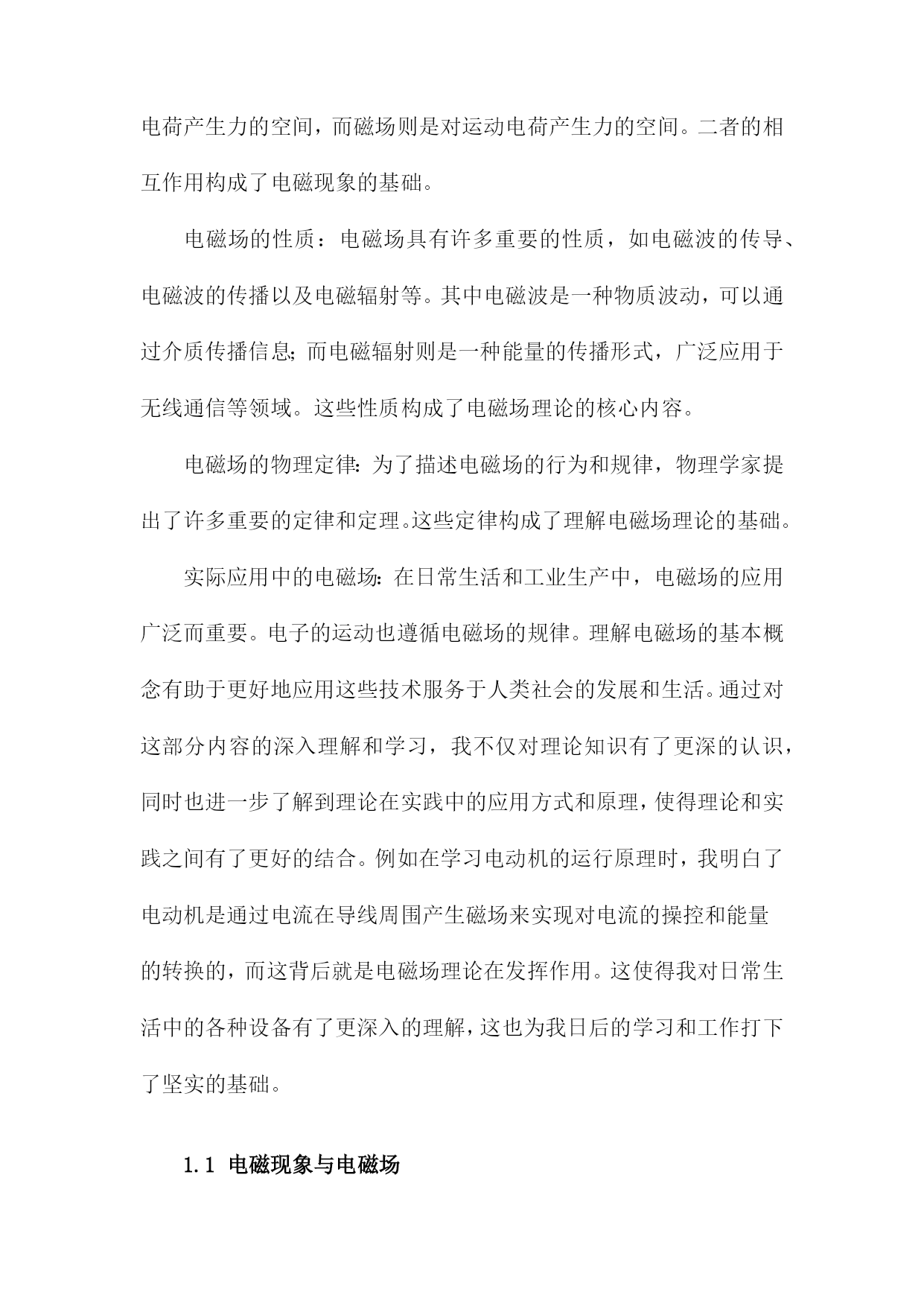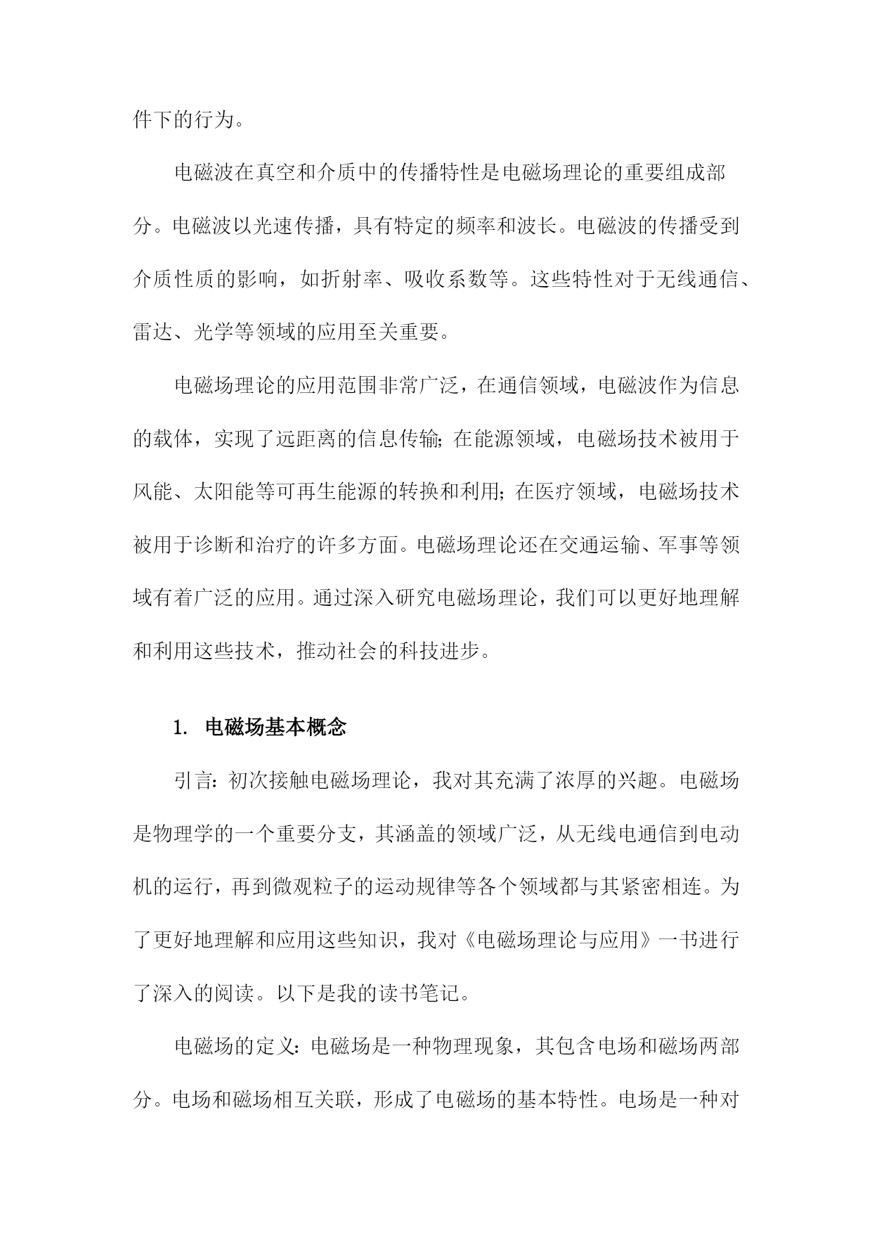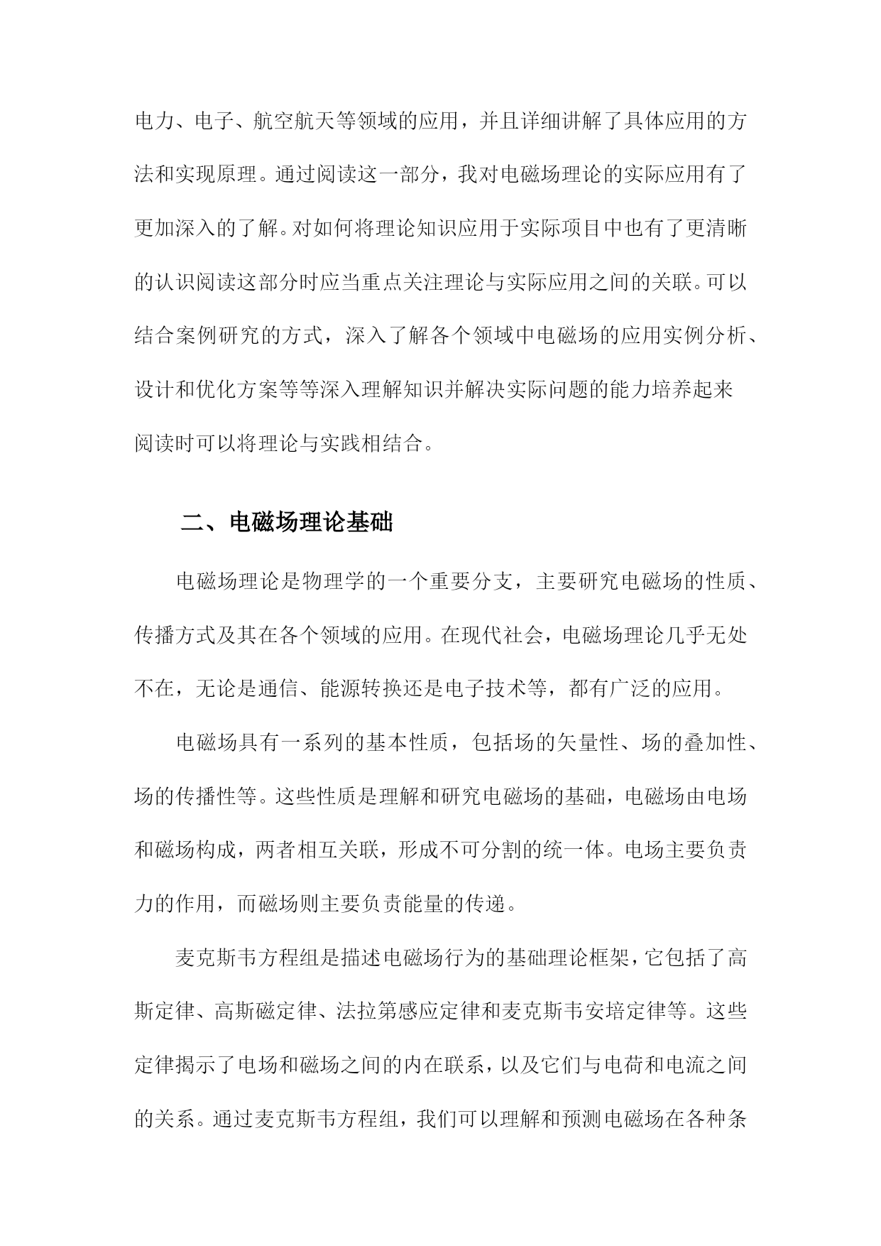 《电磁场理论与应用》读书笔记一、内容概览本书介绍了电磁场理论的基本概念、基本原理和基本方法。包括电场和磁场的基本性质、电磁场的矢量性质、麦克斯韦方程等核心内容。这些基础知识是理解电磁场理论的基础,也是后续章节内容的基础。阅读这一部分,使我对电磁场理论有了更加系统的认识,更加清晰地理解了电磁场的基本概念和方法。阅读这一部分内容的时候要注意基本概念的理解,注重原理的理解而不是简单地记忆公式。学习过程中多举例子以及使用所学知识去解题会非常有帮助,因为只有充分理解了原理才能灵活应用知识去解决问题。对于原理的理解和掌握,这是理解后续复杂应用的基础。另外也可以结合实际生活和工程应用来理解概念和方法,如用电磁场理论解释日常生活中的电磁现象等实际应用场景加深理解。有助于激发学习兴趣和理解难度降低,阅读时需要注意公式推导过程是否清晰明了,确保自己能够完全理解并掌握相关公式。同时也要注意书中对于电磁场理论的实验验证部分的内容阅读过程中要注意理论与实验的结合,更好地理解理论的正确性。在阅读过程中还可以适当做笔记,以便回顾和复习巩固所学知识。本书介绍了电磁场理论在各个领域的应用,包括电磁场在通信、电力、电子、航空航天等领域的应用,并且详细讲解了具体应用的方法和实现原理。通过阅读这一部分,我对电磁场理论的实际应用有了更加深入的了解。对如何将理论知识应用于实际项目中也有了更清晰的认识阅读这部分时应当重点关注理论与实际应用之间的关联。可以结合案例研究的方式,深入了解各个领域中电磁场的应用实例分析、设计和优化方案等等深入理解知识并解决实际问题的能力培养起来阅读时可以将理论与实践相结合。二、电磁场理论基础电磁场理论是物理学的一个重要分支,主要研究电磁场的性质、传播方式及其在各个领域的应用。在现代社会,电磁场理论几乎无处不在,无论是通信、能源转换还是电子技术等,都有广泛的应用。电磁场具有一系列的基本性质,包括场的矢量性、场的叠加性、场的传播性等。这些性质是理解和研究电磁场的基础,电磁场由电场和磁场构成,两者相互关联,形成不可分割的统一体。电场主要负责力的作用,而磁场则主要负责能量的传递。麦克斯韦方程组是描述电磁场行为的基础理论框架,它包括了高斯定律、高斯磁定律、法拉第感应定律和麦克斯韦安培定律等。这些定律揭示了电场和磁场之间的内在联系,以及它们与电荷和电流之间的关系。通过麦克斯韦方程组,我们可以理解和预测电磁场在各种条件下的行为。电磁波在真空和介质中的传播特性是电磁场理论的重要组成部分。电磁波以光速传播,具有特定的频率和波长。电磁波的传播受到介质性质的影响,如折射率、吸收系数等。这些特性对于无线通信、雷达、光学等领域的应用至关重要。电磁场理论的应用范围非常广泛,在通信领域,电磁波作为信息的载体,实现了远距离的信息传输;在能源领域,电磁场技术被用于风能、太阳能等可再生能源的转换和利用;在医疗领域,电磁场技术被用于诊断和治疗的许多方面。电磁场理论还在交通运输、军事等领域有着广泛的应用。通过深入研究电磁场理论,我们可以更好地理解和利用这些技术,推动社会的科技进步。1.电磁场基本概念引言:初次接触电磁场理论,我对其充满了浓厚的兴趣。电磁场是物理学的一个重要分支,其涵盖的领域广泛,从无线电通信到电动机的运行,再到微观粒子的运动规律等各个领域都与其紧密相连。为了更好地理解和应用这些知识,我对《电磁场理论与应用》一书进行了深入的阅读。以下是我的读书笔记。电磁场的定义:电磁场是一种物理现象,其包含电场和磁场两部分。电场和磁场相互关联,形成了电磁场的基本特性。电场是一种对电荷产生力的空间,而磁场则是对运动电荷产生力的空间。二者的相互作用构成了电磁现象的基础。电磁场的性质:电磁场具有许多重要的性质,如电磁波的传导、电磁波的传播以及电磁辐射等。其中电磁波是一种物质波动,可以通过介质传播信息;而电磁辐射则是一种能量的传播形式,广泛应用于无线通信等领域。这些性质构成了电磁场理论的核心内容。电磁场的物理定律:为了描述电磁场的行为和规律,物理学家提出了许多重要的定律和定理。这些定律构成了理解电磁场理论的基础。实际应用中的电磁场:在日常生活和工业生产中,电磁场的应用广泛而重要。电子的运动也遵循电磁场的规律。理解电磁场的基本概念有助于更好地应用这些技术服务于人类社会的发展和生活。通过对这部分内容的深入理解和学习,我不仅对理论知识有了更深的认识,同时也进一步了解到理论在实践中的应用方式和原理,使得理论和实践之间有了更好的结合。例如在学习电动机的运行原理时,我明白了电动机是通过电流在导线周围产生磁场来实现对电流的操控和能量的转换的,而这背后就是电磁场理论在发挥作用。这使得我对日常生活中的各种设备有了更深入的理解,这也为我日后的学习和工作打下了坚实的基础。1.1电磁现象