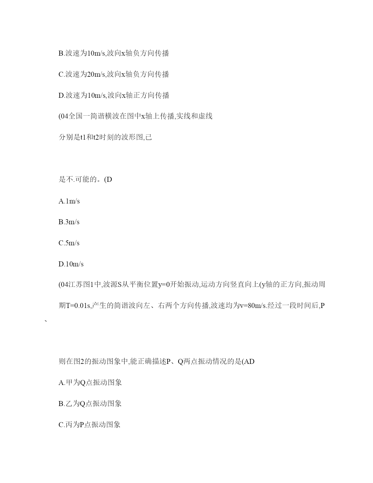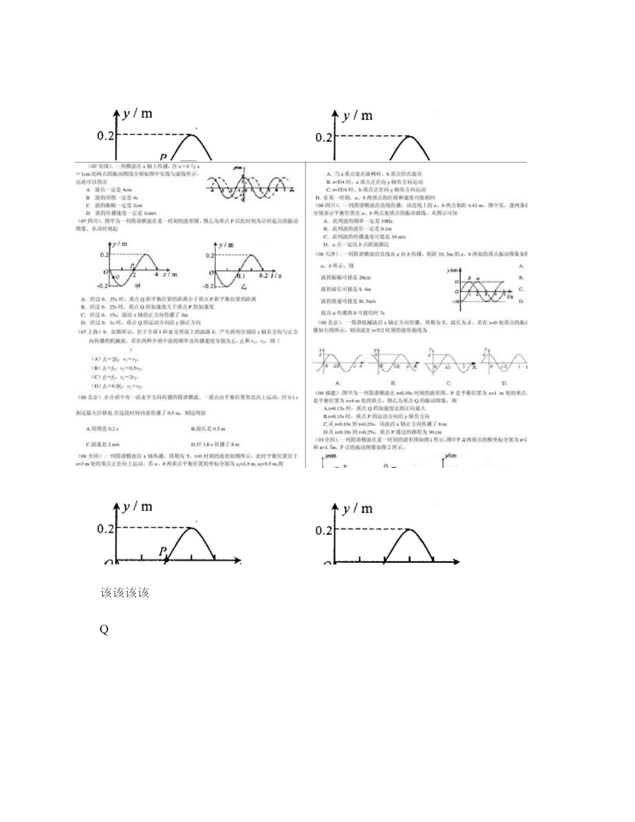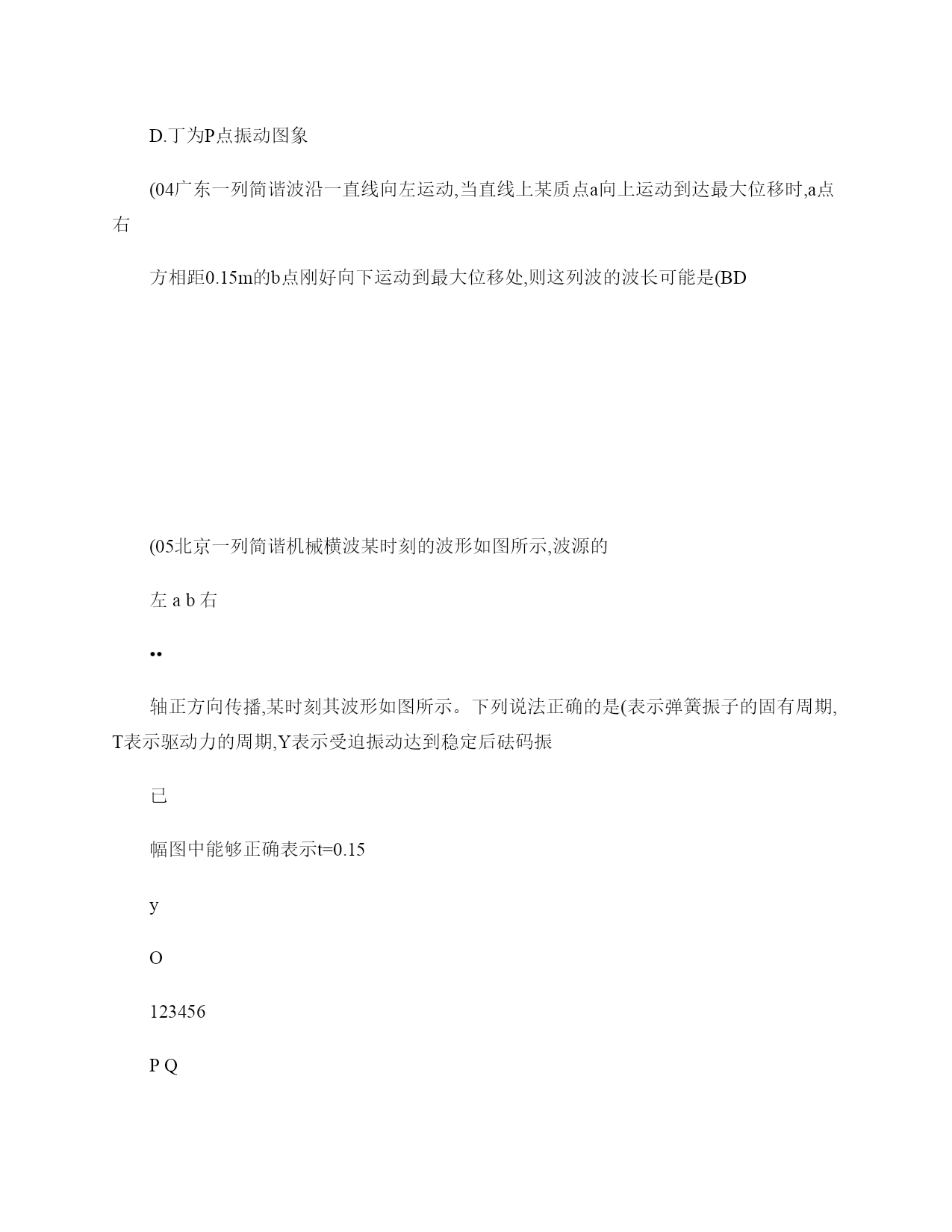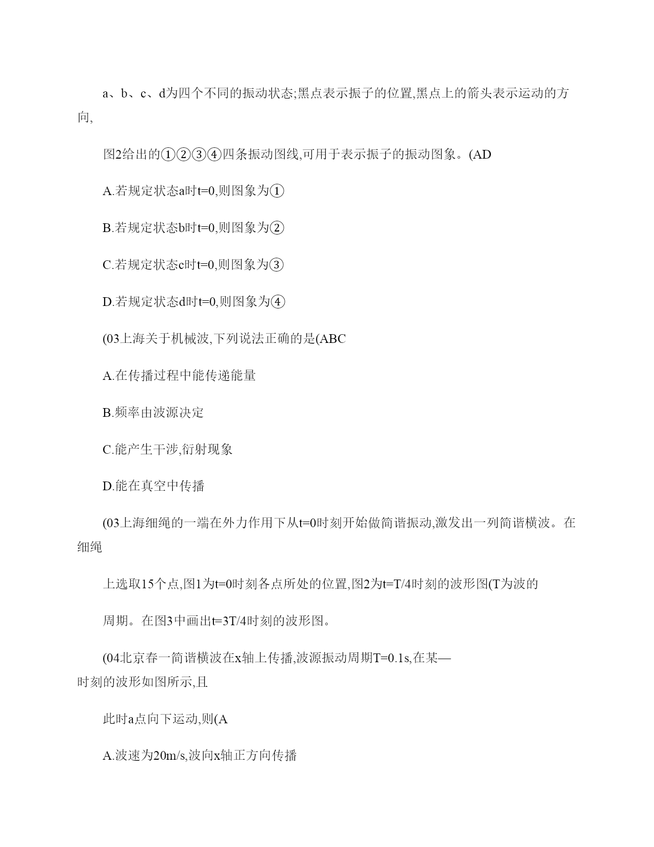 历年机械振动机械波的高考题答案(完整版)实用资料(可以直接使用,可编辑完整版实用资料,欢迎下载)全国一列横波在t=0时刻的波形如图中实线所示,由此可以判定此波的,振幅为质点的位移为yy=y=D.若<.若<.若>.若>全国简谐机械波在给定的媒质中传播时,下列说法中正确的是(D(03全国一束单色光从空气射入玻璃中,则其(CA.频率不变,波长变长C.频率变大,波长不变C.频率不变,波长变短D.频率变小,波长不变(03广东一弹簧振子沿x轴振动,振幅为4cm,振子的平衡位置位于x轴上的0点,图1中的a、b、c、d为四个不同的振动状态;黑点表示振子的位置,黑点上的箭头表示运动的方向,图2给出的①②③④四条振动图线,可用于表示振子的振动图象。(ADA.若规定状态a时t=0,则图象为①B.若规定状态b时t=0,则图象为②C.若规定状态c时t=0,则图象为③D.若规定状态d时t=0,则图象为④(03上海关于机械波,下列说法正确的是(ABCA.在传播过程中能传递能量B.频率由波源决定C.能产生干涉,衍射现象D.能在真空中传播(03上海细绳的一端在外力作用下从t=0时刻开始做简谐振动,激发出一列简谐横波。在细绳上选取15个点,图1为t=0时刻各点所处的位置,图2为t=T/4时刻的波形图(T为波的周期。在图3中画出t=3T/4时刻的波形图。(04北京春一简谐横波在x轴上传播,波源振动周期T=0.1s,在某—时刻的波形如图所示,且此时a点向下运动,则(AA.波速为20m/s,波向x轴正方向传播B.波速为10m/s,波向x轴负方向传播C.波速为20m/s,波向x轴负方向传播D.波速为10m/s,波向x轴正方向传播(04全国一简谐横波在图中x轴上传播,实线和虚线分别是t1和t2时刻的波形图,已是不.可能的。(DA.1m/sB.3m/sC.5m/sD.10m/s(04江苏图1中,波源S从平衡位置y=0开始振动,运动方向竖直向上(y轴的正方向,振动周期T=0.01s,产生的简谐波向左、右两个方向传播,波速均为v=80m/s.经过一段时间后,P、则在图2的振动图象中,能正确描述P、Q两点振动情况的是(ADA.甲为Q点振动图象B.乙为Q点振动图象C.丙为P点振动图象D.丁为P点振动图象(04广东一列简谐波沿一直线向左运动,当直线上某质点a向上运动到达最大位移时,a点右方相距0.15m的b点刚好向下运动到最大位移处,则这列波的波长可能是(BD(05北京一列简谐机械横波某时刻的波形如图所示,波源的左ab右••轴正方向传播,某时刻其波形如图所示。下列说法正确的是(表示弹簧振子的固有周期,T表示驱动力的周期,Y表示受迫振动达到稳定后砝码振已幅图中能够正确表示t=0.15yO123456PQ该该该该Q上海浦越包装机械HLSG-1000数控手持式铝箔封口机本机专为制药、化工、农药、兽药、润滑油、食品、食用油、化妆品、轻工等行业对容器进行铝箔严密封口,具有对产品防漏、防潮、防霉、防伪、防盗和提高档次的功能。窗口的材质可以是聚乙烯、聚脂、聚丙烯、聚苯乙烯、下班等材料。主要技术参数:型号电源功率生产能力封口直径瓶高冷却HLSG-1000220V50HZ600-1000W可调≤60瓶/分直径18-90mm无限制水冷以上参数仅供参考,可依据用户实际封口尺寸要求订做。地址:上海浦东新区浦建路1578弄53号(近龙阳路):021-50450433联系人:夏来康1模块二机械振动机械波【知识网络】第一节机械振动【考点透视】一、考纲指要1.弹簧振子,简谐运动,简谐运动的振幅、周期和频率,简谐运动的振动图象。(Ⅱ2.单摆,在小振幅条件下单摆作简谐运动,周期公式。(Ⅱ3.振动中的能量转化。(Ⅰ4.自由振动和受迫振动,受迫振动的振动频率,共振及其常见的应用。(Ⅰ二、命题落点1.对弹簧振子的振动过程的了解、。如例1。波的干涉机械波波的叠加波的衍射波的多普勒效应机械振动机械波机械振动简谐运动受力特点F=-Kx运动性质:变加速运动能量转化:机械能受恒典型模型弹簧振子单摆T=2Lg(与摆球质量、振幅无关共振受迫振动(无阻尼振动22.考查对弹簧振子的振动图象的应用能力。如例2。3.单摆振动过程中的能量转化。如例3。4.单摆的周期公式的理解和应用,如例4【典例精析】例1:(03江苏.一弹簧振子沿x轴振动,振幅为4cm,振子的平衡位置位于x轴上的O点,图7—1—1甲图中的a、b、c、d为四个不同的振动状态;黑点表示振子的位置,黑点上的箭头表示运动的方向,图7—1—1乙图给出的①②③④四条