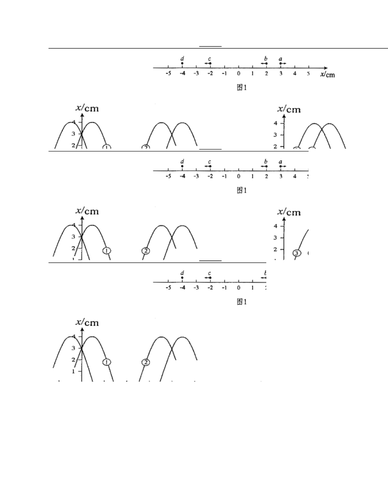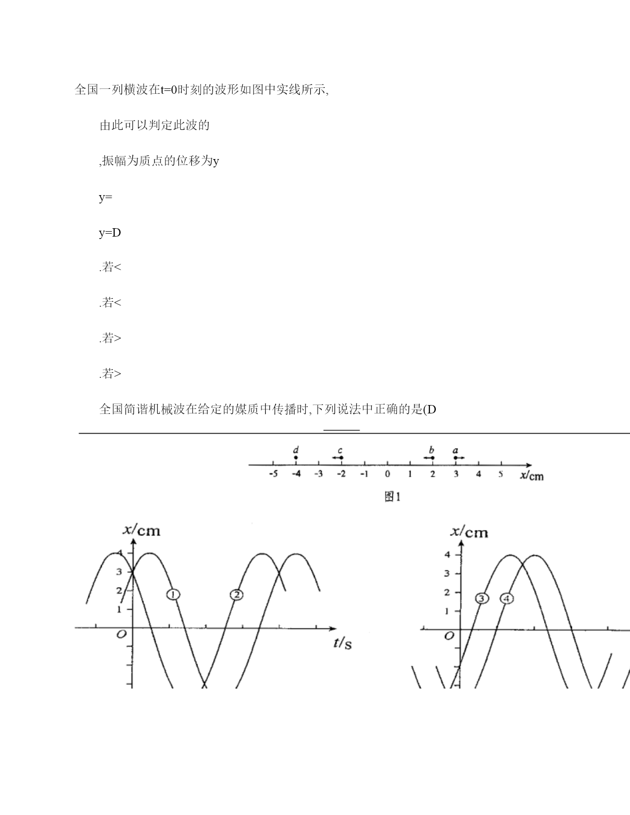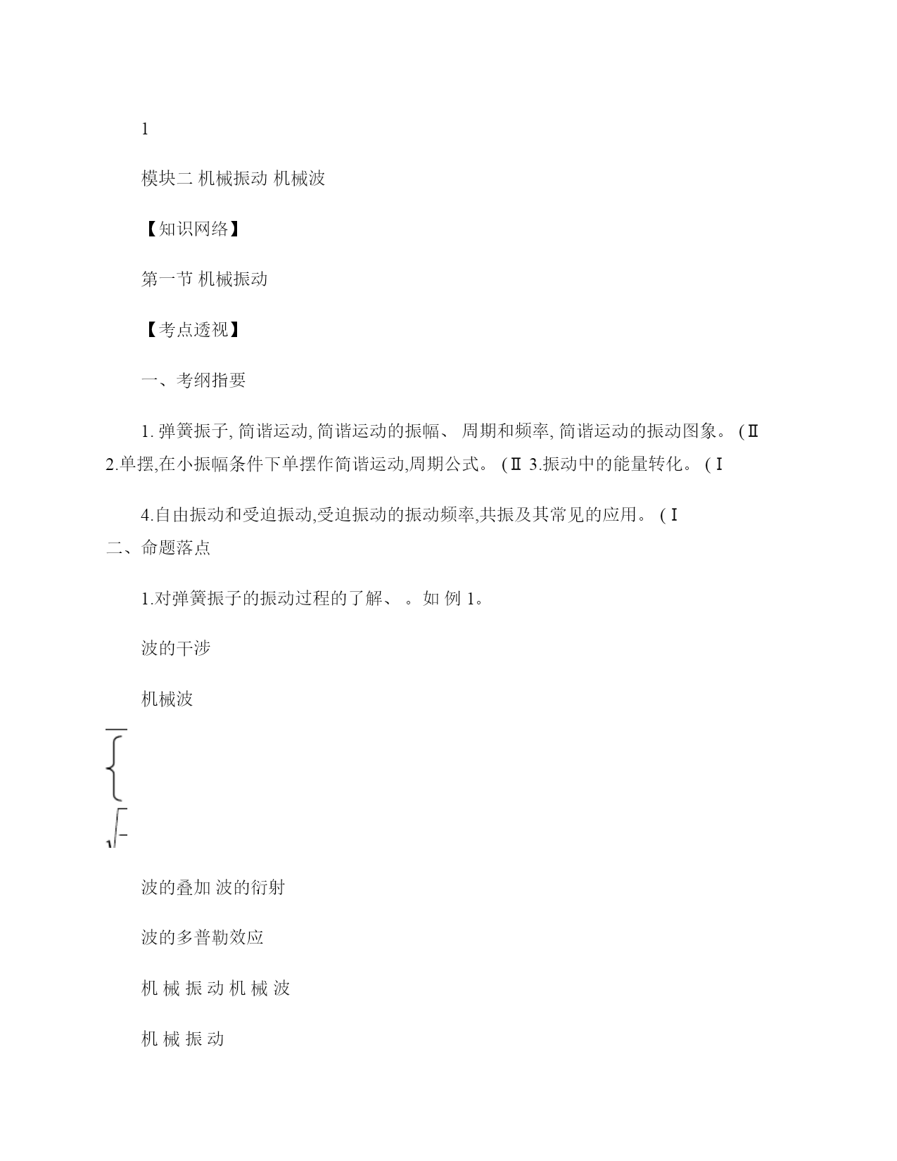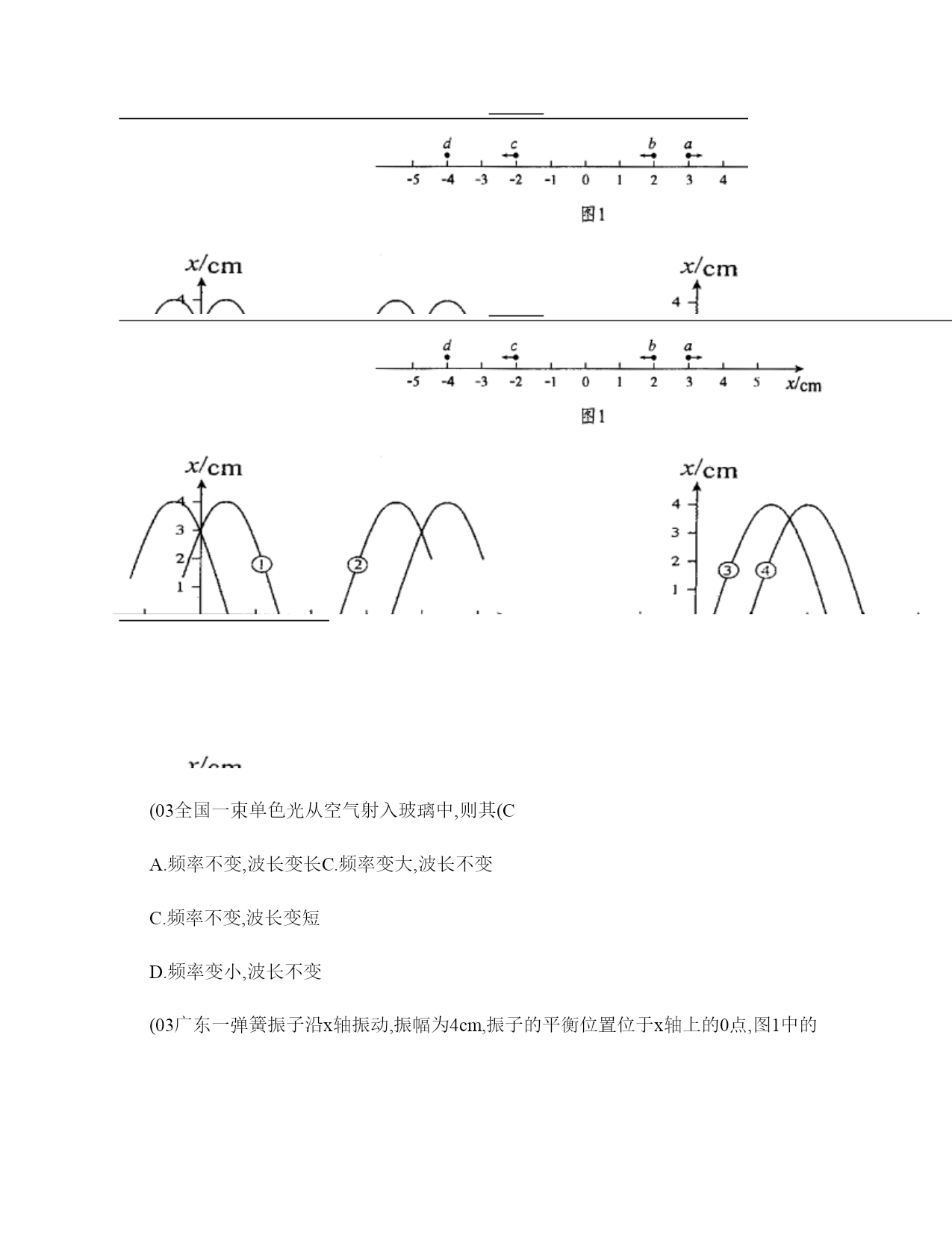 历年机械振动机械波的高考题答案(完整版)实用资料(可以直接使用,可编辑完整版实用资料,欢迎下载)全国一列横波在t=0时刻的波形如图中实线所示,由此可以判定此波的,振幅为质点的位移为yy=y=D.若<.若<.若>.若>全国简谐机械波在给定的媒质中传播时,下列说法中正确的是(D(03全国一束单色光从空气射入玻璃中,则其(CA.频率不变,波长变长C.频率变大,波长不变C.频率不变,波长变短D.频率变小,波长不变(03广东一弹簧振子沿x轴振动,振幅为4cm,振子的平衡位置位于x轴上的0点,图1中的a、b、c、d为四个不同的振动状态;黑点表示振子的位置,黑点上的箭头表示运动的方向,图2给出的①②③④四条振动图线,可用于表示振子的振动图象。(ADA.若规定状态a时t=0,则图象为①B.若规定状态b时t=0,则图象为②C.若规定状态c时t=0,则图象为③D.若规定状态d时t=0,则图象为④(03上海关于机械波,下列说法正确的是(ABCA.在传播过程中能传递能量B.频率由波源决定C.能产生干涉,衍射现象D.能在真空中传播(03上海细绳的一端在外力作用下从t=0时刻开始做简谐振动,激发出一列简谐横波。在细绳上选取15个点,图1为t=0时刻各点所处的位置,图2为t=T/4时刻的波形图(T为波的周期。在图3中画出t=3T/4时刻的波形图。(04北京春一简谐横波在x轴上传播,波源振动周期T=0.1s,在某—时刻的波形如图所示,且此时a点向下运动,则(AA.波速为20m/s,波向x轴正方向传播B.波速为10m/s,波向x轴负方向传播C.波速为20m/s,波向x轴负方向传播D.波速为10m/s,波向x轴正方向传播(04全国一简谐横波在图中x轴上传播,实线和虚线分别是t1和t2时刻的波形图,已是不.可能的。(DA.1m/sB.3m/sC.5m/sD.10m/s(04江苏图1中,波源S从平衡位置y=0开始振动,运动方向竖直向上(y轴的正方向,振动周期T=0.01s,产生的简谐波向左、右两个方向传播,波速均为v=80m/s.经过一段时间后,P、则在图2的振动图象中,能正确描述P、Q两点振动情况的是(ADA.甲为Q点振动图象B.乙为Q点振动图象C.丙为P点振动图象D.丁为P点振动图象(04广东一列简谐波沿一直线向左运动,当直线上某质点a向上运动到达最大位移时,a点右方相距0.15m的b点刚好向下运动到最大位移处,则这列波的波长可能是(BD(05北京一列简谐机械横波某时刻的波形如图所示,波源的左ab右••轴正方向传播,某时刻其波形如图所示。下列说法正确的是(表示弹簧振子的固有周期,T表示驱动力的周期,Y表示受迫振动达到稳定后砝码振已幅图中能够正确表示t=0.15yO123456PQ该该该该Q上海浦越包装机械HLSG-1000数控手持式铝箔封口机本机专为制药、化工、农药、兽药、润滑油、食品、食用油、化妆品、轻工等行业对容器进行铝箔严密封口,具有对产品防漏、防潮、防霉、防伪、防盗和提高档次的功能。窗口的材质可以是聚乙烯、聚脂、聚丙烯、聚苯乙烯、下班等材料。主要技术参数:型号电源功率生产能力封口直径瓶高冷却HLSG-1000220V50HZ600-1000W可调≤60瓶/分直径18-90mm无限制水冷以上参数仅供参考,可依据用户实际封口尺寸要求订做。地址:上海浦东新区浦建路1578弄53号(近龙阳路):021-50450433联系人:夏来康1模块二机械振动机械波【知识网络】第一节机械振动【考点透视】一、考纲指要1.弹簧振子,简谐运动,简谐运动的振幅、周期和频率,简谐运动的振动图象。(Ⅱ2.单摆,在小振幅条件下单摆作简谐运动,周期公式。(Ⅱ3.振动中的能量转化。(Ⅰ4.自由振动和受迫振动,受迫振动的振动频率,共振及其常见的应用。(Ⅰ二、命题落点1.对弹簧振子的振动过程的了解、。如例1。波的干涉机械波波的叠加波的衍射波的多普勒效应机械振动机械波机械振动简谐运动受力特点F=-Kx运动性质:变加速运动能量转化:机械能受恒典型模型弹簧振子单摆T=2Lg(与摆球质量、振幅无关共振受迫振动(无阻尼振动22.考查对弹簧振子的振动图象的应用能力。如例2。3.单摆振动过程中的能量转化。如例3。4.单摆的周期公式的理解和应用,如例4【典例精析】例1:(03江苏.一弹簧振子沿x轴振动,振幅为4cm,振子的平衡位置位于x轴上的O点,图7—1—1甲图中的a、b、c、d为四个不同的振动状态;黑点表示振子的位置,黑点上的箭头表示运动的方向,图7—1—1乙图给出的①②③④四条
