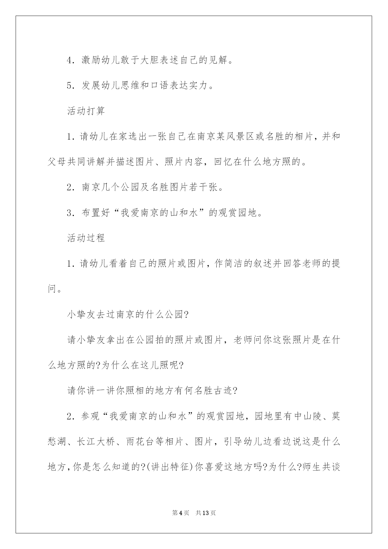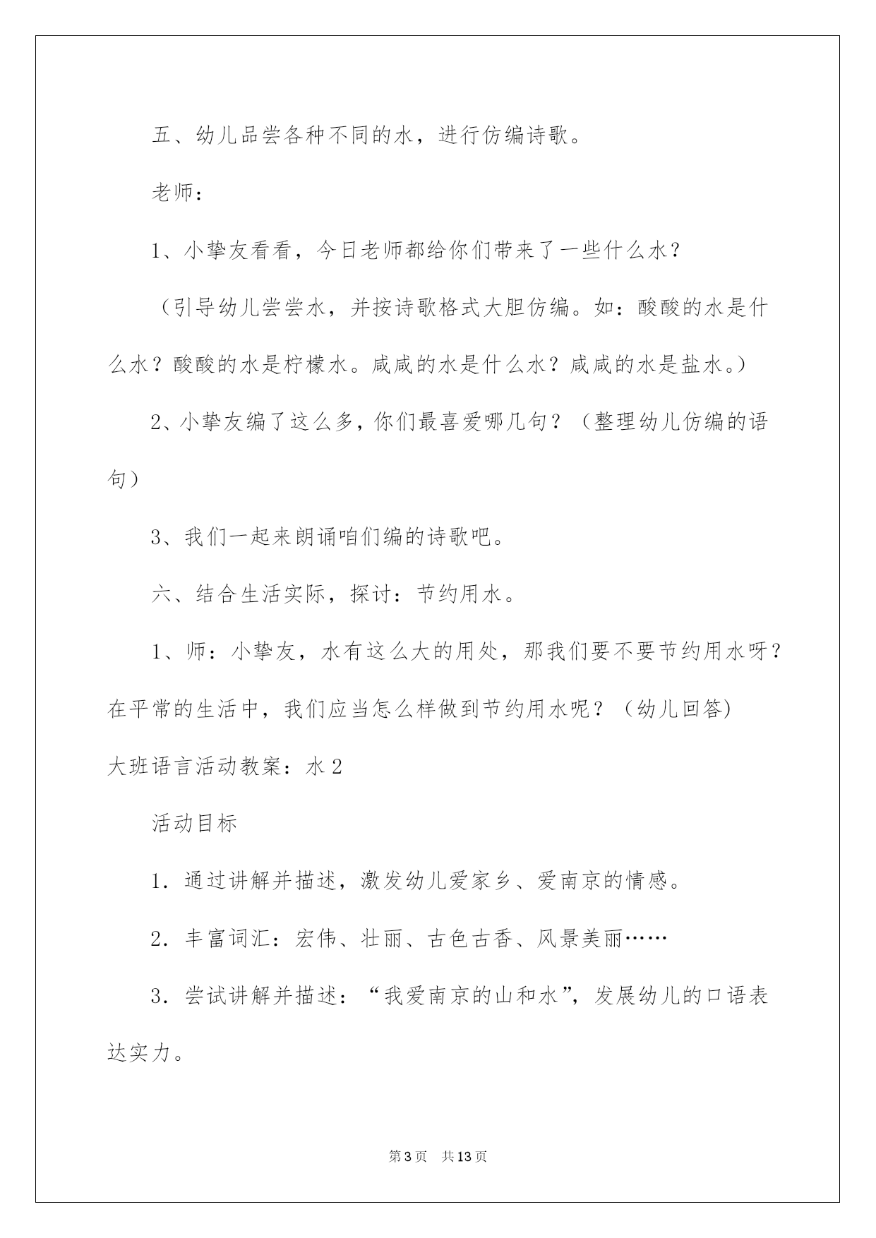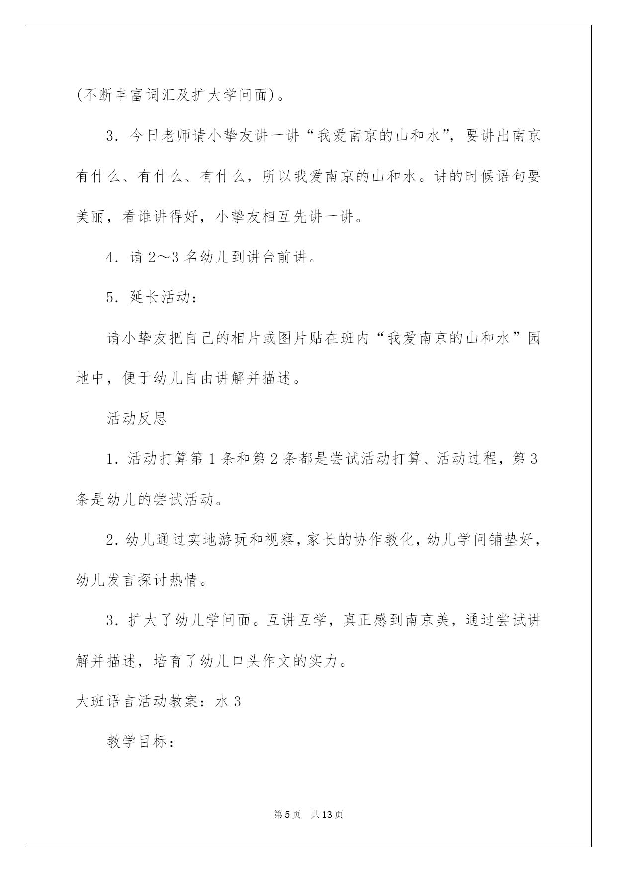 第PAGE\*Arabic\*MERGEFORMAT13页共NUMPAGES\*Arabic\*MERGEFORMAT13页第PAGE\*MERGEFORMAT13页共NUMPAGES\*MERGEFORMAT13页第PAGE\*MERGEFORMAT13页共NUMPAGES\*MERGEFORMAT13页第PAGE\*MERGEFORMAT13页共NUMPAGES\*MERGEFORMAT13页第PAGE\*MERGEFORMAT13页共NUMPAGES\*MERGEFORMAT13页第PAGE\*MERGEFORMAT13页共NUMPAGES\*MERGEFORMAT13页第PAGE\*MERGEFORMAT13页共NUMPAGES\*MERGEFORMAT13页第PAGE\*MERGEFORMAT13页共NUMPAGES\*MERGEFORMAT13页第PAGE\*MERGEFORMAT13页共NUMPAGES\*MERGEFORMAT13页第PAGE\*MERGEFORMAT13页共NUMPAGES\*MERGEFORMAT13页第PAGE\*MERGEFORMAT13页共NUMPAGES\*MERGEFORMAT13页2022大班语言活动教案:水大班语言活动教案:水在教学工作者实际的教学活动中,时常须要用到教案,借助教案可以更好地组织教学活动。我们应当怎么写教案呢?以下是我为大家收集的大班语言活动教案:水,仅供参考,大家一起来看看吧。大班语言活动教案:水1活动目标:1、理解诗歌内容,体会诗歌丰富的联想意境。2、感知问答歌的好玩形式,并尝试仿编。3、了解水的不同形态。活动打算:老师自制词卡“水”“泪水”“西瓜水”“泉水”“汗水”。各种不同的水(盐水,冰水,柠檬水,开水)。诗歌《好玩的水》。活动过程:一、师生沟通对水的印象。1、出示字词卡“水”,幼儿认读,并进行组词嬉戏。(幼儿进行组词)2、谈谈“水”。师:水是什么样的?你见过什么样的水?水有什么用?二、老师朗诵诗歌,幼儿观赏。提问:1、诗歌的名字是什么?2、诗歌中说了哪些水?它们是什么样子的?(老师依次出示字词卡“泪水”“西瓜水”“泉水”“汗水”)三、师生共同朗诵诗歌。1、老师:这首诗歌与我们以前学的诗歌有什么不一样?你们想怎么样朗诵这首诗歌?2、引导幼儿采纳分组问答的形式朗诵诗歌,体会你问我答的好玩形式。四、分析诗歌的内容与格式。1、为什么说“小小的水是泪水”?“小小的水”还能是什么水?2、西瓜水为什么是甜甜的水?还有什么水师甜甜的?3、你是怎么理解“跳舞的水是泉水”“健康的水是汗水”的?五、幼儿品尝各种不同的水,进行仿编诗歌。老师:1、小挚友看看,今日老师都给你们带来了一些什么水?(引导幼儿尝尝水,并按诗歌格式大胆仿编。如:酸酸的水是什么水?酸酸的水是柠檬水。咸咸的水是什么水?咸咸的水是盐水。)2、小挚友编了这么多,你们最喜爱哪几句?(整理幼儿仿编的语句)3、我们一起来朗诵咱们编的诗歌吧。六、结合生活实际,探讨:节约用水。1、师:小挚友,水有这么大的用处,那我们要不要节约用水呀?在平常的生活中,我们应当怎么样做到节约用水呢?(幼儿回答)大班语言活动教案:水2活动目标1.通过讲解并描述,激发幼儿爱家乡、爱南京的情感。2.丰富词汇:宏伟、壮丽、古色古香、风景美丽……3.尝试讲解并描述:“我爱南京的山和水”,发展幼儿的口语表达实力。4.激励幼儿敢于大胆表述自己的见解。5.发展幼儿思维和口语表达实力。活动打算1.请幼儿在家选出一张自己在南京某风景区或名胜的相片,并和父母共同讲解并描述图片、照片内容,回忆在什么地方照的。2.南京几个公园及名胜图片若干张。3.布置好“我爱南京的山和水”的观赏园地。活动过程1.请幼儿看着自己的照片或图片,作简洁的叙述并回答老师的提问。小挚友去过南京的什么公园?请小挚友拿出在公园拍的照片或图片,老师问你这张照片是在什么地方照的?为什么在这儿照呢?请你讲一讲你照相的地方有何名胜古迹?2.参观“我爱南京的山和水”的观赏园地,园地里有中山陵、莫愁湖、长江大桥、雨花台等相片、图片,引导幼儿边看边说这是什么地方,你是怎么知道的?(讲出特征)你喜爱这地方吗?为什么?师生共谈(不断丰富词汇及扩大学问面)。3.今日老师请小挚友讲一讲“我爱南京的山和水”,要讲出南京有什么、有什么、有什么,所以我爱南京的山和水。讲的时候语句要美丽,看谁讲得好,小挚友相互先讲一讲。4.请2~3名幼儿到讲台前讲。5.延长活动:请小挚友把自己的相片或图片贴在班内“我爱南京的山和水”园地中,便于幼儿自由讲解并描述。活动反思1.活动打算第