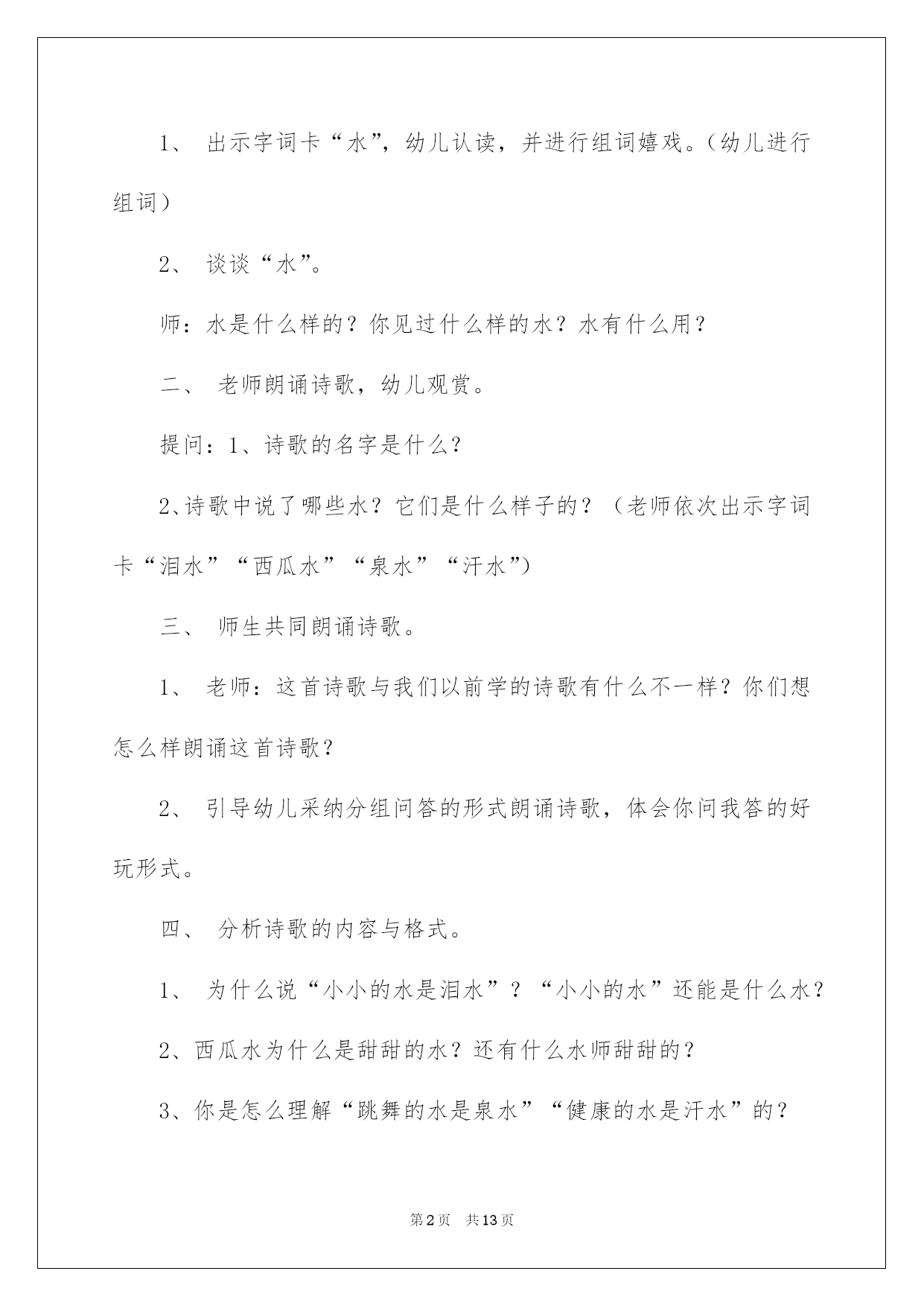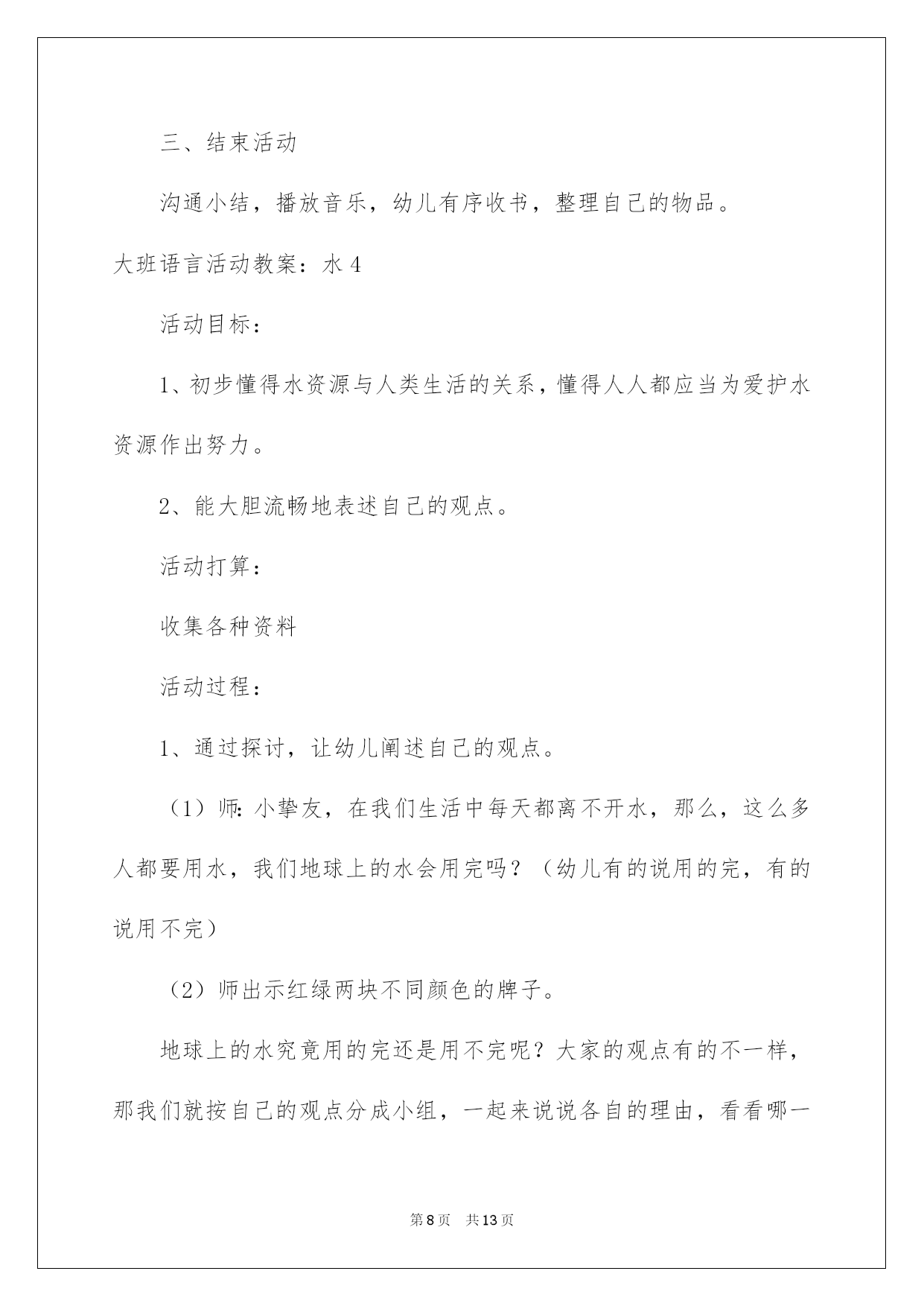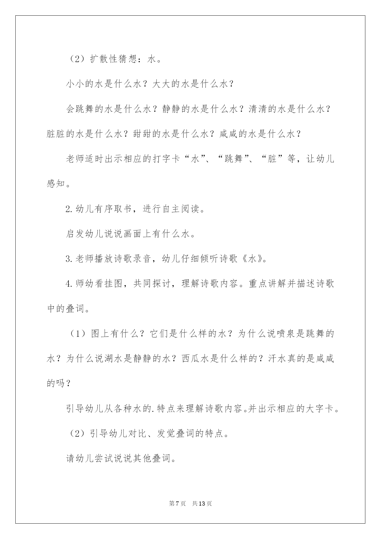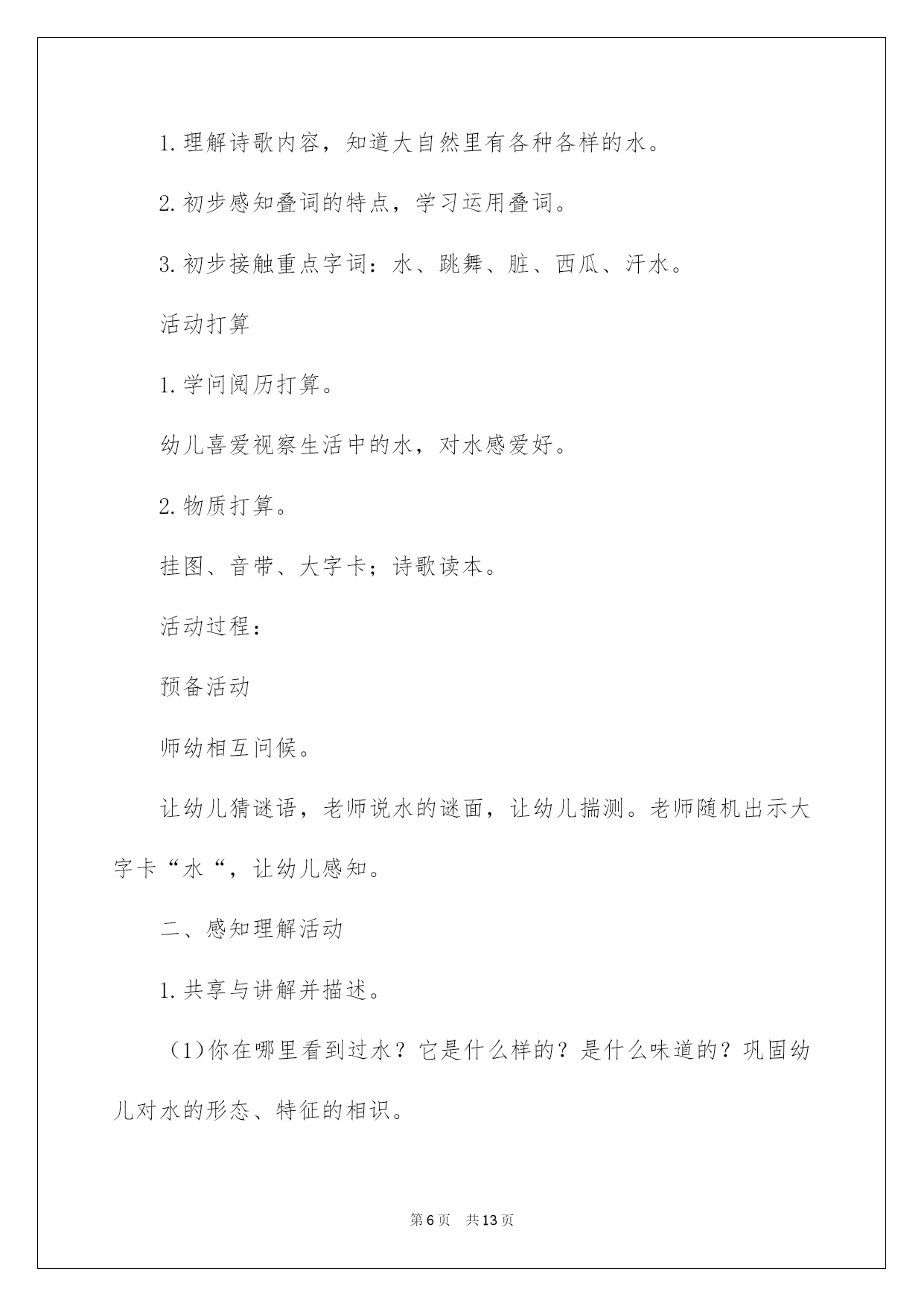 第PAGE\*Arabic\*MERGEFORMAT13页共NUMPAGES\*Arabic\*MERGEFORMAT13页第PAGE\*MERGEFORMAT13页共NUMPAGES\*MERGEFORMAT13页第PAGE\*MERGEFORMAT13页共NUMPAGES\*MERGEFORMAT13页第PAGE\*MERGEFORMAT13页共NUMPAGES\*MERGEFORMAT13页第PAGE\*MERGEFORMAT13页共NUMPAGES\*MERGEFORMAT13页第PAGE\*MERGEFORMAT13页共NUMPAGES\*MERGEFORMAT13页第PAGE\*MERGEFORMAT13页共NUMPAGES\*MERGEFORMAT13页第PAGE\*MERGEFORMAT13页共NUMPAGES\*MERGEFORMAT13页第PAGE\*MERGEFORMAT13页共NUMPAGES\*MERGEFORMAT13页第PAGE\*MERGEFORMAT13页共NUMPAGES\*MERGEFORMAT13页第PAGE\*MERGEFORMAT13页共NUMPAGES\*MERGEFORMAT13页2022大班语言活动教案:水大班语言活动教案:水在教学工作者实际的教学活动中,时常须要用到教案,借助教案可以更好地组织教学活动。我们应当怎么写教案呢?以下是我为大家收集的大班语言活动教案:水,仅供参考,大家一起来看看吧。大班语言活动教案:水1活动目标:1、理解诗歌内容,体会诗歌丰富的联想意境。2、感知问答歌的好玩形式,并尝试仿编。3、了解水的不同形态。活动打算:老师自制词卡“水”“泪水”“西瓜水”“泉水”“汗水”。各种不同的水(盐水,冰水,柠檬水,开水)。诗歌《好玩的水》。活动过程:一、师生沟通对水的印象。1、出示字词卡“水”,幼儿认读,并进行组词嬉戏。(幼儿进行组词)2、谈谈“水”。师:水是什么样的?你见过什么样的水?水有什么用?二、老师朗诵诗歌,幼儿观赏。提问:1、诗歌的名字是什么?2、诗歌中说了哪些水?它们是什么样子的?(老师依次出示字词卡“泪水”“西瓜水”“泉水”“汗水”)三、师生共同朗诵诗歌。1、老师:这首诗歌与我们以前学的诗歌有什么不一样?你们想怎么样朗诵这首诗歌?2、引导幼儿采纳分组问答的形式朗诵诗歌,体会你问我答的好玩形式。四、分析诗歌的内容与格式。1、为什么说“小小的水是泪水”?“小小的水”还能是什么水?2、西瓜水为什么是甜甜的水?还有什么水师甜甜的?3、你是怎么理解“跳舞的水是泉水”“健康的水是汗水”的?五、幼儿品尝各种不同的水,进行仿编诗歌。老师:1、小挚友看看,今日老师都给你们带来了一些什么水?(引导幼儿尝尝水,并按诗歌格式大胆仿编。如:酸酸的水是什么水?酸酸的水是柠檬水。咸咸的水是什么水?咸咸的水是盐水。)2、小挚友编了这么多,你们最喜爱哪几句?(整理幼儿仿编的语句)3、我们一起来朗诵咱们编的诗歌吧。六、结合生活实际,探讨:节约用水。1、师:小挚友,水有这么大的用处,那我们要不要节约用水呀?在平常的生活中,我们应当怎么样做到节约用水呢?(幼儿回答)大班语言活动教案:水2活动目标1.通过讲解并描述,激发幼儿爱家乡、爱南京的情感。2.丰富词汇:宏伟、壮丽、古色古香、风景美丽……3.尝试讲解并描述:“我爱南京的山和水”,发展幼儿的口语表达实力。4.激励幼儿敢于大胆表述自己的见解。5.发展幼儿思维和口语表达实力。活动打算1.请幼儿在家选出一张自己在南京某风景区或名胜的相片,并和父母共同讲解并描述图片、照片内容,回忆在什么地方照的。2.南京几个公园及名胜图片若干张。3.布置好“我爱南京的山和水”的观赏园地。活动过程1.请幼儿看着自己的照片或图片,作简洁的叙述并回答老师的提问。小挚友去过南京的什么公园?请小挚友拿出在公园拍的照片或图片,老师问你这张照片是在什么地方照的?为什么在这儿照呢?请你讲一讲你照相的地方有何名胜古迹?2.参观“我爱南京的山和水”的观赏园地,园地里有中山陵、莫愁湖、长江大桥、雨花台等相片、图片,引导幼儿边看边说这是什么地方,你是怎么知道的?(讲出特征)你喜爱这地方吗?为什么?师生共谈(不断丰富词汇及扩大学问面)。3.今日老师请小挚友讲一讲“我爱南京的山和水”,要讲出南京有什么、有什么、有什么,所以我爱南京的山和水。讲的时候语句要美丽,看谁讲得好,小挚友相互先讲一讲。4.请2~3名幼儿到讲台前讲。5.延长活动:请小挚友把自己的相片或图片贴在班内“我爱南京的山和水”园地中,便于幼儿自由讲解并描述。活动反思1.活动打算第