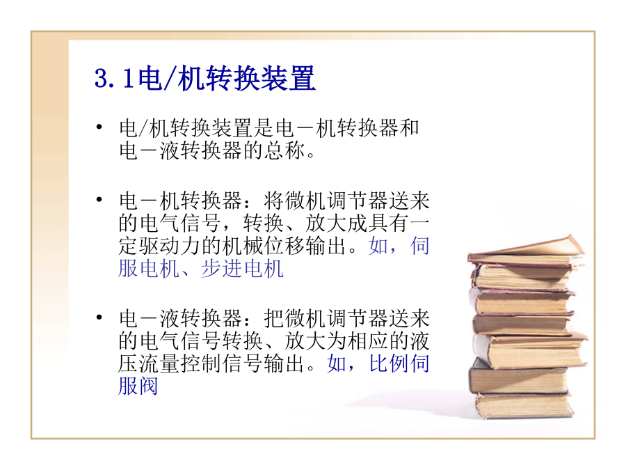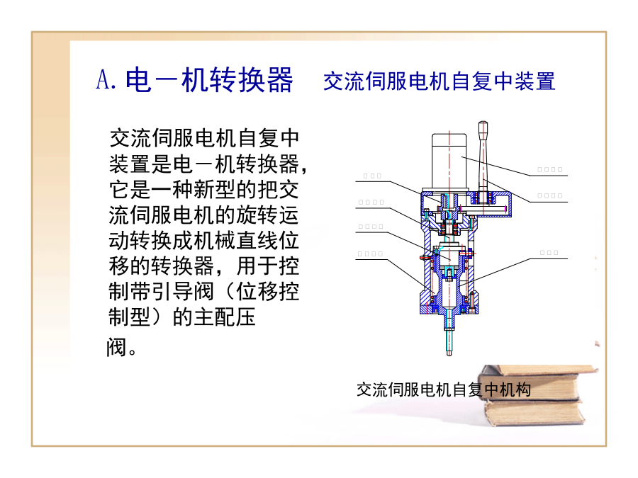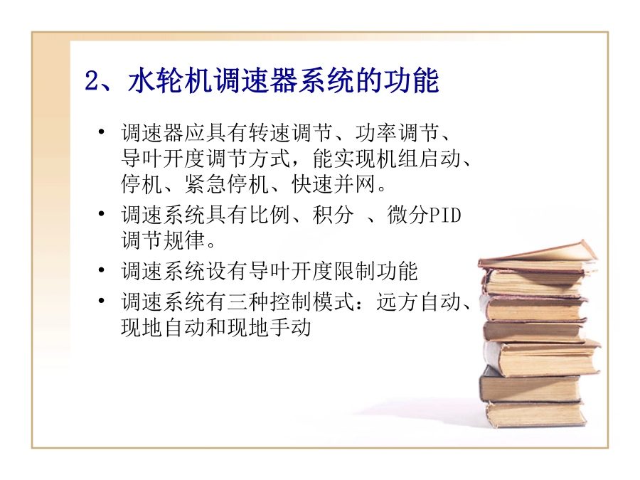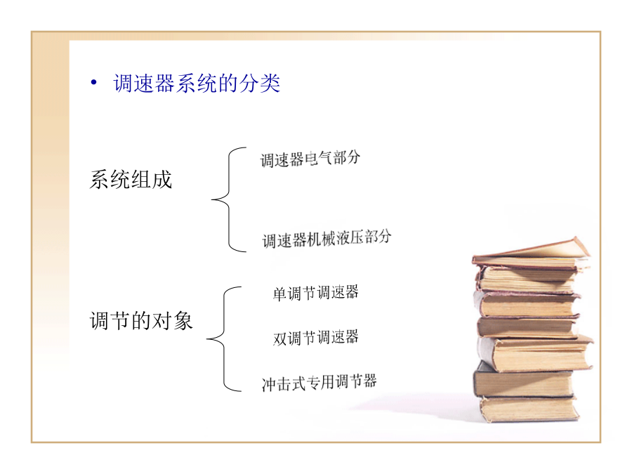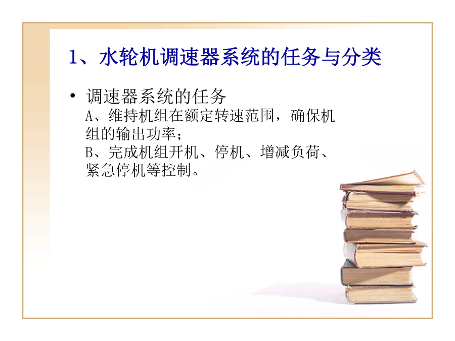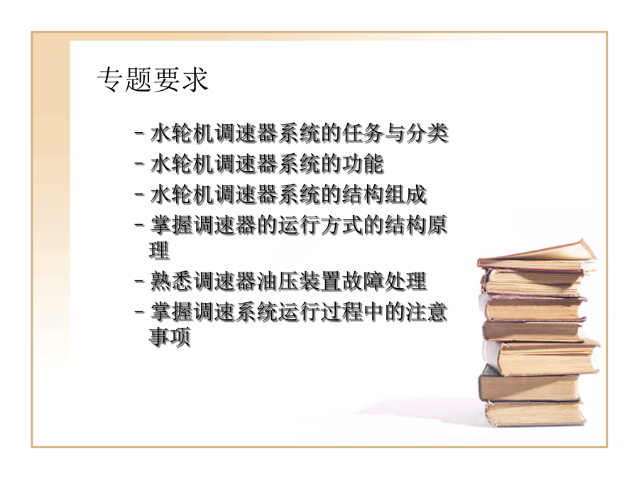 2010.12.1专题要求1、水轮机调速器系统的任务与分类调速器系统的分类系统组成调节的对象2、水轮机调速器系统的功能3、水轮机调速器系统的结构组成调速器机械液压系统框图3.1电/机转换装置A.电-机转换器交流伺服电机自复中装置电-液转换器交流伺服电机/控制阀B.电-液转换器比例伺服阀比例伺服阀控制主配压阀原理框图先导控制阀--脉冲阀3.2主配压阀美国GE公司FC主配压阀A.带引导阀的机械位移控制型主配压阀B.带辅助接力器的液压控制型主配压阀3.3事故配压阀系统框图事故配压阀3.4接力器两端关闭系统图两段关闭阀装置100电气分断关闭装置两段关闭阀装置机械过速装置:两位两通机械换向阀机械过速装置:过速飞摆装置(过速环)3.5微机调速器微机调速器PID结构图步进电机伺服缸系统原理框图PLC水轮机微机调速器的总体框图水轮机数字式(微机)电液调速器◆典型结构步进电机电液转换器/机械液压随动系统型调速器方块图水轮机数字式(微机)电液调速器交流伺服电机电液转换器/电液执行机构型调速器方块图水轮机数字式(微机)电液调速器机械液压系统-油压装置系统图油压装置系统-螺杆泵油压装置系统-组合阀油压装置系统-补气阀油压装置系统-补气阀1油压装置系统-补气阀2一次调频各机组并网运行时,受外界负荷变动影响,电网频率发生变化,这时,各机组的调节系统参与调节作用,改变各机组所带的负荷,使之与外界负荷相平衡.同时,还尽力减少电网频率的变化,这一过程即为一次调频.互助共学,携手进步!演讲完毕,谢谢观看!