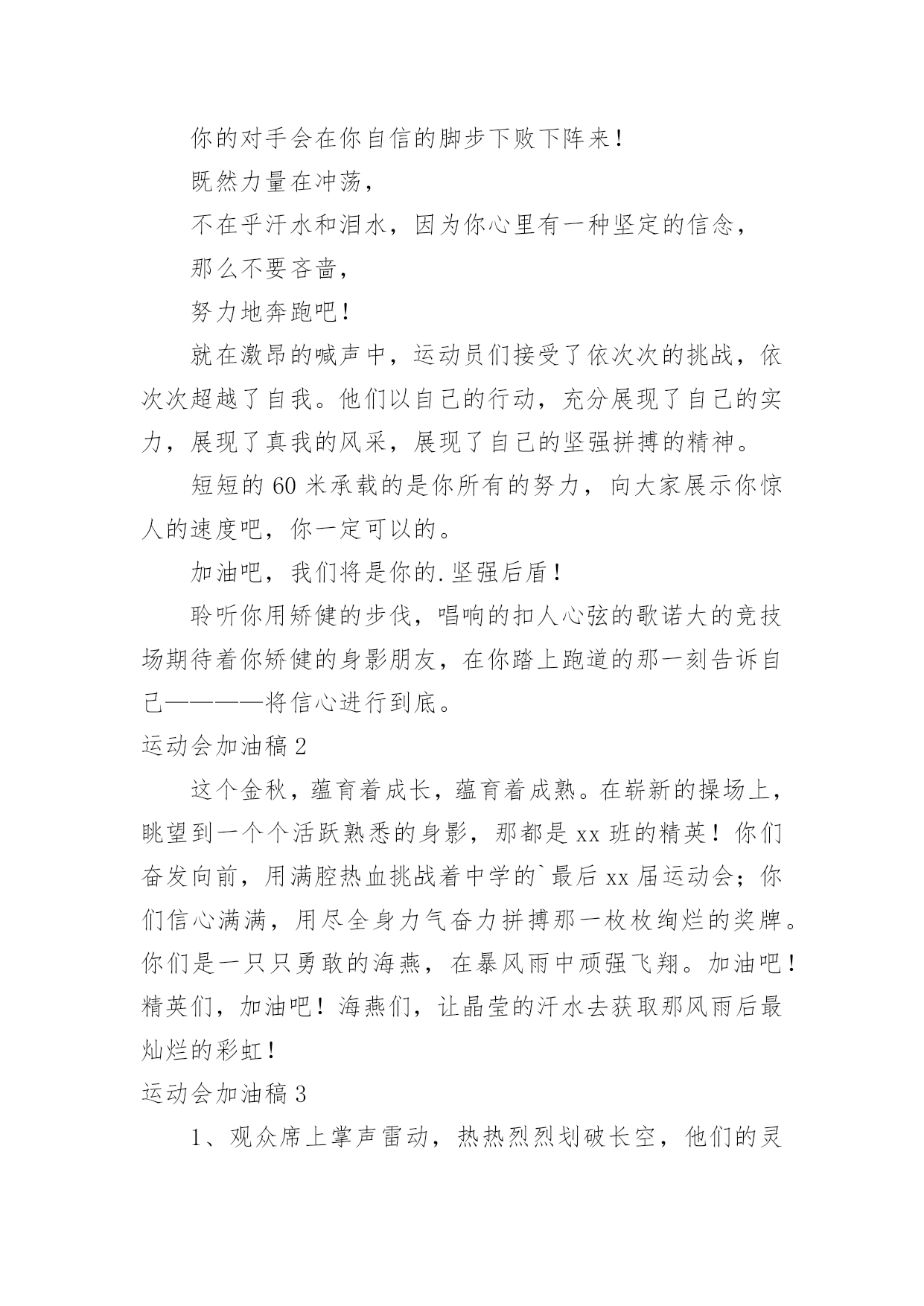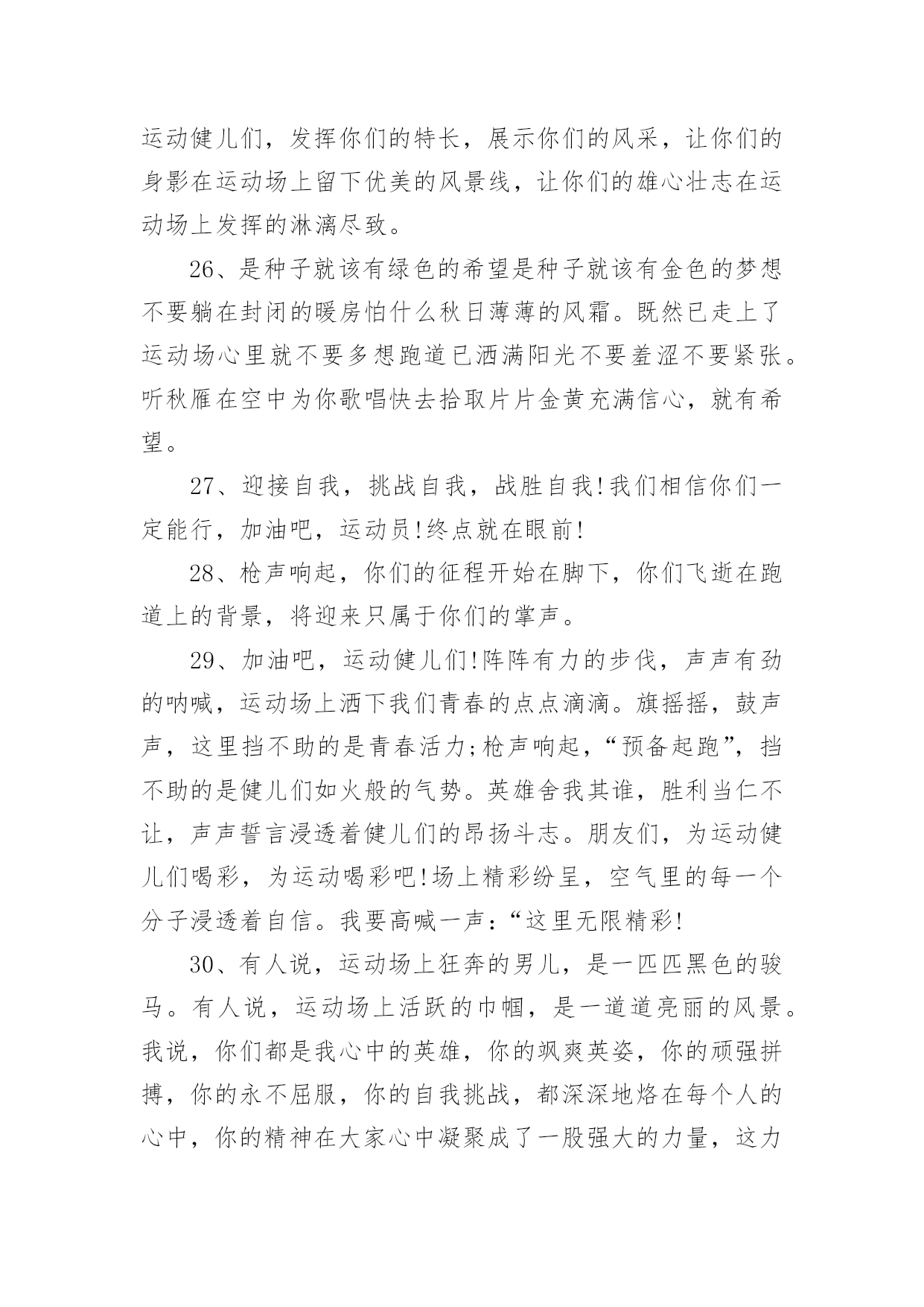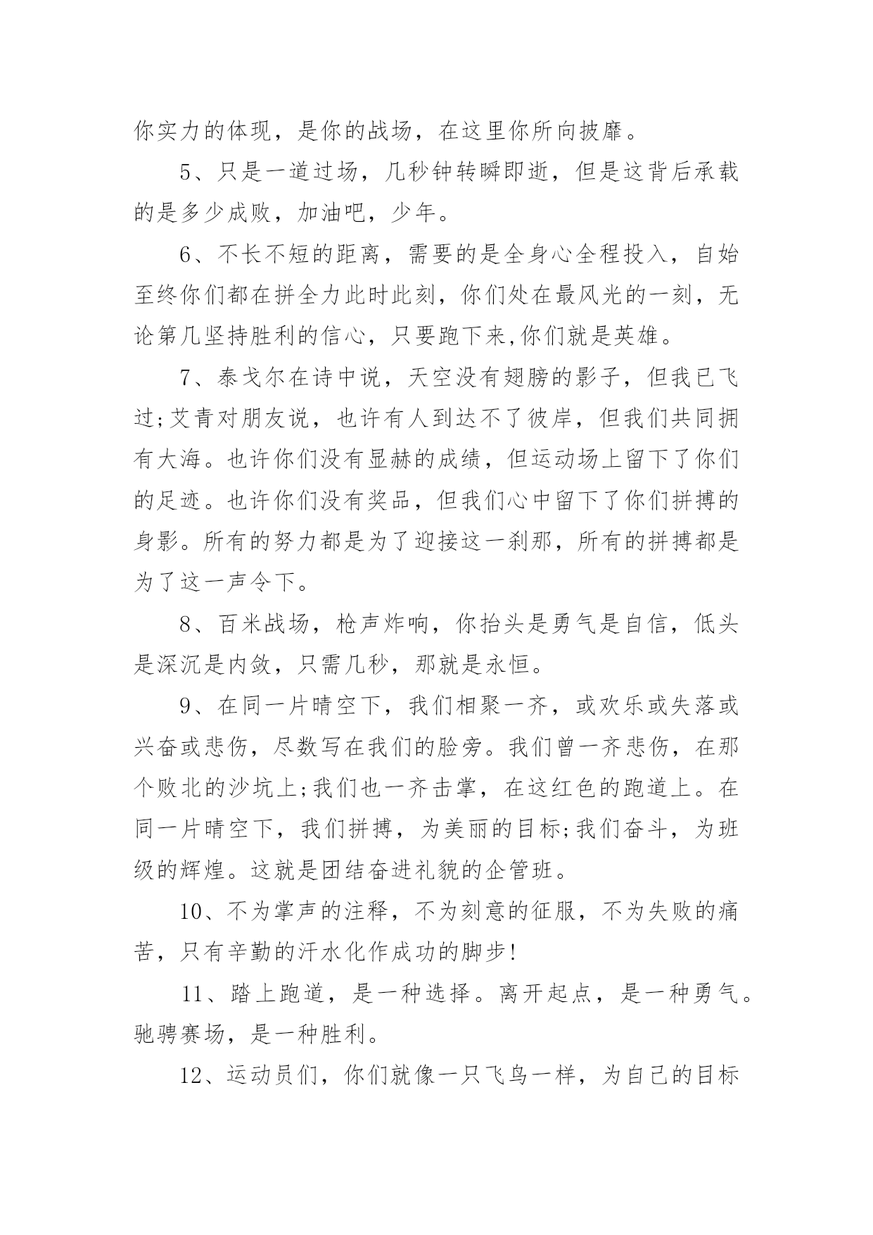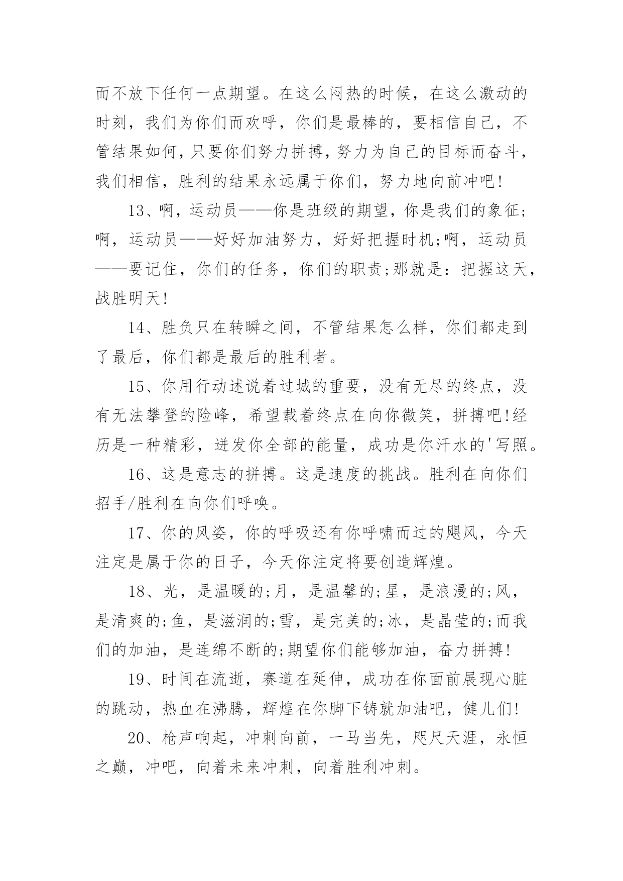 运动会加油稿运动会加油稿15篇(优)在学习、工作生活中,我们很多时候都不得不用到加油稿,加油稿可以激励对方更好地参加活动。为了让您在写加油稿时更加简单方便,下面是小编收集整理的运动会加油稿,希望能够帮助到大家。运动会加油稿1那雪白的起跑线,凝聚了你数的辛酸与汗水。那800米的跑道对你来说是那么漫长,但你知道:你只有努力去拼搏,去战胜自己!奔跑在赛道的你,这几天我们学校举办了一场运动会。今天下午马上就开始接力赛了,接力赛是考验集体团结的,我相信我们班的同学,一定能取得很好的成绩!请放飞你的心,释放你的自信。你的眼睛会展现一切,要正视对方。你的英气将会压倒一切,你的对手会在你自信的脚步下败下阵来!既然力量在冲荡,不在乎汗水和泪水,因为你心里有一种坚定的信念,那么不要吝啬,努力地奔跑吧!就在激昂的喊声中,运动员们接受了依次次的挑战,依次次超越了自我。他们以自己的行动,充分展现了自己的实力,展现了真我的风采,展现了自己的坚强拼搏的精神。短短的60米承载的是你所有的努力,向大家展示你惊人的速度吧,你一定可以的。加油吧,我们将是你的.坚强后盾!聆听你用矫健的步伐,唱响的扣人心弦的歌诺大的竞技场期待着你矫健的身影朋友,在你踏上跑道的那一刻告诉自己————将信心进行到底。运动会加油稿2这个金秋,蕴育着成长,蕴育着成熟。在崭新的操场上,眺望到一个个活跃熟悉的身影,那都是xx班的精英!你们奋发向前,用满腔热血挑战着中学的`最后xx届运动会;你们信心满满,用尽全身力气奋力拼搏那一枚枚绚烂的奖牌。你们是一只只勇敢的海燕,在暴风雨中顽强飞翔。加油吧!精英们,加油吧!海燕们,让晶莹的汗水去获取那风雨后最灿烂的彩虹!运动会加油稿31、观众席上掌声雷动,热热烈烈划破长空,他们的灵魂在叫,血在烧,都是渴望有无限的希望,掌声响起来为新的力量喝彩,掌声响起来,每一棵都精彩。晨风轻轻地唤醒骄阳,校园的操场传来发令枪的声响,彩旗与呐喊声一起在飘荡着,心和起点紧紧的相连,用青春和热血来铺洒白色的跑道,用激情点燃胜利的曙光!赛场上,无数飞扬的红色生命,无数威武的骑手,映动着一个个跃动的生命。因为有你,初冬的阳光撮成煦暖;因为有你,终点的线条色彩斑斓;因为有你,掌声才显出非凡意义。2、年轻的心,蓬勃的心,向上的`心,酝酿着梦幻,滋润着信念,喷发着志气,即使收效甚微,不愿放弃目标,即使落伍,不愿停止前进的步伐,为了昨天的汗水,去实现今天的辉煌。是的,我们能行,我们能赢,心中重复了无数次,是的,我们,能赢。因为我们富有生命的热情,必胜的信心;未来的挑战,必胜的坚定。向着辽阔大地大呼:我们一定赢!3、汗水,泪水;笑声,歌声;我们尽情挥洒。开幕式上,运动场上,我们尽情展现,多少艰辛,多少困苦,我们勇敢承担。因为年轻,因为张扬,因为我们知道:用今天的汗水换来明天的微笑。4、愿将希望折成一只小船,沿着溪流送到你的身边;愿把鼓励扎成一束清水,满怀微笑地递到你面前;愿将友谊织成一条毛巾,轻轻的拭去你辛苦的汗水;愿让热情燃烧成一片鲜花,献给你,到一声:“辛苦啦,运动员!”5、拔河,是拔一种潜力,每个人都是有潜力可以挖掘的;拔河,也是拔一种人生。在人生的道路上,谁都想当赢家,靠的是实力,靠的是机遇,靠的也是一种永不放弃的精神,只要你满腔热忱,终不放弃,你终究会赢回来。6、踏上跑道,是一种选择,离开起点,是一种追求,驰骋赛场,是一种骄傲,执着坚持,是一种胜利。我们选择,我们追求,我们同样将胜利,此时此刻,跑道便是我们精彩的舞台,声声加油便是我们最高的奖项!终点永远在前方,成功永远在心中,论何成功,谈何荣辱,心中的信念只有一个:拼搏!当一切不再遥远,洋洋洒洒的快乐,是秋天最美的画面。运动会加油稿41、在黑白相间的跑道上,留下了你们灿烂的身影。努力拼搏,顽强奋斗,即使落后,也顽强不屈,永不退缩!2、朝阳的金色洗亮了跑道,青春的旋律谱成了这首歌,充满活力的心是这首歌的音符,花季的少年火热的心,永远的真诚不变的心,飞吧!胜利在向你微笑。3。梦想在前方我们向前奔跑,生命中谁都要有个目标。谁在风中,风中燃烧。梦想前方,就在今朝。你听那欢呼加油的呐喊声,催人奋进。4、不长不短的距离,需要的是全身心全程投入,自始至终你们都在拼全力此时此刻,你们处在最风光的一刻,无论第几坚持胜利的信心,只要跑下来,你们就是英雄。5、为了最终一刻,你不知洒了多少汗水,为了最终一刻,你不知牺牲了多少业余时间,为了我们共同期待的最终一刻,你付出无数努力,你是我们的自豪与骄傲。6、400米的跑道上,你正在飞驰,面对如此遥远的路途,你也许腿脚发麻,你也许有些茫然。在你身后,是你日日苦练的汗水。鼓起勇气,奋勇向前吧!7、起跑线上,你们一字排开,健美的肌肉蕴涵着爆发力量,坚定的目光充满了自信。枪响了,你们开始了并不长的征程,笔直的跑道上,