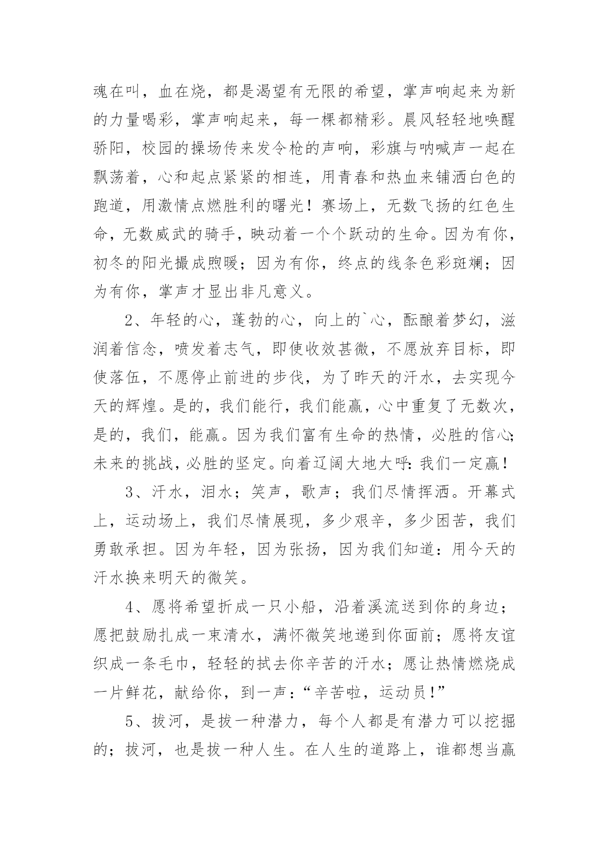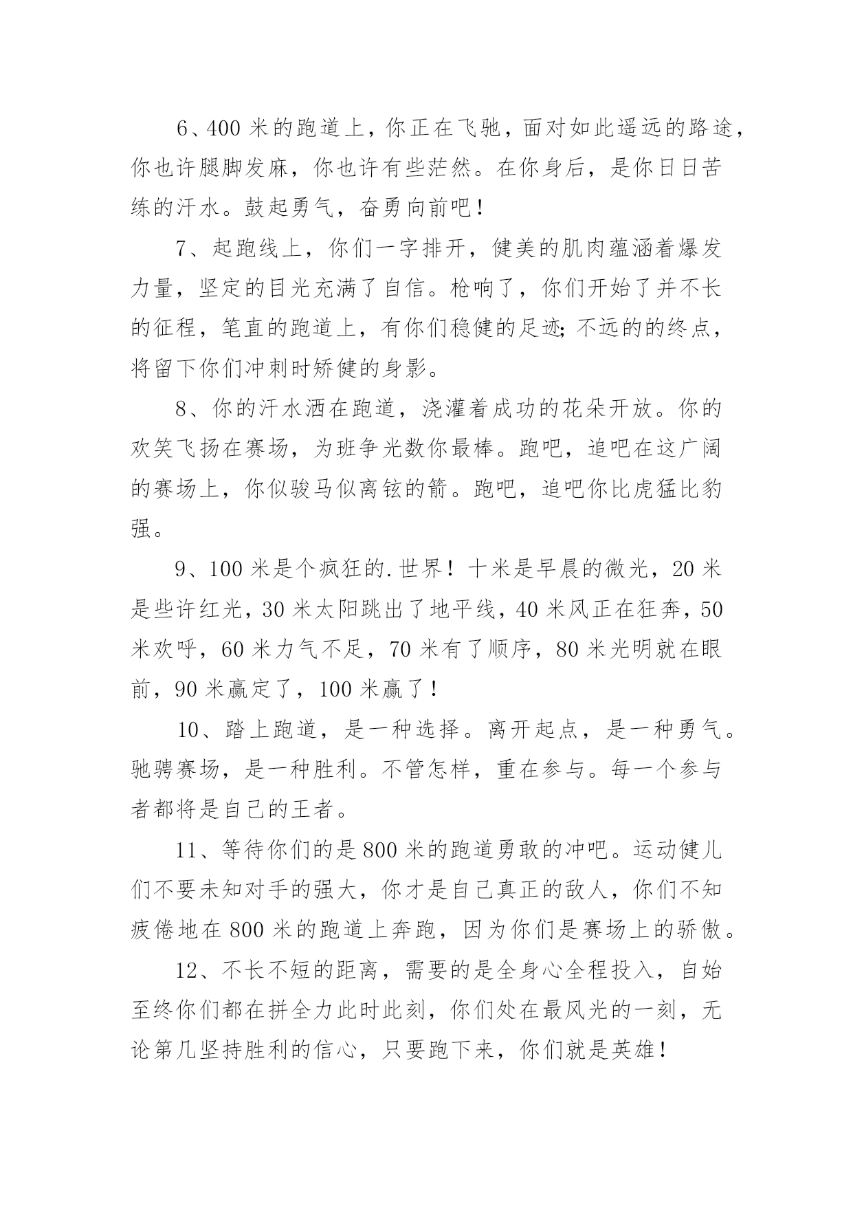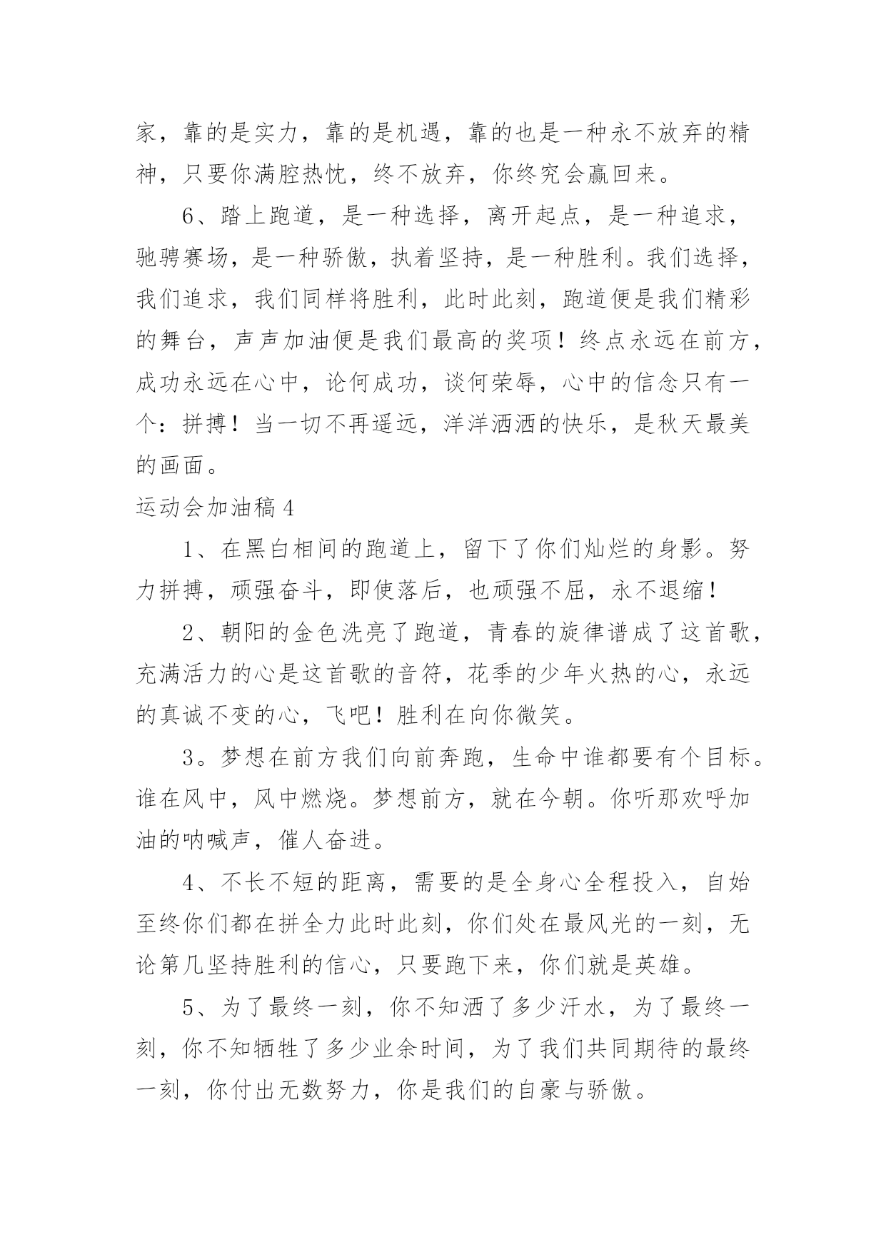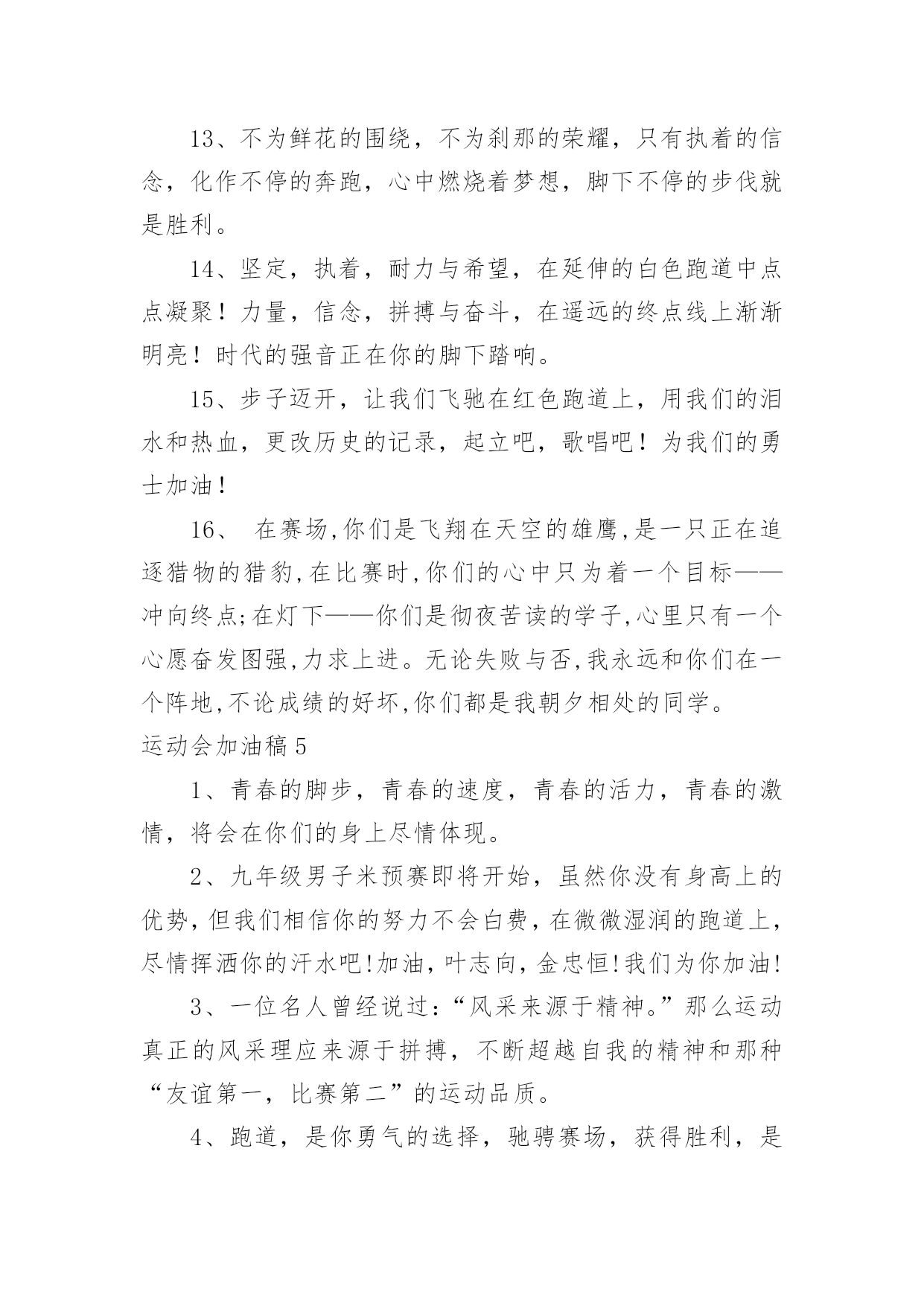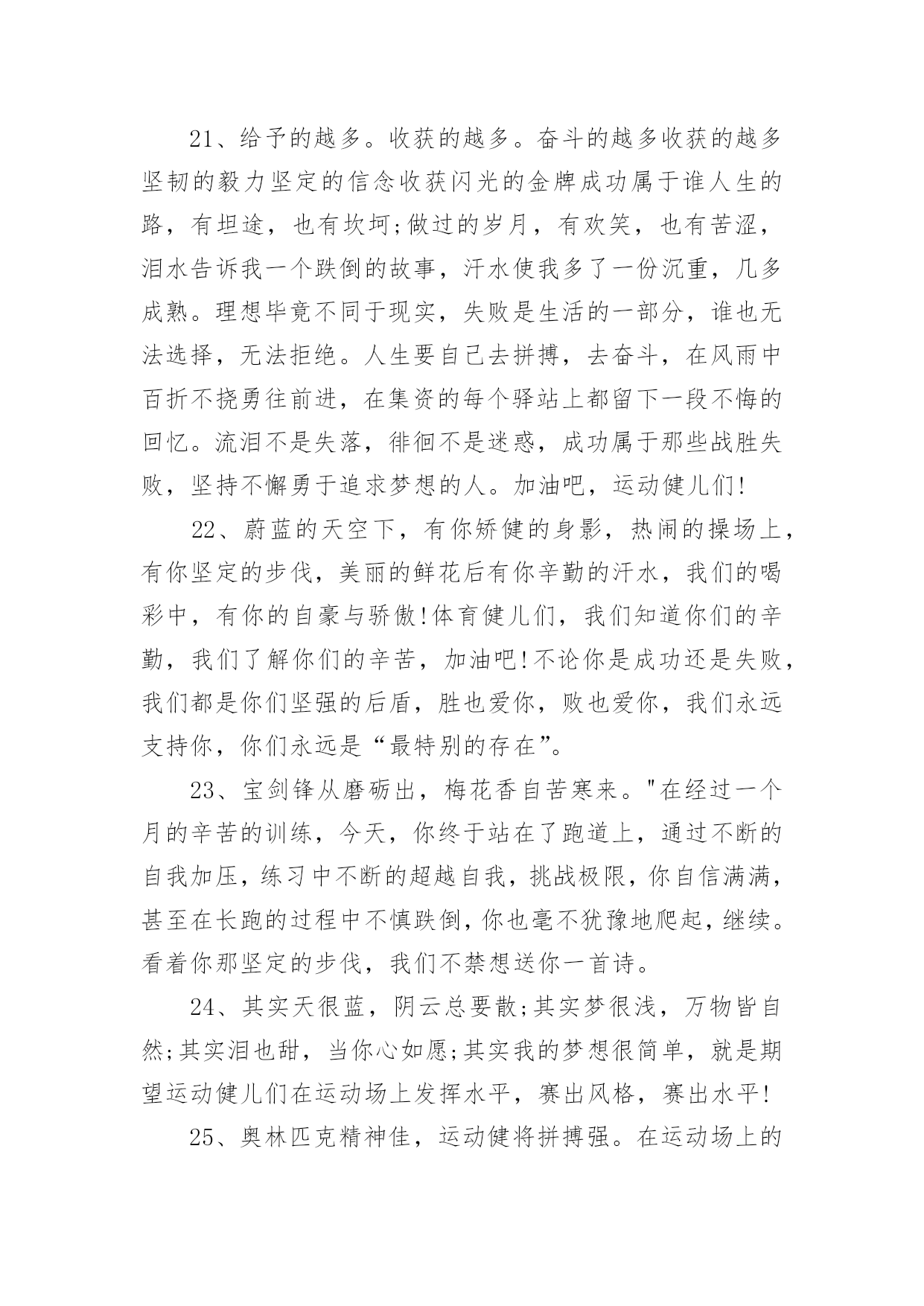 运动会加油稿运动会加油稿15篇(优)在学习、工作生活中,我们很多时候都不得不用到加油稿,加油稿可以激励对方更好地参加活动。为了让您在写加油稿时更加简单方便,下面是小编收集整理的运动会加油稿,希望能够帮助到大家。运动会加油稿1那雪白的起跑线,凝聚了你数的辛酸与汗水。那800米的跑道对你来说是那么漫长,但你知道:你只有努力去拼搏,去战胜自己!奔跑在赛道的你,这几天我们学校举办了一场运动会。今天下午马上就开始接力赛了,接力赛是考验集体团结的,我相信我们班的同学,一定能取得很好的成绩!请放飞你的心,释放你的自信。你的眼睛会展现一切,要正视对方。你的英气将会压倒一切,你的对手会在你自信的脚步下败下阵来!既然力量在冲荡,不在乎汗水和泪水,因为你心里有一种坚定的信念,那么不要吝啬,努力地奔跑吧!就在激昂的喊声中,运动员们接受了依次次的挑战,依次次超越了自我。他们以自己的行动,充分展现了自己的实力,展现了真我的风采,展现了自己的坚强拼搏的精神。短短的60米承载的是你所有的努力,向大家展示你惊人的速度吧,你一定可以的。加油吧,我们将是你的.坚强后盾!聆听你用矫健的步伐,唱响的扣人心弦的歌诺大的竞技场期待着你矫健的身影朋友,在你踏上跑道的那一刻告诉自己————将信心进行到底。运动会加油稿2这个金秋,蕴育着成长,蕴育着成熟。在崭新的操场上,眺望到一个个活跃熟悉的身影,那都是xx班的精英!你们奋发向前,用满腔热血挑战着中学的`最后xx届运动会;你们信心满满,用尽全身力气奋力拼搏那一枚枚绚烂的奖牌。你们是一只只勇敢的海燕,在暴风雨中顽强飞翔。加油吧!精英们,加油吧!海燕们,让晶莹的汗水去获取那风雨后最灿烂的彩虹!运动会加油稿31、观众席上掌声雷动,热热烈烈划破长空,他们的灵魂在叫,血在烧,都是渴望有无限的希望,掌声响起来为新的力量喝彩,掌声响起来,每一棵都精彩。晨风轻轻地唤醒骄阳,校园的操场传来发令枪的声响,彩旗与呐喊声一起在飘荡着,心和起点紧紧的相连,用青春和热血来铺洒白色的跑道,用激情点燃胜利的曙光!赛场上,无数飞扬的红色生命,无数威武的骑手,映动着一个个跃动的生命。因为有你,初冬的阳光撮成煦暖;因为有你,终点的线条色彩斑斓;因为有你,掌声才显出非凡意义。2、年轻的心,蓬勃的心,向上的`心,酝酿着梦幻,滋润着信念,喷发着志气,即使收效甚微,不愿放弃目标,即使落伍,不愿停止前进的步伐,为了昨天的汗水,去实现今天的辉煌。是的,我们能行,我们能赢,心中重复了无数次,是的,我们,能赢。因为我们富有生命的热情,必胜的信心;未来的挑战,必胜的坚定。向着辽阔大地大呼:我们一定赢!3、汗水,泪水;笑声,歌声;我们尽情挥洒。开幕式上,运动场上,我们尽情展现,多少艰辛,多少困苦,我们勇敢承担。因为年轻,因为张扬,因为我们知道:用今天的汗水换来明天的微笑。4、愿将希望折成一只小船,沿着溪流送到你的身边;愿把鼓励扎成一束清水,满怀微笑地递到你面前;愿将友谊织成一条毛巾,轻轻的拭去你辛苦的汗水;愿让热情燃烧成一片鲜花,献给你,到一声:“辛苦啦,运动员!”5、拔河,是拔一种潜力,每个人都是有潜力可以挖掘的;拔河,也是拔一种人生。在人生的道路上,谁都想当赢家,靠的是实力,靠的是机遇,靠的也是一种永不放弃的精神,只要你满腔热忱,终不放弃,你终究会赢回来。6、踏上跑道,是一种选择,离开起点,是一种追求,驰骋赛场,是一种骄傲,执着坚持,是一种胜利。我们选择,我们追求,我们同样将胜利,此时此刻,跑道便是我们精彩的舞台,声声加油便是我们最高的奖项!终点永远在前方,成功永远在心中,论何成功,谈何荣辱,心中的信念只有一个:拼搏!当一切不再遥远,洋洋洒洒的快乐,是秋天最美的画面。运动会加油稿41、在黑白相间的跑道上,留下了你们灿烂的身影。努力拼搏,顽强奋斗,即使落后,也顽强不屈,永不退缩!2、朝阳的金色洗亮了跑道,青春的旋律谱成了这首歌,充满活力的心是这首歌的音符,花季的少年火热的心,永远的真诚不变的心,飞吧!胜利在向你微笑。3。梦想在前方我们向前奔跑,生命中谁都要有个目标。谁在风中,风中燃烧。梦想前方,就在今朝。你听那欢呼加油的呐喊声,催人奋进。4、不长不短的距离,需要的是全身心全程投入,自始至终你们都在拼全力此时此刻,你们处在最风光的一刻,无论第几坚持胜利的信心,只要跑下来,你们就是英雄。5、为了最终一刻,你不知洒了多少汗水,为了最终一刻,你不知牺牲了多少业余时间,为了我们共同期待的最终一刻,你付出无数努力,你是我们的自豪与骄傲。6、400米的跑道上,你正在飞驰,面对如此遥远的路途,你也许腿脚发麻,你也许有些茫然。在你身后,是你日日苦练的汗水。鼓起勇气,奋勇向前吧!7、起跑线上,你们一字排开,健美的肌肉蕴涵着爆发力量,坚定的目光充满了自信。枪响了,你们开始了并不长的征程,笔直的跑道上,