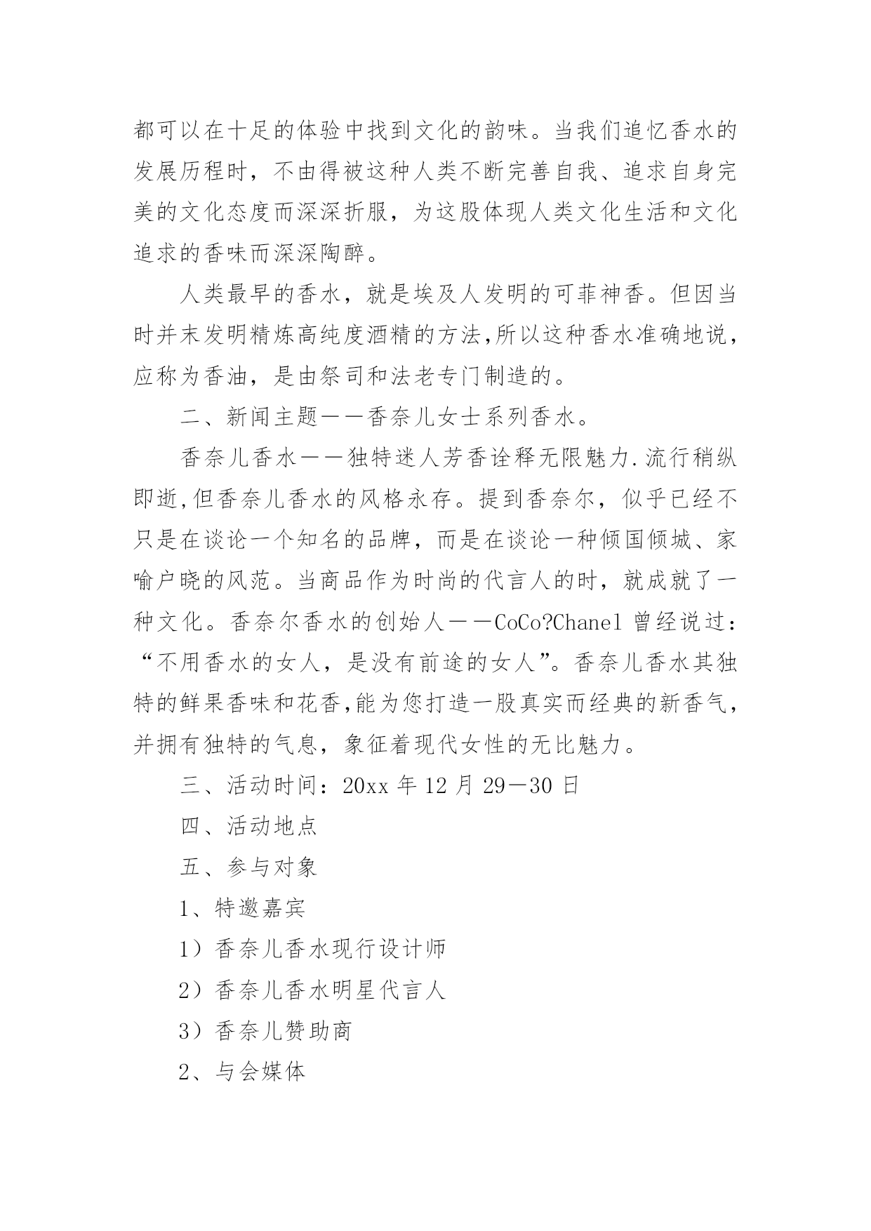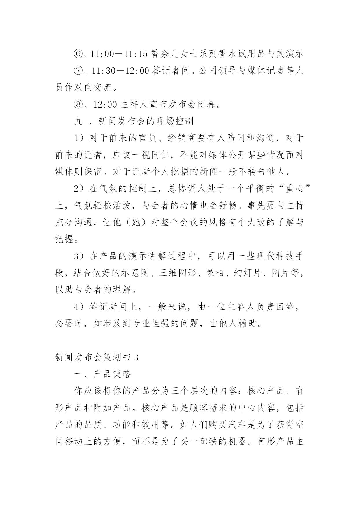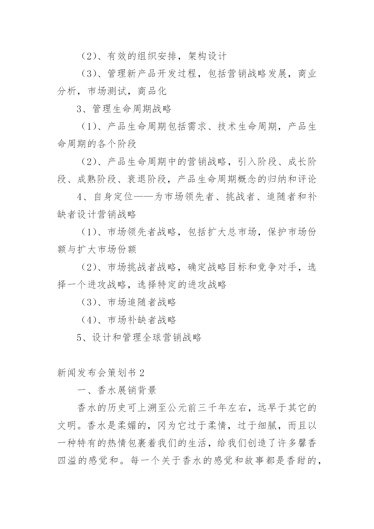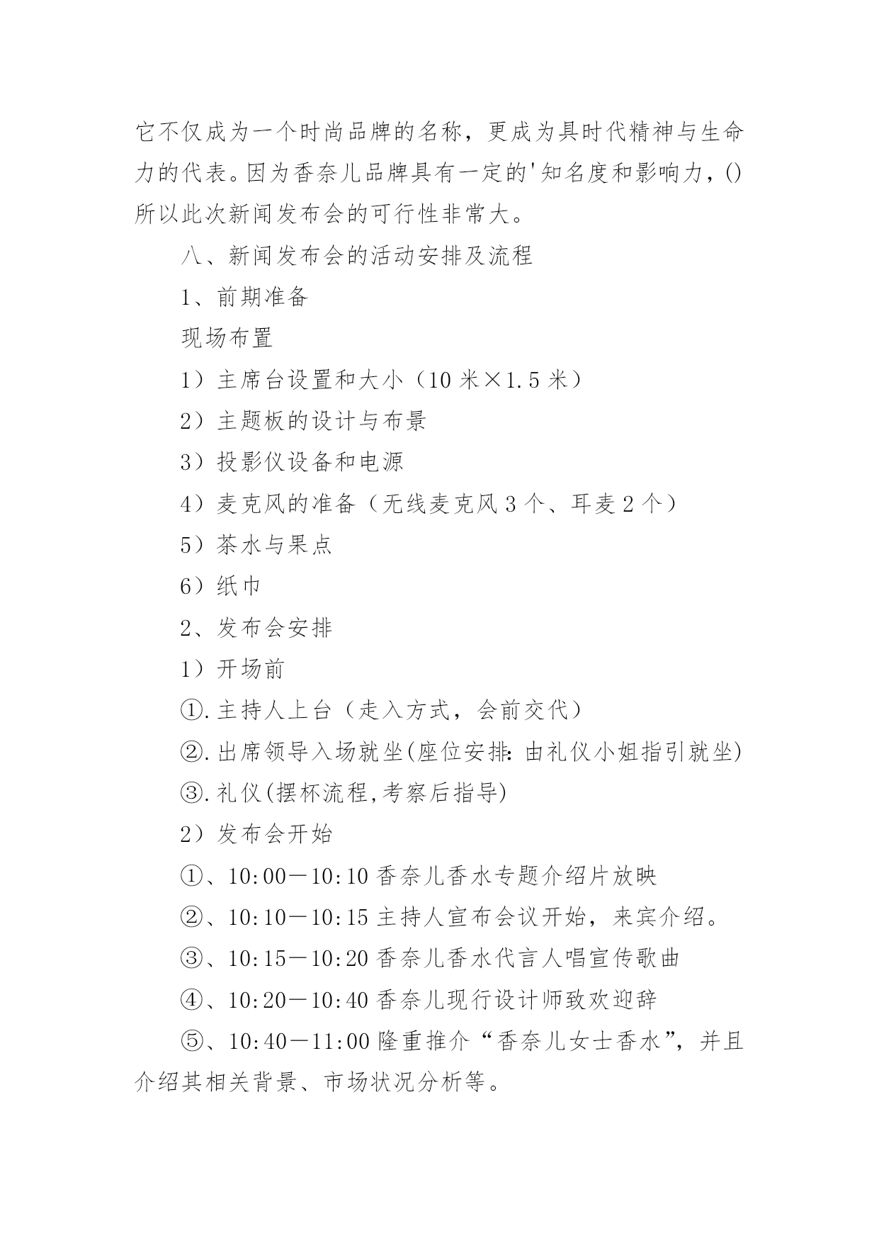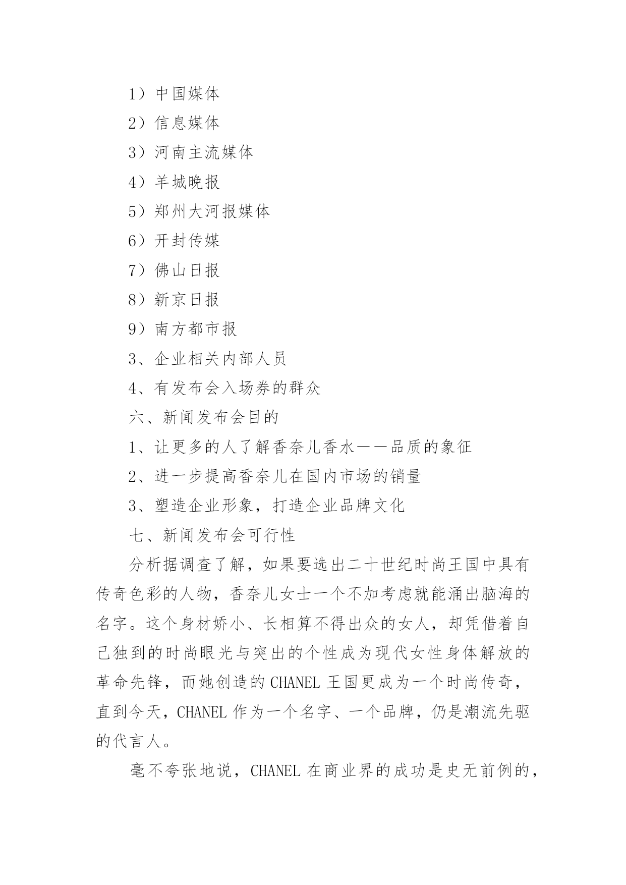 新闻发布会策划书新闻发布会策划书15篇时光如箭,转眼一划而过,一段时间的工作已经结束了,我们又将迎来新的希望,新的工作内容和目标,不妨坐下来好好写写策划书吧。一起来参考策划书是怎么写的吧,下面是小编为大家收集的新闻发布会策划书,欢迎大家分享。新闻发布会策划书1一、分析营销机会1、管理营销信息与衡量市场需求(1)、营销情报与调研(2)、预测概述和需求衡量2、评估营销环境(1)、分析宏观环境的需要和趋势(2)、对主要宏观环境因素的辨认和反应(包括人文统计环境、经济环境、自然环境、技术环境、xxx治法律环境、社会文化环境)3、分析消费者市场和购买行为(1)、消费者购买行为模式(2)、影响消费者购买行为的主要因素(包括文化因素、社会因素、个人因素、心理因素等)(3)、购买过程(包括参与购买的角色,购买行为,购买决策中的.各阶段)4、分析团购市场与团购购买行为(包括团购市场与消费市场的对比,团购购买过程的参与者,机构与xxx府市场)5、分析行业与竞争者(1)、识别公司竞争者(行业竞争观念,市场竞争观念)(2)、辨别竞争对手的战略(3)、判定竞争者的目标(4)、评估竞争者的优势与劣势(5)、评估竞争者的反应模式(6)、选择竞争者以便进攻和回避(7)、在顾客导向和竞争者导向中进行平衡6、确定细分市场和选择目标市场(1)、确定细分市场的层次,模式,程序,细分消费者市场的基础,细分业务市场的基础,有效细分的要求;(2)、目标市场的选定,评估细分市场,选择细分市场二、开发营销战略1、营销差异化与定位(1)、产品差异化、服务差异化、渠道差异化、形象差异化(2)、开发定位战略——推出多少差异,推出那种差异(3)、传播公司的定位2、开发新产品(1)、新产品开发的挑战,包括外部环境分析(机会与威胁分析)(2)、有效的组织安排,架构设计(3)、管理新产品开发过程,包括营销战略发展,商业分析,市场测试,商品化3、管理生命周期战略(1)、产品生命周期包括需求、技术生命周期,产品生命周期的各个阶段(2)、产品生命周期中的营销战略,引入阶段、成长阶段、成熟阶段、衰退阶段,产品生命周期概念的归纳和评论4、自身定位——为市场领先者、挑战者、追随者和补缺者设计营销战略(1)、市场领先者战略,包括扩大总市场,保护市场份额与扩大市场份额(2)、市场挑战者战略,确定战略目标和竞争对手,选择一个进攻战略,选择特定的进攻战略(3)、市场追随者战略(4)、市场补缺者战略5、设计和管理全球营销战略新闻发布会策划书2一、香水展销背景香水的历史可上溯至公元前三千年左右,远早于其它的文明。香水是柔媚的,冈为它过于柔情,过于细腻,而且以一种特有的热情包裹着我们的生活,给我们创造了许多馨香四溢的感觉和。每一个关于香水的感觉和故事都是香甜的,都可以在十足的体验中找到文化的韵味。当我们追忆香水的发展历程时,不由得被这种人类不断完善自我、追求自身完美的文化态度而深深折服,为这股体现人类文化生活和文化追求的香味而深深陶醉。人类最早的香水,就是埃及人发明的可菲神香。但因当时并末发明精炼高纯度酒精的方法,所以这种香水准确地说,应称为香油,是由祭司和法老专门制造的。二、新闻主题――香奈儿女士系列香水。香奈儿香水――独特迷人芳香诠释无限魅力.流行稍纵即逝,但香奈儿香水的风格永存。提到香奈尔,似乎已经不只是在谈论一个知名的品牌,而是在谈论一种倾国倾城、家喻户晓的风范。当商品作为时尚的代言人的时,就成就了一种文化。香奈尔香水的创始人――CoCo?Chanel曾经说过:“不用香水的女人,是没有前途的女人”。香奈儿香水其独特的鲜果香味和花香,能为您打造一股真实而经典的新香气,并拥有独特的气息,象征着现代女性的无比魅力。三、活动时间:20xx年12月29―30日四、活动地点五、参与对象1、特邀嘉宾1)香奈儿香水现行设计师2)香奈儿香水明星代言人3)香奈儿赞助商2、与会媒体1)中国媒体2)信息媒体3)河南主流媒体4)羊城晚报5)郑州大河报媒体6)开封传媒7)佛山日报8)新京日报9)南方都市报3、企业相关内部人员4、有发布会入场券的群众六、新闻发布会目的1、让更多的人了解香奈儿香水――品质的象征2、进一步提高香奈儿在国内市场的销量3、塑造企业形象,打造企业品牌文化七、新闻发布会可行性分析据调查了解,如果要选出二十世纪时尚王国中具有传奇色彩的人物,香奈儿女士一个不加考虑就能涌出脑海的名字。这个身材娇小、长相算不得出众的女人,却凭借着自己独到的时尚眼光与突出的个性成为现代女性身体解放的革命先锋,而她创造的CHANEL王国更成为一个时尚传奇,直到今天,CHANEL作为一个名字、一个品牌,仍是潮流先驱的代言人。毫不夸张地说,CHANEL在商业界的成功是史无前例的,它不仅成为一个时尚品牌的名称,更成为具时代精神与生命力的代表。因