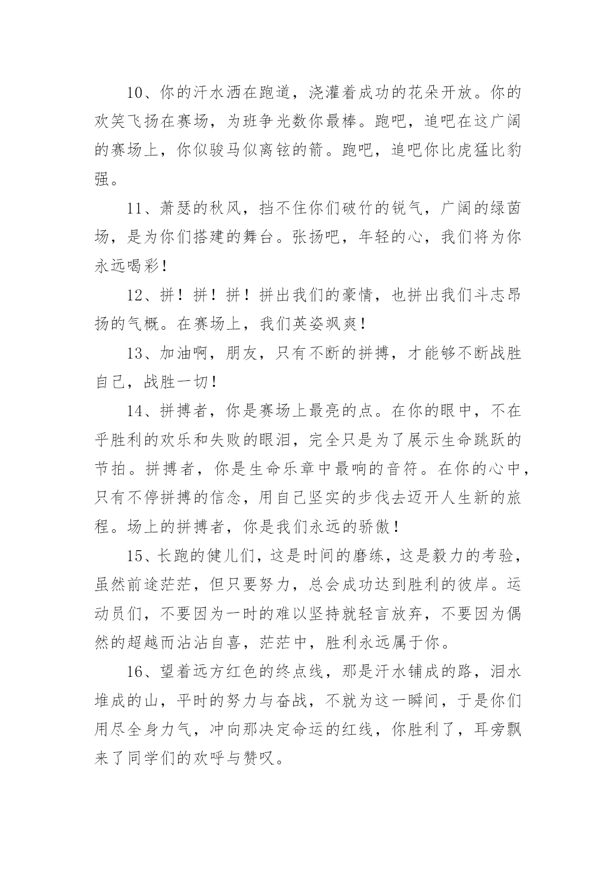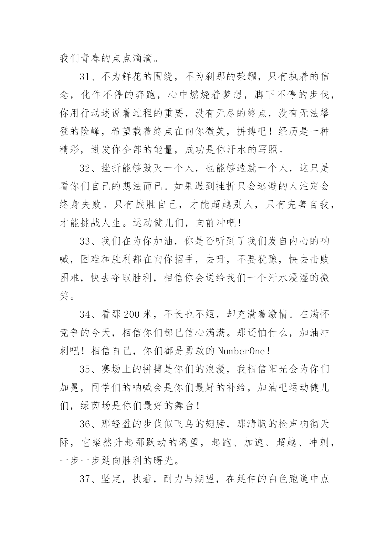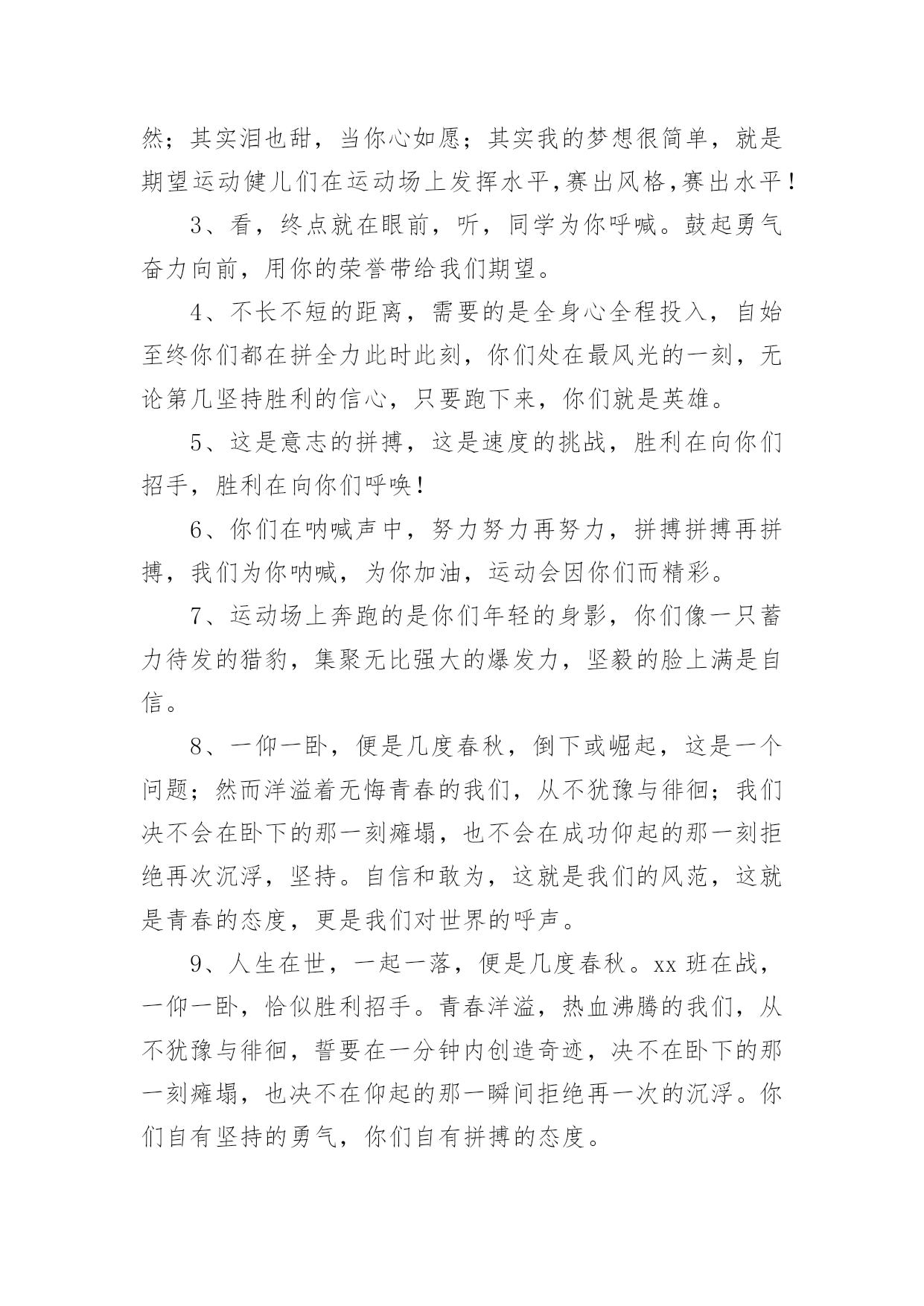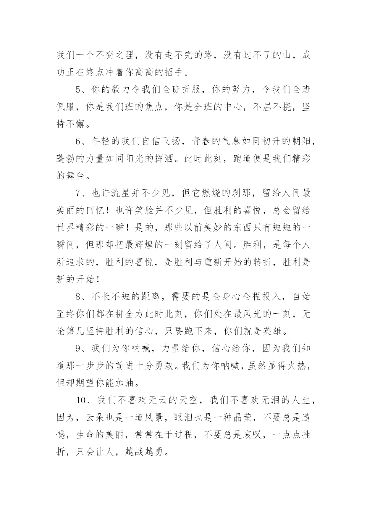 运动会加油稿运动会加油稿在生活中,很多地方都会使用到加油稿,借助加油稿可以点燃对方的激情,激发对方的斗志。还是对加油稿一筹莫展吗?下面是小编为大家收集的运动会加油稿,欢迎阅读,希望大家能够喜欢。运动会加油稿1磨练的是非凡的毅力,较量的是超常的体力,拚搏的是出类拔萃的耐力,把长长的跑道跑成一段漫漫的征程。听,呼啸的风在为你喝彩;看,猎猎的彩旗在为你加油!加油吧,为了那辉煌的一瞬间!为你们骄傲,为你们喝彩。运动场上有你们的步伐,那是辛苦汗水的抒发,你就像天边的云端,有彩霞的绚丽色彩。奔驰的骏马,飞奔的步伐让你的胜利在前方等待。为你们祝福,为你们喝彩!1500米不算长,人生贵在拼一场。健儿奔跑比健康,同龄同路谁最强!风采撒满跑道上,赛场佳绩美名扬!起跑线上你们一字排开健美的肌肉蕴含着爆发力量坚定的目光中充满了自信枪响了。你们开始了并不长的征程笔直的跑道上有你们稳健的足迹不远的终点,将留下你们冲刺时矫捷的背影,加油吧!掌声将为你响起!加油吧!胜利和鲜花终将属于你们。如海上的浪花,似浪花上的云燕。灵巧的速跑,轻轻的一跃,落下的是小小的横竿,升起的是不屈的信念。柳树抽出新芽,怎能忘了春风的吹拂?小草钻出泥土,怎能忘了春雨的滋润?花儿绽开美丽笑脸,怎能忘了太阳爱抚?孩子们的成长更不能忘记老师的培养。今天,我们成绩的取得,怎能忘记您,公正无私的裁判员老师广播里听不到您的声音,领奖台前看不到您的身影,您说:“这是应该的”。但是,如果没有您的认真和公正、严谨与洒脱,就不会有那么多成功的喜悦,也不会有那么多凯旋而归。您,才是真正的奉献者,相信经您之手,会有更多的胜利者涌现出来,才会有更多的冠军向我们走来。全体同学忠心的道一声:"老师,你辛苦了!"运动会加油稿21、一根小小的木棒,连接的是团结和友爱;一根小小的木棒,传递的是勇气和力量;一根小小的木棒,演绎的是奋斗和拼搏;加油吧!2、天空中有道彩虹,它在雨后的天空中美丽夺目,生命中也有一道彩虹,那就是运动,它让生命丰富多彩。充满了生机青春的我们,青春的生命,青春的运动!3、踏着春天的气息,迈着轻盈的脚步,我们迎来了心仪已久的运动会。那里就是展示自我的舞台。我们向往高山的坚忍不拔,我们渴望大海的博大精深。4、心中坚定的信念,脚下沉稳的步伐,你用行动告诉我们一个不变之理,没有走不完的路,没有过不了的山,成功正在终点冲着你高高的招手。5、你的毅力令我们全班折服,你的努力,令我们全班佩服,你是我们班的焦点,你是全班的中心,不屈不挠,坚持不懈。6、年轻的我们自信飞扬,青春的气息如同初升的朝阳,蓬勃的力量如同阳光的挥洒。此时此刻,跑道便是我们精彩的舞台。7、也许流星并不少见,但它燃烧的刹那,留给人间最美丽的回忆!也许笑脸并不少见,但胜利的喜悦,总会留给世界精彩的一瞬!是的,那些以前美妙的东西只有短短的一瞬间,但那却把最辉煌的一刻留给了人间。胜利,是每个人所追求的,胜利的喜悦,是胜利与重新开始的转折,胜利是新的开始!8、不长不短的距离,需要的是全身心全程投入,自始至终你们都在拼全力此时此刻,你们处在最风光的一刻,无论第几坚持胜利的信心,只要跑下来,你们就是英雄。9、我们为你呐喊,力量给你,信心给你,因为我们知道那一步步的前进十分勇敢。我们为你呐喊,虽然显得火热,但却期望你能加油。10、我们不喜欢无云的天空,我们不喜欢无泪的人生,因为,云朵也是一道风景,眼泪也是一种晶莹,不要总是遗憾,生命的美丽,常常在于过程,不要总是哀叹,一点点挫折,只会让人,越战越勇。运动会加油稿3你和红色的地面有个约定,那上方,总有你奔跑的身影;你与绿色的草坪有个约定,那上方,浸着你辛劳的汗渍。你与我们有个约定,说你必须要赢,也必须会赢。你喊着跑着,迈开大步,跨过世纪。我们相信你——某某某。你是否感到,烈日的照射,那是烈日对你的祝福;你是否感到,彩旗的摇摆,那是彩旗对你的呐喊;你是否感到人们的注视,那是人们对你的希望,祝福在你身边,呐喊在你耳边,希望在你心中。xx的健儿,愿你们一展雄风,勇夺桂冠!枪声响起,轻轻的一抬脚,便牵动了全场的目光,潇洒的挥挥手,便满足了那一份无言的等待。迎着朝阳,你们踏歌而去,背着希望,我们等待你们的归来。阳光不会永远灿烂,没有一成不变的幸福,磨难或许是上苍赐予我们的礼物,用来考验我们的意志,如果是这样,就让我们微笑着面对生活。你是体育宝座上的一颗灿烂夺目的珍珠,你是在蓝天中展翅飞翔的雏鹰。不要怕失败,不要怕冷落,无论何时,我们以你为荣。运动会加油稿41、你用坚实的臂膀,撑起了一片天,你用坚实的臂膀,撑起了班级的荣耀,你用坚实的臂膀撑起了我们坚定的信念,在战场前告诉我们坚强坚强,祝你成功,加油!2、其实天很蓝,阴云总要散;其实梦很浅,万物皆自然;其实泪也甜,当你心如愿;其实我的梦想很简单,就是期望运动健儿们在运动场