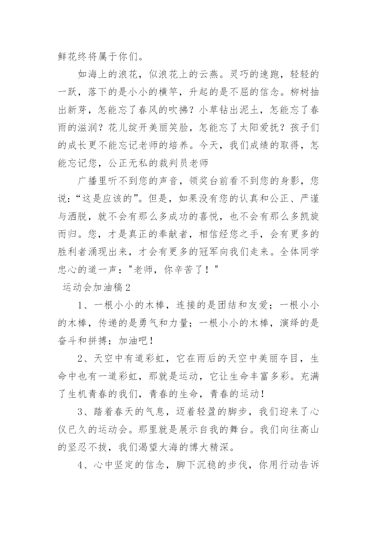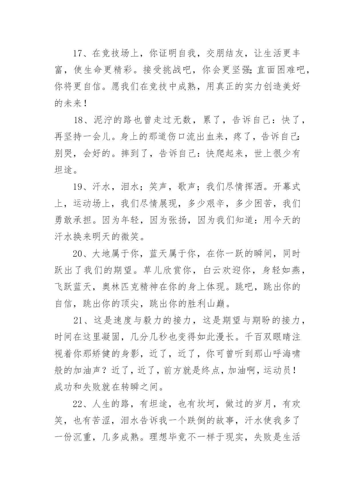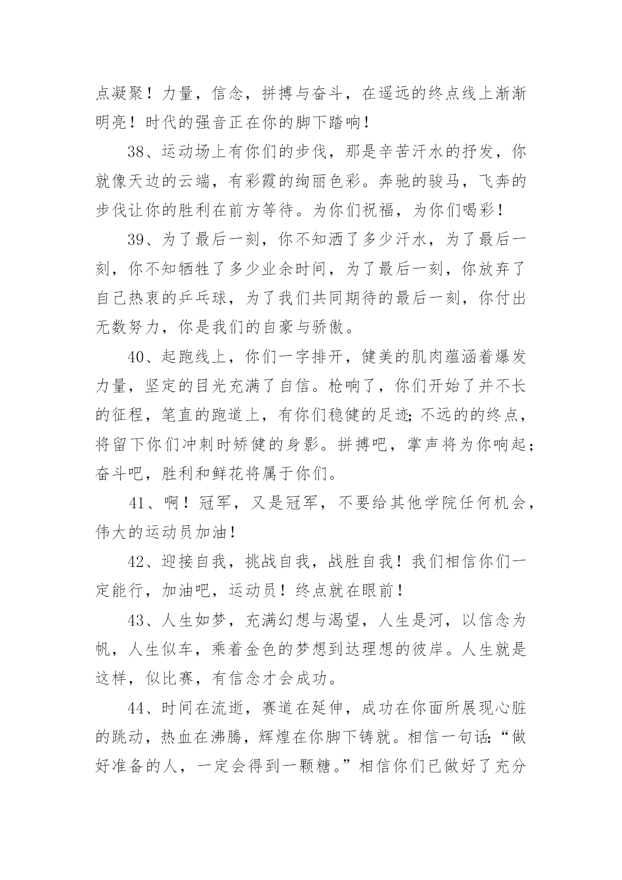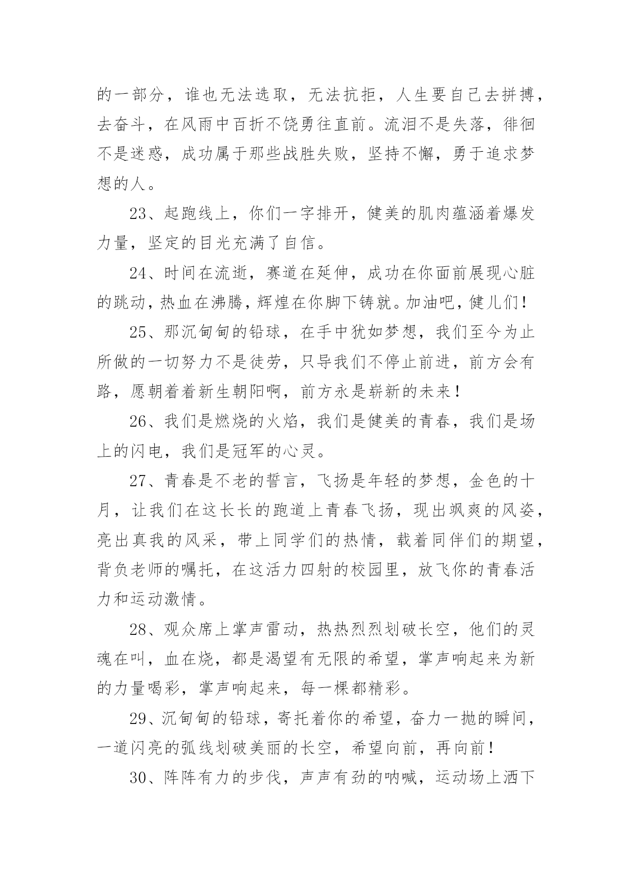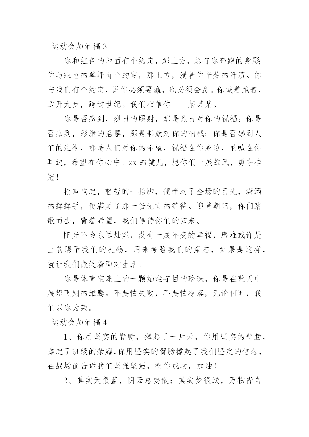 运动会加油稿运动会加油稿在生活中,很多地方都会使用到加油稿,借助加油稿可以点燃对方的激情,激发对方的斗志。还是对加油稿一筹莫展吗?下面是小编为大家收集的运动会加油稿,欢迎阅读,希望大家能够喜欢。运动会加油稿1磨练的是非凡的毅力,较量的是超常的体力,拚搏的是出类拔萃的耐力,把长长的跑道跑成一段漫漫的征程。听,呼啸的风在为你喝彩;看,猎猎的彩旗在为你加油!加油吧,为了那辉煌的一瞬间!为你们骄傲,为你们喝彩。运动场上有你们的步伐,那是辛苦汗水的抒发,你就像天边的云端,有彩霞的绚丽色彩。奔驰的骏马,飞奔的步伐让你的胜利在前方等待。为你们祝福,为你们喝彩!1500米不算长,人生贵在拼一场。健儿奔跑比健康,同龄同路谁最强!风采撒满跑道上,赛场佳绩美名扬!起跑线上你们一字排开健美的肌肉蕴含着爆发力量坚定的目光中充满了自信枪响了。你们开始了并不长的征程笔直的跑道上有你们稳健的足迹不远的终点,将留下你们冲刺时矫捷的背影,加油吧!掌声将为你响起!加油吧!胜利和鲜花终将属于你们。如海上的浪花,似浪花上的云燕。灵巧的速跑,轻轻的一跃,落下的是小小的横竿,升起的是不屈的信念。柳树抽出新芽,怎能忘了春风的吹拂?小草钻出泥土,怎能忘了春雨的滋润?花儿绽开美丽笑脸,怎能忘了太阳爱抚?孩子们的成长更不能忘记老师的培养。今天,我们成绩的取得,怎能忘记您,公正无私的裁判员老师广播里听不到您的声音,领奖台前看不到您的身影,您说:“这是应该的”。但是,如果没有您的认真和公正、严谨与洒脱,就不会有那么多成功的喜悦,也不会有那么多凯旋而归。您,才是真正的奉献者,相信经您之手,会有更多的胜利者涌现出来,才会有更多的冠军向我们走来。全体同学忠心的道一声:"老师,你辛苦了!"运动会加油稿21、一根小小的木棒,连接的是团结和友爱;一根小小的木棒,传递的是勇气和力量;一根小小的木棒,演绎的是奋斗和拼搏;加油吧!2、天空中有道彩虹,它在雨后的天空中美丽夺目,生命中也有一道彩虹,那就是运动,它让生命丰富多彩。充满了生机青春的我们,青春的生命,青春的运动!3、踏着春天的气息,迈着轻盈的脚步,我们迎来了心仪已久的运动会。那里就是展示自我的舞台。我们向往高山的坚忍不拔,我们渴望大海的博大精深。4、心中坚定的信念,脚下沉稳的步伐,你用行动告诉我们一个不变之理,没有走不完的路,没有过不了的山,成功正在终点冲着你高高的招手。5、你的毅力令我们全班折服,你的努力,令我们全班佩服,你是我们班的焦点,你是全班的中心,不屈不挠,坚持不懈。6、年轻的我们自信飞扬,青春的气息如同初升的朝阳,蓬勃的力量如同阳光的挥洒。此时此刻,跑道便是我们精彩的舞台。7、也许流星并不少见,但它燃烧的刹那,留给人间最美丽的回忆!也许笑脸并不少见,但胜利的喜悦,总会留给世界精彩的一瞬!是的,那些以前美妙的东西只有短短的一瞬间,但那却把最辉煌的一刻留给了人间。胜利,是每个人所追求的,胜利的喜悦,是胜利与重新开始的转折,胜利是新的开始!8、不长不短的距离,需要的是全身心全程投入,自始至终你们都在拼全力此时此刻,你们处在最风光的一刻,无论第几坚持胜利的信心,只要跑下来,你们就是英雄。9、我们为你呐喊,力量给你,信心给你,因为我们知道那一步步的前进十分勇敢。我们为你呐喊,虽然显得火热,但却期望你能加油。10、我们不喜欢无云的天空,我们不喜欢无泪的人生,因为,云朵也是一道风景,眼泪也是一种晶莹,不要总是遗憾,生命的美丽,常常在于过程,不要总是哀叹,一点点挫折,只会让人,越战越勇。运动会加油稿3你和红色的地面有个约定,那上方,总有你奔跑的身影;你与绿色的草坪有个约定,那上方,浸着你辛劳的汗渍。你与我们有个约定,说你必须要赢,也必须会赢。你喊着跑着,迈开大步,跨过世纪。我们相信你——某某某。你是否感到,烈日的照射,那是烈日对你的祝福;你是否感到,彩旗的摇摆,那是彩旗对你的呐喊;你是否感到人们的注视,那是人们对你的希望,祝福在你身边,呐喊在你耳边,希望在你心中。xx的健儿,愿你们一展雄风,勇夺桂冠!枪声响起,轻轻的一抬脚,便牵动了全场的目光,潇洒的挥挥手,便满足了那一份无言的等待。迎着朝阳,你们踏歌而去,背着希望,我们等待你们的归来。阳光不会永远灿烂,没有一成不变的幸福,磨难或许是上苍赐予我们的礼物,用来考验我们的意志,如果是这样,就让我们微笑着面对生活。你是体育宝座上的一颗灿烂夺目的珍珠,你是在蓝天中展翅飞翔的雏鹰。不要怕失败,不要怕冷落,无论何时,我们以你为荣。运动会加油稿41、你用坚实的臂膀,撑起了一片天,你用坚实的臂膀,撑起了班级的荣耀,你用坚实的臂膀撑起了我们坚定的信念,在战场前告诉我们坚强坚强,祝你成功,加油!2、其实天很蓝,阴云总要散;其实梦很浅,万物皆自然;其实泪也甜,当你心如愿;其实我的梦想很简单,就是期望运动健儿们在运动场