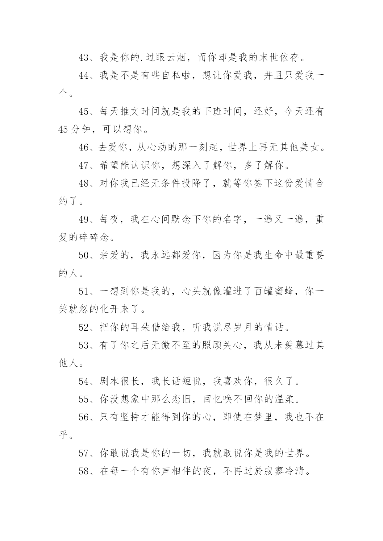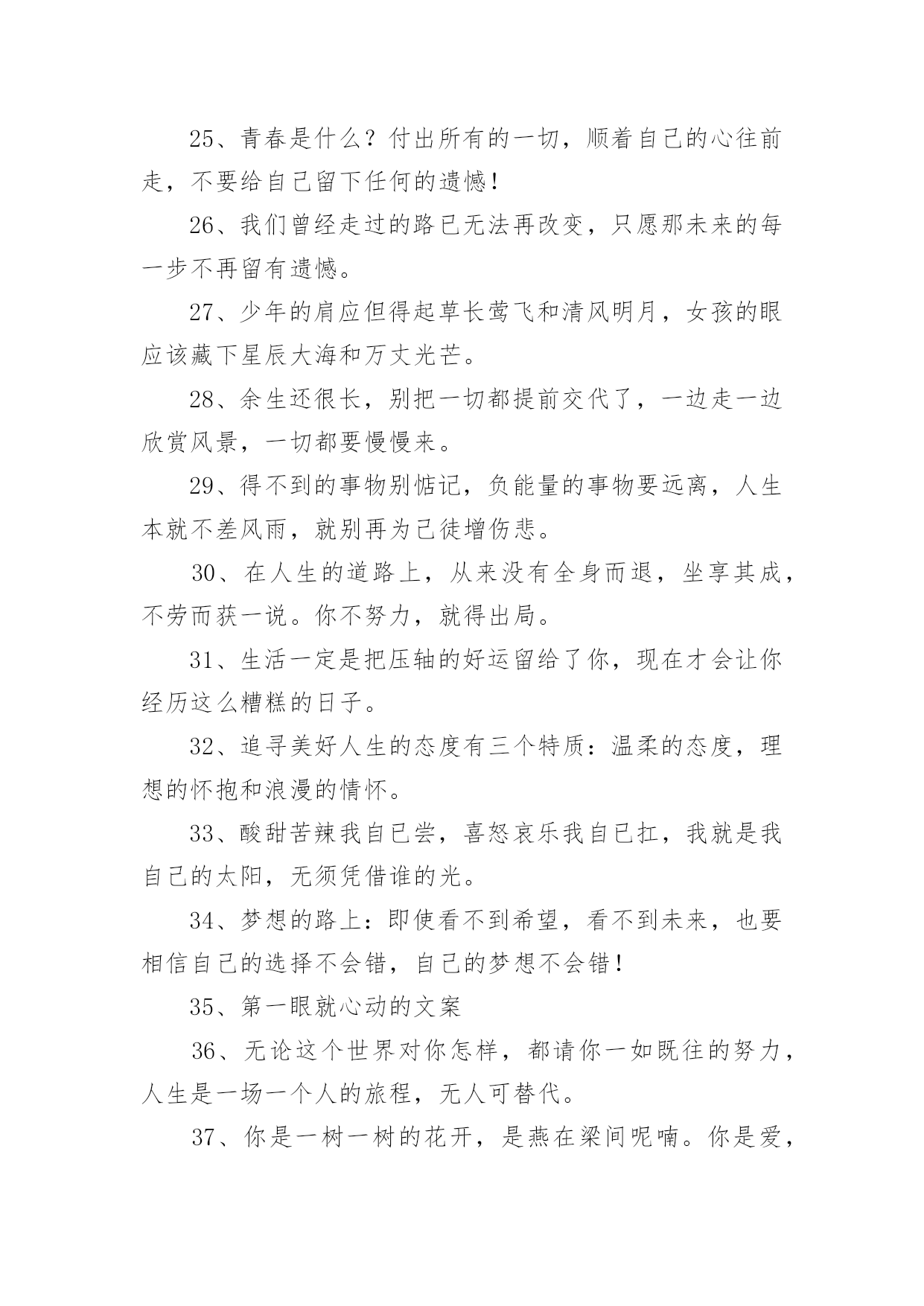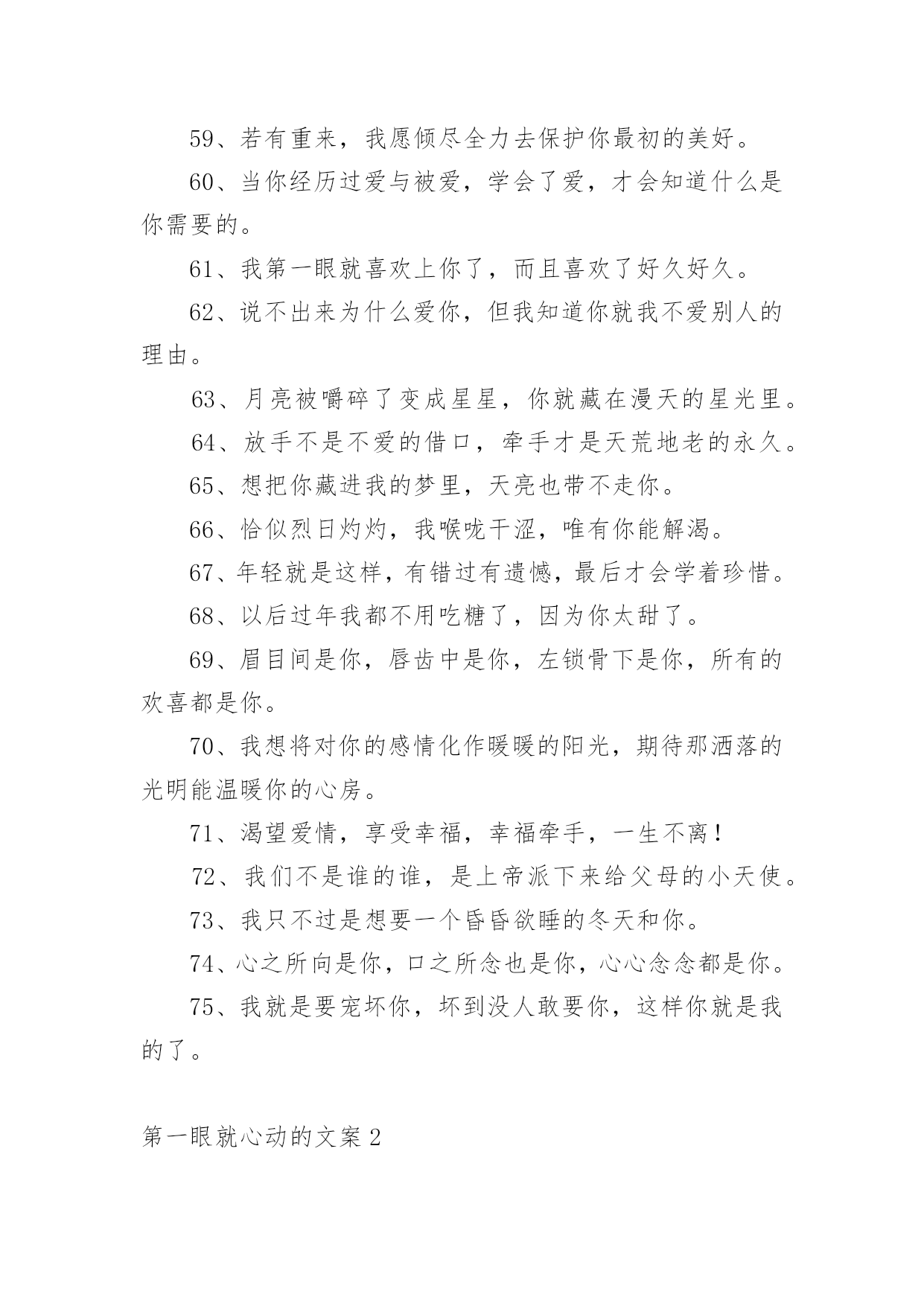 第一眼就心动的文案第一眼就心动的文案【集合15篇】在日常学习、工作或生活中,越来越多人钟情于发布文案,文案用以分享生活日常和自己的感悟。还在苦苦寻找优秀经典的文案吗?下面是小编整理的第一眼就心动的文案,希望对大家有所帮助。第一眼就心动的文案11、第一眼就心动的文案2、比起征服欧洲大陆,我更想征服的是你的心。3、我要成为你的夜晚,也要成为你的早晨。4、你给我一个承诺,我就傻傻的在这里,再也不肯走了!5、真的好喜欢你啊,像从有风的深秋晚上。6、你是我洗澡时都要擦擦手回复消息的人,怎么会舍得不喜欢你呢。7、你永远看不到我孤独的样子,因为,只有你不在我身边时我才最孤独。8、你知道人类为啥要结婚吗?不知道。那我们一起来研究一下吧。9、我贪恋的人间烟火,不偏不倚,恰好是你。10、因为你的笑,刺眼的阳光变得温柔了许多。11、我愿意,就这样一辈子都守在你的身边,因为我是如此的爱你。12、我希望在我们以后的生活中,都因为拥有彼此而快乐无边。13、人生就是一幕戏,每个人都是主角,每天都是现场直播。14、你千万不能一个人在晚上走路,只要有我在,我就会陪你一起!15、如果时光可以倒流,我希望我们相识在小时候。16、师傅说酒肉穿肠过,佛祖心中留,请问姑娘,你是佛祖吗?17、其实一直关心你的人就在你身边,你没发现吗?18、我不关心人类,不关心任何事,我只关心你。19、以至于在初见你的那一刻,心就倾向了你。20、我的爱人,我对你的爱,已融入到了我的血液。21、我的眼里只有你,再也容不下别人,自从遇见你,一切繁华都成为了背景。22、就算最后你一无所有,我选择你是不变的理由。23、给你写的信我寄给月亮了,它那里没有氧,我可以爱你几亿年。24、人家都说强撩死得快,那麻溜给我一块墓地吧,就是要强撩你。25、也谈不上是有多爱你,只是每次醉酒都会很想你。26、再累,再苦,再疼,也只是为了你能够喜欢我而已。27、我的一生可以喜欢很多人,却偏偏一开始就爱上了你。28、有时候占据我们心里最多空间的,往往是那些不愿遗忘的回忆。29、世界上最动心的话不是我爱你,而是你的肿瘤是良性的。30、我想你应该很忙吧!那你只看前面三个字就好了。31、爱是初次见面时的怦然心动,天长日久的两不相厌。32、睡前吻你,半夜抱你,醒来有你,这才是最完整的一天。33、我要的,只是简单而安稳的生活,最好的幸福,是你给的在乎。34、世界上怎么会有,我想见你,这种人间疾苦。35、这个世界上除了你,没有什么是我放不下的。36、如果你的选择是地狱尽头,让我陪你一起堕落。37、就算我们没有约定好就遇到,也应该笑脸相迎。38、你身上干净耀眼的少年气,晴朗了我少女时代的所有,所有的雨季。39、为了你,我拒绝了所有的学校。只为这个夏天的那一声好巧。40、我的生命是一条直线,转弯,是为了遇见你。41、我生来就是宝贝,这句话没有什么不妥,也不接受反驳。42、原来只要是分开了的人,不论原来多么熟悉,也会慢慢变得疏远。43、我是你的.过眼云烟,而你却是我的末世依存。44、我是不是有些自私啦,想让你爱我,并且只爱我一个。45、每天推文时间就是我的下班时间,还好,今天还有45分钟,可以想你。46、去爱你,从心动的那一刻起,世界上再无其他美女。47、希望能认识你,想深入了解你,多了解你。48、对你我已经无条件投降了,就等你签下这份爱情合约了。49、每夜,我在心间默念下你的名字,一遍又一遍,重复的碎碎念。50、亲爱的,我永远都爱你,因为你是我生命中最重要的人。51、一想到你是我的,心头就像灌进了百罐蜜蜂,你一笑就忽的化开来了。52、把你的耳朵借给我,听我说尽岁月的情话。53、有了你之后无微不至的照顾关心,我从未羡慕过其他人。54、剧本很长,我长话短说,我喜欢你,很久了。55、你没想象中那么恋旧,回忆唤不回你的温柔。56、只有坚持才能得到你的心,即使在梦里,我也不在乎。57、你敢说我是你的一切,我就敢说你是我的世界。58、在每一个有你声相伴的夜,不再过於寂寥冷清。59、若有重来,我愿倾尽全力去保护你最初的美好。60、当你经历过爱与被爱,学会了爱,才会知道什么是你需要的。61、我第一眼就喜欢上你了,而且喜欢了好久好久。62、说不出来为什么爱你,但我知道你就我不爱别人的理由。63、月亮被嚼碎了变成星星,你就藏在漫天的星光里。64、放手不是不爱的借口,牵手才是天荒地老的永久。65、想把你藏进我的梦里,天亮也带不走你。66、恰似烈日灼灼,我喉咙干涩,唯有你能解渴。67、年轻就是这样,有错过有遗憾,最后才会学着珍惜。68、以后过年我都不用吃糖了,因为你太甜了。69、眉目间是你,唇齿中是你,左锁骨下是你,所有的欢喜都是你。70、我想将对你的感情化作暖暖的阳光,期待那洒落的光明能温暖你的心房。71、渴望爱情,享受幸福,幸福牵手,一生不离!72、我
