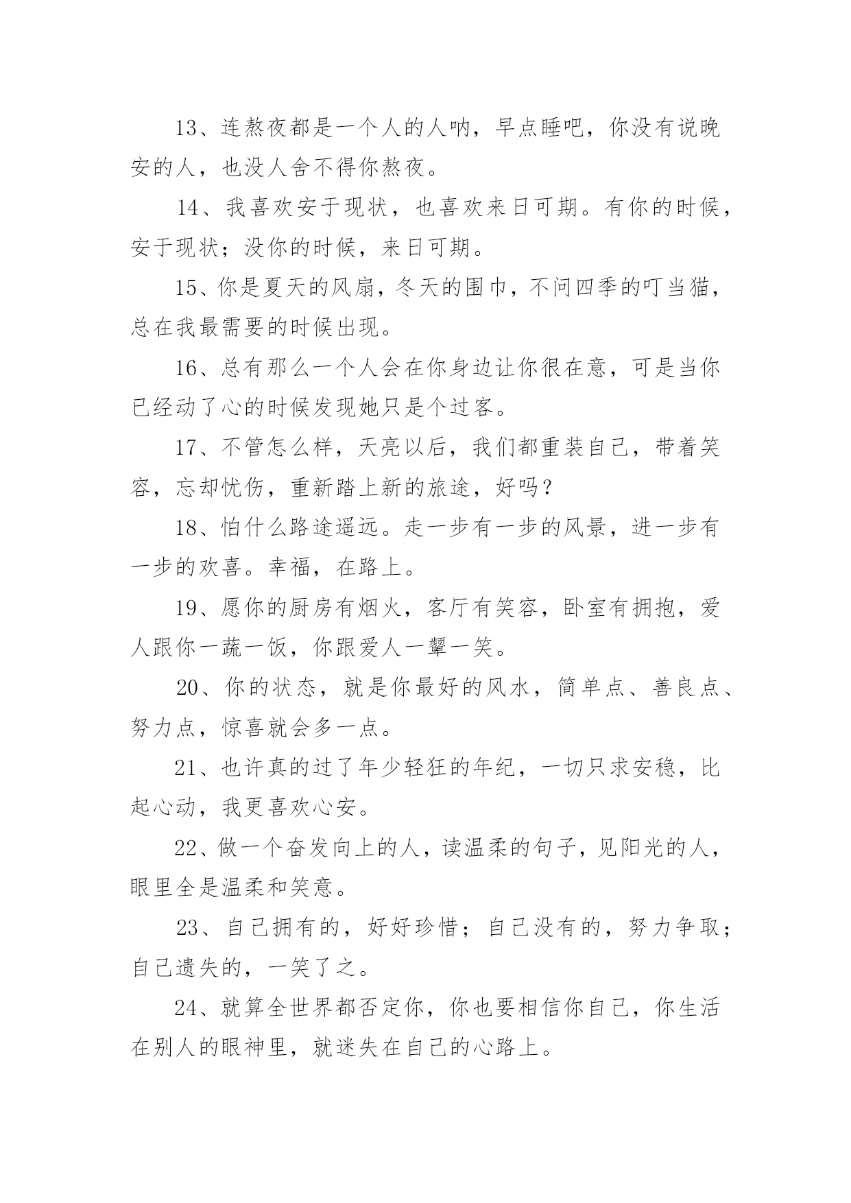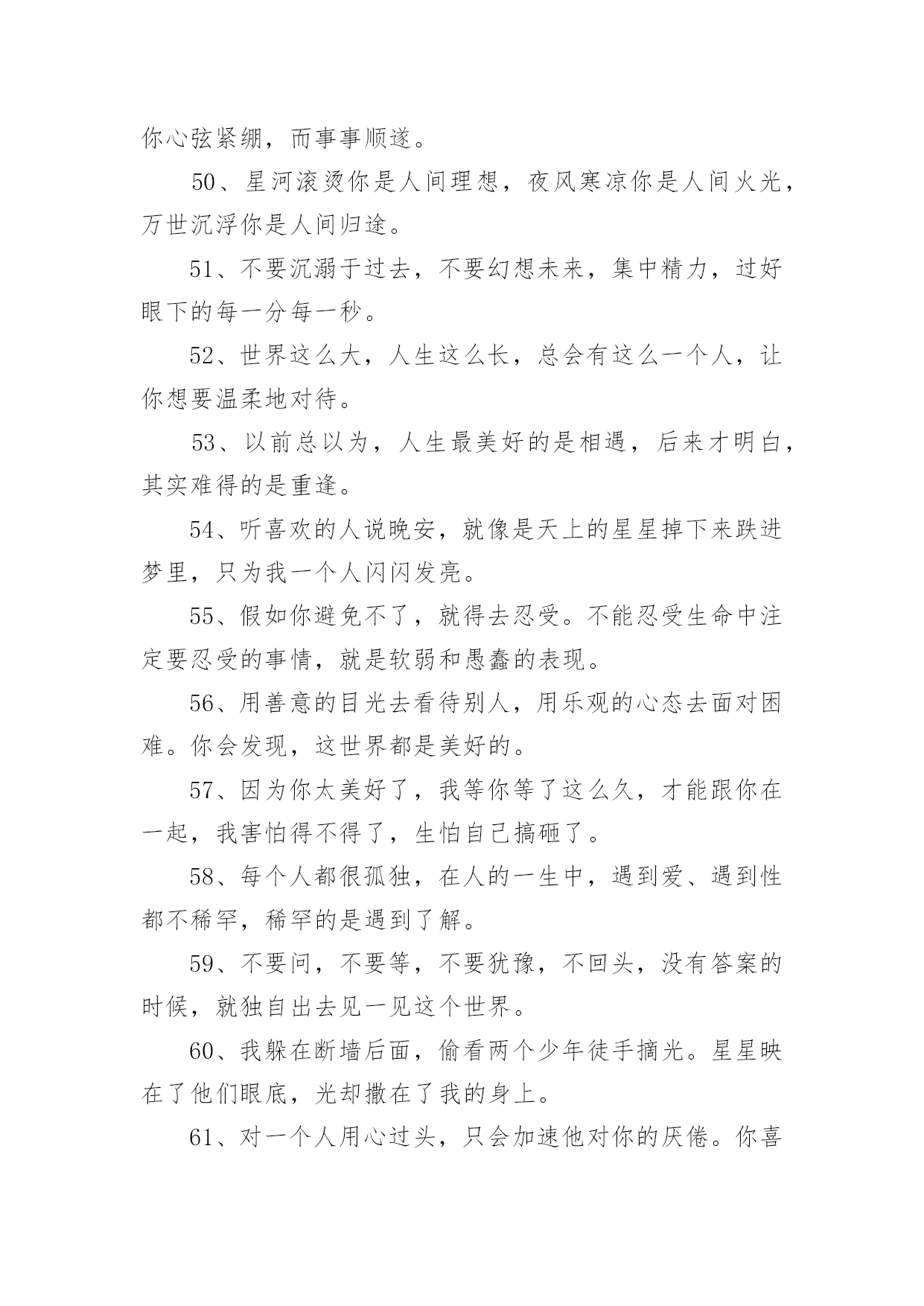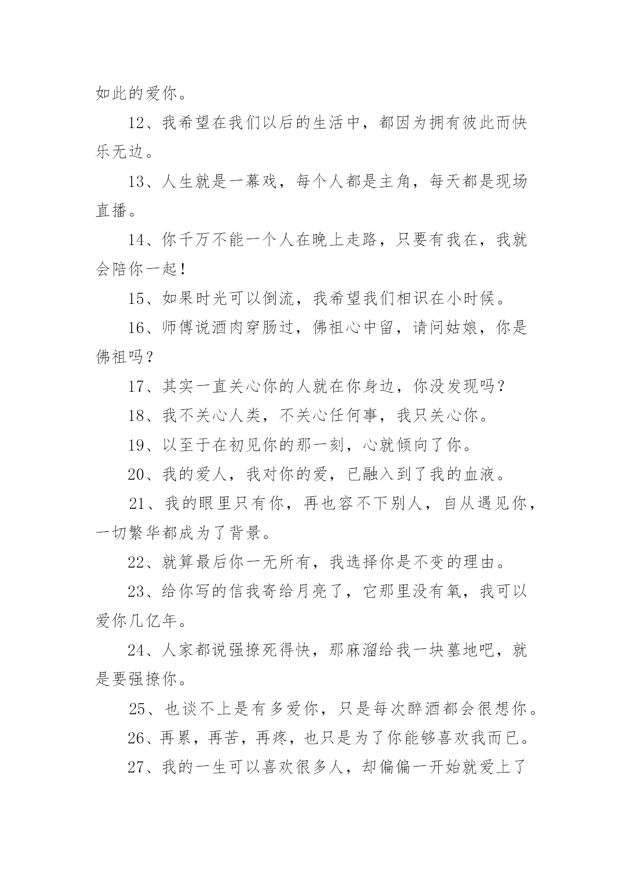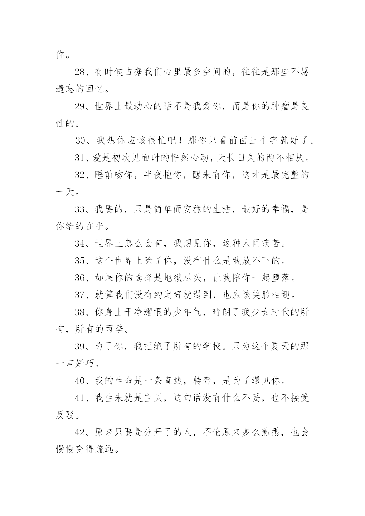 第一眼就心动的文案第一眼就心动的文案【集合15篇】在日常学习、工作或生活中,越来越多人钟情于发布文案,文案用以分享生活日常和自己的感悟。还在苦苦寻找优秀经典的文案吗?下面是小编整理的第一眼就心动的文案,希望对大家有所帮助。第一眼就心动的文案11、第一眼就心动的文案2、比起征服欧洲大陆,我更想征服的是你的心。3、我要成为你的夜晚,也要成为你的早晨。4、你给我一个承诺,我就傻傻的在这里,再也不肯走了!5、真的好喜欢你啊,像从有风的深秋晚上。6、你是我洗澡时都要擦擦手回复消息的人,怎么会舍得不喜欢你呢。7、你永远看不到我孤独的样子,因为,只有你不在我身边时我才最孤独。8、你知道人类为啥要结婚吗?不知道。那我们一起来研究一下吧。9、我贪恋的人间烟火,不偏不倚,恰好是你。10、因为你的笑,刺眼的阳光变得温柔了许多。11、我愿意,就这样一辈子都守在你的身边,因为我是如此的爱你。12、我希望在我们以后的生活中,都因为拥有彼此而快乐无边。13、人生就是一幕戏,每个人都是主角,每天都是现场直播。14、你千万不能一个人在晚上走路,只要有我在,我就会陪你一起!15、如果时光可以倒流,我希望我们相识在小时候。16、师傅说酒肉穿肠过,佛祖心中留,请问姑娘,你是佛祖吗?17、其实一直关心你的人就在你身边,你没发现吗?18、我不关心人类,不关心任何事,我只关心你。19、以至于在初见你的那一刻,心就倾向了你。20、我的爱人,我对你的爱,已融入到了我的血液。21、我的眼里只有你,再也容不下别人,自从遇见你,一切繁华都成为了背景。22、就算最后你一无所有,我选择你是不变的理由。23、给你写的信我寄给月亮了,它那里没有氧,我可以爱你几亿年。24、人家都说强撩死得快,那麻溜给我一块墓地吧,就是要强撩你。25、也谈不上是有多爱你,只是每次醉酒都会很想你。26、再累,再苦,再疼,也只是为了你能够喜欢我而已。27、我的一生可以喜欢很多人,却偏偏一开始就爱上了你。28、有时候占据我们心里最多空间的,往往是那些不愿遗忘的回忆。29、世界上最动心的话不是我爱你,而是你的肿瘤是良性的。30、我想你应该很忙吧!那你只看前面三个字就好了。31、爱是初次见面时的怦然心动,天长日久的两不相厌。32、睡前吻你,半夜抱你,醒来有你,这才是最完整的一天。33、我要的,只是简单而安稳的生活,最好的幸福,是你给的在乎。34、世界上怎么会有,我想见你,这种人间疾苦。35、这个世界上除了你,没有什么是我放不下的。36、如果你的选择是地狱尽头,让我陪你一起堕落。37、就算我们没有约定好就遇到,也应该笑脸相迎。38、你身上干净耀眼的少年气,晴朗了我少女时代的所有,所有的雨季。39、为了你,我拒绝了所有的学校。只为这个夏天的那一声好巧。40、我的生命是一条直线,转弯,是为了遇见你。41、我生来就是宝贝,这句话没有什么不妥,也不接受反驳。42、原来只要是分开了的人,不论原来多么熟悉,也会慢慢变得疏远。43、我是你的.过眼云烟,而你却是我的末世依存。44、我是不是有些自私啦,想让你爱我,并且只爱我一个。45、每天推文时间就是我的下班时间,还好,今天还有45分钟,可以想你。46、去爱你,从心动的那一刻起,世界上再无其他美女。47、希望能认识你,想深入了解你,多了解你。48、对你我已经无条件投降了,就等你签下这份爱情合约了。49、每夜,我在心间默念下你的名字,一遍又一遍,重复的碎碎念。50、亲爱的,我永远都爱你,因为你是我生命中最重要的人。51、一想到你是我的,心头就像灌进了百罐蜜蜂,你一笑就忽的化开来了。52、把你的耳朵借给我,听我说尽岁月的情话。53、有了你之后无微不至的照顾关心,我从未羡慕过其他人。54、剧本很长,我长话短说,我喜欢你,很久了。55、你没想象中那么恋旧,回忆唤不回你的温柔。56、只有坚持才能得到你的心,即使在梦里,我也不在乎。57、你敢说我是你的一切,我就敢说你是我的世界。58、在每一个有你声相伴的夜,不再过於寂寥冷清。59、若有重来,我愿倾尽全力去保护你最初的美好。60、当你经历过爱与被爱,学会了爱,才会知道什么是你需要的。61、我第一眼就喜欢上你了,而且喜欢了好久好久。62、说不出来为什么爱你,但我知道你就我不爱别人的理由。63、月亮被嚼碎了变成星星,你就藏在漫天的星光里。64、放手不是不爱的借口,牵手才是天荒地老的永久。65、想把你藏进我的梦里,天亮也带不走你。66、恰似烈日灼灼,我喉咙干涩,唯有你能解渴。67、年轻就是这样,有错过有遗憾,最后才会学着珍惜。68、以后过年我都不用吃糖了,因为你太甜了。69、眉目间是你,唇齿中是你,左锁骨下是你,所有的欢喜都是你。70、我想将对你的感情化作暖暖的阳光,期待那洒落的光明能温暖你的心房。71、渴望爱情,享受幸福,幸福牵手,一生不离!72、我