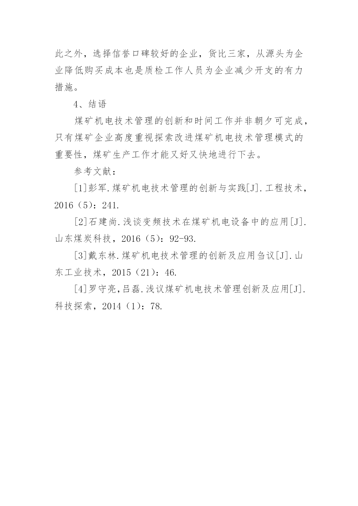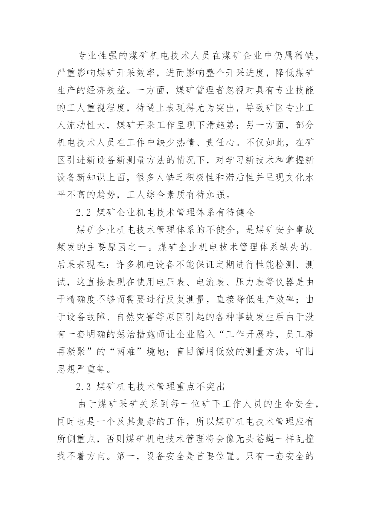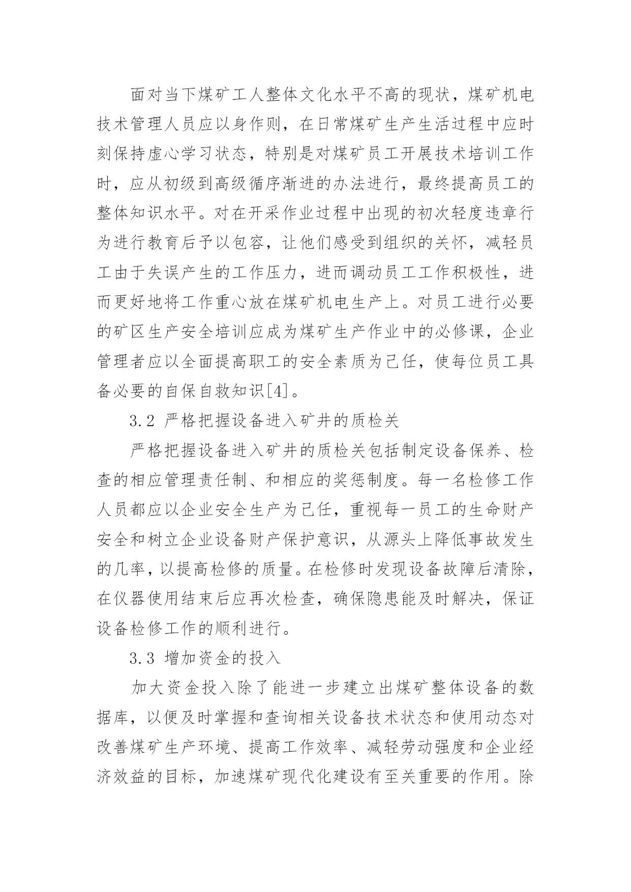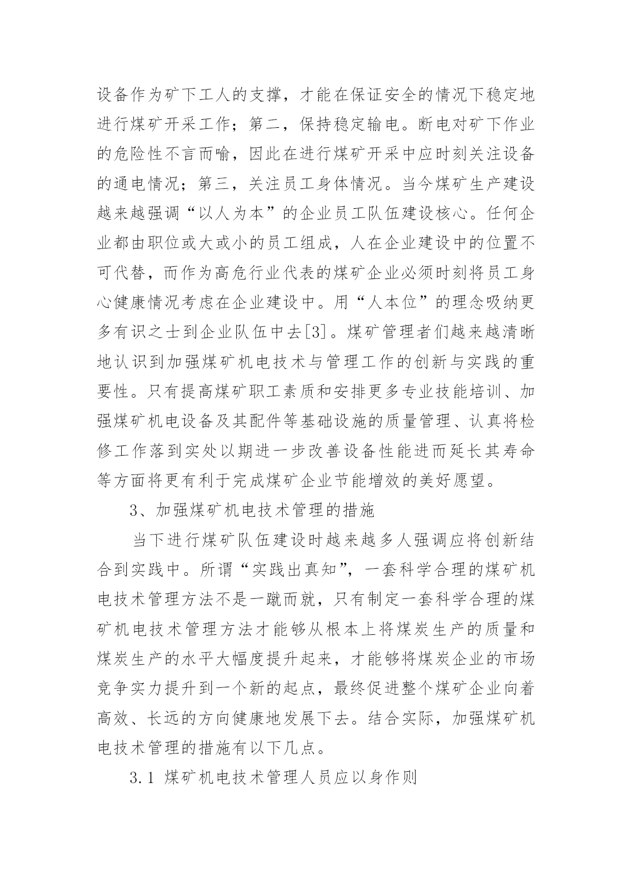 煤矿机电技术管理创新与实践论文煤矿机电技术管理创新与实践论文摘要:基于我国煤矿机电技术管理概念,结合目前煤矿机电技术管理的创新与实践的实际情况,探讨了煤矿企业机电管理中存在的问题,并为煤矿机电技术管理的创新与实践提出建议,期望对煤矿生产企业稳定健康发展有所帮助。关键词:机电技术;管理;创新应用1、煤矿机电技术管理概念简析煤矿机电技术管理是煤矿生产管理工作中的重要组成部分,煤矿机电技术管理主要负责:图纸和技术资料,机电技术的培训和考核、设备安全,设备验收、安装、使用以及维修方面的管理。如今煤炭行业间竞争激烈,而煤矿生产作业一直以来都属于高压高危行业。煤矿生产的首要任务是安全,因此在进行煤矿开采作业时,必须借助一系列的机电设备来保障生产安全及生产效率。煤矿管理者想要在众多竞争者中继续生存下去就必须要考虑对其相应的煤矿机电技术管理做出改善。煤矿管理者只有使用一套合理、规范的管理准则,用一种创新、大胆的视觉着眼未来,才能将其煤矿企业的整体竞争力提高,进而寻求到企业稳定健康发展的生存模式[1]。2、煤矿企业机电管理中存在的问题2.1具备煤矿机电设备技术专业知识的人才稀缺专业性强的煤矿机电技术人员在煤矿企业中仍属稀缺,严重影响煤矿开采效率,进而影响整个开采进度,降低煤矿生产的经济效益。一方面,煤矿管理者忽视对具有专业技能的工人重视程度,待遇上表现得尤为突出,导致矿区专业工人流动性大,煤矿开采工作呈现下滑趋势;另一方面,部分机电技术人员在工作中缺少热情、责任心。不仅如此,在矿区引进新设备新测量方法的情况下,对学习新技术和掌握新设备新知识上面,很多人缺乏积极性和滞后性并呈现文化水平不高的趋势,工人综合素质有待加强。2.2煤矿企业机电技术管理体系有待健全煤矿企业机电技术管理体系的不健全,是煤矿安全事故频发的主要原因之一。煤矿企业机电技术管理体系缺失的.后果表现在:许多机电设备不能保证定期进行性能检测、测试,这直接表现在使用电压表、电流表、压力表等仪器是由于精确度不够而需要进行反复测量,直接降低生产效率;由于设备故障、自然灾害等原因引起的各种事故发生后由于没有一套明确的惩治措施而让企业陷入“工作开展难,员工难再凝聚”的“两难”境地;盲目循用低效的测量方法,守旧思想严重等。2.3煤矿机电技术管理重点不突出由于煤矿采矿关系到每一位矿下工作人员的生命安全,同时也是一个及其复杂的工作,所以煤矿机电技术管理应有所侧重点,否则煤矿机电技术管理将会像无头苍蝇一样乱撞找不着方向。第一,设备安全是首要位置。只有一套安全的设备作为矿下工人的支撑,才能在保证安全的情况下稳定地进行煤矿开采工作;第二,保持稳定输电。断电对矿下作业的危险性不言而喻,因此在进行煤矿开采中应时刻关注设备的通电情况;第三,关注员工身体情况。当今煤矿生产建设越来越强调“以人为本”的企业员工队伍建设核心。任何企业都由职位或大或小的员工组成,人在企业建设中的位置不可代替,而作为高危行业代表的煤矿企业必须时刻将员工身心健康情况考虑在企业建设中。用“人本位”的理念吸纳更多有识之士到企业队伍中去[3]。煤矿管理者们越来越清晰地认识到加强煤矿机电技术与管理工作的创新与实践的重要性。只有提高煤矿职工素质和安排更多专业技能培训、加强煤矿机电设备及其配件等基础设施的质量管理、认真将检修工作落到实处以期进一步改善设备性能进而延长其寿命等方面将更有利于完成煤矿企业节能增效的美好愿望。3、加强煤矿机电技术管理的措施当下进行煤矿队伍建设时越来越多人强调应将创新结合到实践中。所谓“实践出真知”,一套科学合理的煤矿机电技术管理方法不是一蹴而就,只有制定一套科学合理的煤矿机电技术管理方法才能够从根本上将煤炭生产的质量和煤炭生产的水平大幅度提升起来,才能够将煤炭企业的市场竞争实力提升到一个新的起点,最终促进整个煤矿企业向着高效、长远的方向健康地发展下去。结合实际,加强煤矿机电技术管理的措施有以下几点。3.1煤矿机电技术管理人员应以身作则面对当下煤矿工人整体文化水平不高的现状,煤矿机电技术管理人员应以身作则,在日常煤矿生产生活过程中应时刻保持虚心学习状态,特别是对煤矿员工开展技术培训工作时,应从初级到高级循序渐进的办法进行,最终提高员工的整体知识水平。对在开采作业过程中出现的初次轻度违章行为进行教育后予以包容,让他们感受到组织的关怀,减轻员工由于失误产生的工作压力,进而调动员工工作积极性,进而更好地将工作重心放在煤矿机电生产上。对员工进行必要的矿区生产安全培训应成为煤矿生产作业中的必修课,企业管理者应以全面提高职工的安全素质为己任,使每位员工具备必要的自保自救知识[4]。3.2严格把握设备进入矿井的质检关严格把握设备进入矿井的质检关包括制定设备保养、检查的相应管理责任制、和相应的奖惩制度。每一名检修工作人员都应以企业安全生产为己