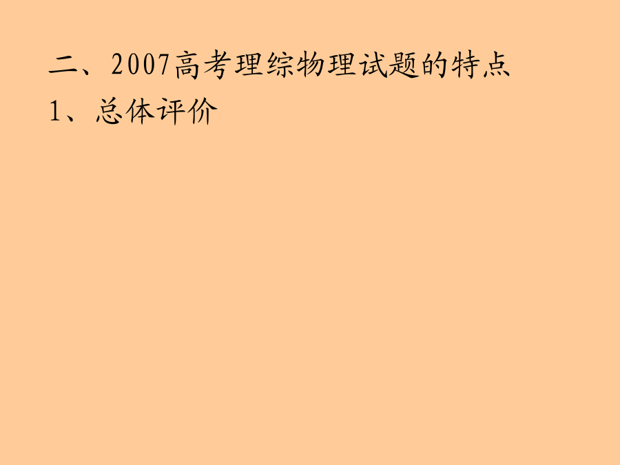 2007高考理综物理试题分析一、网上阅卷后质检工作的流程简介与传统手工阅卷的比较优势二、2007高考理综物理试题的特点(1)知识与能力层次分布(2)试题的基本特点(3)学生答题中存在的主要问题2、逐题分析14.据报道,最近在太阳系外发现了首颗“宜居”行星,其质量约为地球质量的6.4倍,一个在地球表面重量为600N的人在这个行星表面的重量将变为960N。由此可推知,该行星的半径与地球半径之比约为A.0.5B.2C.3.2D.4[答案]B[答题情况]15.一列简谐横波沿x轴负方向传播,波速v=4m/s。已知坐标原点(x=0)处质点的振动图象如图a所示,在下列4幅图中能够正确表示t=0.15s时波形的图是[答题情况]16.如图所示,质量为m的活塞将一定质量的气体封闭在气缸内,活塞与气缸之间无摩擦,a态是气缸放在冰水混合物中气体达到的平衡状态,b态是气缸从容器中移出后,在室温(27℃)中达到的平衡状态,气体从a态变化到b态的过程中大气压强保持不变。若忽略气体分子之间的势能,下列说法中正确的是A.与b态相比,a态的气体分子在单位时间内撞击活塞的个数较多B.与a态相比,b态的气体分子在单位时间内对活塞的冲量较大C.在相同时间内,a、b两态的气体分子对活塞的冲量相等D.从a态到b态,气体的内能增加,外界对气体做功,气体向外界释放了热量[答题情况]17.在桌面上有一倒立的玻璃圆锥,其顶点恰好与桌面接触,圆锥的轴(图中虚线)与桌面垂直,过轴线的截面为等边三角形,如图所示。有一半径为r的圆柱形平行光束垂直入射到圆锥的底面上,光束的中心轴与圆锥的轴重合。已知玻璃的折射率为1.5,则光束在桌面上形成的光斑半径为A.rB.1.5rC.2rD.2.5r[答题情况]18.如图所示,在倾角为30°的足够长的斜面上有一质量为的物体,它受到沿斜面方向的力F的作用.力F可按图(a)、(b)、(c)、(d)所示的四种方式随时间变化(图中纵坐标是F与mg的比值,力沿斜面向上为正)已知此物体在t=0时速度为零,若用分别表示上述四种受力情况下物体在3秒末的速率,则这四个速率中最大的是A.v1B.v2C.v3D.v4[答题情况]19.用大量具有一定能量的电子轰击大量处于基态的氢原子,观测到了一定数目的光谱线。调高电子的能量再次进行观测,发现光谱线的数目比原来增加了5条。用⊿n表示两次观测中最高激发态的量子数n之差,E表示调高后电子的能量。根据氢原子的能级图可以判断,△n和E的可能值为A.△n=1,13.22eV<E<13.32eVB.△n=2,13.22eV<E<13.32eVC.△n=1,12.75eV<E<13.06eVD.△n=2,12.72eV<E<13.06eV[答题情况]20.a、b、c、d是匀强电场中的四个点,它们正好是一个矩形的四个顶点。电场线与矩形所在平面平行。已知a点的电势为20V,b点的电势为24V,d点的电势为4V,如图。由此可知c点的电势为A.4VB.8VC.12VD.24V[答题情况]21.如图所示,LOO′L′为一折线,它所形成的两个角∠LOO′和∠OO′L′均为45°。折线的右边有一匀强磁场,其方向垂直于纸面向里。一边长为l的正方形导线框沿垂直于OO′的方向以速度作匀速直线运动,在t=0时刻恰好位于图中所示位置。以逆时针方向为导线框中电流的正方向,在下面四幅图中能够正确表示电流-时间(I-t)关系的是(时间以l/为单位)21.如图所示,LOO′L′为一折线,它所形成的两个角∠LOO′和∠OO′L′均为45°。折线的右边有一匀强磁场,其方向垂直于纸面向里。一边长为l的正方形导线框沿垂直于OO′的方向以速度作匀速直线运动,在t=0时刻恰好位于图中所示位置。以逆时针方向为导线框中电流的正方向,在下面四幅图中能够正确表示电流-时间(I-t)关系的是(时间以l/为单位)21.如图所示,LOO′L′为一折线,它所形成的两个角∠LOO′和∠OO′L′均为45°。折线的右边有一匀强磁场,其方向垂直于纸面向里。一边长为l的正方形导线框沿垂直于OO′的方向以速度作匀速直线运动,在t=0时刻恰好位于图中所示位置。以逆时针方向为导线框中电流的正方向,在下面四幅图中能够正确表示电流-时间(I-t)关系的是(时间以l/为单位)21.如图所示,LOO′L′为一折线,它所形成的两个角∠LOO′和∠OO′L′均为45°。折线的右边有一匀强磁场,其方向垂直于纸面向里。一边长为l的正方形导线框沿垂直于OO′的方向以速度作匀速直线运动,在t=0时刻恰好位于图中所示位置。以逆时针方向为导线框中电流的正方向,在下面四幅图中能够正确表示电流-时间(I-t)关系的是(时间以l/为单位)21.如图所示,LOO′L′为一折