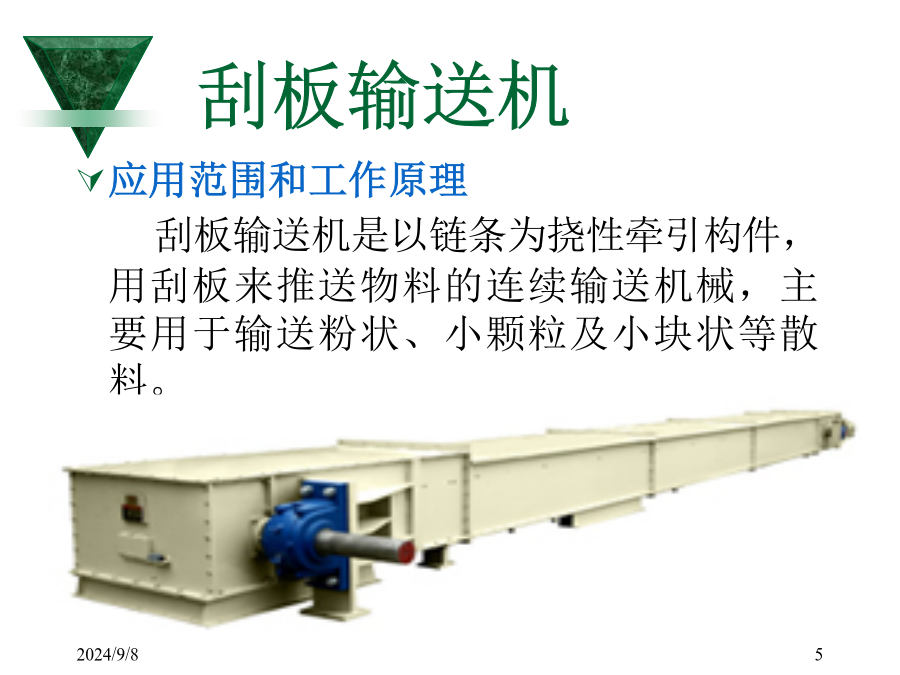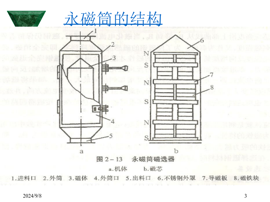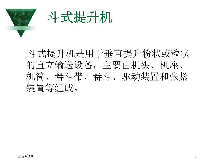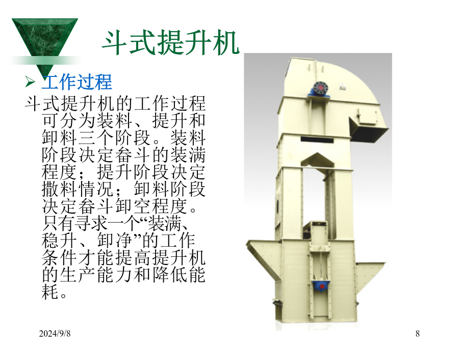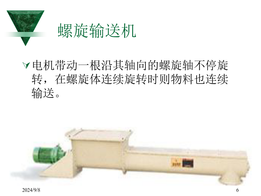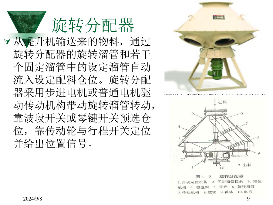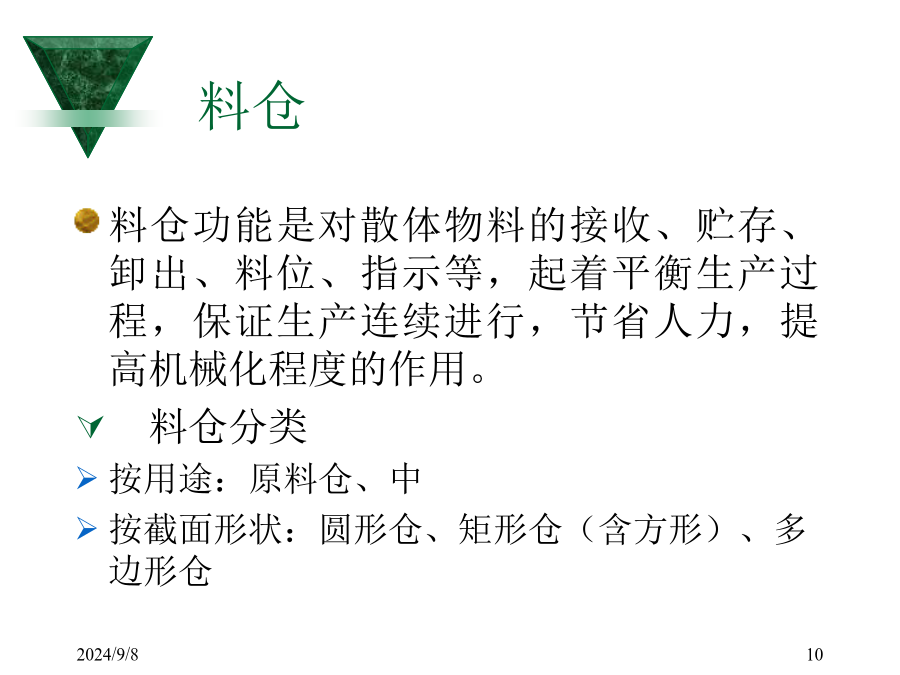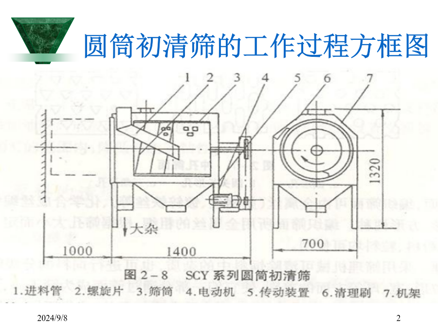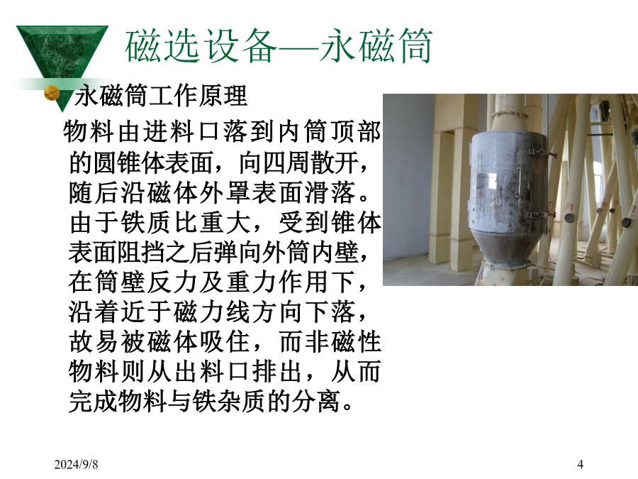 圆筒初清筛圆筒初清筛的工作过程方框图永磁筒的结构磁选设备—永磁筒刮板输送机螺旋输送机斗式提升机斗式提升机旋转分配器料仓饲料粉碎粉碎设备分类锤片式粉碎机配料系统混合设备混合机的结构超微粉碎机调节分级轮的转速和风量的大小可改变成品的粒度,降低分级轮的转速,成品粒度变粗,反之则变细。1.螺旋进料机构2.粉碎式3.分级式4.分流锥套5.粉碎盘图1粉碎机主机结构图刹克龙脉冲除尘器脉冲除尘器工作原理刹克龙通常与脉冲除尘器结合使用以达到集粉除尘的作用高方筛2024/9/8环模制粒机环模制粒机的制粒原理2024/9/8压模与压辊压模与压辊2024/9/8颗粒稳定器2024/9/8叶轮式冷却器工作原理2024/9/82024/9/8叶轮式冷却器的调整与操作破碎机破碎机分级筛图1-15回转振动分级筛1-物料进口2-可调分料淌板3-上层筛格4-下层筛格5-观察窗6-垂直吸风分离器7-净料出口8-大杂出口9-小杂出口