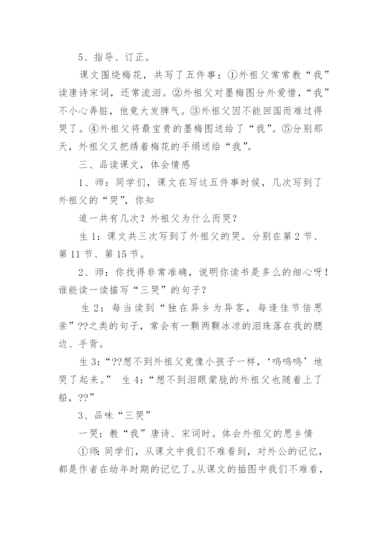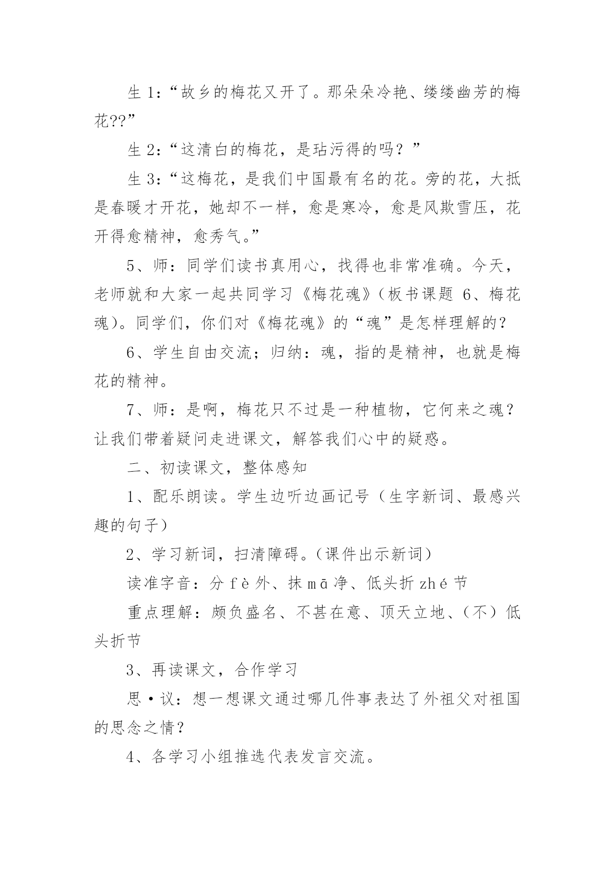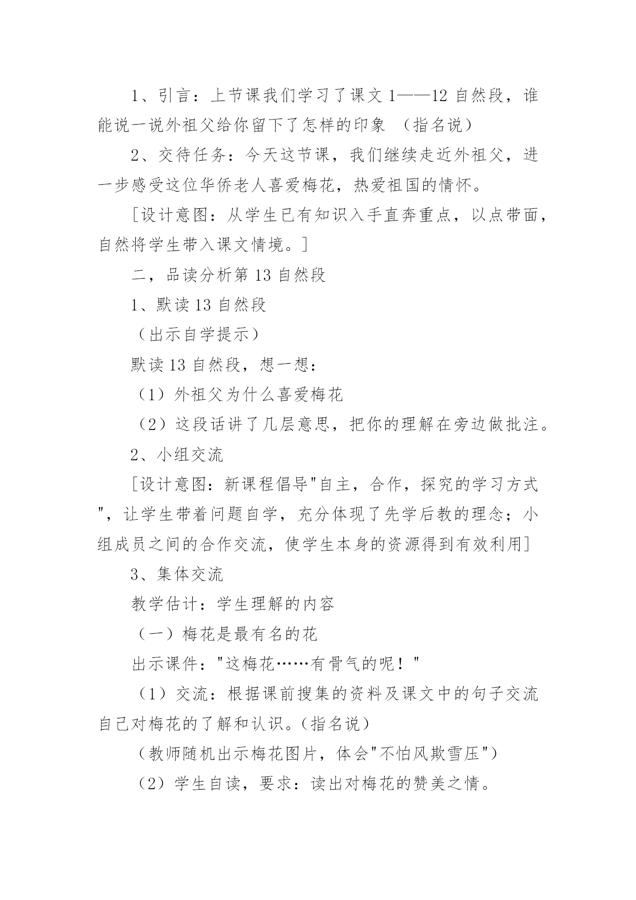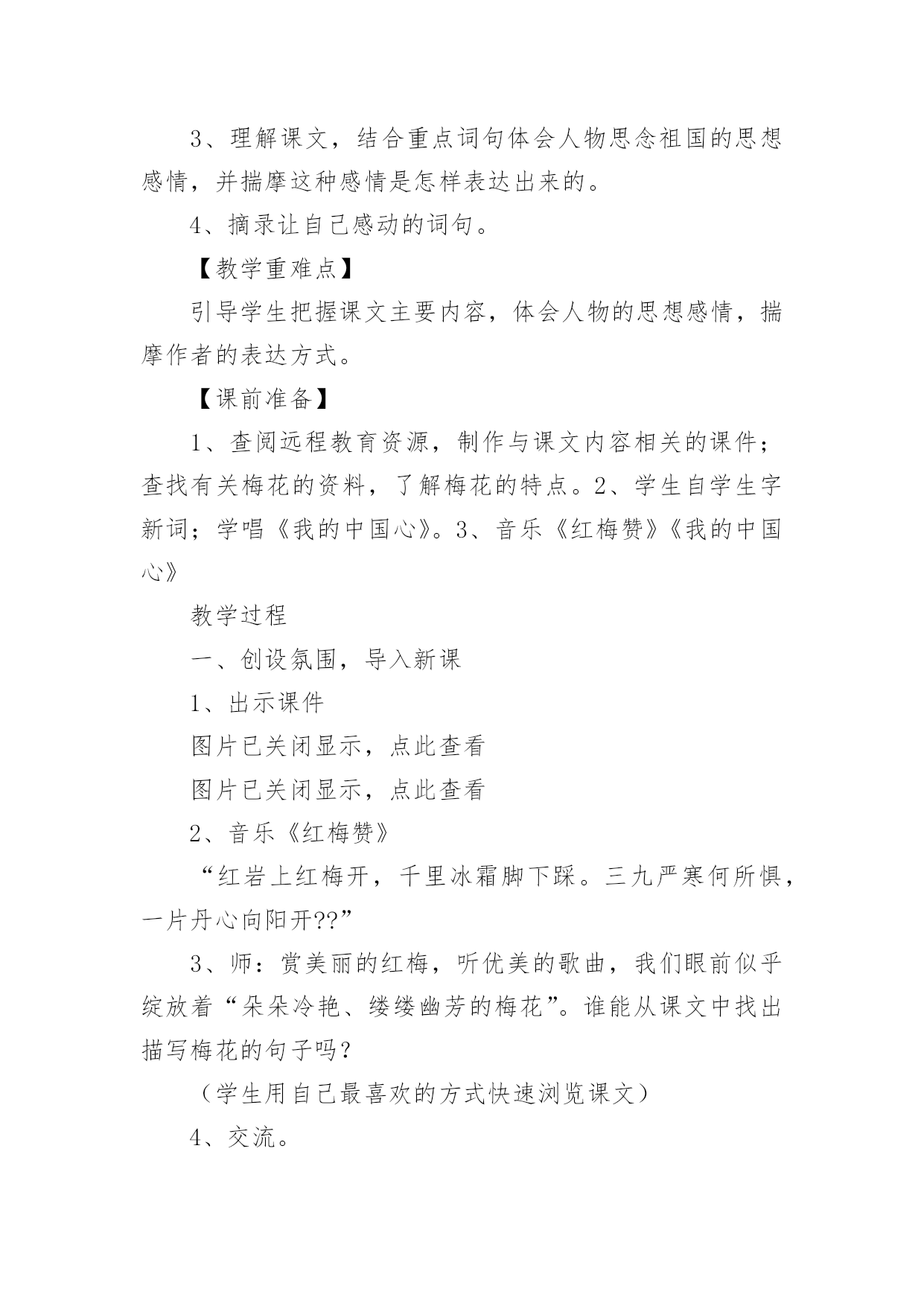 《梅花魂》教学设计《梅花魂》教学设计15篇作为一无名无私奉献的教育工作者,总归要编写教学设计,编写教学设计有利于我们科学、合理地支配课堂时间。那么你有了解过教学设计吗?以下是小编整理的《梅花魂》教学设计,希望能够帮助到大家。《梅花魂》教学设计1【教学内容】《梅花魂》源于语文五年级上册第二组课文。本单元的专题是“月是故乡明”。“露从今夜白,月是故乡明。”远离故乡的人,总会思念自己的家乡,这是人间最美好的感情。学习本组课文时,要引导学生充分读书,用心体会,积累书中美好的语言,感受人物美好的情感。【学习目标】1、认识12个生字,会写14个生字。正确读写“缕缕、幽芳、漂泊、唯独、顿时、稀罕、离别、大抵、精神、品格、灵魂、骨气、民族、气节、磨难、欺凌、境遇、毕竟、梳理、衰老、珍藏、华侨、能书善画、风欺雪压、顶天立地、低头折节、泪眼蒙朧”等词语。读读记记“颇负盛名、玷污、秉性、凉飕飕、眷念”等词语。2、正确、流利、有感情地朗读课文。3、理解课文,结合重点词句体会人物思念祖国的思想感情,并揣摩这种感情是怎样表达出来的。4、摘录让自己感动的词句。【教学重难点】引导学生把握课文主要内容,体会人物的思想感情,揣摩作者的表达方式。【课前准备】1、查阅远程教育资源,制作与课文内容相关的课件;查找有关梅花的资料,了解梅花的特点。2、学生自学生字新词;学唱《我的中国心》。3、音乐《红梅赞》《我的中国心》教学过程一、创设氛围,导入新课1、出示课件图片已关闭显示,点此查看图片已关闭显示,点此查看2、音乐《红梅赞》“红岩上红梅开,千里冰霜脚下踩。三九严寒何所惧,一片丹心向阳开??”3、师:赏美丽的红梅,听优美的歌曲,我们眼前似乎绽放着“朵朵冷艳、缕缕幽芳的梅花”。谁能从课文中找出描写梅花的句子吗?(学生用自己最喜欢的方式快速浏览课文)4、交流。生1:“故乡的梅花又开了。那朵朵冷艳、缕缕幽芳的梅花??”生2:“这清白的梅花,是玷污得的吗?”生3:“这梅花,是我们中国最有名的花。旁的花,大抵是春暖才开花,她却不一样,愈是寒冷,愈是风欺雪压,花开得愈精神,愈秀气。”5、师:同学们读书真用心,找得也非常准确。今天,老师就和大家一起共同学习《梅花魂》(板书课题6、梅花魂)。同学们,你们对《梅花魂》的“魂”是怎样理解的?6、学生自由交流;归纳:魂,指的是精神,也就是梅花的精神。7、师:是啊,梅花只不过是一种植物,它何来之魂?让我们带着疑问走进课文,解答我们心中的疑惑。二、初读课文,整体感知1、配乐朗读。学生边听边画记号(生字新词、最感兴趣的句子)2、学习新词,扫清障碍。(课件出示新词)读准字音:分fè外、抹mā净、低头折zhé节重点理解:颇负盛名、不甚在意、顶天立地、(不)低头折节3、再读课文,合作学习思·议:想一想课文通过哪几件事表达了外祖父对祖国的思念之情?4、各学习小组推选代表发言交流。5、指导、订正。课文围绕梅花,共写了五件事:①外祖父常常教“我”读唐诗宋词,还常流泪。②外祖父对墨梅图分外爱惜,“我”不小心弄脏,他竟大发脾气。③外祖父因不能回国而难过得哭了。④外祖父将最宝贵的墨梅图送给了“我”。⑤分别那天,外祖父又把绣着梅花的手绢送给“我”。三、品读课文,体会情感1、师:同学们,课文在写这五件事时候,几次写到了外祖父的“哭”,你知道一共有几次?外祖父为什么而哭?生1:课文共三次写到了外祖父的哭。分别在第2节、第11节、第15节。2、师:你找得非常准确,说明你读书是多么的细心呀!谁能读一读描写“三哭”的句子?生2:每当读到“独在异乡为异客,每逢佳节倍思亲”??之类的句子,常会有一颗两颗冰凉的泪珠落在我的腮边、手背。生3:“??想不到外祖父竟像小孩子一样,‘呜呜呜’地哭了起来。”生4:“想不到泪眼蒙胧的外祖父也随着上了船,??”3、品味“三哭”一哭:教“我”唐诗、宋词时。体会外祖父的思乡情①师:同学们,从课文中我们不难看到,对外公的记忆,都是作者在幼年时期的记忆了。从课文的插图中我们不难看,当时她只是一个四五岁的孩子,虽然她记住了自己亲身经历过的事情,可是又有多少是她能懂的呢?于是,外祖父的言行使她产生了好多好多的疑惑,那么小小年纪的“我”有哪些疑问呢?②指名有感情地朗读第2自然段。③交流。生:她不懂得外祖父在教唐诗宋时,为什么会落泪。师:同学们,你们能说说这是为什么吗?生:老师,我从课外阅读资料中了解到:“独在异乡为异客,每逢佳节倍思亲。”出自唐朝诗人王维的《九月九日忆山东兄弟》;“春草明年绿,王孙归不归?”出自唐朝诗人王维的《山中送别》;“自在飞花轻似梦,无边丝雨细如愁。”出自北宋诗人秦观的词《浣溪沙》。这三首表达的是浓浓的思乡之情或依依惜别情。生:老师,我认为,当时身居异国的外祖父的情况就与身居异乡的王维差不多。身居它乡的王维在九月九日重阳节因不能回家,所以