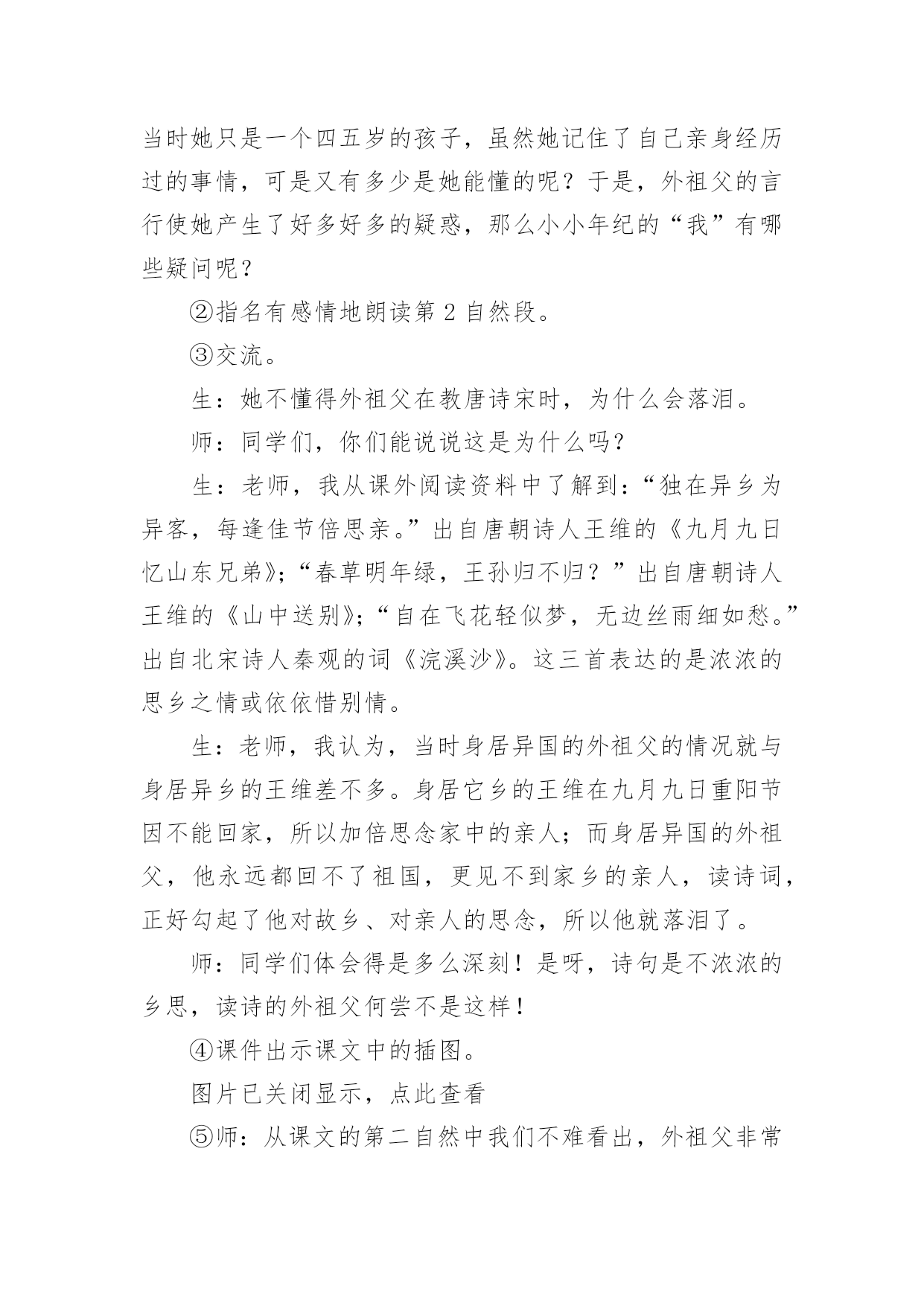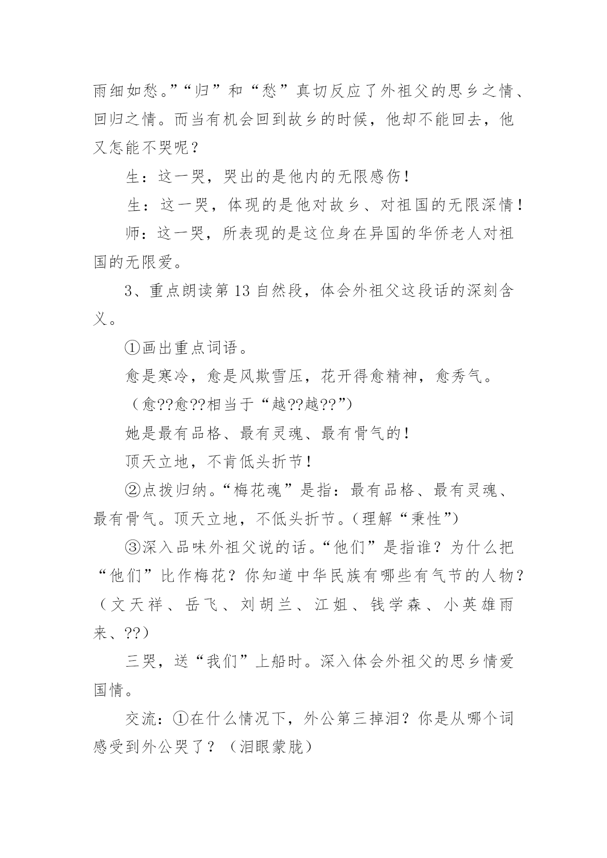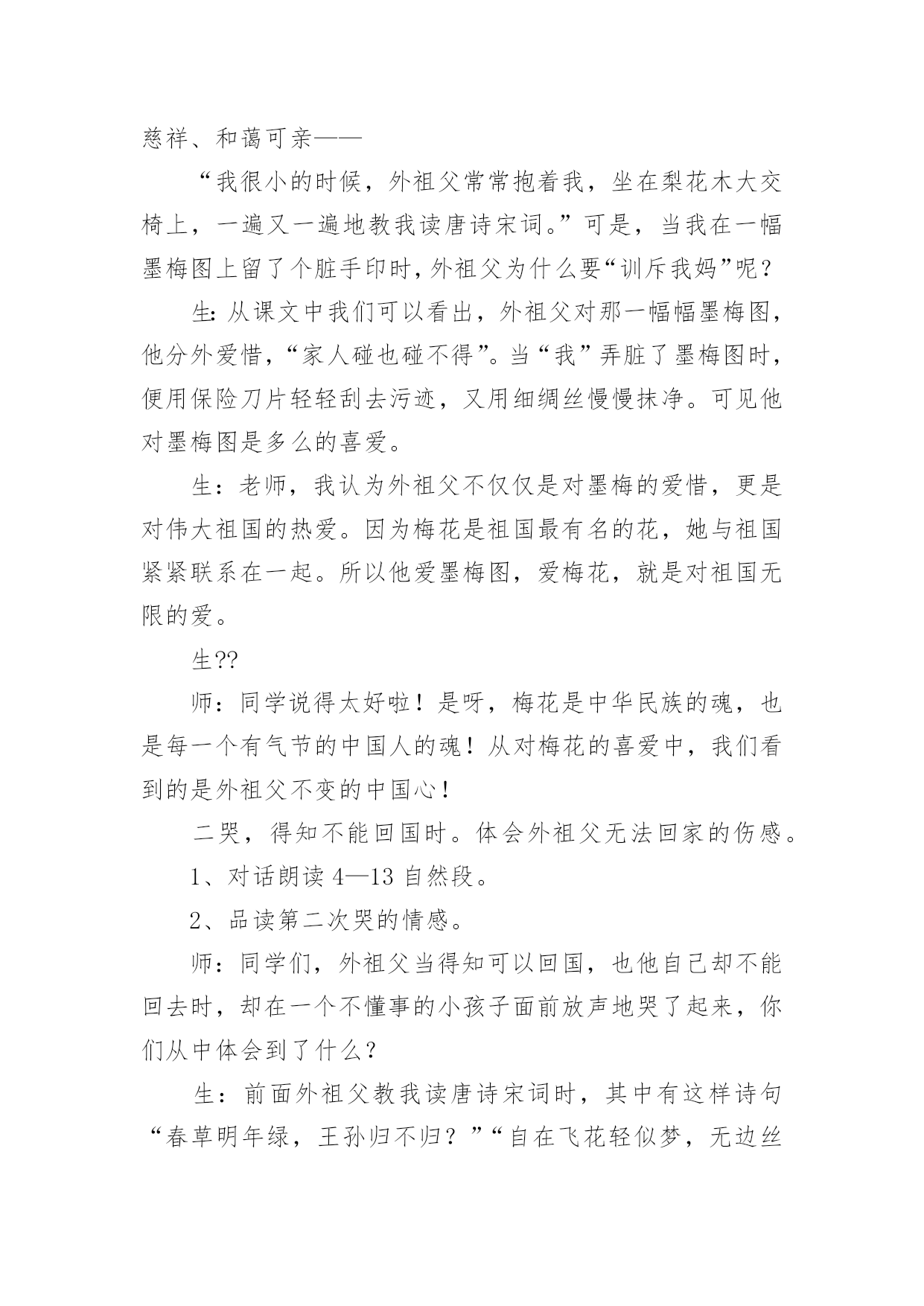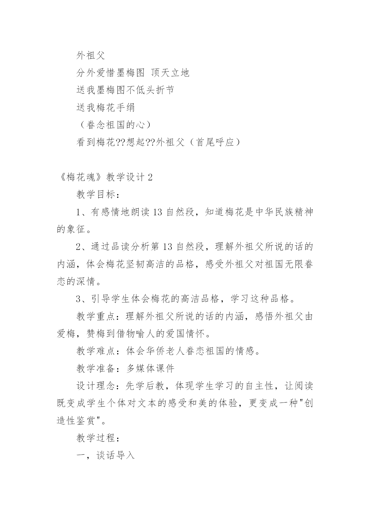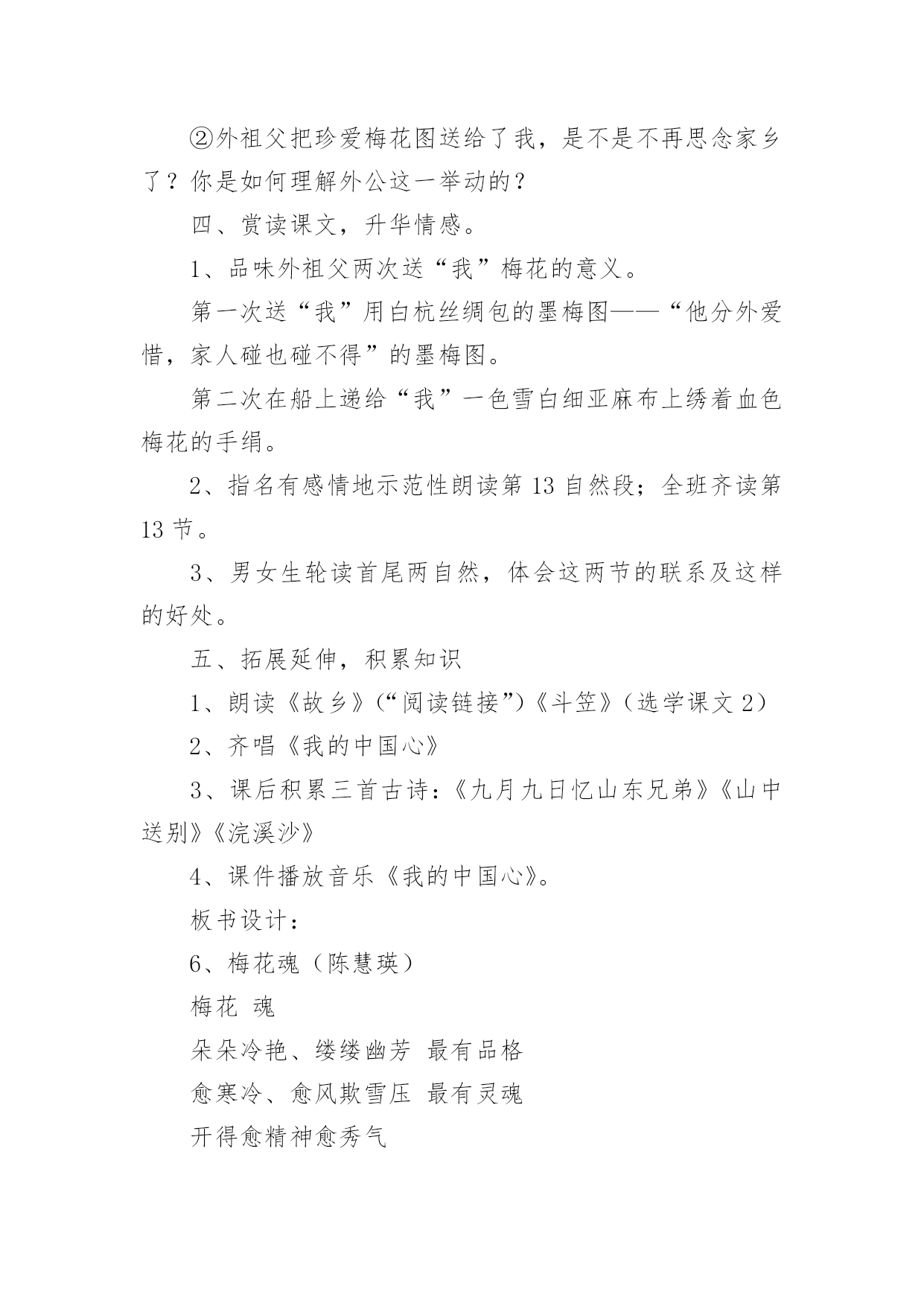 《梅花魂》教学设计《梅花魂》教学设计15篇作为一无名无私奉献的教育工作者,总归要编写教学设计,编写教学设计有利于我们科学、合理地支配课堂时间。那么你有了解过教学设计吗?以下是小编整理的《梅花魂》教学设计,希望能够帮助到大家。《梅花魂》教学设计1【教学内容】《梅花魂》源于语文五年级上册第二组课文。本单元的专题是“月是故乡明”。“露从今夜白,月是故乡明。”远离故乡的人,总会思念自己的家乡,这是人间最美好的感情。学习本组课文时,要引导学生充分读书,用心体会,积累书中美好的语言,感受人物美好的情感。【学习目标】1、认识12个生字,会写14个生字。正确读写“缕缕、幽芳、漂泊、唯独、顿时、稀罕、离别、大抵、精神、品格、灵魂、骨气、民族、气节、磨难、欺凌、境遇、毕竟、梳理、衰老、珍藏、华侨、能书善画、风欺雪压、顶天立地、低头折节、泪眼蒙朧”等词语。读读记记“颇负盛名、玷污、秉性、凉飕飕、眷念”等词语。2、正确、流利、有感情地朗读课文。3、理解课文,结合重点词句体会人物思念祖国的思想感情,并揣摩这种感情是怎样表达出来的。4、摘录让自己感动的词句。【教学重难点】引导学生把握课文主要内容,体会人物的思想感情,揣摩作者的表达方式。【课前准备】1、查阅远程教育资源,制作与课文内容相关的课件;查找有关梅花的资料,了解梅花的特点。2、学生自学生字新词;学唱《我的中国心》。3、音乐《红梅赞》《我的中国心》教学过程一、创设氛围,导入新课1、出示课件图片已关闭显示,点此查看图片已关闭显示,点此查看2、音乐《红梅赞》“红岩上红梅开,千里冰霜脚下踩。三九严寒何所惧,一片丹心向阳开??”3、师:赏美丽的红梅,听优美的歌曲,我们眼前似乎绽放着“朵朵冷艳、缕缕幽芳的梅花”。谁能从课文中找出描写梅花的句子吗?(学生用自己最喜欢的方式快速浏览课文)4、交流。生1:“故乡的梅花又开了。那朵朵冷艳、缕缕幽芳的梅花??”生2:“这清白的梅花,是玷污得的吗?”生3:“这梅花,是我们中国最有名的花。旁的花,大抵是春暖才开花,她却不一样,愈是寒冷,愈是风欺雪压,花开得愈精神,愈秀气。”5、师:同学们读书真用心,找得也非常准确。今天,老师就和大家一起共同学习《梅花魂》(板书课题6、梅花魂)。同学们,你们对《梅花魂》的“魂”是怎样理解的?6、学生自由交流;归纳:魂,指的是精神,也就是梅花的精神。7、师:是啊,梅花只不过是一种植物,它何来之魂?让我们带着疑问走进课文,解答我们心中的疑惑。二、初读课文,整体感知1、配乐朗读。学生边听边画记号(生字新词、最感兴趣的句子)2、学习新词,扫清障碍。(课件出示新词)读准字音:分fè外、抹mā净、低头折zhé节重点理解:颇负盛名、不甚在意、顶天立地、(不)低头折节3、再读课文,合作学习思·议:想一想课文通过哪几件事表达了外祖父对祖国的思念之情?4、各学习小组推选代表发言交流。5、指导、订正。课文围绕梅花,共写了五件事:①外祖父常常教“我”读唐诗宋词,还常流泪。②外祖父对墨梅图分外爱惜,“我”不小心弄脏,他竟大发脾气。③外祖父因不能回国而难过得哭了。④外祖父将最宝贵的墨梅图送给了“我”。⑤分别那天,外祖父又把绣着梅花的手绢送给“我”。三、品读课文,体会情感1、师:同学们,课文在写这五件事时候,几次写到了外祖父的“哭”,你知道一共有几次?外祖父为什么而哭?生1:课文共三次写到了外祖父的哭。分别在第2节、第11节、第15节。2、师:你找得非常准确,说明你读书是多么的细心呀!谁能读一读描写“三哭”的句子?生2:每当读到“独在异乡为异客,每逢佳节倍思亲”??之类的句子,常会有一颗两颗冰凉的泪珠落在我的腮边、手背。生3:“??想不到外祖父竟像小孩子一样,‘呜呜呜’地哭了起来。”生4:“想不到泪眼蒙胧的外祖父也随着上了船,??”3、品味“三哭”一哭:教“我”唐诗、宋词时。体会外祖父的思乡情①师:同学们,从课文中我们不难看到,对外公的记忆,都是作者在幼年时期的记忆了。从课文的插图中我们不难看,当时她只是一个四五岁的孩子,虽然她记住了自己亲身经历过的事情,可是又有多少是她能懂的呢?于是,外祖父的言行使她产生了好多好多的疑惑,那么小小年纪的“我”有哪些疑问呢?②指名有感情地朗读第2自然段。③交流。生:她不懂得外祖父在教唐诗宋时,为什么会落泪。师:同学们,你们能说说这是为什么吗?生:老师,我从课外阅读资料中了解到:“独在异乡为异客,每逢佳节倍思亲。”出自唐朝诗人王维的《九月九日忆山东兄弟》;“春草明年绿,王孙归不归?”出自唐朝诗人王维的《山中送别》;“自在飞花轻似梦,无边丝雨细如愁。”出自北宋诗人秦观的词《浣溪沙》。这三首表达的是浓浓的思乡之情或依依惜别情。生:老师,我认为,当时身居异国的外祖父的情况就与身居异乡的王维差不多。身居它乡的王维在九月九日重阳节因不能回家,所以