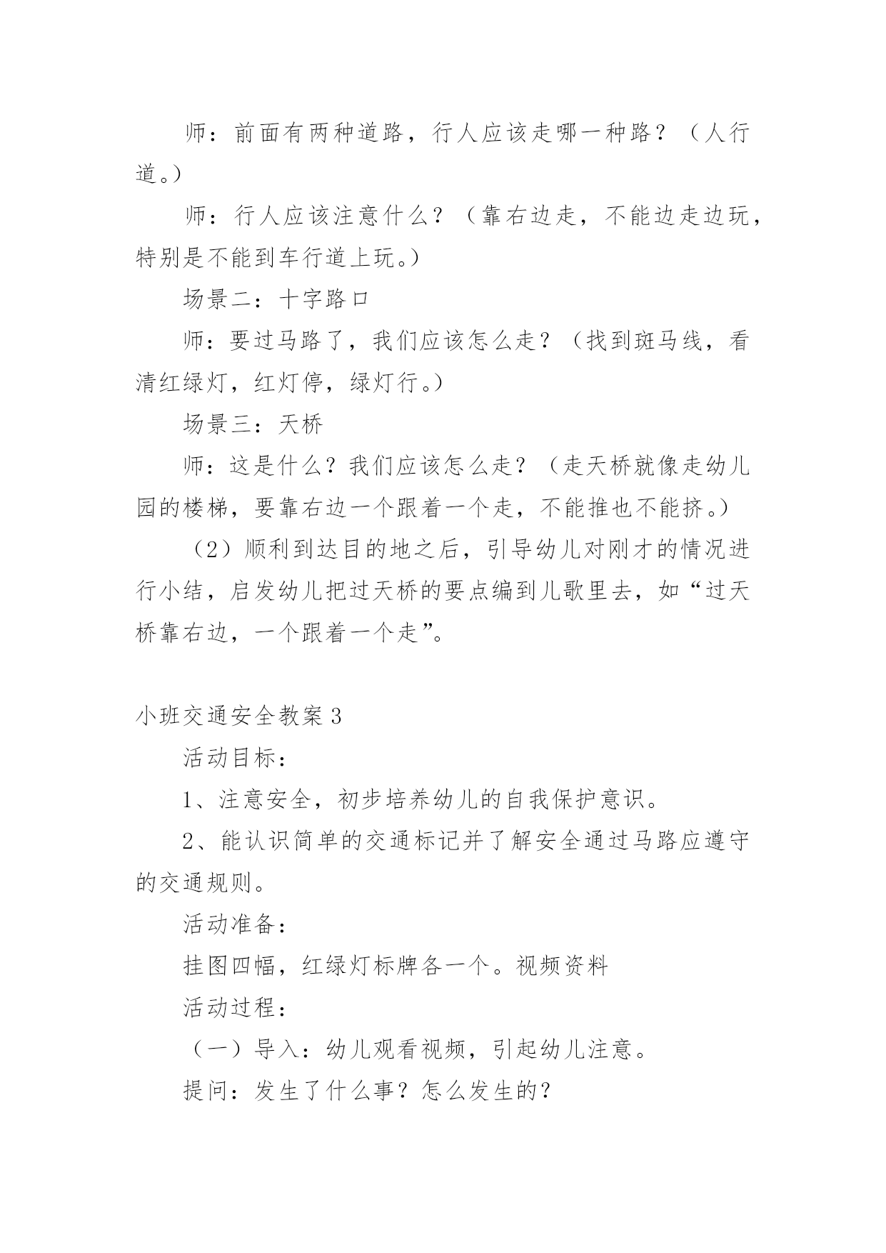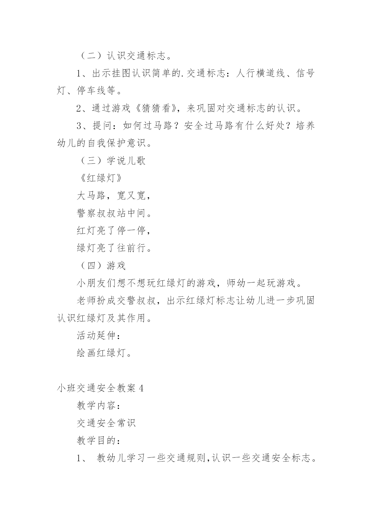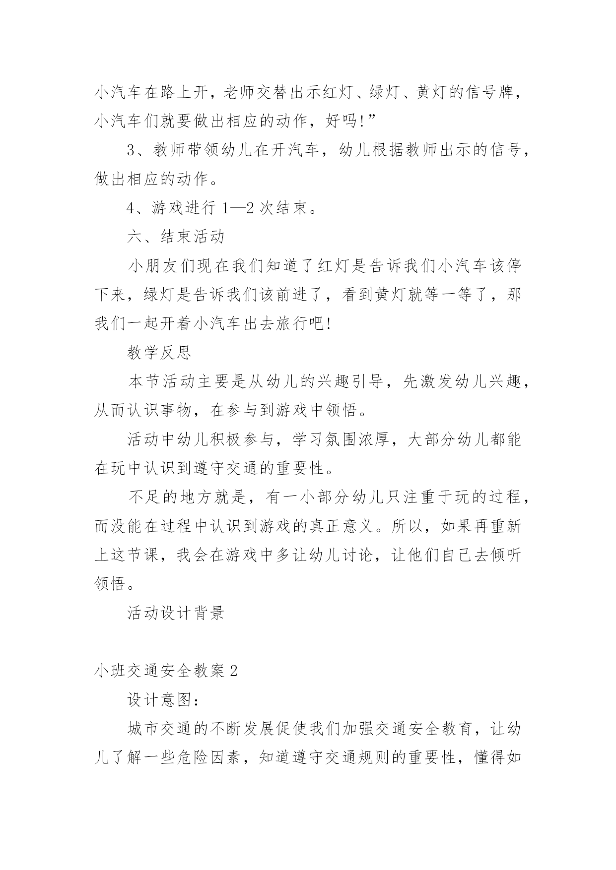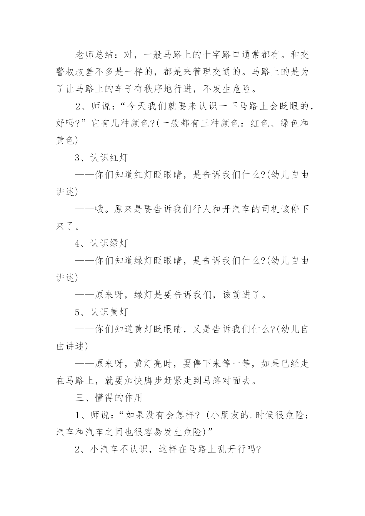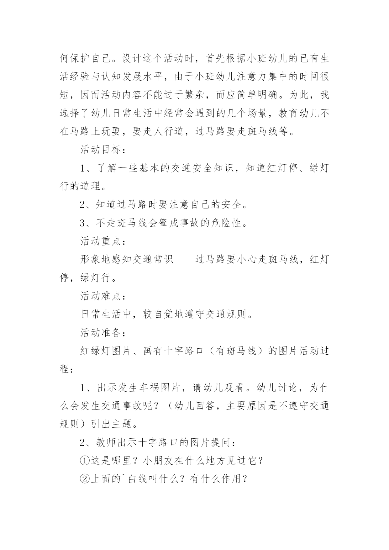 小班交通安全教案作为一名专为他人授业解惑的人民教师,通常需要准备好一份教案,借助教案可以提高教学质量,收到预期的教学效果。那么什么样的教案才是好的呢?下面是小编精心整理的小班交通安全教案,希望对大家有所帮助。小班交通安全教案11、通过学习儿歌和玩游戏《》知道汽车、行人在马路上要遵守交通规则,听从红灯绿灯的指挥。2、在学习儿歌的基础上,能在的游戏中能较灵敏的根据信号做动作,体验模仿游戏的快乐。活动准备:小汽车图片、红、绿、黄信号灯活动过程:一、小汽车出门小朋友,今天老师给你们请一位客人你们看是谁?这辆小汽车叫嘀嘀,他第一次出门,对所有的事物都觉得很新奇。它看到马路上、大街上这么热闹,开心的嘀嘀直叫。它一会开到东,一会开到西,可自由了。忽然它看到大街上有样东西总是不停地眨眼睛,觉得非常奇怪。你们能告诉它东西吗?(导入)二、认识1、师说:“见过它?它有什么用?老师总结:对,一般马路上的十字路口通常都有。和交警叔叔差不多是一样的,都是来管理交通的。马路上的是为了让马路上的车子有秩序地行进,不发生危险。2、师说:“今天我们就要来认识一下马路上会眨眼的,好吗?”它有几种颜色?(一般都有三种颜色:红色、绿色和黄色)3、认识红灯——你们知道红灯眨眼睛,是告诉我们什么?(幼儿自由讲述)——哦。原来是要告诉我们行人和开汽车的司机该停下来了。4、认识绿灯——你们知道绿灯眨眼睛,是告诉我们什么?(幼儿自由讲述)——原来呀,绿灯是要告诉我们,该前进了。5、认识黄灯——你们知道黄灯眨眼睛,又是告诉我们什么?(幼儿自由讲述)——原来呀,黄灯亮时,要停下来等一等,如果已经走在马路上,就要加快脚步赶紧走到马路对面去。三、懂得的作用1、师说:“如果没有会怎样?(小朋友的.时候很危险;汽车和汽车之间也很容易发生危险)”2、小汽车不认识,这样在马路上乱开行吗?3、师说:“所以我们一起帮助小汽车想一个办法,好吗?(幼儿自由说说)”4、师说:“老师想到了一个办法,这里有一首儿歌,可以帮助小汽车。我们一起念给小汽车听吧!”——教师朗诵儿歌一遍。5、小汽车看到红灯、绿灯是怎么做的?看到黄灯是怎么做的?(教师用肢体表演引导幼儿自由讲述)四、出示信号牌,学念儿歌1、教师分别出示红灯、绿灯、黄灯的信号牌,请幼儿在座位上分别作出停车、开车、准备的动作。教师先示范。——师说:“老师这儿呢,有三块信号牌,因为我怕小汽车搞不清楚,特地请小朋友和老师一起来帮助小汽车认识,好吗?”——师说:“现在我先和小朋友一起来试试这三个信号灯应该做出怎么样的动作?”(边念儿歌边做动作)幼儿操作——师说:“接下来请小朋友来表现了!”幼儿学念儿歌,教师在相应的地方出示红灯、绿灯、行人的信号牌,以帮助幼儿记忆。五、游戏《》。1、师说:“现在我们小朋友也是一辆辆小汽车,老师的大汽车很想和小汽车们做游戏呢。2、师说:“游戏是这样玩的,小朋友跟在老师后面模仿小汽车在路上开,老师交替出示红灯、绿灯、黄灯的信号牌,小汽车们就要做出相应的动作,好吗!”3、教师带领幼儿在开汽车,幼儿根据教师出示的信号,做出相应的动作。4、游戏进行1—2次结束。六、结束活动小朋友们现在我们知道了红灯是告诉我们小汽车该停下来,绿灯是告诉我们该前进了,看到黄灯就等一等了,那我们一起开着小汽车出去旅行吧!教学反思本节活动主要是从幼儿的兴趣引导,先激发幼儿兴趣,从而认识事物,在参与到游戏中领悟。活动中幼儿积极参与,学习氛围浓厚,大部分幼儿都能在玩中认识到遵守交通的重要性。不足的地方就是,有一小部分幼儿只注重于玩的过程,而没能在过程中认识到游戏的真正意义。所以,如果再重新上这节课,我会在游戏中多让幼儿讨论,让他们自己去倾听领悟。活动设计背景小班交通安全教案2设计意图:城市交通的不断发展促使我们加强交通安全教育,让幼儿了解一些危险因素,知道遵守交通规则的重要性,懂得如何保护自己。设计这个活动时,首先根据小班幼儿的已有生活经验与认知发展水平,由于小班幼儿注意力集中的时间很短,因而活动内容不能过于繁杂,而应简单明确。为此,我选择了幼儿日常生活中经常会遇到的几个场景,教育幼儿不在马路上玩耍,要走人行道,过马路要走斑马线等。活动目标:1、了解一些基本的交通安全知识,知道红灯停、绿灯行的道理。2、知道过马路时要注意自己的安全。3、不走斑马线会肇成事故的危险性。活动重点:形象地感知交通常识——过马路要小心走斑马线,红灯停,绿灯行。活动难点:日常生活中,较自觉地遵守交通规则。活动准备:红绿灯图片、画有十字路口(有斑马线)的图片活动过程:1、出示发生车祸图片,请幼儿观看。幼儿讨论,为什么会发生交通事故呢?(幼儿回答,主要原因是不遵守交通规则)引出主题。2、教师出示十字路口的图片提问:①这是哪里?小朋友在什么地方见过它?②上面的`白线叫什么?有什么作用?3、出示红绿