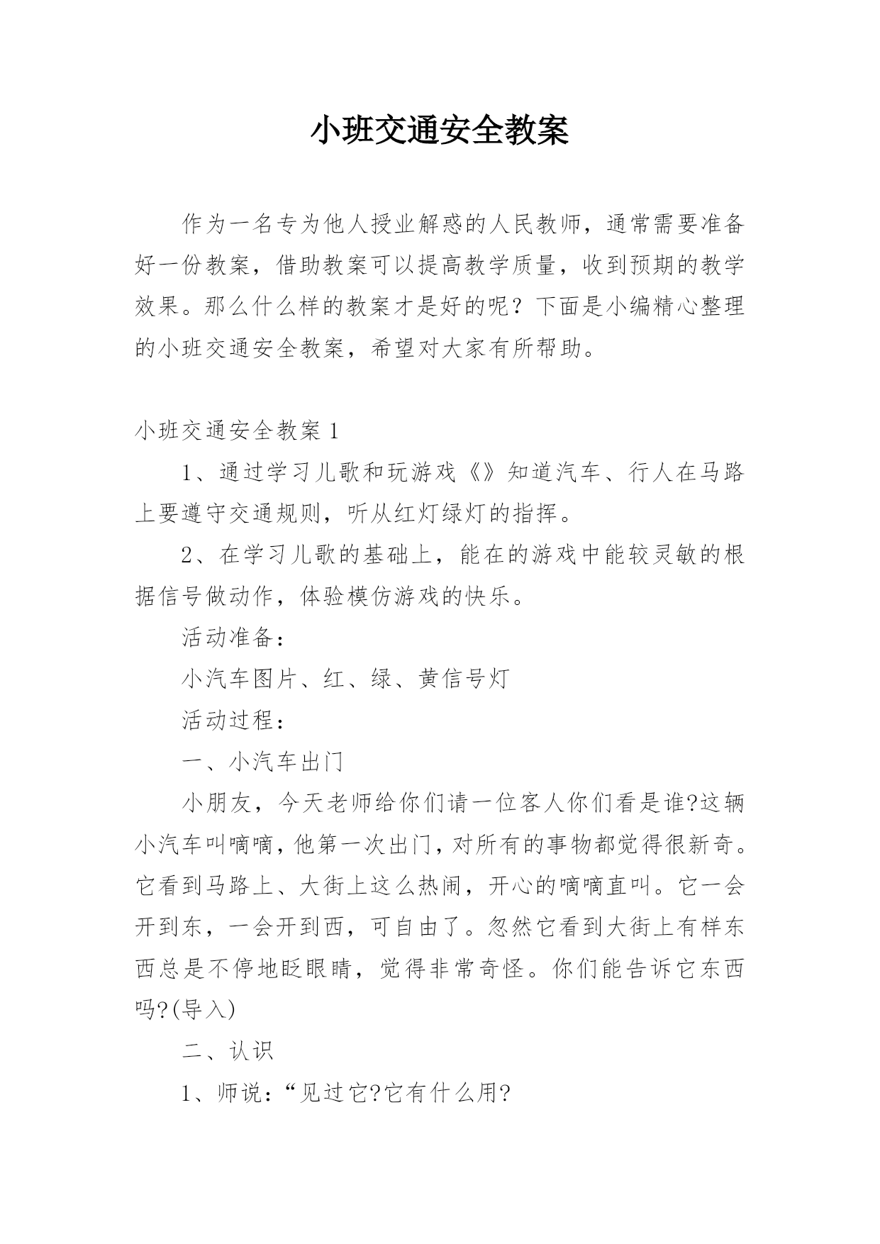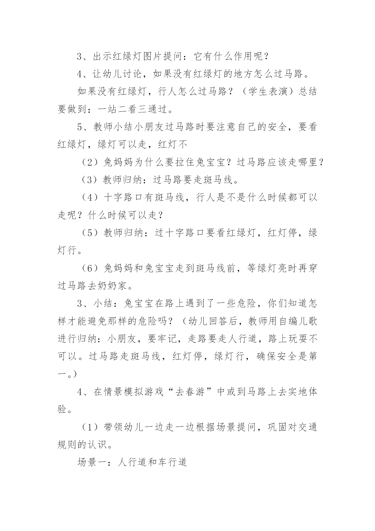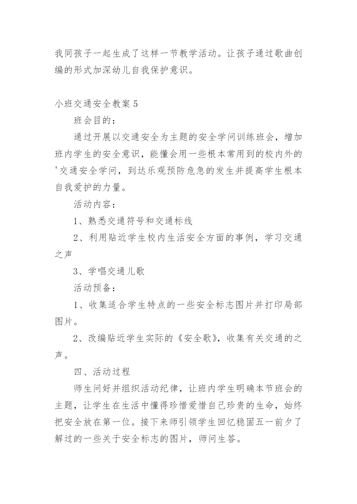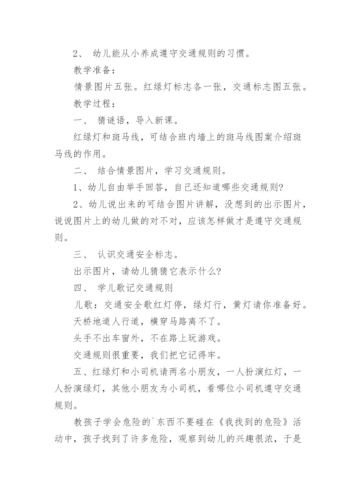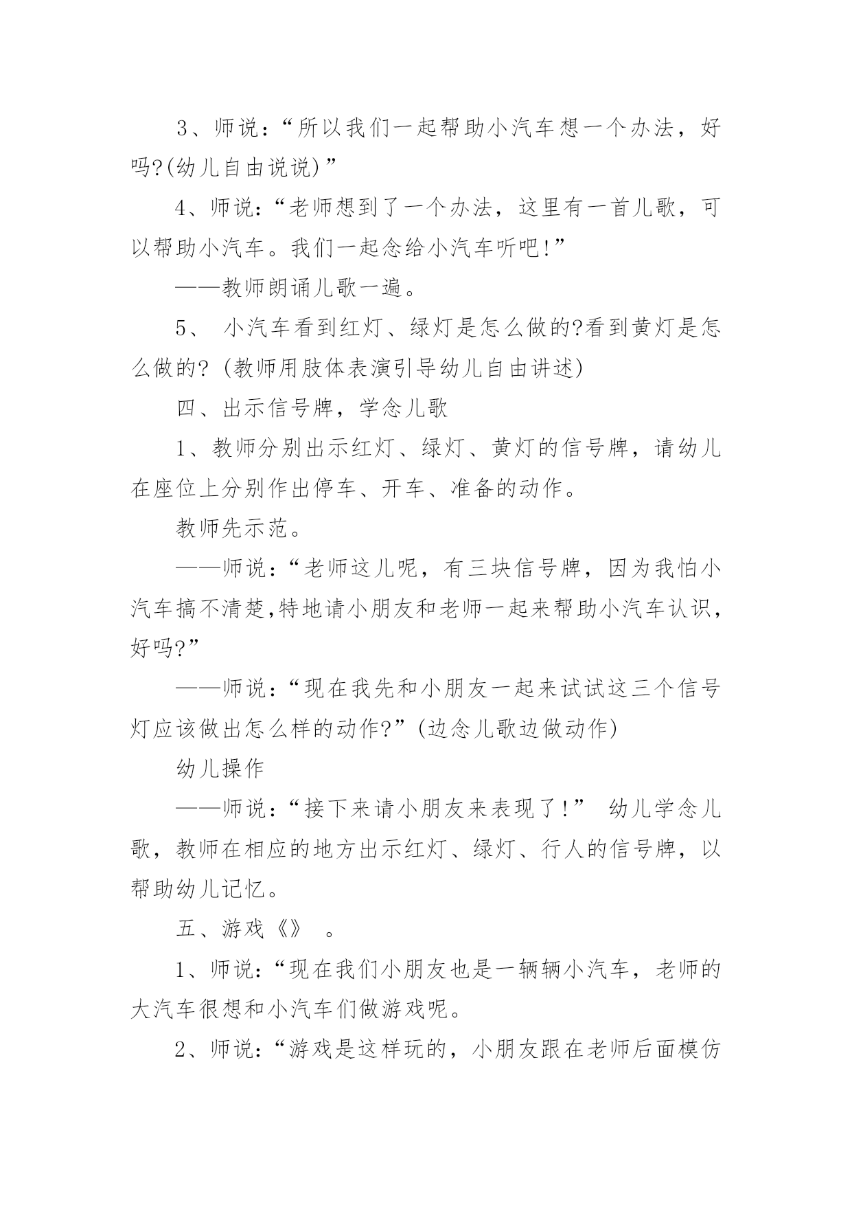 小班交通安全教案作为一名专为他人授业解惑的人民教师,通常需要准备好一份教案,借助教案可以提高教学质量,收到预期的教学效果。那么什么样的教案才是好的呢?下面是小编精心整理的小班交通安全教案,希望对大家有所帮助。小班交通安全教案11、通过学习儿歌和玩游戏《》知道汽车、行人在马路上要遵守交通规则,听从红灯绿灯的指挥。2、在学习儿歌的基础上,能在的游戏中能较灵敏的根据信号做动作,体验模仿游戏的快乐。活动准备:小汽车图片、红、绿、黄信号灯活动过程:一、小汽车出门小朋友,今天老师给你们请一位客人你们看是谁?这辆小汽车叫嘀嘀,他第一次出门,对所有的事物都觉得很新奇。它看到马路上、大街上这么热闹,开心的嘀嘀直叫。它一会开到东,一会开到西,可自由了。忽然它看到大街上有样东西总是不停地眨眼睛,觉得非常奇怪。你们能告诉它东西吗?(导入)二、认识1、师说:“见过它?它有什么用?老师总结:对,一般马路上的十字路口通常都有。和交警叔叔差不多是一样的,都是来管理交通的。马路上的是为了让马路上的车子有秩序地行进,不发生危险。2、师说:“今天我们就要来认识一下马路上会眨眼的,好吗?”它有几种颜色?(一般都有三种颜色:红色、绿色和黄色)3、认识红灯——你们知道红灯眨眼睛,是告诉我们什么?(幼儿自由讲述)——哦。原来是要告诉我们行人和开汽车的司机该停下来了。4、认识绿灯——你们知道绿灯眨眼睛,是告诉我们什么?(幼儿自由讲述)——原来呀,绿灯是要告诉我们,该前进了。5、认识黄灯——你们知道黄灯眨眼睛,又是告诉我们什么?(幼儿自由讲述)——原来呀,黄灯亮时,要停下来等一等,如果已经走在马路上,就要加快脚步赶紧走到马路对面去。三、懂得的作用1、师说:“如果没有会怎样?(小朋友的.时候很危险;汽车和汽车之间也很容易发生危险)”2、小汽车不认识,这样在马路上乱开行吗?3、师说:“所以我们一起帮助小汽车想一个办法,好吗?(幼儿自由说说)”4、师说:“老师想到了一个办法,这里有一首儿歌,可以帮助小汽车。我们一起念给小汽车听吧!”——教师朗诵儿歌一遍。5、小汽车看到红灯、绿灯是怎么做的?看到黄灯是怎么做的?(教师用肢体表演引导幼儿自由讲述)四、出示信号牌,学念儿歌1、教师分别出示红灯、绿灯、黄灯的信号牌,请幼儿在座位上分别作出停车、开车、准备的动作。教师先示范。——师说:“老师这儿呢,有三块信号牌,因为我怕小汽车搞不清楚,特地请小朋友和老师一起来帮助小汽车认识,好吗?”——师说:“现在我先和小朋友一起来试试这三个信号灯应该做出怎么样的动作?”(边念儿歌边做动作)幼儿操作——师说:“接下来请小朋友来表现了!”幼儿学念儿歌,教师在相应的地方出示红灯、绿灯、行人的信号牌,以帮助幼儿记忆。五、游戏《》。1、师说:“现在我们小朋友也是一辆辆小汽车,老师的大汽车很想和小汽车们做游戏呢。2、师说:“游戏是这样玩的,小朋友跟在老师后面模仿小汽车在路上开,老师交替出示红灯、绿灯、黄灯的信号牌,小汽车们就要做出相应的动作,好吗!”3、教师带领幼儿在开汽车,幼儿根据教师出示的信号,做出相应的动作。4、游戏进行1—2次结束。六、结束活动小朋友们现在我们知道了红灯是告诉我们小汽车该停下来,绿灯是告诉我们该前进了,看到黄灯就等一等了,那我们一起开着小汽车出去旅行吧!教学反思本节活动主要是从幼儿的兴趣引导,先激发幼儿兴趣,从而认识事物,在参与到游戏中领悟。活动中幼儿积极参与,学习氛围浓厚,大部分幼儿都能在玩中认识到遵守交通的重要性。不足的地方就是,有一小部分幼儿只注重于玩的过程,而没能在过程中认识到游戏的真正意义。所以,如果再重新上这节课,我会在游戏中多让幼儿讨论,让他们自己去倾听领悟。活动设计背景小班交通安全教案2设计意图:城市交通的不断发展促使我们加强交通安全教育,让幼儿了解一些危险因素,知道遵守交通规则的重要性,懂得如何保护自己。设计这个活动时,首先根据小班幼儿的已有生活经验与认知发展水平,由于小班幼儿注意力集中的时间很短,因而活动内容不能过于繁杂,而应简单明确。为此,我选择了幼儿日常生活中经常会遇到的几个场景,教育幼儿不在马路上玩耍,要走人行道,过马路要走斑马线等。活动目标:1、了解一些基本的交通安全知识,知道红灯停、绿灯行的道理。2、知道过马路时要注意自己的安全。3、不走斑马线会肇成事故的危险性。活动重点:形象地感知交通常识——过马路要小心走斑马线,红灯停,绿灯行。活动难点:日常生活中,较自觉地遵守交通规则。活动准备:红绿灯图片、画有十字路口(有斑马线)的图片活动过程:1、出示发生车祸图片,请幼儿观看。幼儿讨论,为什么会发生交通事故呢?(幼儿回答,主要原因是不遵守交通规则)引出主题。2、教师出示十字路口的图片提问:①这是哪里?小朋友在什么地方见过它?②上面的`白线叫什么?有什么作用?3、出示红绿