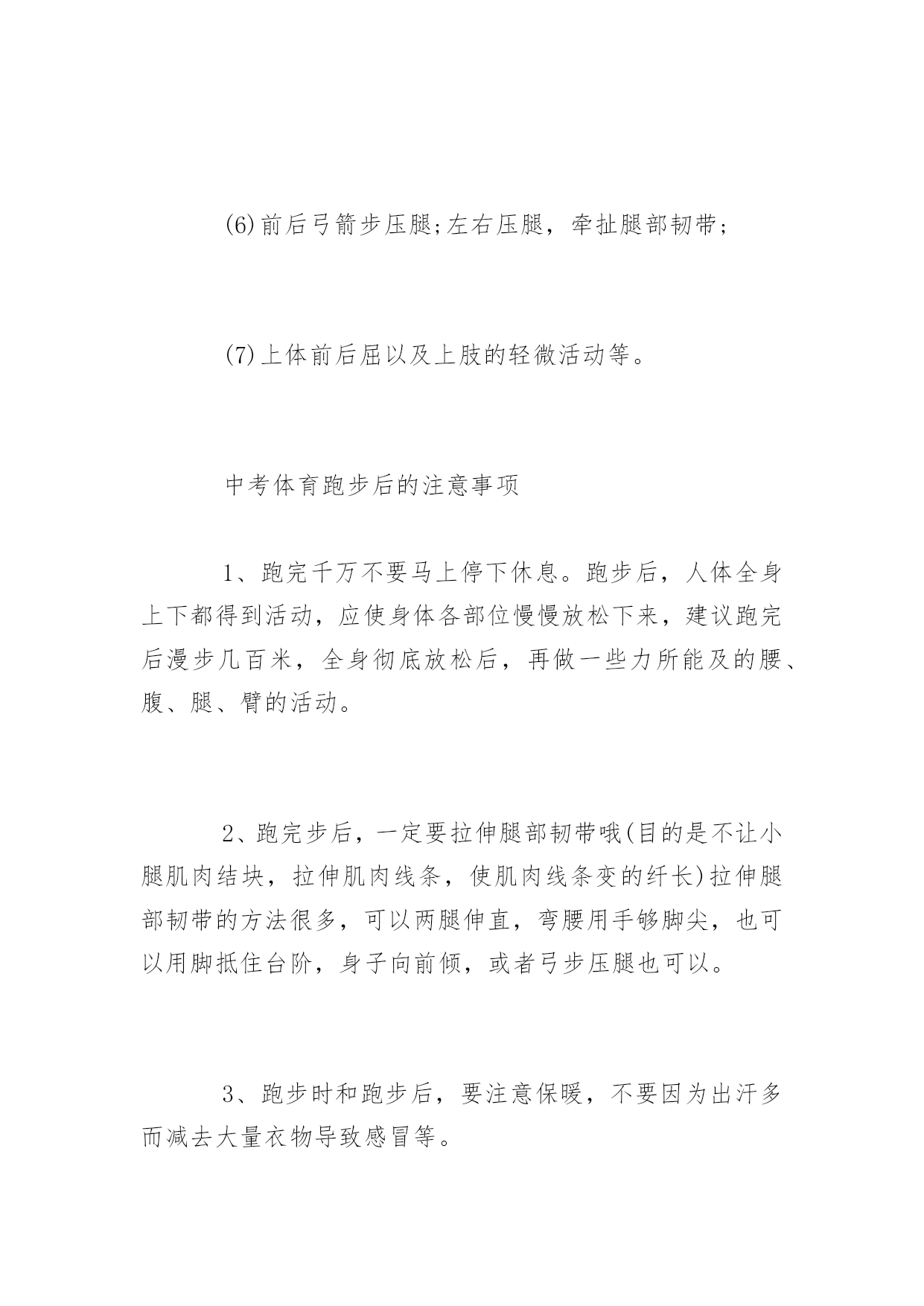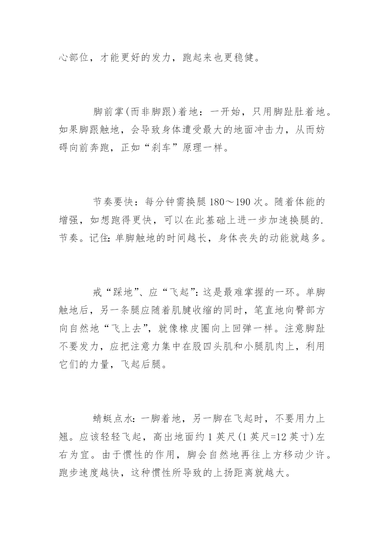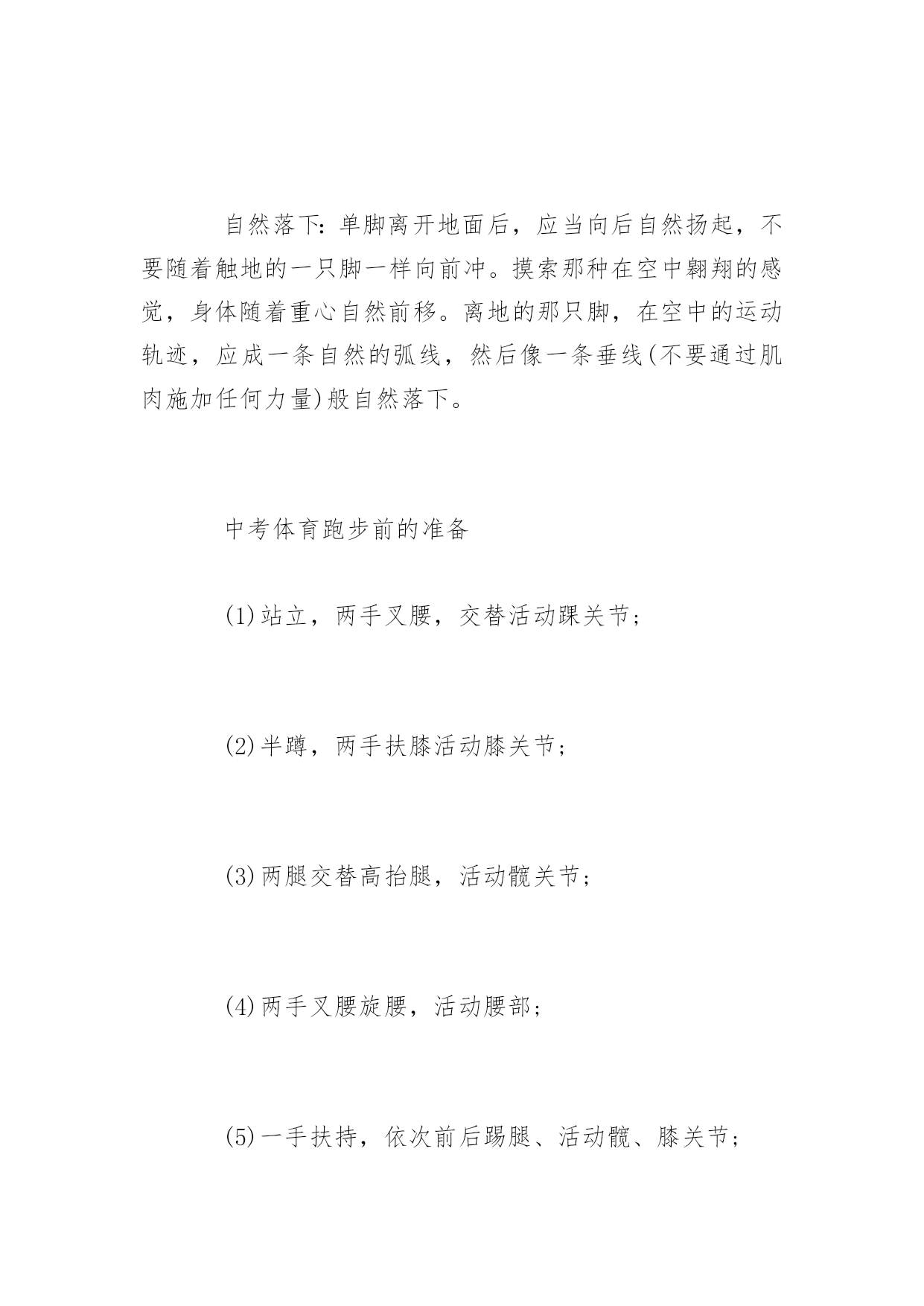 中考体育的跑步技巧是什么跑步是中考体育基本的项目,很多考生都想知道跑步技巧,下面是百分网小编整理的中考体育的跑步技巧,欢迎阅读借鉴!中考体育的跑步技巧前倾身体:全程保持身体稍微前倾(但不至于跌到),不要弓腰。前倾角度越大,速度越快。S形体姿:跑步时,背部挺直,全程(包括脚踩地时)保持双膝微屈。跑步时,头顶所处的高度应当比平时站立时头顶(距离地面的高度)低2~3英寸(1英寸=2。54厘米)为宜。步幅要小:单脚落地时,应当处于身体下面,而非前面(步伐过大时,前脚会处于身体前面)。记住:步幅越大,身体的平衡感就越差;相反,较小的步幅,双脚接近身体核心部位,才能更好的发力,跑起来也更稳健。脚前掌(而非脚跟)着地:一开始,只用脚趾肚着地。如果脚跟触地,会导致身体遭受最大的地面冲击力,从而妨碍向前奔跑,正如“刹车”原理一样。节奏要快:每分钟需换腿180~190次。随着体能的增强,如想跑得更快,可以在此基础上进一步加速换腿的.节奏。记住:单脚触地的时间越长,身体丧失的动能就越多。戒“踩地”、应“飞起”:这是最难掌握的一环。单脚触地后,另一条腿应随着肌腱收缩的同时,笔直地向臀部方向自然地“飞上去”,就像橡皮圈向上回弹一样。注意脚趾不要发力,应把注意力集中在股四头肌和小腿肌肉上,利用它们的力量,飞起后腿。蜻蜓点水:一脚着地,另一脚在飞起时,不要用力上翘。应该轻轻飞起,高出地面约1英尺(1英尺=12英寸)左右为宜。由于惯性的作用,脚会自然地再往上方移动少许。跑步速度越快,这种惯性所导致的上扬距离就越大。自然落下:单脚离开地面后,应当向后自然扬起,不要随着触地的一只脚一样向前冲。摸索那种在空中翱翔的感觉,身体随着重心自然前移。离地的那只脚,在空中的运动轨迹,应成一条自然的弧线,然后像一条垂线(不要通过肌肉施加任何力量)般自然落下。中考体育跑步前的准备(1)站立,两手叉腰,交替活动踝关节;(2)半蹲,两手扶膝活动膝关节;(3)两腿交替高抬腿,活动髋关节;(4)两手叉腰旋腰,活动腰部;(5)一手扶持,依次前后踢腿、活动髋、膝关节;(6)前后弓箭步压腿;左右压腿,牵扯腿部韧带;(7)上体前后屈以及上肢的轻微活动等。中考体育跑步后的注意事项1、跑完千万不要马上停下休息。跑步后,人体全身上下都得到活动,应使身体各部位慢慢放松下来,建议跑完后漫步几百米,全身彻底放松后,再做一些力所能及的腰、腹、腿、臂的活动。2、跑完步后,一定要拉伸腿部韧带哦(目的是不让小腿肌肉结块,拉伸肌肉线条,使肌肉线条变的纤长)拉伸腿部韧带的方法很多,可以两腿伸直,弯腰用手够脚尖,也可以用脚抵住台阶,身子向前倾,或者弓步压腿也可以。3、跑步时和跑步后,要注意保暖,不要因为出汗多而减去大量衣物导致感冒等。4、适时补充水分。先休息5-10分钟后,再饮用淡盐水或温开水,但要避免喝凉水或冰冻饮料。