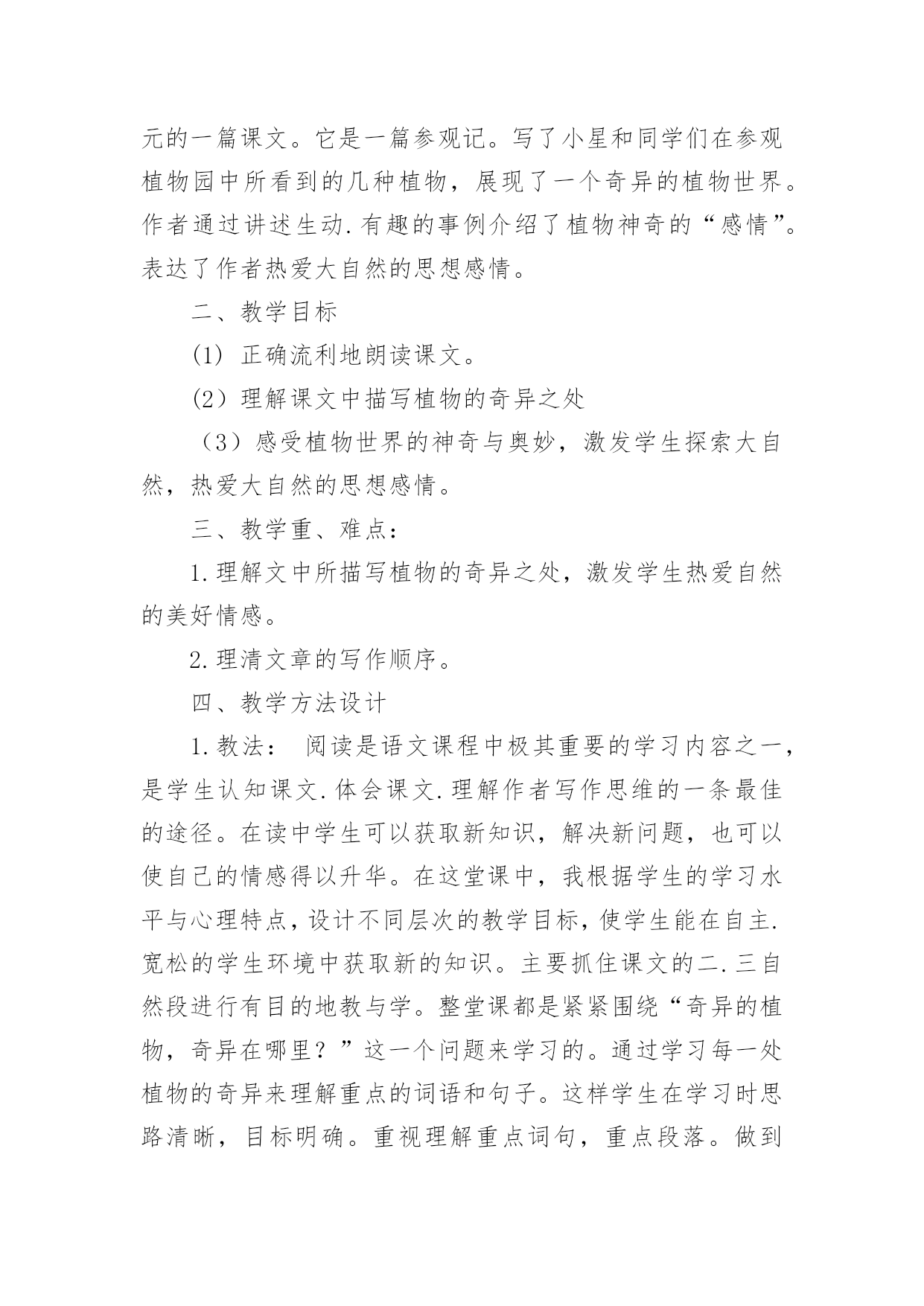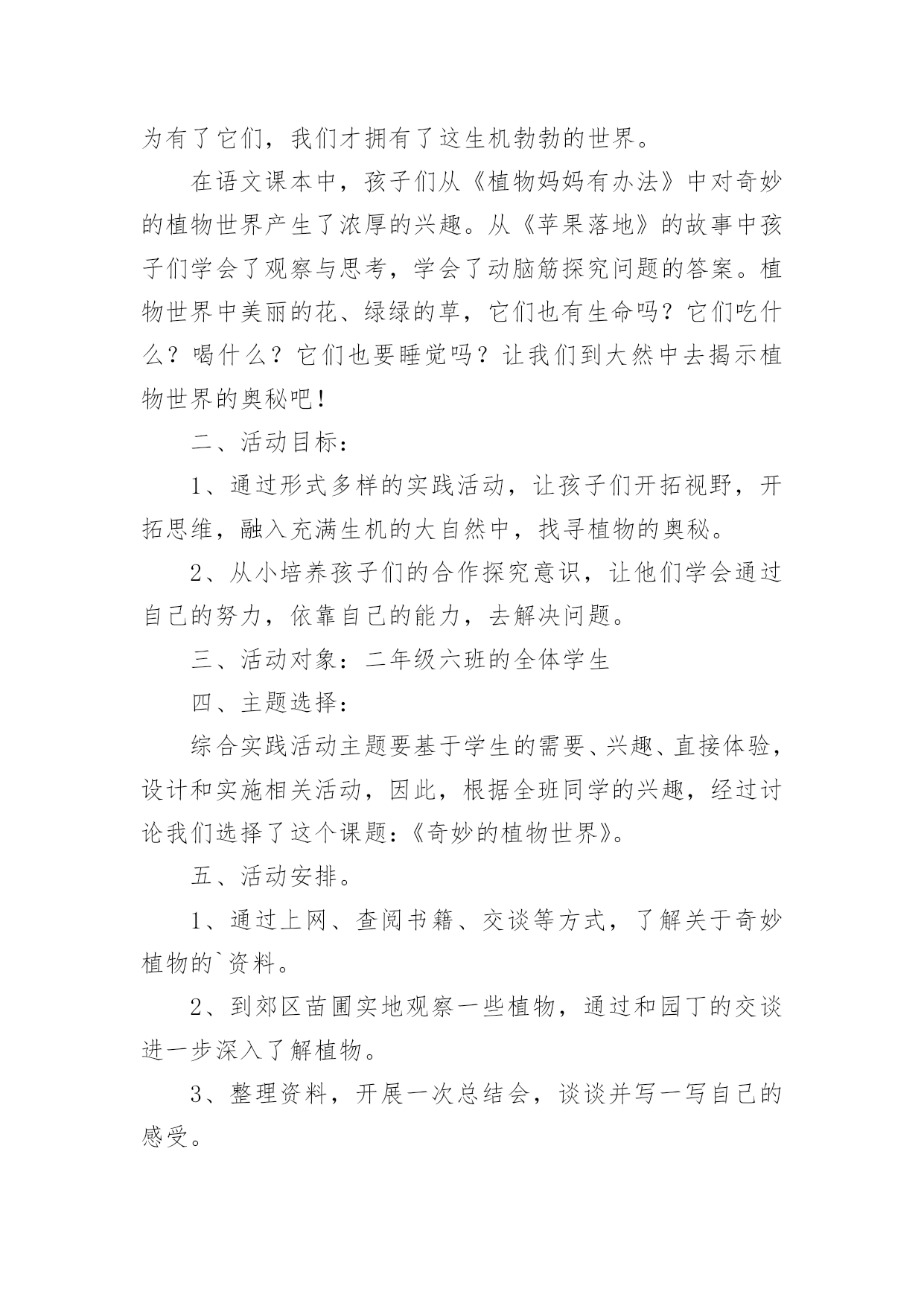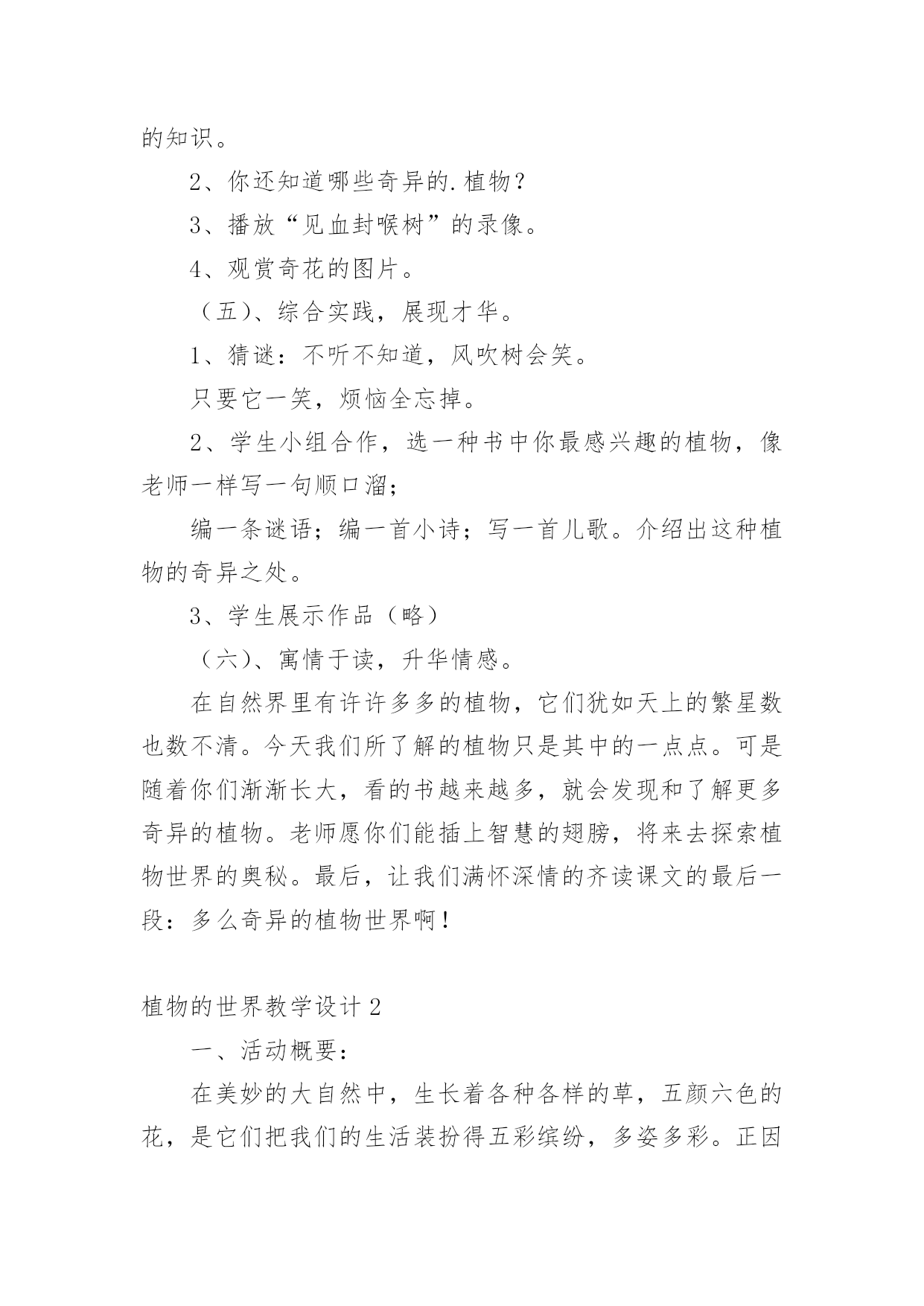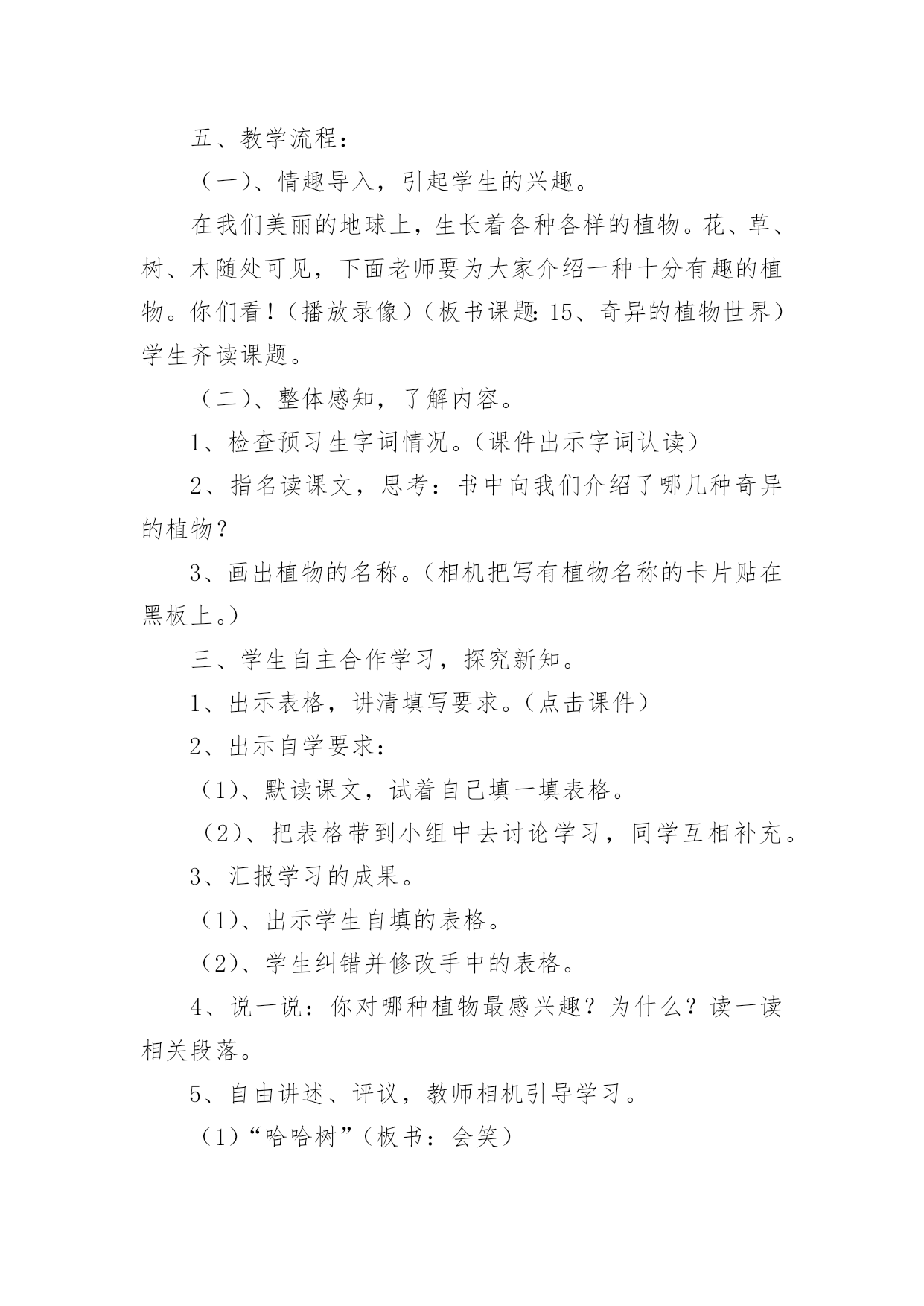 植物的世界教学设计作为一名教师,就难以避免地要准备教学设计,编写教学设计有利于我们科学、合理地支配课堂时间。写教学设计需要注意哪些格式呢?以下是小编收集整理的植物的世界教学设计,仅供参考,大家一起来看看吧。植物的世界教学设计1一、教学目标:1、能够按照游览的经过给课文理清写作顺序。2、有感情的朗读课文,复述课文。3、认识奇异的植物世界,了解书中介绍的每种植物的奇异特点。4、增强学生的语文概括能力,独立阅读能力,动手操作能力,让学生认识大自然,热爱大自然,热爱生活。5、通过查阅资料,阅读书籍,资源共享,增长学生关于植物方面的知识。二、教学重点:了解每种植物奇异的特点。三、教学难点:独立阅读,讲述每种植物的奇异之处,并能在朗读中有所感悟。四、教学准备:教学课件、植物名称卡片。五、教学流程:(一)、情趣导入,引起学生的兴趣。在我们美丽的地球上,生长着各种各样的植物。花、草、树、木随处可见,下面老师要为大家介绍一种十分有趣的植物。你们看!(播放录像)(板书课题:15、奇异的植物世界)学生齐读课题。(二)、整体感知,了解内容。1、检查预习生字词情况。(课件出示字词认读)2、指名读课文,思考:书中向我们介绍了哪几种奇异的植物?3、画出植物的名称。(相机把写有植物名称的卡片贴在黑板上。)三、学生自主合作学习,探究新知。1、出示表格,讲清填写要求。(点击课件)2、出示自学要求:(1)、默读课文,试着自己填一填表格。(2)、把表格带到小组中去讨论学习,同学互相补充。3、汇报学习的成果。(1)、出示学生自填的表格。(2)、学生纠错并修改手中的表格。4、说一说:你对哪种植物最感兴趣?为什么?读一读相关段落。5、自由讲述、评议,教师相机引导学习。(1)“哈哈树”(板书:会笑)a:你们听这是什么声音?(音箱中传出哈哈大笑的声音)b:全班齐读二自然断。(2)、“带电花”(板书:带电)a:读句子:小星越看越喜欢,便伸手去摸。“啊!”引导学生在读的时候发现问题。b:再读句子,指导朗读:小星越看越喜欢,便伸手去摸。谁知,他的手指刚碰到叶子,就像触了电似的,感到一阵麻木。“啊!”他惊叫着把手缩了回来,显得很紧张。两句话进行比较,从中体会“啊”的读法。还可以让学生边表演边读。(3)、“蜡烛树”(板书:像蜡烛)说一说:你能用自己的话来描述一下蜡烛树的样子吗?(4)、“醉草”(板书:酒精)想一想:为什么管这种草叫醉草呢?(5)、“捕蝇草”(板书:捕蝇)a:播放捕蝇草捕蝇的录像,让学生认真观察。b:说一说你看到的捕蝇草是怎样捕捉甲虫的?C:画出书中描写捕蝇草捕虫的句子,读一读。(6)、“水笛荷”(板书:笛声)分角色朗读:女生读小星的话;男生读李叔叔的话;老师读叙述部分。(四)、拓展知识,课外延伸。1、说一说自己知道的关于书中所介绍的6种奇异植物的知识。2、你还知道哪些奇异的.植物?3、播放“见血封喉树”的录像。4、观赏奇花的图片。(五)、综合实践,展现才华。1、猜谜:不听不知道,风吹树会笑。只要它一笑,烦恼全忘掉。2、学生小组合作,选一种书中你最感兴趣的植物,像老师一样写一句顺口溜;编一条谜语;编一首小诗;写一首儿歌。介绍出这种植物的奇异之处。3、学生展示作品(略)(六)、寓情于读,升华情感。在自然界里有许许多多的植物,它们犹如天上的繁星数也数不清。今天我们所了解的植物只是其中的一点点。可是随着你们渐渐长大,看的书越来越多,就会发现和了解更多奇异的植物。老师愿你们能插上智慧的翅膀,将来去探索植物世界的奥秘。最后,让我们满怀深情的齐读课文的最后一段:多么奇异的植物世界啊!植物的世界教学设计2一、活动概要:在美妙的大自然中,生长着各种各样的草,五颜六色的花,是它们把我们的生活装扮得五彩缤纷,多姿多彩。正因为有了它们,我们才拥有了这生机勃勃的世界。在语文课本中,孩子们从《植物妈妈有办法》中对奇妙的植物世界产生了浓厚的兴趣。从《苹果落地》的故事中孩子们学会了观察与思考,学会了动脑筋探究问题的答案。植物世界中美丽的花、绿绿的草,它们也有生命吗?它们吃什么?喝什么?它们也要睡觉吗?让我们到大然中去揭示植物世界的奥秘吧!二、活动目标:1、通过形式多样的实践活动,让孩子们开拓视野,开拓思维,融入充满生机的大自然中,找寻植物的奥秘。2、从小培养孩子们的合作探究意识,让他们学会通过自己的努力,依靠自己的能力,去解决问题。三、活动对象:二年级六班的全体学生四、主题选择:综合实践活动主题要基于学生的需要、兴趣、直接体验,设计和实施相关活动,因此,根据全班同学的兴趣,经过讨论我们选择了这个课题:《奇妙的植物世界》。五、活动安排。1、通过上网、查阅书籍、交谈等方式,了解关于奇妙植物的`资料。2、到郊区苗圃实地观察一些植物,通过和园丁的交谈进一步深入了解植物。3、整理资料,开展一次总结会,谈谈并