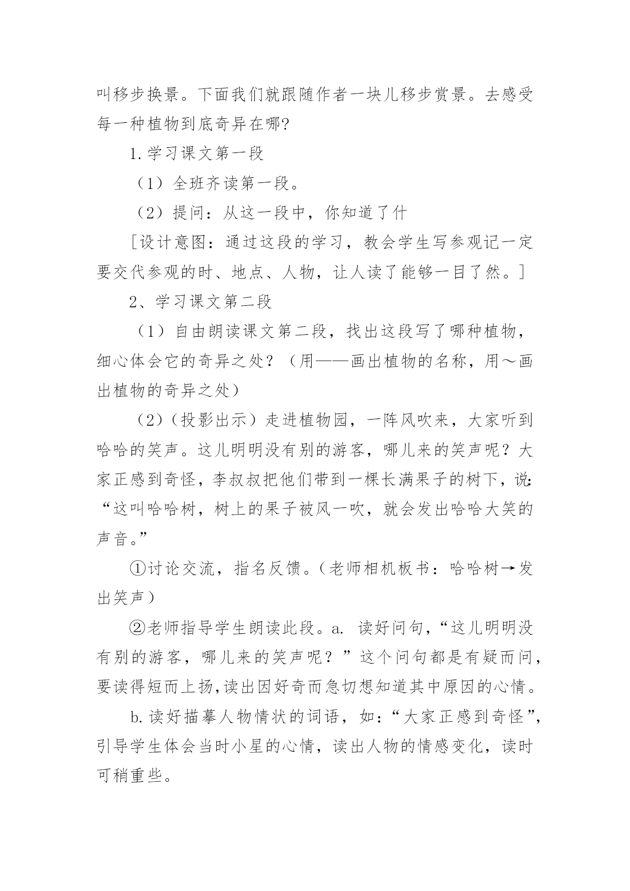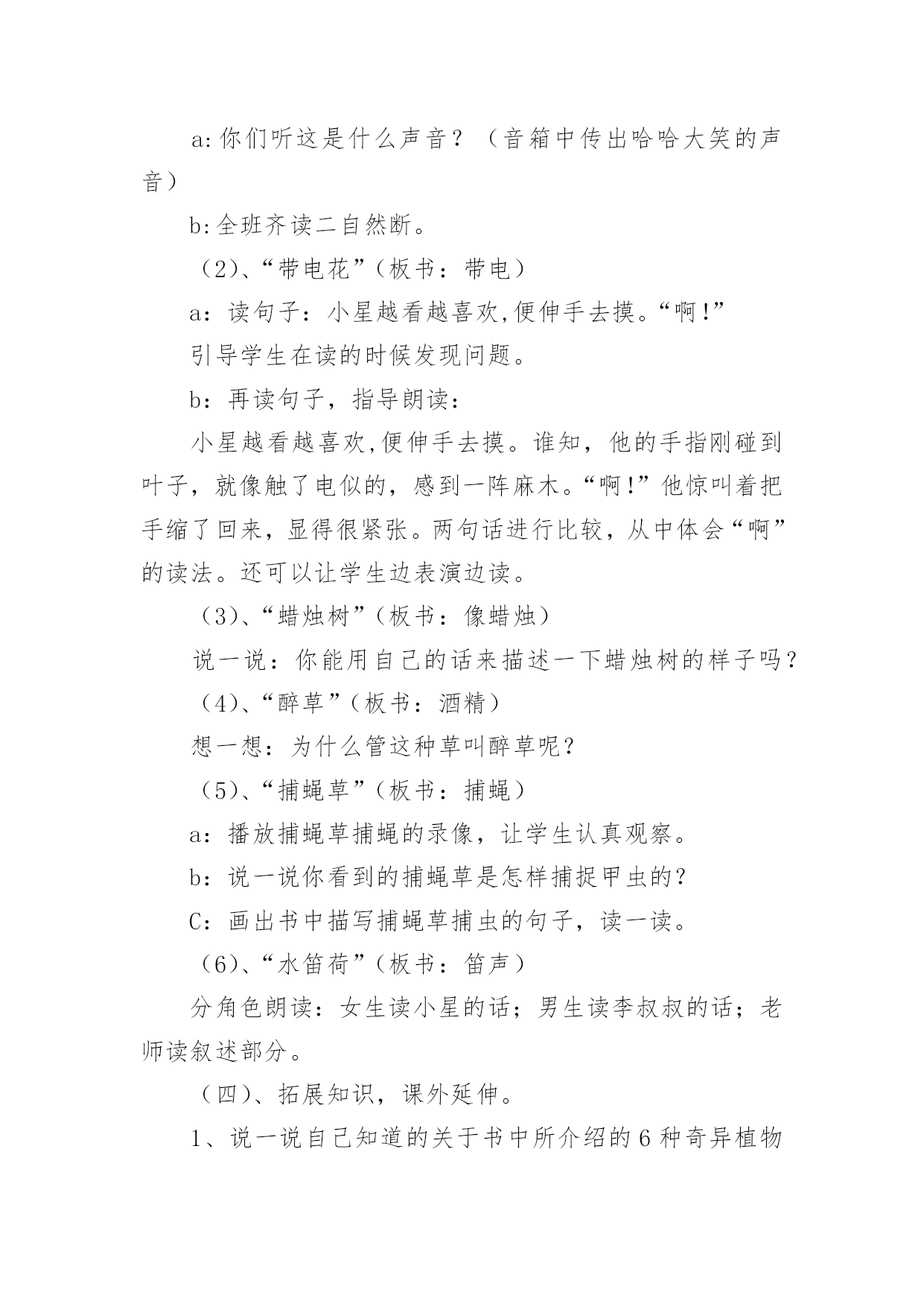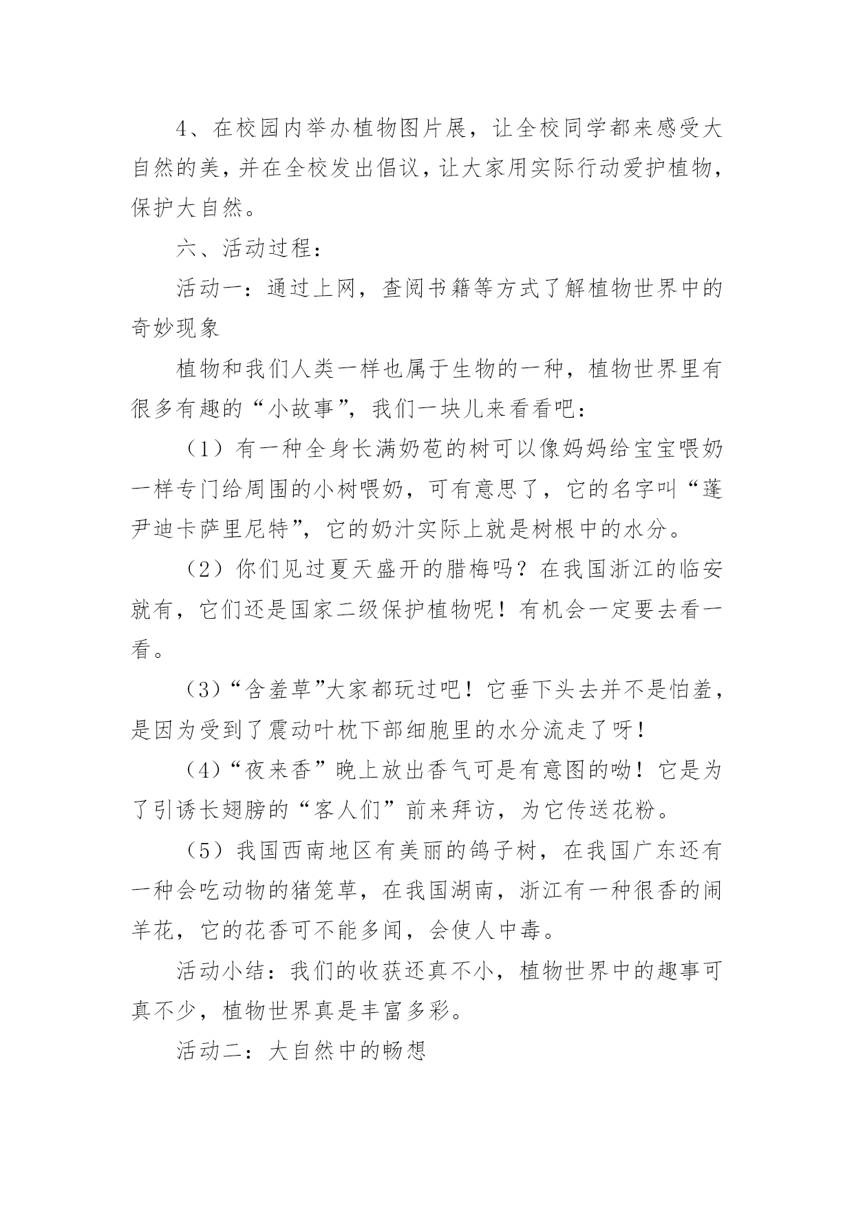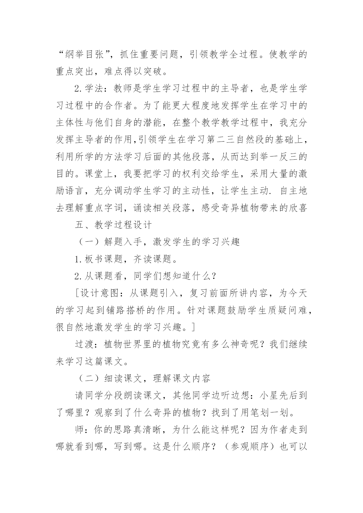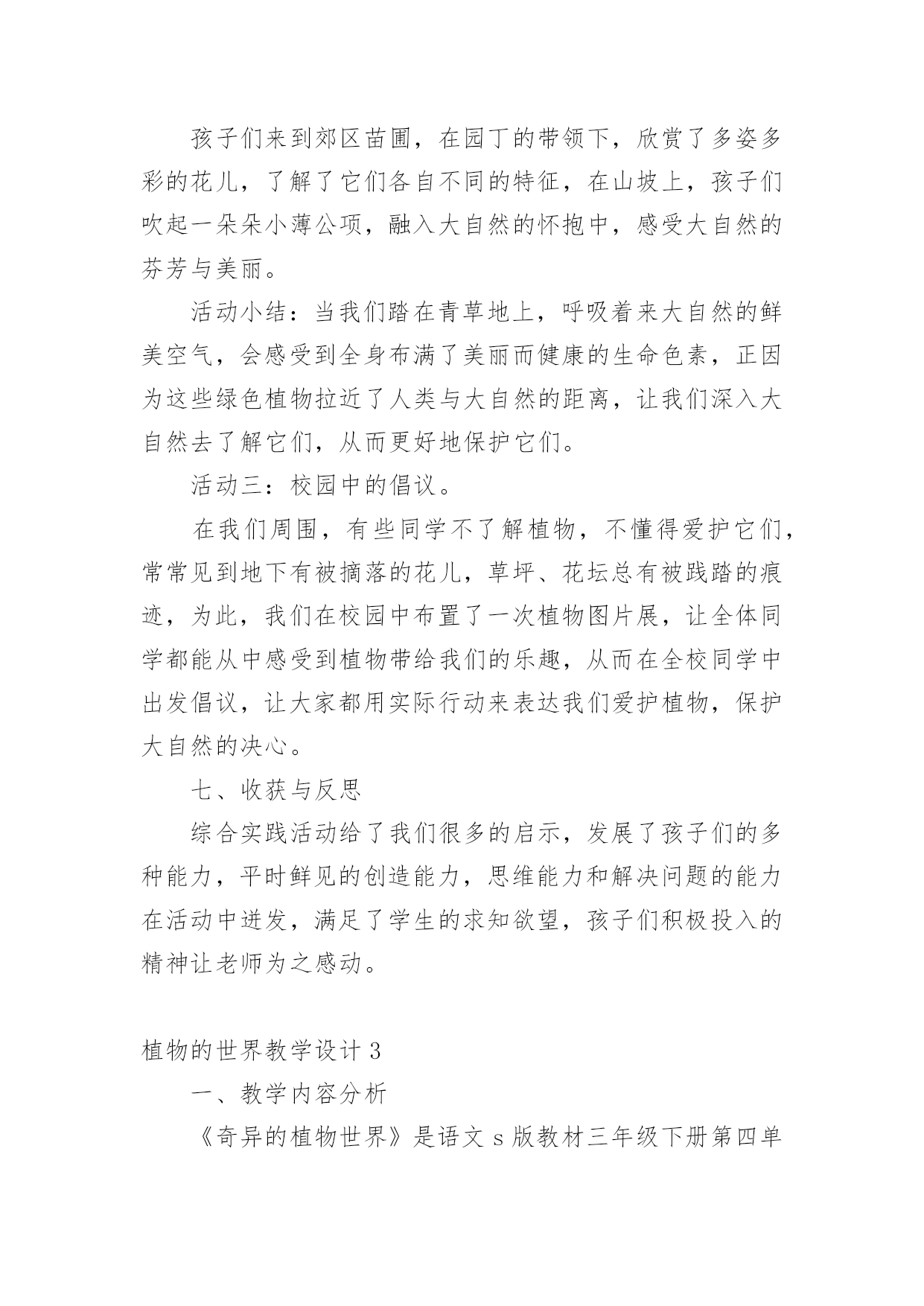 植物的世界教学设计作为一名教师,就难以避免地要准备教学设计,编写教学设计有利于我们科学、合理地支配课堂时间。写教学设计需要注意哪些格式呢?以下是小编收集整理的植物的世界教学设计,仅供参考,大家一起来看看吧。植物的世界教学设计1一、教学目标:1、能够按照游览的经过给课文理清写作顺序。2、有感情的朗读课文,复述课文。3、认识奇异的植物世界,了解书中介绍的每种植物的奇异特点。4、增强学生的语文概括能力,独立阅读能力,动手操作能力,让学生认识大自然,热爱大自然,热爱生活。5、通过查阅资料,阅读书籍,资源共享,增长学生关于植物方面的知识。二、教学重点:了解每种植物奇异的特点。三、教学难点:独立阅读,讲述每种植物的奇异之处,并能在朗读中有所感悟。四、教学准备:教学课件、植物名称卡片。五、教学流程:(一)、情趣导入,引起学生的兴趣。在我们美丽的地球上,生长着各种各样的植物。花、草、树、木随处可见,下面老师要为大家介绍一种十分有趣的植物。你们看!(播放录像)(板书课题:15、奇异的植物世界)学生齐读课题。(二)、整体感知,了解内容。1、检查预习生字词情况。(课件出示字词认读)2、指名读课文,思考:书中向我们介绍了哪几种奇异的植物?3、画出植物的名称。(相机把写有植物名称的卡片贴在黑板上。)三、学生自主合作学习,探究新知。1、出示表格,讲清填写要求。(点击课件)2、出示自学要求:(1)、默读课文,试着自己填一填表格。(2)、把表格带到小组中去讨论学习,同学互相补充。3、汇报学习的成果。(1)、出示学生自填的表格。(2)、学生纠错并修改手中的表格。4、说一说:你对哪种植物最感兴趣?为什么?读一读相关段落。5、自由讲述、评议,教师相机引导学习。(1)“哈哈树”(板书:会笑)a:你们听这是什么声音?(音箱中传出哈哈大笑的声音)b:全班齐读二自然断。(2)、“带电花”(板书:带电)a:读句子:小星越看越喜欢,便伸手去摸。“啊!”引导学生在读的时候发现问题。b:再读句子,指导朗读:小星越看越喜欢,便伸手去摸。谁知,他的手指刚碰到叶子,就像触了电似的,感到一阵麻木。“啊!”他惊叫着把手缩了回来,显得很紧张。两句话进行比较,从中体会“啊”的读法。还可以让学生边表演边读。(3)、“蜡烛树”(板书:像蜡烛)说一说:你能用自己的话来描述一下蜡烛树的样子吗?(4)、“醉草”(板书:酒精)想一想:为什么管这种草叫醉草呢?(5)、“捕蝇草”(板书:捕蝇)a:播放捕蝇草捕蝇的录像,让学生认真观察。b:说一说你看到的捕蝇草是怎样捕捉甲虫的?C:画出书中描写捕蝇草捕虫的句子,读一读。(6)、“水笛荷”(板书:笛声)分角色朗读:女生读小星的话;男生读李叔叔的话;老师读叙述部分。(四)、拓展知识,课外延伸。1、说一说自己知道的关于书中所介绍的6种奇异植物的知识。2、你还知道哪些奇异的.植物?3、播放“见血封喉树”的录像。4、观赏奇花的图片。(五)、综合实践,展现才华。1、猜谜:不听不知道,风吹树会笑。只要它一笑,烦恼全忘掉。2、学生小组合作,选一种书中你最感兴趣的植物,像老师一样写一句顺口溜;编一条谜语;编一首小诗;写一首儿歌。介绍出这种植物的奇异之处。3、学生展示作品(略)(六)、寓情于读,升华情感。在自然界里有许许多多的植物,它们犹如天上的繁星数也数不清。今天我们所了解的植物只是其中的一点点。可是随着你们渐渐长大,看的书越来越多,就会发现和了解更多奇异的植物。老师愿你们能插上智慧的翅膀,将来去探索植物世界的奥秘。最后,让我们满怀深情的齐读课文的最后一段:多么奇异的植物世界啊!植物的世界教学设计2一、活动概要:在美妙的大自然中,生长着各种各样的草,五颜六色的花,是它们把我们的生活装扮得五彩缤纷,多姿多彩。正因为有了它们,我们才拥有了这生机勃勃的世界。在语文课本中,孩子们从《植物妈妈有办法》中对奇妙的植物世界产生了浓厚的兴趣。从《苹果落地》的故事中孩子们学会了观察与思考,学会了动脑筋探究问题的答案。植物世界中美丽的花、绿绿的草,它们也有生命吗?它们吃什么?喝什么?它们也要睡觉吗?让我们到大然中去揭示植物世界的奥秘吧!二、活动目标:1、通过形式多样的实践活动,让孩子们开拓视野,开拓思维,融入充满生机的大自然中,找寻植物的奥秘。2、从小培养孩子们的合作探究意识,让他们学会通过自己的努力,依靠自己的能力,去解决问题。三、活动对象:二年级六班的全体学生四、主题选择:综合实践活动主题要基于学生的需要、兴趣、直接体验,设计和实施相关活动,因此,根据全班同学的兴趣,经过讨论我们选择了这个课题:《奇妙的植物世界》。五、活动安排。1、通过上网、查阅书籍、交谈等方式,了解关于奇妙植物的`资料。2、到郊区苗圃实地观察一些植物,通过和园丁的交谈进一步深入了解植物。3、整理资料,开展一次总结会,谈谈并