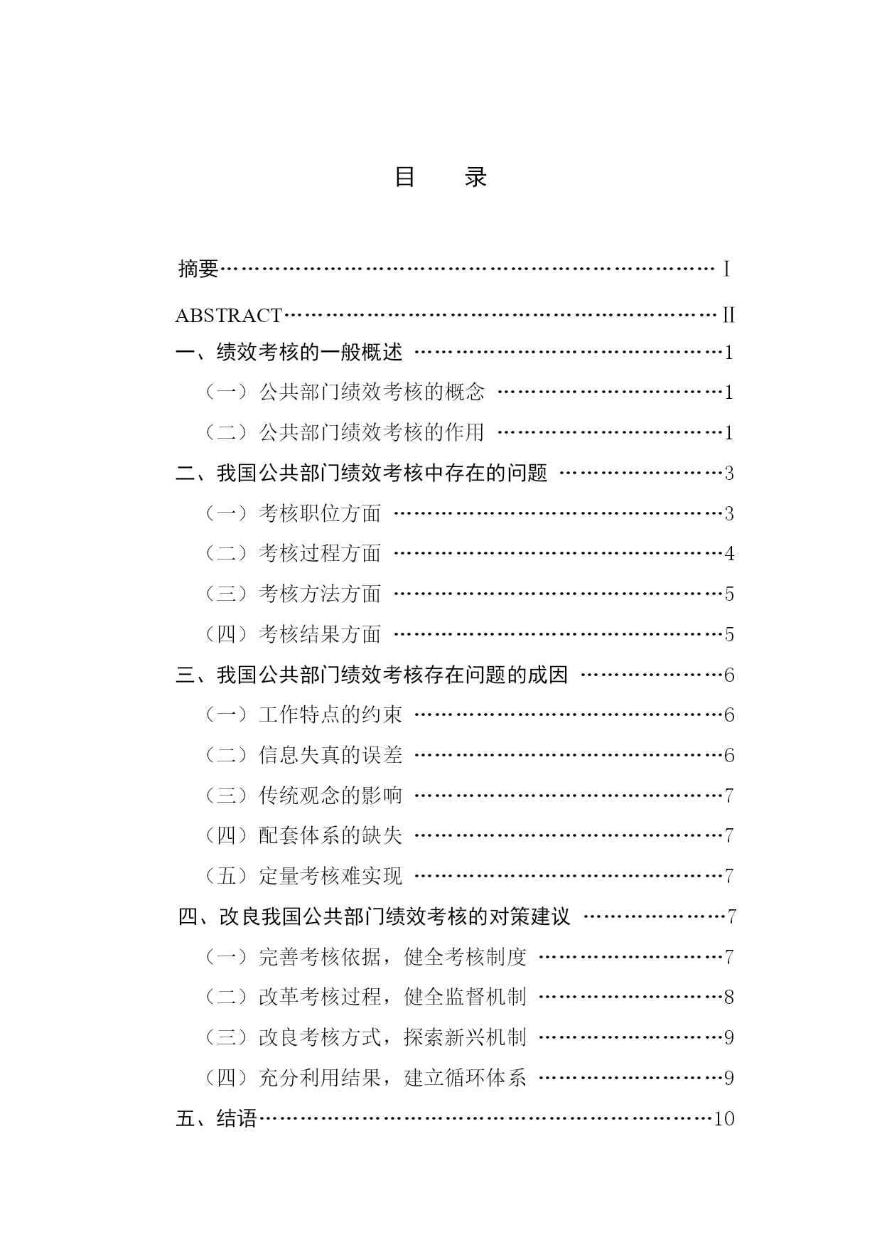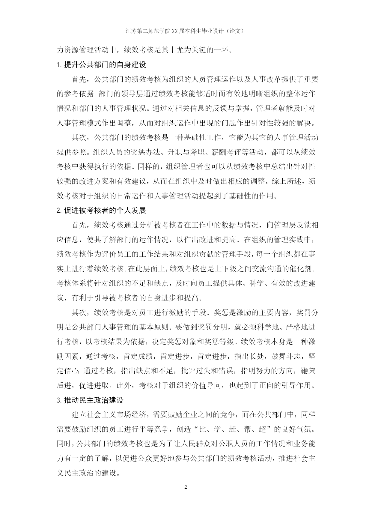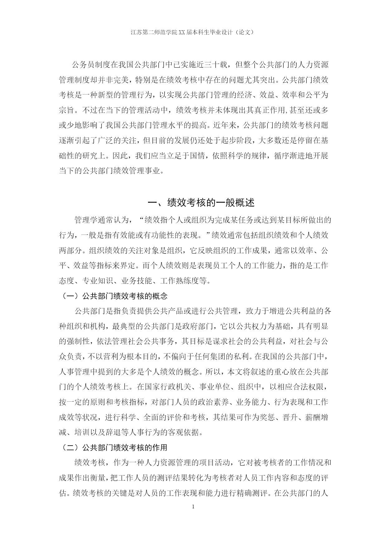 本科生毕业设计(论文)浅析公共部门绩效考核中的问题与对策所在学院:经济与法政学院专业:人力资源管理姓名:江宁学号:1340330015指导教师:王莉娟完成日期:2017年4月10日目录摘要………………………………………………………………ⅠABSTRACT………………………………………………………Ⅱ一、绩效考核的一般概述………………………………………1(一)公共部门绩效考核的概念……………………………1(二)公共部门绩效考核的作用……………………………1二、我国公共部门绩效考核中存在的问题……………………3(一)考核职位方面…………………………………………3(二)考核过程方面…………………………………………4(三)考核方法方面…………………………………………5(四)考核结果方面…………………………………………5三、我国公共部门绩效考核存在问题的成因…………………6(一)工作特点的约束………………………………………6(二)信息失真的误差………………………………………6(三)传统观念的影响………………………………………7(四)配套体系的缺失………………………………………7(五)定量考核难实现………………………………………7四、改良我国公共部门绩效考核的对策建议…………………7(一)完善考核依据,健全考核制度………………………7(二)改革考核过程,健全监督机制………………………8(三)改良考核方式,探索新兴机制………………………9(四)充分利用结果,建立循环体系………………………9五、结语…………………………………………………………10参考文献………………………………………………………11PAGE\*MERGEFORMATII摘要绩效考核起源于西方发达国家,是一种全新的管理模式。在我国各级公共部门中,绩效考核制度正在作为一项重要的改革内容而得到广泛的运用,但我国在现实运用当中,出现了各种各样的问题。从宏观角度来讲,我国公共部门绩效管理的问题主要存在于内部的制度基础和外部的社会环境之中。对于我国公共部门绩效考核中出现的各种不良现状,我们必须寻找出相应的对策,让绩效考核得以发挥其真正的作用。本文提出了具体实施的对策、建议,包括制度的再造与完善、对评估机制的完善、明确目标、考核指标具体化、完善绩效激励、做到以结果为本、重视绩效反馈环节在绩效管理的重要性、对社会环境的优化等等。关键词:HYPERLINK"http://www.cnki.net/KCMS/detail//kcms/detail/search.aspx?dbcode=CMFD&sfield=kw&skey=%e5%85%ac%e5%85%b1%e9%83%a8%e9%97%a8%e7%bb%a9%e6%95%88%e7%ae%a1%e7%90%86"\t"http://www.cnki.net/KCMS/detail/_blank"公共部门;HYPERLINK"http://www.cnki.net/KCMS/detail//kcms/detail/search.aspx?dbcode=CMFD&sfield=kw&skey=%e7%bb%a9%e6%95%88%e8%80%83%e6%a0%b8"\t"http://www.cnki.net/KCMS/detail/_blank"绩效考核;绩效管理ABSTRACTOriginatedinwesterndevelopedcountries,performancemanagementisakindofbrand-newmanagementpattern,itsgoalistorealizethemanagementofpublicsectoreconomy,efficiency,benefitandfairness.Butintherealuseofinourcountry,allkindsofproblems,someoftheperformancemanagementandperformanceevaluationinthepublicsectoroftenconfusingconcept.Forourcountry'spublicsectorperformancemanagementinallkindsofbadpresentsituation,wemustfindoutthecorrespondingcountermeasure,makeperformancemanagementtoplayitsrealrole.thispaperputsforw
