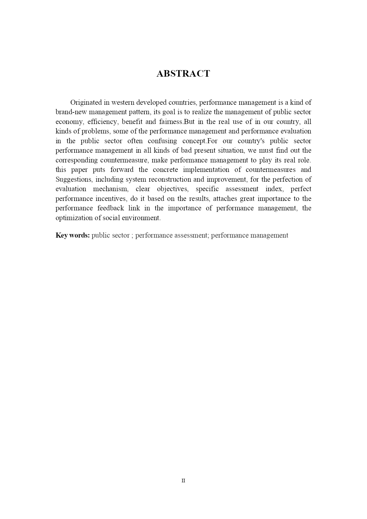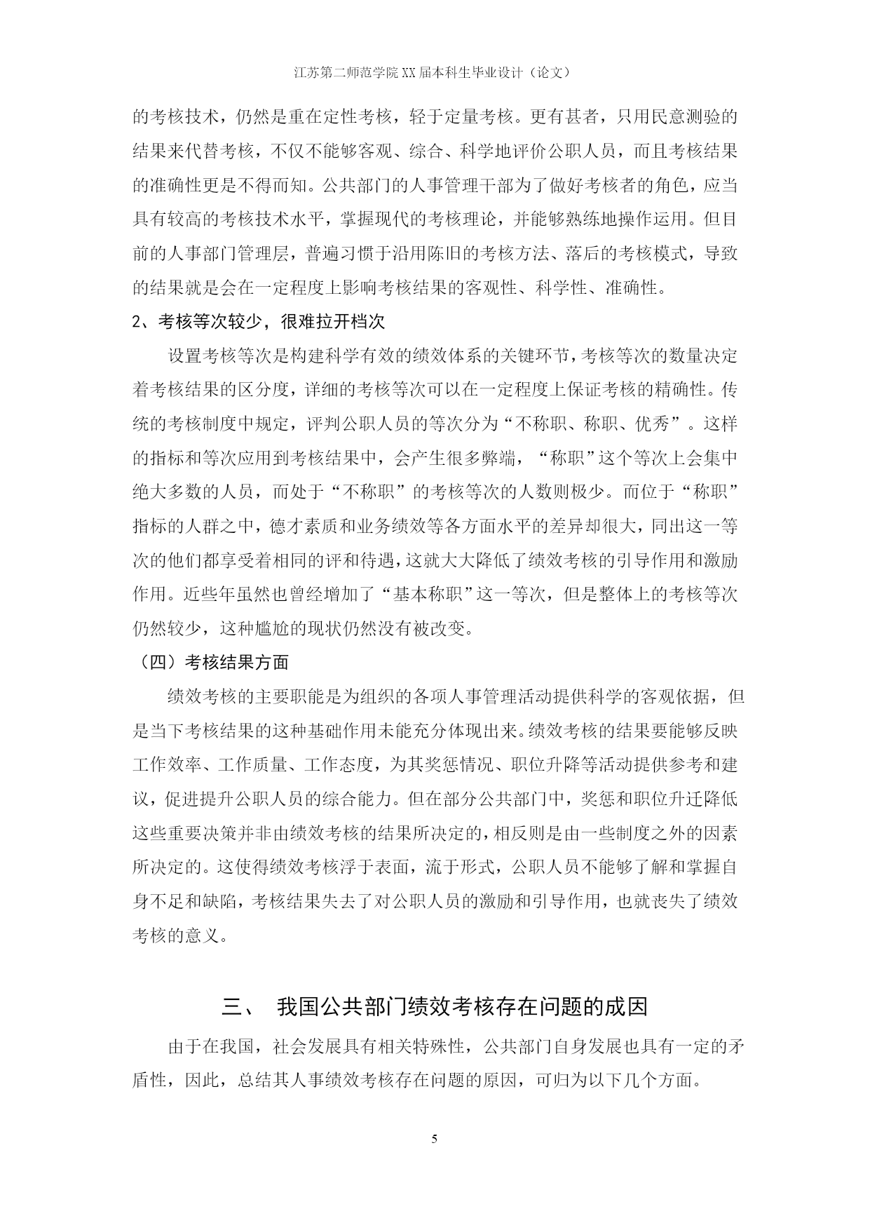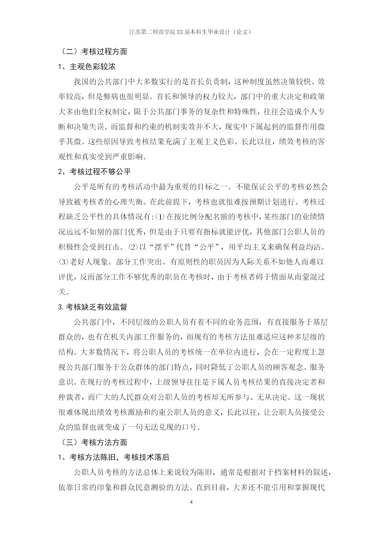 本科生毕业设计(论文)浅析公共部门绩效考核中的问题与对策所在学院:经济与法政学院专业:人力资源管理姓名:江宁学号:1340330015指导教师:王莉娟完成日期:2017年4月10日目录摘要………………………………………………………………ⅠABSTRACT………………………………………………………Ⅱ一、绩效考核的一般概述………………………………………1(一)公共部门绩效考核的概念……………………………1(二)公共部门绩效考核的作用……………………………1二、我国公共部门绩效考核中存在的问题……………………3(一)考核职位方面…………………………………………3(二)考核过程方面…………………………………………4(三)考核方法方面…………………………………………5(四)考核结果方面…………………………………………5三、我国公共部门绩效考核存在问题的成因…………………6(一)工作特点的约束………………………………………6(二)信息失真的误差………………………………………6(三)传统观念的影响………………………………………7(四)配套体系的缺失………………………………………7(五)定量考核难实现………………………………………7四、改良我国公共部门绩效考核的对策建议…………………7(一)完善考核依据,健全考核制度………………………7(二)改革考核过程,健全监督机制………………………8(三)改良考核方式,探索新兴机制………………………9(四)充分利用结果,建立循环体系………………………9五、结语…………………………………………………………10参考文献………………………………………………………11PAGE\*MERGEFORMATII摘要绩效考核起源于西方发达国家,是一种全新的管理模式。在我国各级公共部门中,绩效考核制度正在作为一项重要的改革内容而得到广泛的运用,但我国在现实运用当中,出现了各种各样的问题。从宏观角度来讲,我国公共部门绩效管理的问题主要存在于内部的制度基础和外部的社会环境之中。对于我国公共部门绩效考核中出现的各种不良现状,我们必须寻找出相应的对策,让绩效考核得以发挥其真正的作用。本文提出了具体实施的对策、建议,包括制度的再造与完善、对评估机制的完善、明确目标、考核指标具体化、完善绩效激励、做到以结果为本、重视绩效反馈环节在绩效管理的重要性、对社会环境的优化等等。关键词:HYPERLINK"http://www.cnki.net/KCMS/detail//kcms/detail/search.aspx?dbcode=CMFD&sfield=kw&skey=%e5%85%ac%e5%85%b1%e9%83%a8%e9%97%a8%e7%bb%a9%e6%95%88%e7%ae%a1%e7%90%86"\t"http://www.cnki.net/KCMS/detail/_blank"公共部门;HYPERLINK"http://www.cnki.net/KCMS/detail//kcms/detail/search.aspx?dbcode=CMFD&sfield=kw&skey=%e7%bb%a9%e6%95%88%e8%80%83%e6%a0%b8"\t"http://www.cnki.net/KCMS/detail/_blank"绩效考核;绩效管理ABSTRACTOriginatedinwesterndevelopedcountries,performancemanagementisakindofbrand-newmanagementpattern,itsgoalistorealizethemanagementofpublicsectoreconomy,efficiency,benefitandfairness.Butintherealuseofinourcountry,allkindsofproblems,someoftheperformancemanagementandperformanceevaluationinthepublicsectoroftenconfusingconcept.Forourcountry'spublicsectorperformancemanagementinallkindsofbadpresentsituation,wemustfindoutthecorrespondingcountermeasure,makeperformancemanagementtoplayitsrealrole.thispaperputsforw