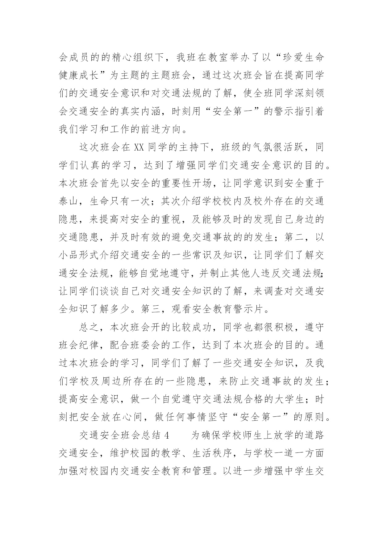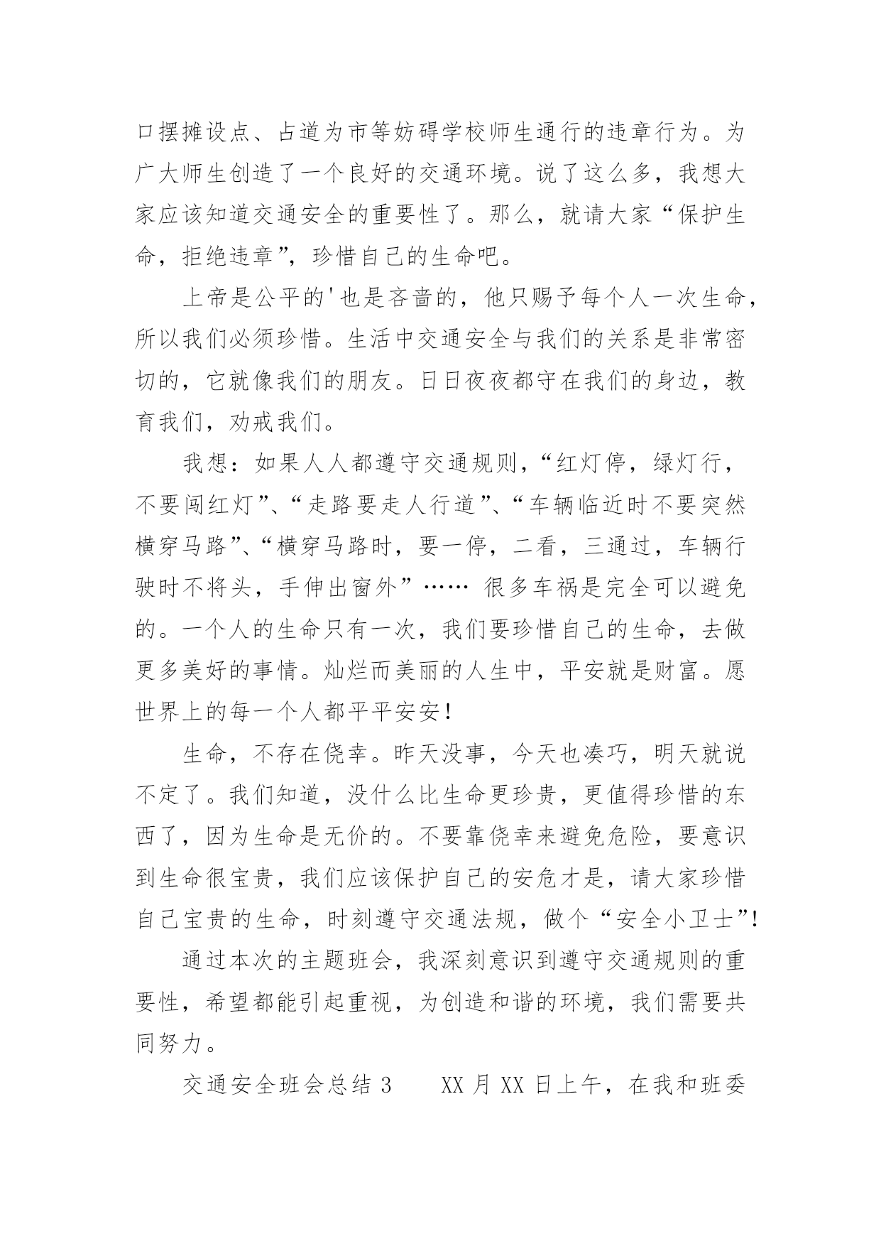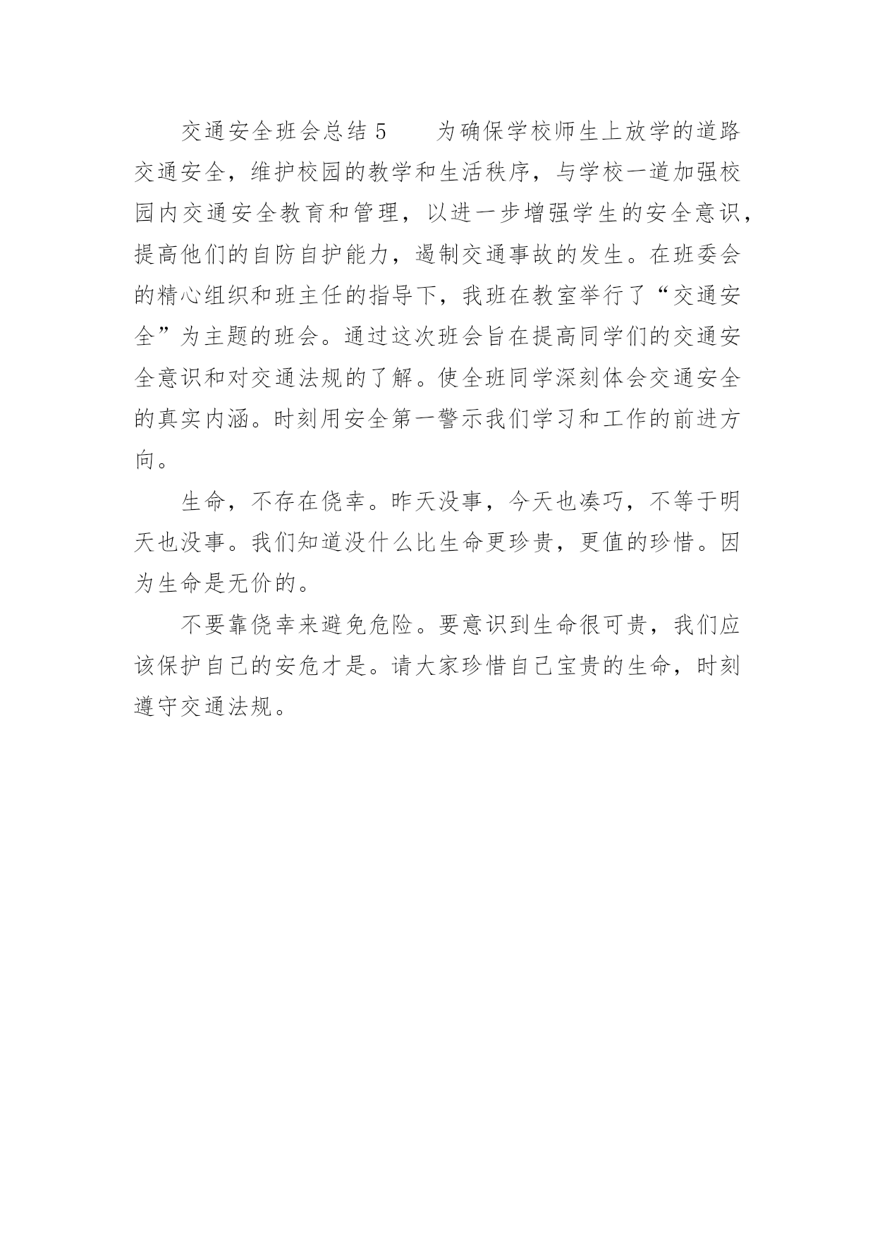 交通安全班会总结交通安全班会总结(精选5篇)总结是在某一时期、某一项目或某些工作告一段落或者全部完成后进行回顾检查、分析评价,从而得出教训和一些规律性认识的一种书面材料,它能使我们及时找出错误并改正,是时候写一份总结了。总结一般是怎么写的呢?以下是小编为大家收集的交通安全班会总结(精选5篇),仅供参考,欢迎大家阅读。交通安全班会总结1近期我国一些地方校车交通事故时有发生,为进一步消除安全隐患,增强安全防范意识,维护校园生活秩序的正常进行,保障广大学生的人身和财产安全,有效预防和减少安全事故的发生,根据上级教育部门关于加强校车安全管理和通知精神,三年级各班按校指示都开展了交通安全主题班会活动。通过这次活动旨在教育学生懂得安全知识,使同学们树立安全意识,了解安全常识,学会自我保护,提高同学们的交通安全意识和对交通法规的了解及应变能力,尽可能减少和杜绝各种意外伤害事故的发生,学会保护自己生命并重视自我生命的价值。各班主题班会在中队长的主持下,班级的气氛都很活跃,同学们学习十分认真,达到了增强同学们交通安全意识的目的。各班班会首先以安全的重要性开场,让同学们都能意识到安全重于泰山,生命只有一次;其次介绍咱们学校校内及校外存在的交通隐患,来提高对安全的重视,及能够及时的发现自己身边的交通隐患,并能及时有效的避免交通事故的发生;然后学习《xx小学学生乘坐校车安全制度》和介绍交通安全的一些常识及知识,让同学们知道乘坐校车时应该怎么做和不应怎么做及了解交通安全法规,从而让学生能够自觉地遵守,并阻止其他人违反交通法规;最后引导学生讨论“在生活中如何遵守交通安全?”和知识抢答,通过讨论和抢答达到全班互动,活跃班会气氛的同时并掌握了一些交通安全知识。总之,本级各班主题班会都开的非常成功,同学都很积极参与活动,能让学生深刻意识到遵守交通规则的重要性和学习到一些交通安全知识,及了解我们学校及周边所存在的一些隐患,来防止交通事故的发生,提高安全意识,做一个自觉遵守交通法规合格的小学生;时刻把安全放在心间,做任何事情坚守“安全第一”。交通安全班会总结2转眼又到班会时,今天的主题是交通安全。说起这个主题,它与我们的生活息息相关,贴近群众,贴近现实。回望近段时间的新闻报道,交通事故的无处不在,铁路,公路等。在班会中,首先由班委对这次活动做个开场白。随着班会的进行,大家都积极踊跃发言,说出自己身边的交通事情,带动了班会的气氛,将本次活动瞬间推向高潮。最后,通过对这个话题的激烈讨论,引起了大家对这个问题的重视,让大家深刻感受到遵守交通规则的重要性。同时,也体会到了生命的脆弱。人让车,让出一片温情,让出一片秩序;车让人,让出一片安全,让出一片理解。在这个世界上,只有人与车互相谦让,才能尽可能地避免交通事故的发生,减少死亡的人数,珍爱宝贵的生命。生命是惟一的,是宝贵的,世界因为有了生命而变的精彩。您的生命,您珍惜吗?要想生命得到保障,那就请您遵守交通规则,维护交通秩序。珍惜生命安全出行孩子是社会未来的接班人,他们能否健康成长,关系到民族的兴衰和社会的进步。育人不仅要进行智力教育,还要进行道德、纪律教育。十年树木,百年树人,交通安全宣传教育工作从幼儿学生抓起,使学生从小就接受交通安全知识教育,达到自己教育自己,自己管理自己,养成自觉遵守交通法规的良好习惯,是能达到一代人和一个社会的良好秩序的百年大计。新学期一开始,为确保学校师生上放学的道路交通安全,维护校园的教学、生活秩序,与学校一道一方面加强对校园内交通安全教育和管理。以进一步增强中小学生交通安全意识,提高他们的自防自护能力,遏制交通事故的发生。据了解,每年因各种事故,数以万计天真无邪的儿童少年死于非命,而因交通意识缺乏和淡薄引发的交通伤亡事故,在中小学生伤亡事故中占有较大的比例。中小学生的交通安全牵涉到千万个家庭的幸福,需要交警、学校、家庭和社会共同负责,齐抓共管。加强了对学校及周边交通环境的整治,坚决取缔校园门口摆摊设点、占道为市等妨碍学校师生通行的违章行为。为广大师生创造了一个良好的交通环境。说了这么多,我想大家应该知道交通安全的重要性了。那么,就请大家“保护生命,拒绝违章”,珍惜自己的生命吧。上帝是公平的'也是吝啬的,他只赐予每个人一次生命,所以我们必须珍惜。生活中交通安全与我们的关系是非常密切的,它就像我们的朋友。日日夜夜都守在我们的身边,教育我们,劝戒我们。我想:如果人人都遵守交通规则,“红灯停,绿灯行,不要闯红灯”、“走路要走人行道”、“车辆临近时不要突然横穿马路”、“横穿马路时,要一停,二看,三通过,车辆行驶时不将头,手伸出窗外”……很多车祸是完全可以避免的。一个人的生命只有一次,我们要珍惜自己的生命,去做更多美好的事情。灿烂而美丽的人生中,平安就是财富。愿世界上的每一个人都平平安安!生命,不存在