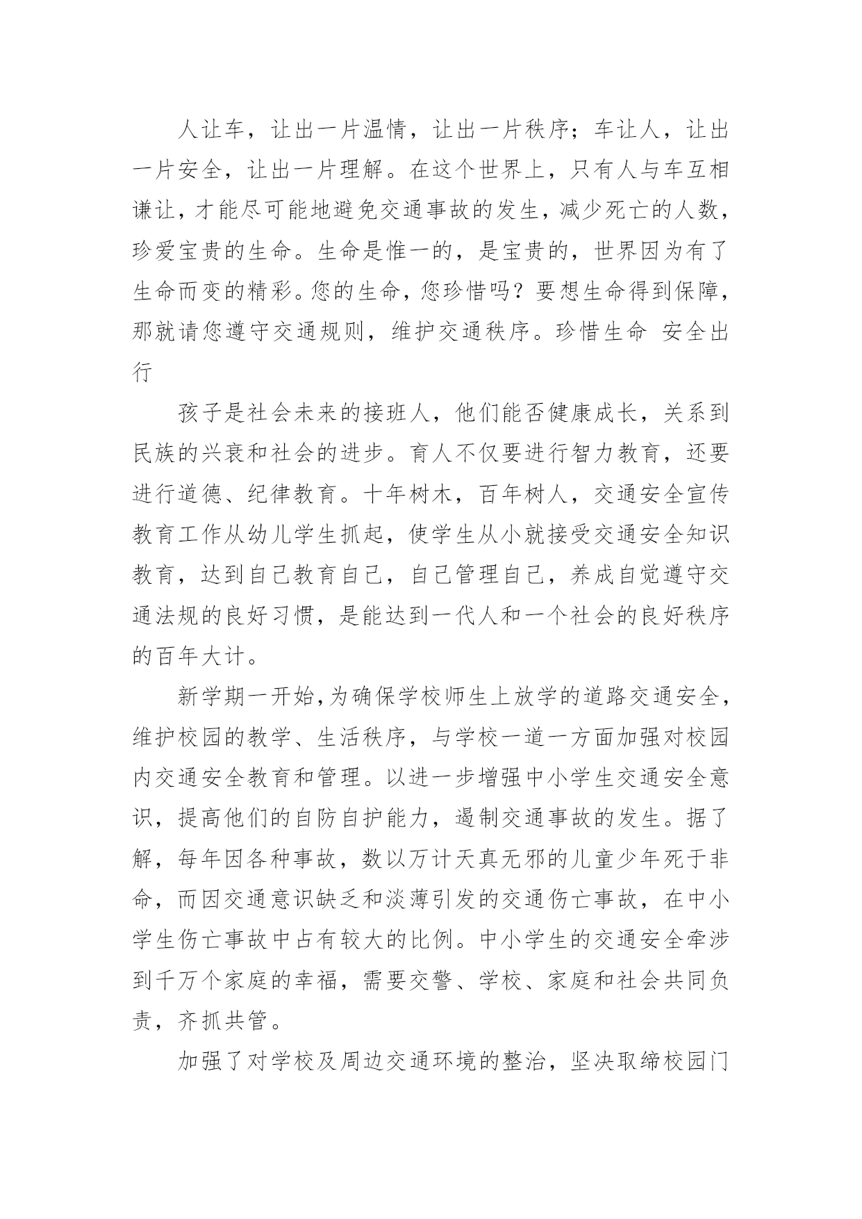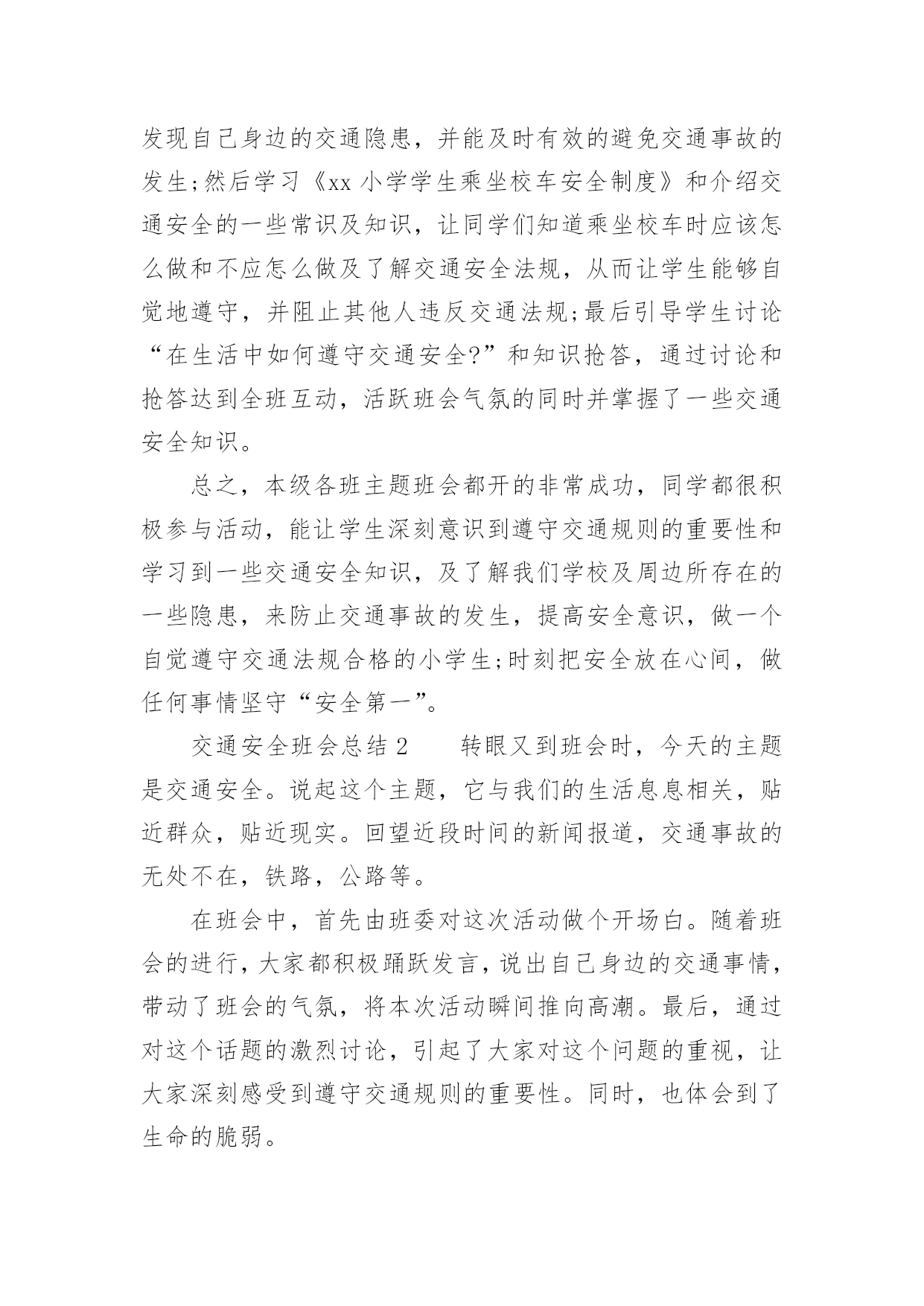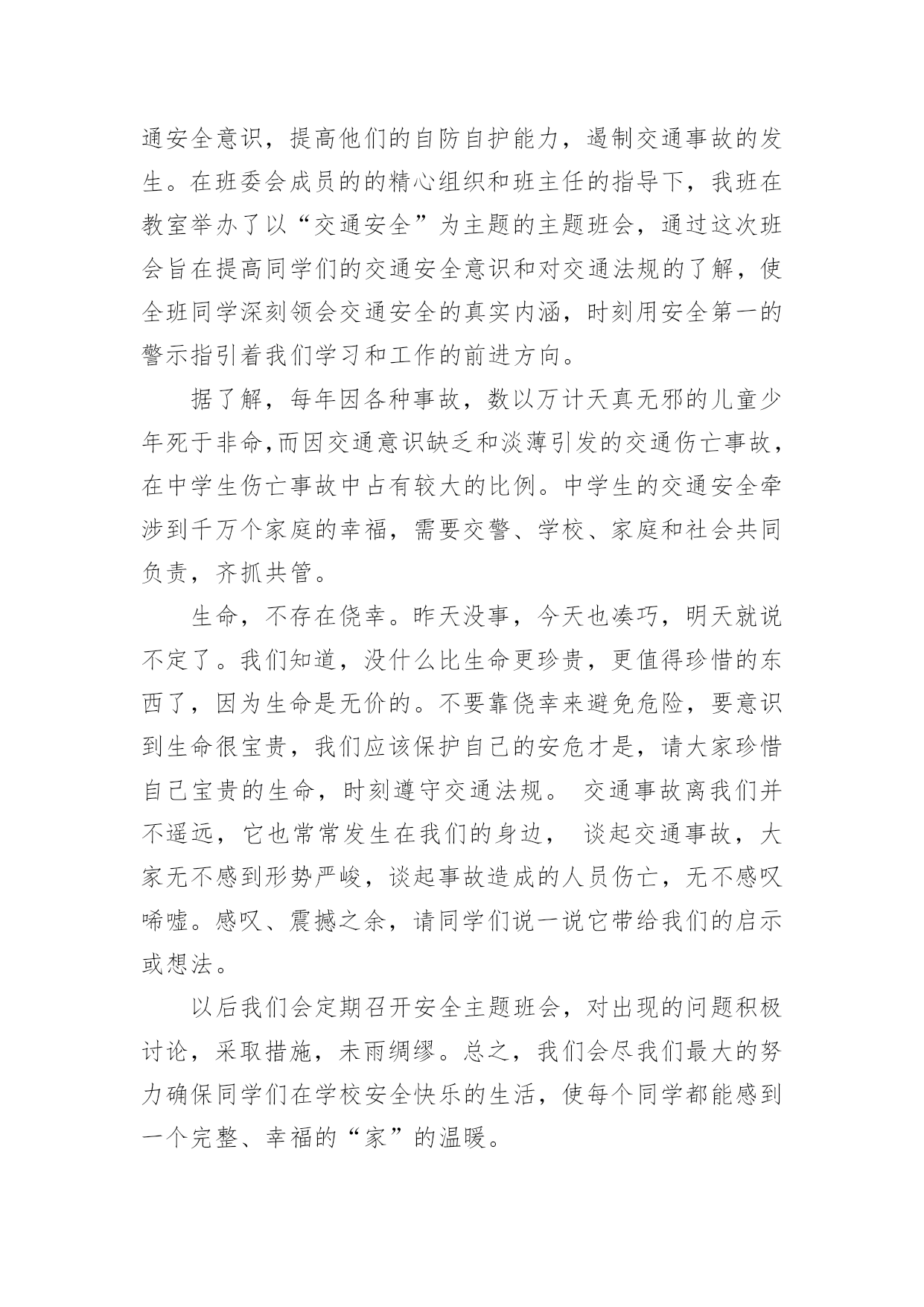 交通安全班会总结交通安全班会总结(精选5篇)总结是在某一时期、某一项目或某些工作告一段落或者全部完成后进行回顾检查、分析评价,从而得出教训和一些规律性认识的一种书面材料,它能使我们及时找出错误并改正,是时候写一份总结了。总结一般是怎么写的呢?以下是小编为大家收集的交通安全班会总结(精选5篇),仅供参考,欢迎大家阅读。交通安全班会总结1近期我国一些地方校车交通事故时有发生,为进一步消除安全隐患,增强安全防范意识,维护校园生活秩序的正常进行,保障广大学生的人身和财产安全,有效预防和减少安全事故的发生,根据上级教育部门关于加强校车安全管理和通知精神,三年级各班按校指示都开展了交通安全主题班会活动。通过这次活动旨在教育学生懂得安全知识,使同学们树立安全意识,了解安全常识,学会自我保护,提高同学们的交通安全意识和对交通法规的了解及应变能力,尽可能减少和杜绝各种意外伤害事故的发生,学会保护自己生命并重视自我生命的价值。各班主题班会在中队长的主持下,班级的气氛都很活跃,同学们学习十分认真,达到了增强同学们交通安全意识的目的。各班班会首先以安全的重要性开场,让同学们都能意识到安全重于泰山,生命只有一次;其次介绍咱们学校校内及校外存在的交通隐患,来提高对安全的重视,及能够及时的发现自己身边的交通隐患,并能及时有效的避免交通事故的发生;然后学习《xx小学学生乘坐校车安全制度》和介绍交通安全的一些常识及知识,让同学们知道乘坐校车时应该怎么做和不应怎么做及了解交通安全法规,从而让学生能够自觉地遵守,并阻止其他人违反交通法规;最后引导学生讨论“在生活中如何遵守交通安全?”和知识抢答,通过讨论和抢答达到全班互动,活跃班会气氛的同时并掌握了一些交通安全知识。总之,本级各班主题班会都开的非常成功,同学都很积极参与活动,能让学生深刻意识到遵守交通规则的重要性和学习到一些交通安全知识,及了解我们学校及周边所存在的一些隐患,来防止交通事故的发生,提高安全意识,做一个自觉遵守交通法规合格的小学生;时刻把安全放在心间,做任何事情坚守“安全第一”。交通安全班会总结2转眼又到班会时,今天的主题是交通安全。说起这个主题,它与我们的生活息息相关,贴近群众,贴近现实。回望近段时间的新闻报道,交通事故的无处不在,铁路,公路等。在班会中,首先由班委对这次活动做个开场白。随着班会的进行,大家都积极踊跃发言,说出自己身边的交通事情,带动了班会的气氛,将本次活动瞬间推向高潮。最后,通过对这个话题的激烈讨论,引起了大家对这个问题的重视,让大家深刻感受到遵守交通规则的重要性。同时,也体会到了生命的脆弱。人让车,让出一片温情,让出一片秩序;车让人,让出一片安全,让出一片理解。在这个世界上,只有人与车互相谦让,才能尽可能地避免交通事故的发生,减少死亡的人数,珍爱宝贵的生命。生命是惟一的,是宝贵的,世界因为有了生命而变的精彩。您的生命,您珍惜吗?要想生命得到保障,那就请您遵守交通规则,维护交通秩序。珍惜生命安全出行孩子是社会未来的接班人,他们能否健康成长,关系到民族的兴衰和社会的进步。育人不仅要进行智力教育,还要进行道德、纪律教育。十年树木,百年树人,交通安全宣传教育工作从幼儿学生抓起,使学生从小就接受交通安全知识教育,达到自己教育自己,自己管理自己,养成自觉遵守交通法规的良好习惯,是能达到一代人和一个社会的良好秩序的百年大计。新学期一开始,为确保学校师生上放学的道路交通安全,维护校园的教学、生活秩序,与学校一道一方面加强对校园内交通安全教育和管理。以进一步增强中小学生交通安全意识,提高他们的自防自护能力,遏制交通事故的发生。据了解,每年因各种事故,数以万计天真无邪的儿童少年死于非命,而因交通意识缺乏和淡薄引发的交通伤亡事故,在中小学生伤亡事故中占有较大的比例。中小学生的交通安全牵涉到千万个家庭的幸福,需要交警、学校、家庭和社会共同负责,齐抓共管。加强了对学校及周边交通环境的整治,坚决取缔校园门口摆摊设点、占道为市等妨碍学校师生通行的违章行为。为广大师生创造了一个良好的交通环境。说了这么多,我想大家应该知道交通安全的重要性了。那么,就请大家“保护生命,拒绝违章”,珍惜自己的生命吧。上帝是公平的'也是吝啬的,他只赐予每个人一次生命,所以我们必须珍惜。生活中交通安全与我们的关系是非常密切的,它就像我们的朋友。日日夜夜都守在我们的身边,教育我们,劝戒我们。我想:如果人人都遵守交通规则,“红灯停,绿灯行,不要闯红灯”、“走路要走人行道”、“车辆临近时不要突然横穿马路”、“横穿马路时,要一停,二看,三通过,车辆行驶时不将头,手伸出窗外”……很多车祸是完全可以避免的。一个人的生命只有一次,我们要珍惜自己的生命,去做更多美好的事情。灿烂而美丽的人生中,平安就是财富。愿世界上的每一个人都平平安安!生命,不存在