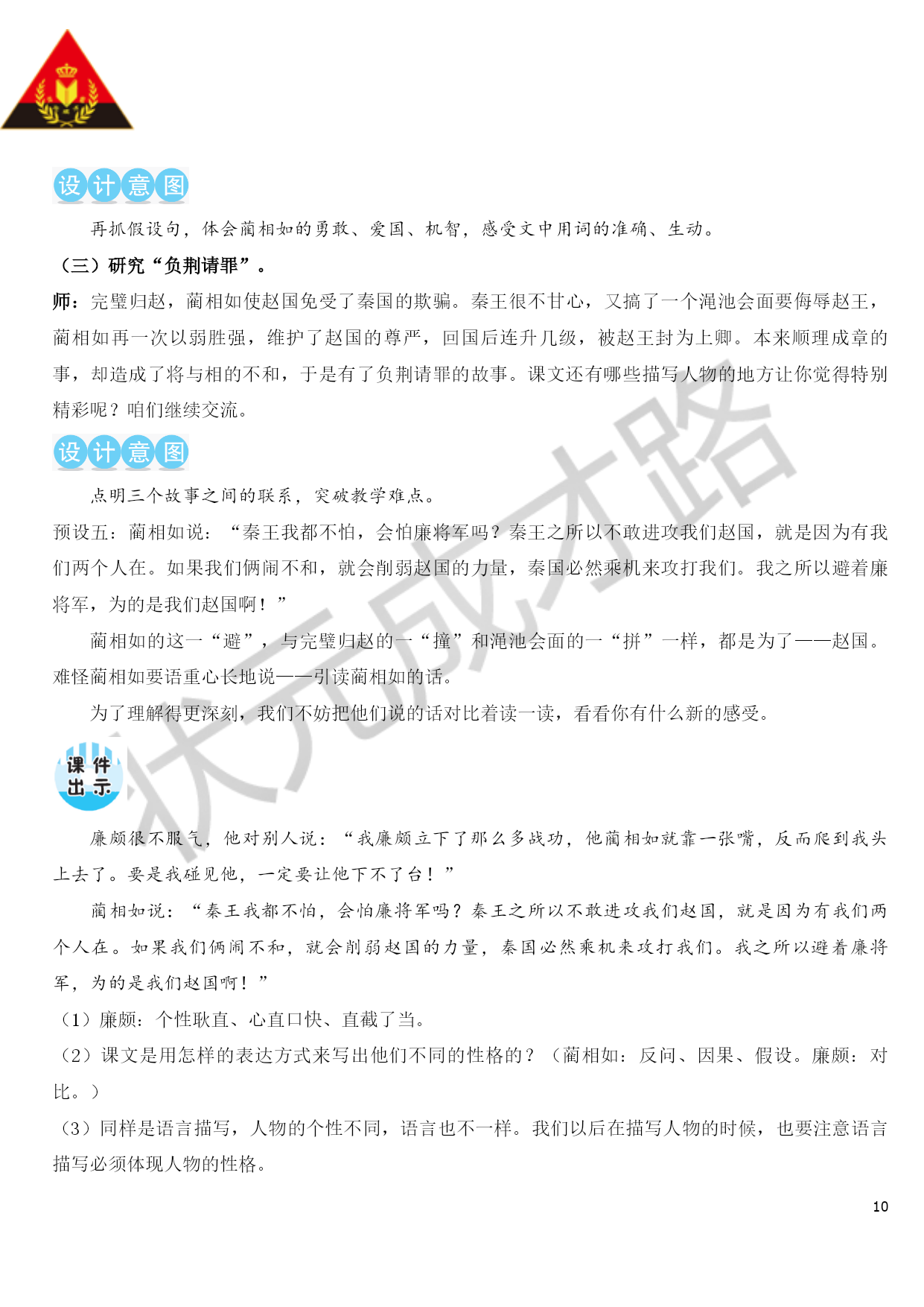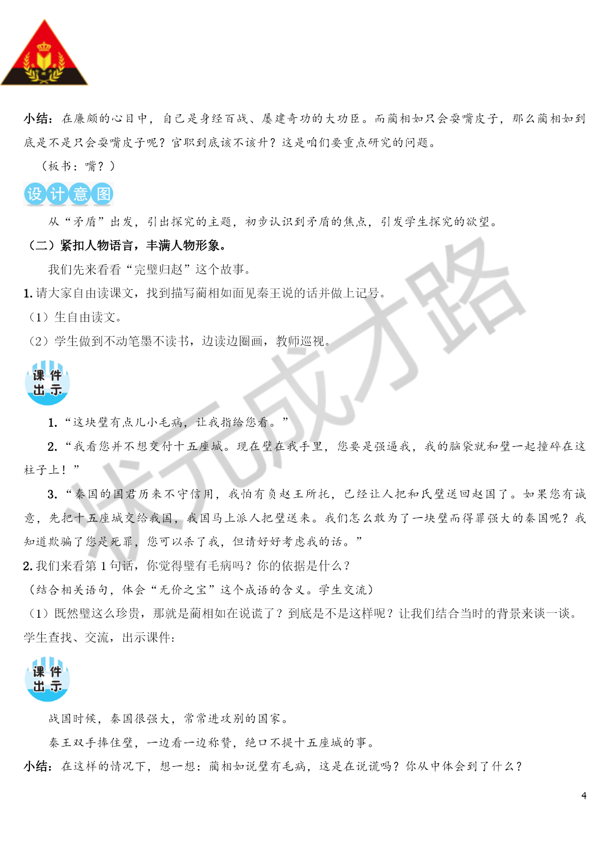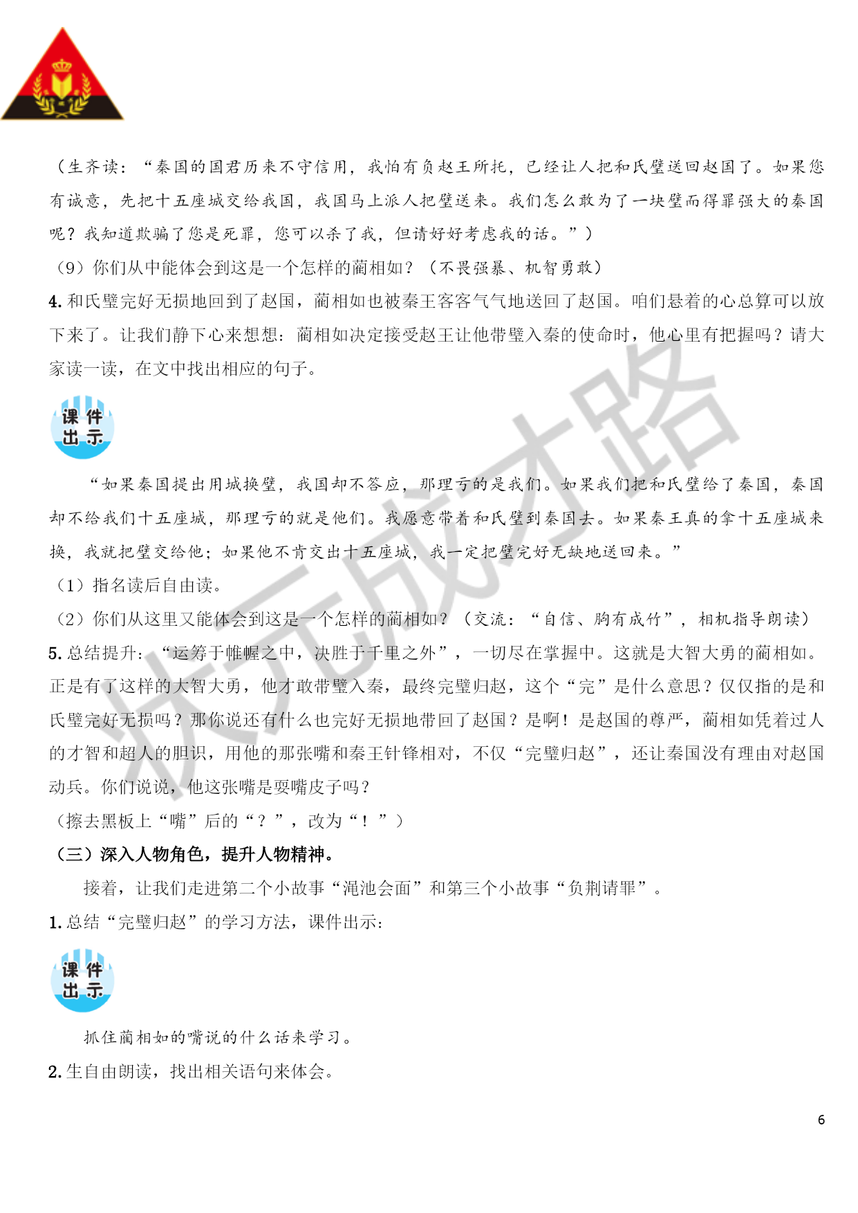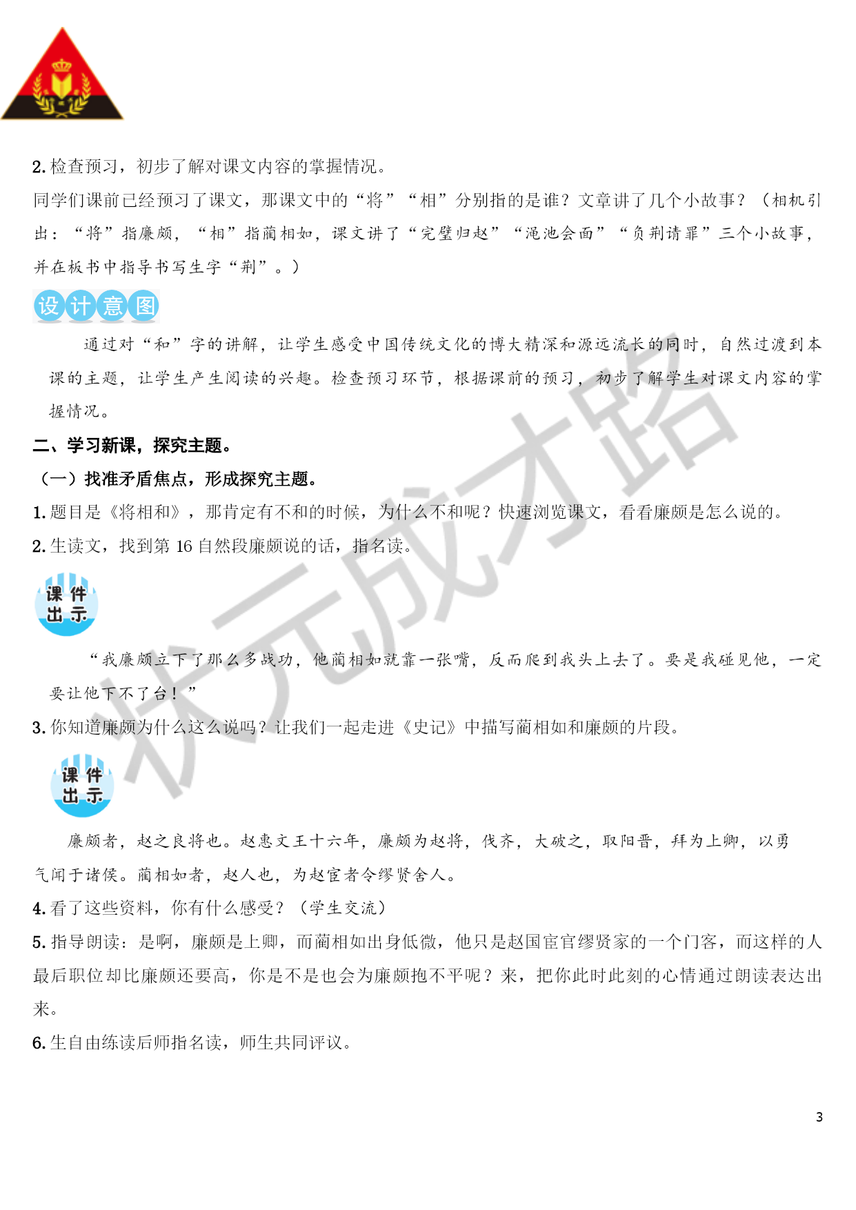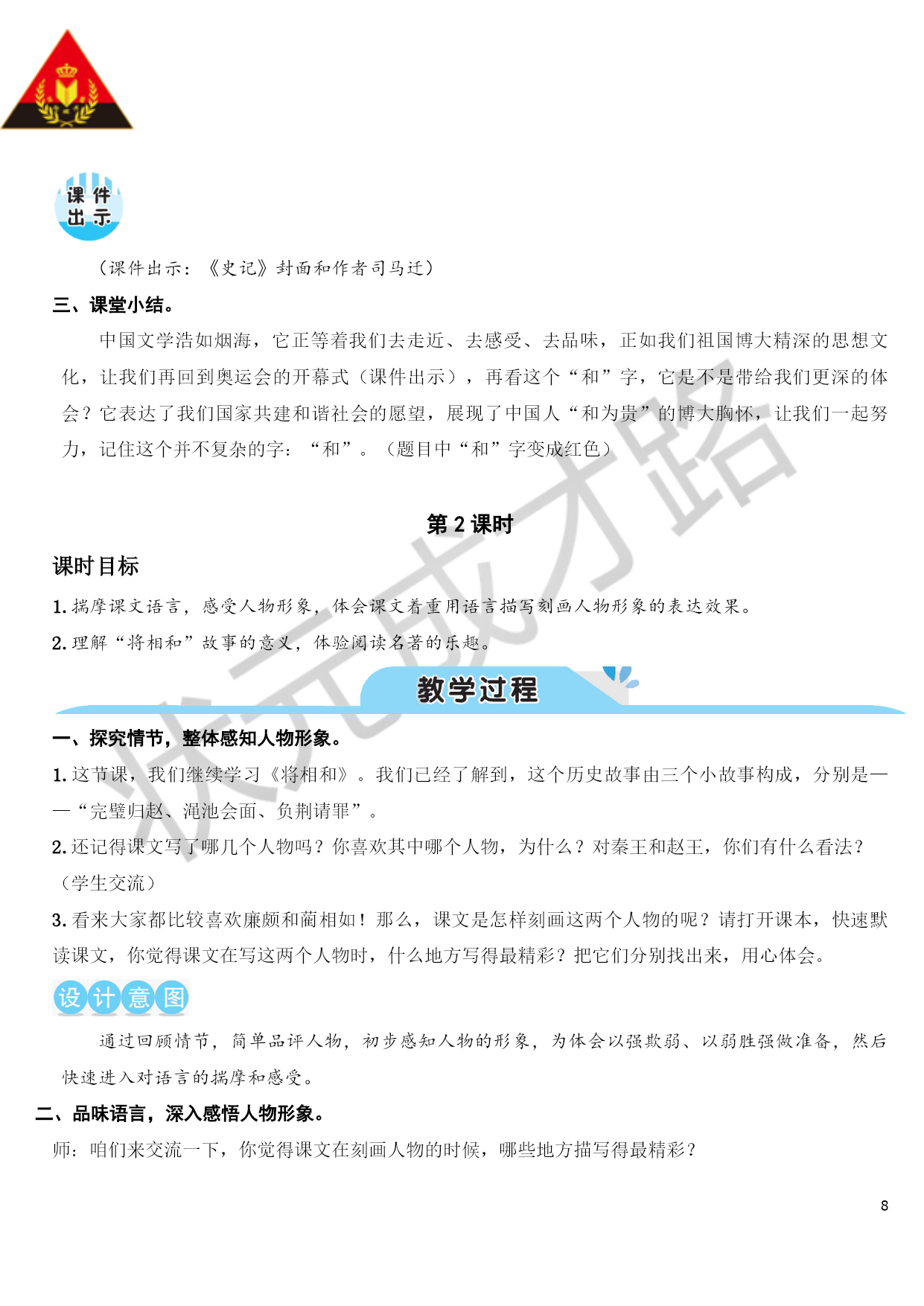 PAGEPAGE886将相和1.认识14个生字,读准2个多音字,会写12个生字;理解“完璧归赵、无价之宝”等词语的意思。2.学习速读的方法,练习速读课文,了解课文主要内容。3.有感情地朗读课文,并用自己的话讲讲这三个小故事的主要内容。4.通过人物的言行,理解人物的性格特点。重点学习速读课文的方法,练习速读课文。抓住关键词句,品味人物言行,准确概括人物的性格特点,加深对课文内容的理解,进一步加强语言感知能力。难点学习并练习速读课文,感受三个小故事之间的联系。1.字词教学。本课词汇丰富,朗读时不容易上口,要特别训练学生快速阅读时跳过难读的词句,所以要特别重视学生的初读训练。教师要提出初读要求:全神贯注,一目十行,准确抓住段落中的关键内容;再读课文,关注初读时跳过的地方,读准字音,认清字形,圈出生字词,联系上下文想想词语的意思。检查自读课文时要注意正音,“召、臣、抄”是卷舌音,“罪”是平舌音;“献、蔺”是前鼻音,“荆、卿”是后鼻音;“召”是四声,不要读成一声。有些长句子比较难读,教师要注意示范,教学生读通读顺。2.阅读理解。学习速读,读通课文,读懂句子,难读的地方多读几遍;读完之后想想课文主要写了什么,理清全文脉络,弄清故事之间的联系。弄懂三则故事的要点。3.表达运用。本课讲的是三个历史故事,三者之间关系密切,依照故事发展的顺序,按照故事的起因、经过、结果,理清故事之间的联系。了解人物的性格特征,通过语言表达对文中人物的感情。1.预习提纲(1)搜集《史记》的相关知识和《廉颇蔺相如列传》的片段。(2)初读课文,默读浏览,了解主要内容。(3)再读课文,弄清事情的前因后果,了解故事之间的联系。(4)回读课文,品味人物言行,准确概括人物性格特点,感受人物形象。(5)体会课文着重用语言描写刻画人物形象的表达效果。2.多媒体课件《史记》的相关知识、《史记》中《廉颇蔺相如列传》片段。教学课时2课时。第1课时课时目标1.认识14个生字,读准2个多音字,会写12个生字;理解“无价之宝、召集、大臣”等词语的意思。2.速读课文,把握课文主要内容,了解“完璧归赵”“渑池会面”“负荆请罪”三个小故事的前因后果。3.初步感受三个小故事之间的联系。一、谈话导入,激发兴趣。1.今天要学习一篇较长的文章,阅读长文章,大家有什么好方法?(学生交流)现在大家就运用自己掌握的好方法来学习本篇课文,在默读课文时注意文章中的人物,了解他们之间发生的三个小故事。(学生默读浏览)(板书:和)师:“和”,一个简单的汉字,不仅渗透着中国人几千年来待人接物的处世智慧,更体现了中国传统文化的博大精深和源远流长。两千多年前,孔子曾沿黄河奔波,把“和为贵”的信条四处传播。他经常以“和”教导自己的弟子:立身处世要“克己”,要由“人和”推及“政和”,甚至延续到整个人类,达到“四海之内皆兄弟也”。汉朝司马迁在《史记》中也给我们讲述了一个关于“和”的故事——《将相和》。(板书课题,齐读课题)2.检查预习,初步了解对课文内容的掌握情况。同学们课前已经预习了课文,那课文中的“将”“相”分别指的是谁?文章讲了几个小故事?(相机引出:“将”指廉颇,“相”指蔺相如,课文讲了“完璧归赵”“渑池会面”“负荆请罪”三个小故事,并在板书中指导书写生字“荆”。)通过对“和”字的讲解,让学生感受中国传统文化的博大精深和源远流长的同时,自然过渡到本课的主题,让学生产生阅读的兴趣。检查预习环节,根据课前的预习,初步了解学生对课文内容的掌握情况。二、学习新课,探究主题。(一)找准矛盾焦点,形成探究主题。1.题目是《将相和》,那肯定有不和的时候,为什么不和呢?快速浏览课文,看看廉颇是怎么说的。2.生读文,找到第16自然段廉颇说的话,指名读。“我廉颇立下了那么多战功,他蔺相如就靠一张嘴,反而爬到我头上去了。要是我碰见他,一定要让他下不了台!”3.你知道廉颇为什么这么说吗?让我们一起走进《史记》中描写蔺相如和廉颇的片段。廉颇者,赵之良将也。赵惠文王十六年,廉颇为赵将,伐齐,大破之,取阳晋,拜为上卿,以勇气闻于诸侯。蔺相如者,赵人也,为赵宦者令缪贤舍人。4.看了这些资料,你有什么感受?(学生交流)5.指导朗读:是啊,廉颇是上卿,而蔺相如出身低微,他只是赵国宦官缪贤家的一个门客,而这样的人最后职位却比廉颇还要高,你是不是也会为廉颇抱不平呢?来,把你此时此刻的心情通过朗读表达出来。6.生自由练读后师指名读,师生共同评议。小结:在廉颇的心目中,自己是身经百战、屡建奇功的大功臣。而蔺相如只会耍嘴皮子,那么蔺相如到底是不是只会耍嘴皮子呢?官职到底该不该升?这是咱们要重点研究的问题。(板书:嘴?)从“矛
