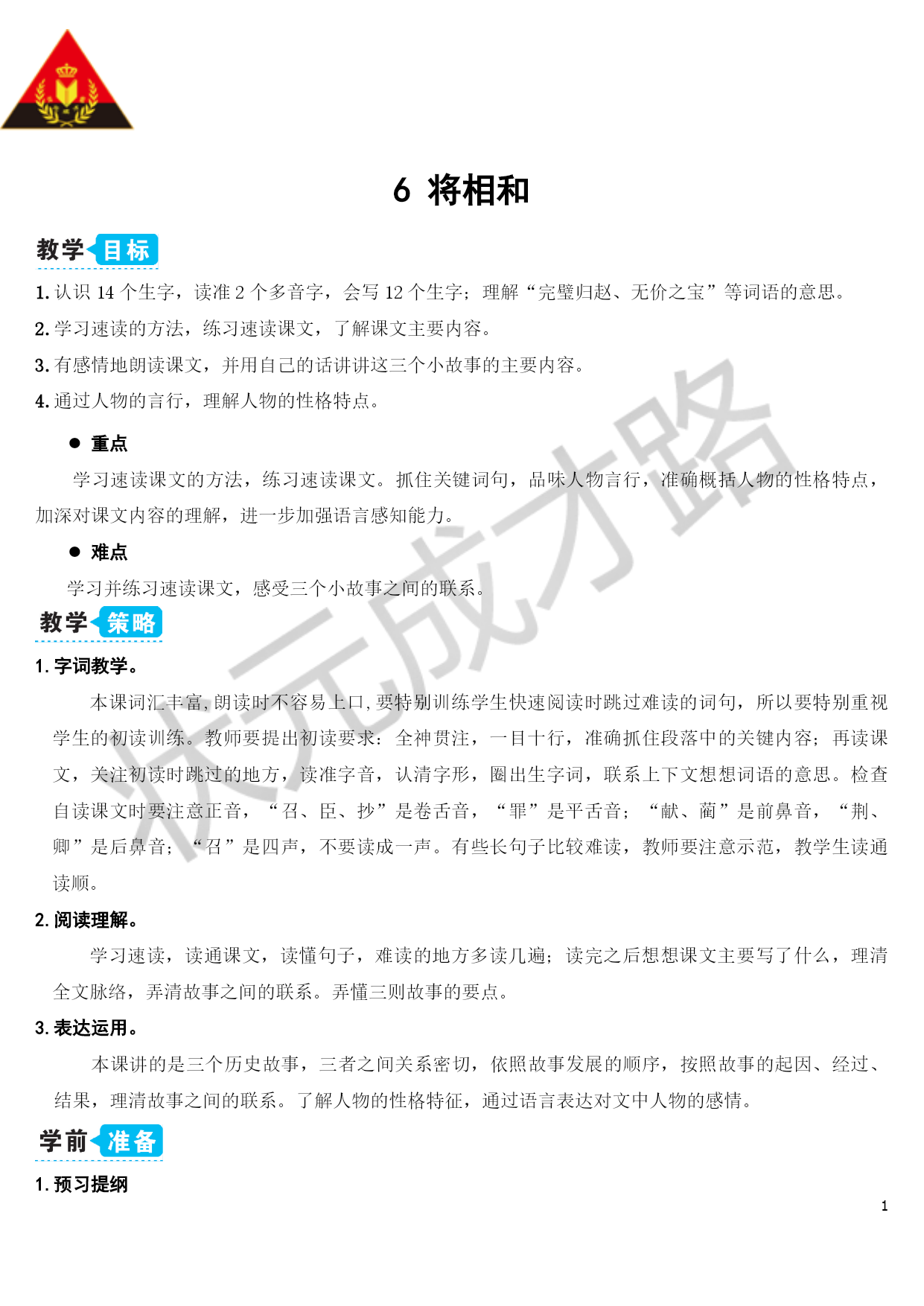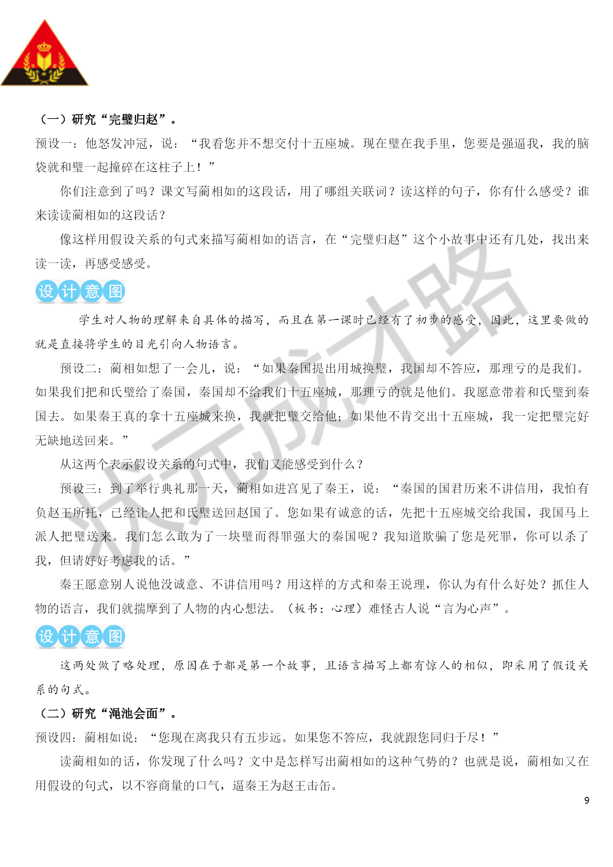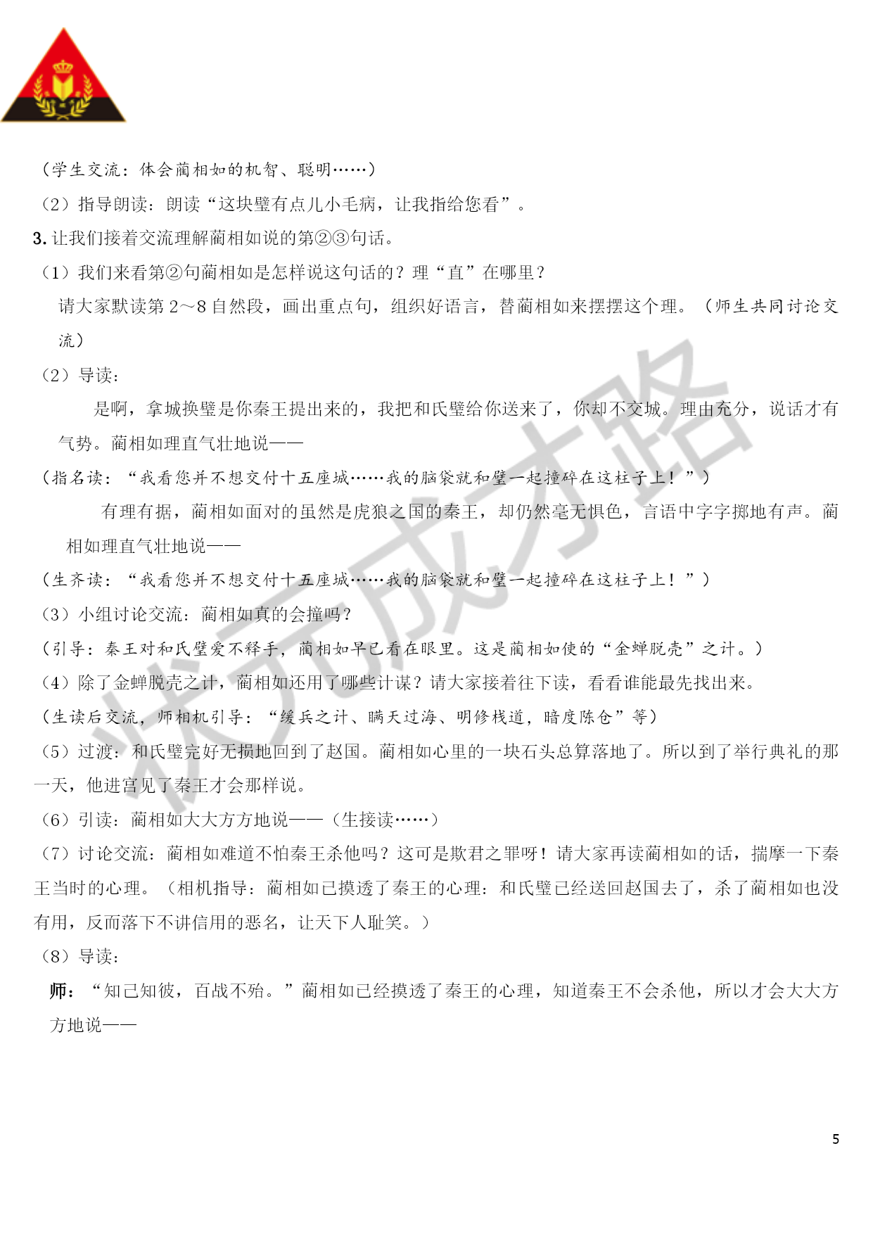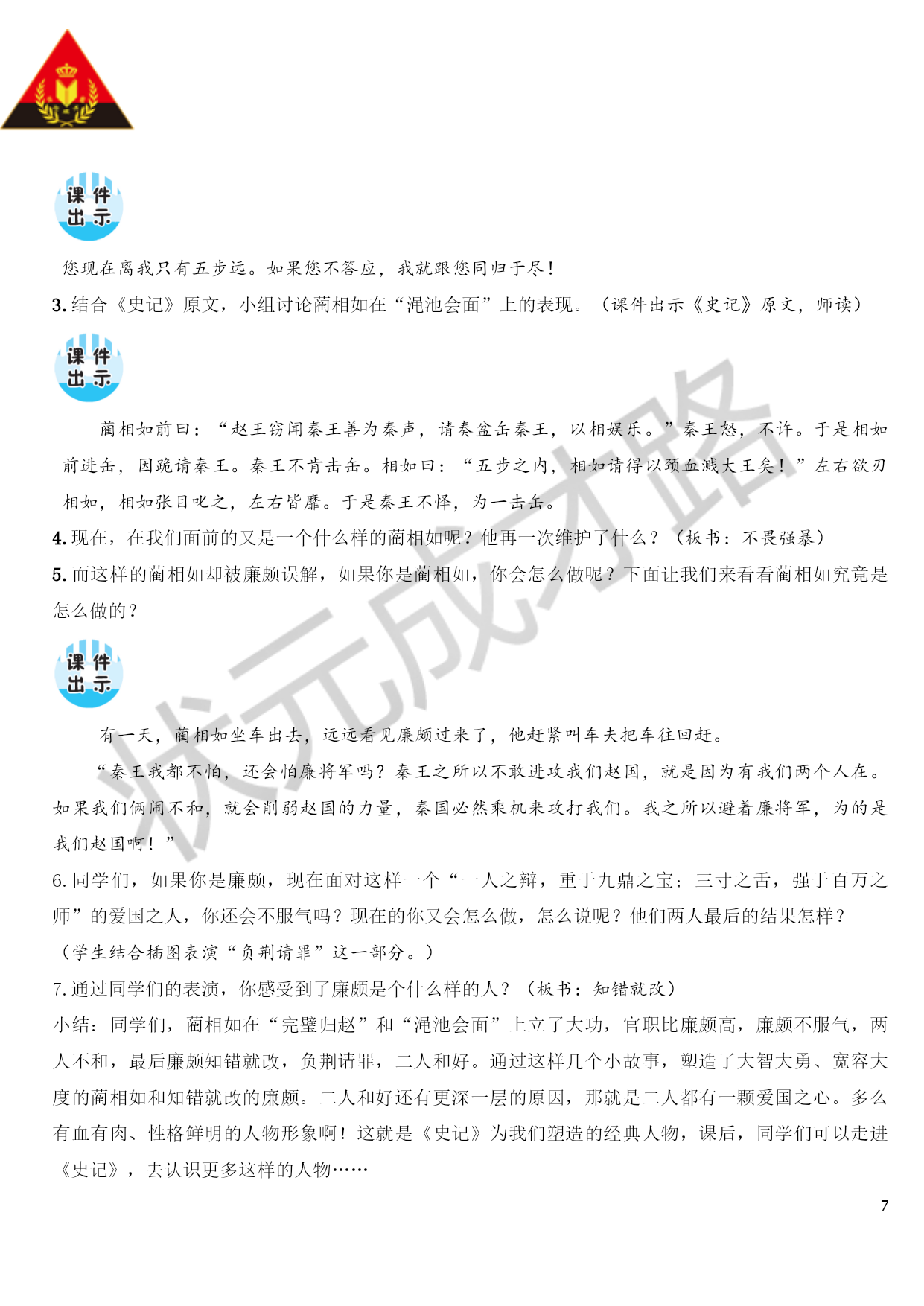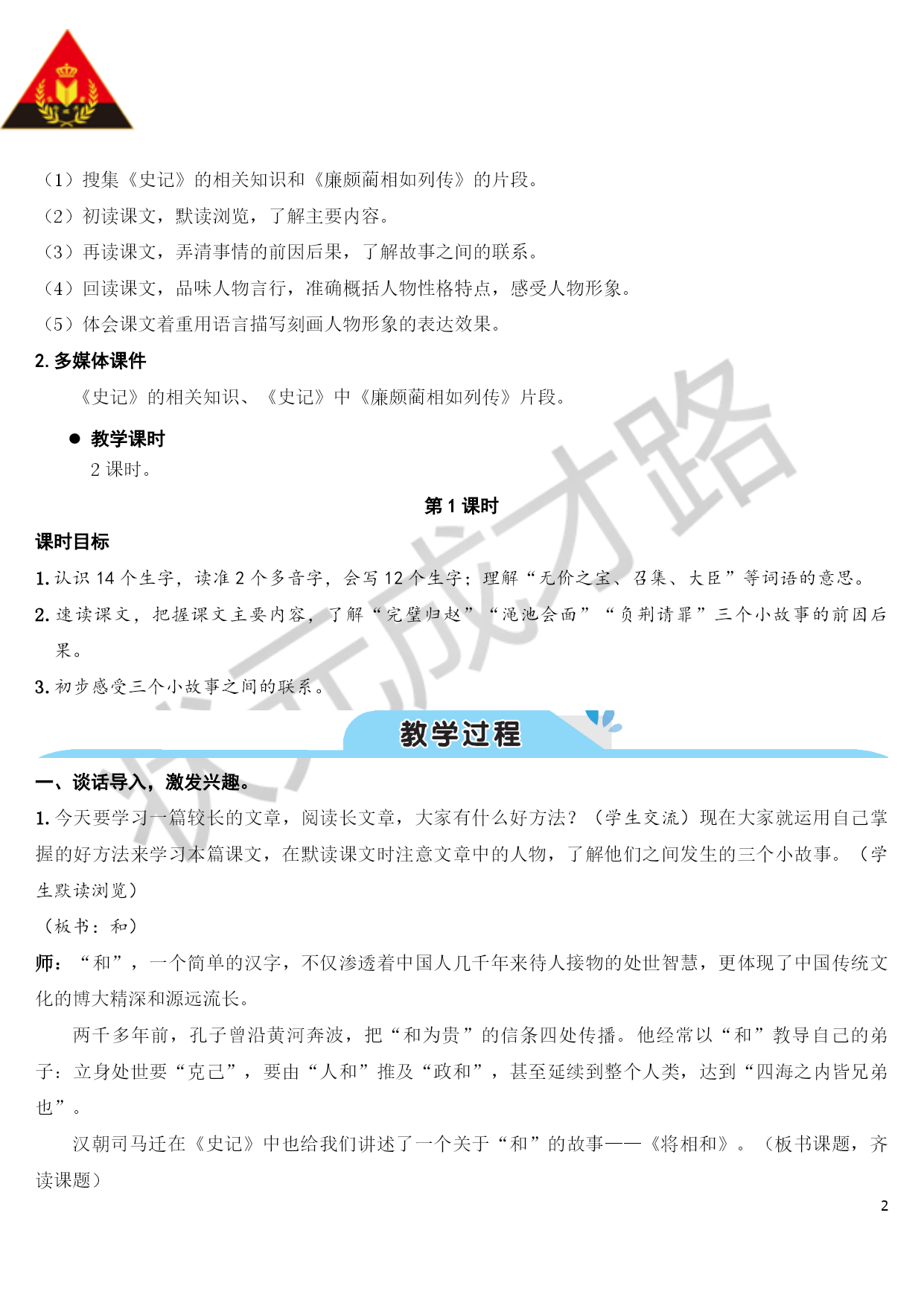 PAGEPAGE886将相和1.认识14个生字,读准2个多音字,会写12个生字;理解“完璧归赵、无价之宝”等词语的意思。2.学习速读的方法,练习速读课文,了解课文主要内容。3.有感情地朗读课文,并用自己的话讲讲这三个小故事的主要内容。4.通过人物的言行,理解人物的性格特点。重点学习速读课文的方法,练习速读课文。抓住关键词句,品味人物言行,准确概括人物的性格特点,加深对课文内容的理解,进一步加强语言感知能力。难点学习并练习速读课文,感受三个小故事之间的联系。1.字词教学。本课词汇丰富,朗读时不容易上口,要特别训练学生快速阅读时跳过难读的词句,所以要特别重视学生的初读训练。教师要提出初读要求:全神贯注,一目十行,准确抓住段落中的关键内容;再读课文,关注初读时跳过的地方,读准字音,认清字形,圈出生字词,联系上下文想想词语的意思。检查自读课文时要注意正音,“召、臣、抄”是卷舌音,“罪”是平舌音;“献、蔺”是前鼻音,“荆、卿”是后鼻音;“召”是四声,不要读成一声。有些长句子比较难读,教师要注意示范,教学生读通读顺。2.阅读理解。学习速读,读通课文,读懂句子,难读的地方多读几遍;读完之后想想课文主要写了什么,理清全文脉络,弄清故事之间的联系。弄懂三则故事的要点。3.表达运用。本课讲的是三个历史故事,三者之间关系密切,依照故事发展的顺序,按照故事的起因、经过、结果,理清故事之间的联系。了解人物的性格特征,通过语言表达对文中人物的感情。1.预习提纲(1)搜集《史记》的相关知识和《廉颇蔺相如列传》的片段。(2)初读课文,默读浏览,了解主要内容。(3)再读课文,弄清事情的前因后果,了解故事之间的联系。(4)回读课文,品味人物言行,准确概括人物性格特点,感受人物形象。(5)体会课文着重用语言描写刻画人物形象的表达效果。2.多媒体课件《史记》的相关知识、《史记》中《廉颇蔺相如列传》片段。教学课时2课时。第1课时课时目标1.认识14个生字,读准2个多音字,会写12个生字;理解“无价之宝、召集、大臣”等词语的意思。2.速读课文,把握课文主要内容,了解“完璧归赵”“渑池会面”“负荆请罪”三个小故事的前因后果。3.初步感受三个小故事之间的联系。一、谈话导入,激发兴趣。1.今天要学习一篇较长的文章,阅读长文章,大家有什么好方法?(学生交流)现在大家就运用自己掌握的好方法来学习本篇课文,在默读课文时注意文章中的人物,了解他们之间发生的三个小故事。(学生默读浏览)(板书:和)师:“和”,一个简单的汉字,不仅渗透着中国人几千年来待人接物的处世智慧,更体现了中国传统文化的博大精深和源远流长。两千多年前,孔子曾沿黄河奔波,把“和为贵”的信条四处传播。他经常以“和”教导自己的弟子:立身处世要“克己”,要由“人和”推及“政和”,甚至延续到整个人类,达到“四海之内皆兄弟也”。汉朝司马迁在《史记》中也给我们讲述了一个关于“和”的故事——《将相和》。(板书课题,齐读课题)2.检查预习,初步了解对课文内容的掌握情况。同学们课前已经预习了课文,那课文中的“将”“相”分别指的是谁?文章讲了几个小故事?(相机引出:“将”指廉颇,“相”指蔺相如,课文讲了“完璧归赵”“渑池会面”“负荆请罪”三个小故事,并在板书中指导书写生字“荆”。)通过对“和”字的讲解,让学生感受中国传统文化的博大精深和源远流长的同时,自然过渡到本课的主题,让学生产生阅读的兴趣。检查预习环节,根据课前的预习,初步了解学生对课文内容的掌握情况。二、学习新课,探究主题。(一)找准矛盾焦点,形成探究主题。1.题目是《将相和》,那肯定有不和的时候,为什么不和呢?快速浏览课文,看看廉颇是怎么说的。2.生读文,找到第16自然段廉颇说的话,指名读。“我廉颇立下了那么多战功,他蔺相如就靠一张嘴,反而爬到我头上去了。要是我碰见他,一定要让他下不了台!”3.你知道廉颇为什么这么说吗?让我们一起走进《史记》中描写蔺相如和廉颇的片段。廉颇者,赵之良将也。赵惠文王十六年,廉颇为赵将,伐齐,大破之,取阳晋,拜为上卿,以勇气闻于诸侯。蔺相如者,赵人也,为赵宦者令缪贤舍人。4.看了这些资料,你有什么感受?(学生交流)5.指导朗读:是啊,廉颇是上卿,而蔺相如出身低微,他只是赵国宦官缪贤家的一个门客,而这样的人最后职位却比廉颇还要高,你是不是也会为廉颇抱不平呢?来,把你此时此刻的心情通过朗读表达出来。6.生自由练读后师指名读,师生共同评议。小结:在廉颇的心目中,自己是身经百战、屡建奇功的大功臣。而蔺相如只会耍嘴皮子,那么蔺相如到底是不是只会耍嘴皮子呢?官职到底该不该升?这是咱们要重点研究的问题。(板书:嘴?)从“矛