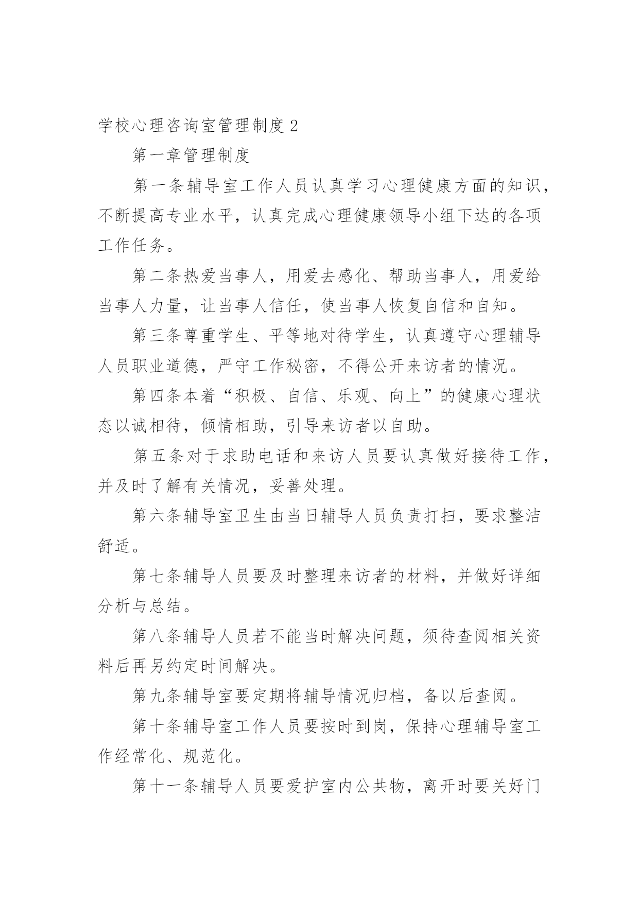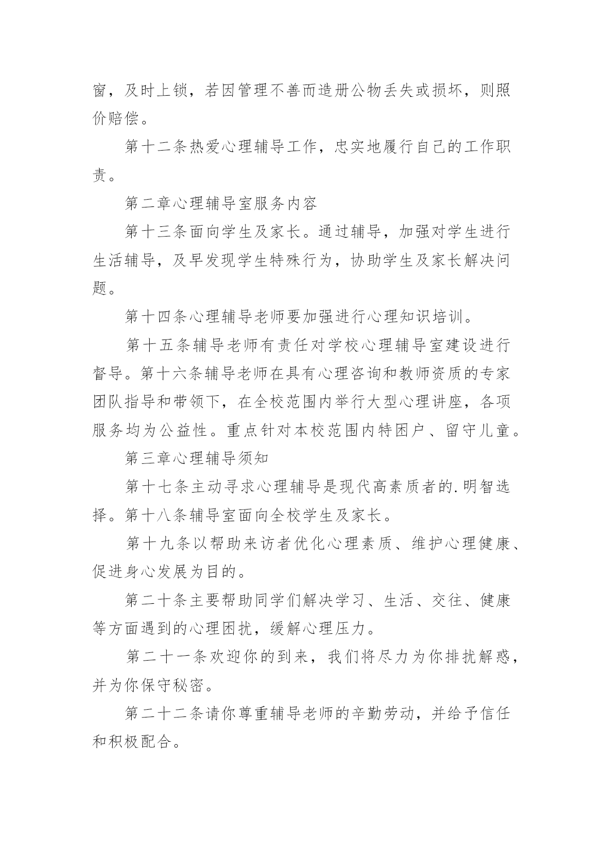 学校心理咨询室管理制度学校心理咨询室管理制度2篇(集合)在日新月异的现代社会中,很多情况下我们都会接触到制度,制度是要求成员共同遵守的规章或准则。制度到底怎么拟定才合适呢?以下是小编为大家收集的学校心理咨询室管理制度,欢迎大家分享。学校心理咨询室管理制度1第一条:本咨询室的宗旨是辅导学生的心理卫生,以各种方式方法帮助学生提高心理健康水平,同时为教职工服务。第二条:心理咨询工作者应对来访者的有关资料、档案予以_;如采用案例教学、科研或写作时,应适当隐去那些可能会据以辨认出服务对象的有关信息。第三条:在心理咨询过程中,如发现咨询者有危害其自身生命和危及社会安全的情况,心理咨询工作者有责任立即采取必要的措施,防止意外事件的.发生。第四条:心理咨询工作者应注意保持情绪稳定,在自身处在极度的情绪波动状态时,应回避接待来访者。第五条:心理咨询工作者的工作原则在于指导来访者自立自强,从正面促进其成长。第六条:对来访者认真负责,咨询结束后,需及时整理、完善咨询记录卡。第七条:保持和维护咨询室的干净、整洁。学校心理咨询室管理制度2第一章管理制度第一条辅导室工作人员认真学习心理健康方面的知识,不断提高专业水平,认真完成心理健康领导小组下达的各项工作任务。第二条热爱当事人,用爱去感化、帮助当事人,用爱给当事人力量,让当事人信任,使当事人恢复自信和自知。第三条尊重学生、平等地对待学生,认真遵守心理辅导人员职业道德,严守工作秘密,不得公开来访者的情况。第四条本着“积极、自信、乐观、向上”的健康心理状态以诚相待,倾情相助,引导来访者以自助。第五条对于求助电话和来访人员要认真做好接待工作,并及时了解有关情况,妥善处理。第六条辅导室卫生由当日辅导人员负责打扫,要求整洁舒适。第七条辅导人员要及时整理来访者的材料,并做好详细分析与总结。第八条辅导人员若不能当时解决问题,须待查阅相关资料后再另约定时间解决。第九条辅导室要定期将辅导情况归档,备以后查阅。第十条辅导室工作人员要按时到岗,保持心理辅导室工作经常化、规范化。第十一条辅导人员要爱护室内公共物,离开时要关好门窗,及时上锁,若因管理不善而造册公物丢失或损坏,则照价赔偿。第十二条热爱心理辅导工作,忠实地履行自己的工作职责。第二章心理辅导室服务内容第十三条面向学生及家长。通过辅导,加强对学生进行生活辅导,及早发现学生特殊行为,协助学生及家长解决问题。第十四条心理辅导老师要加强进行心理知识培训。第十五条辅导老师有责任对学校心理辅导室建设进行督导。第十六条辅导老师在具有心理咨询和教师资质的专家团队指导和带领下,在全校范围内举行大型心理讲座,各项服务均为公益性。重点针对本校范围内特困户、留守儿童。第三章心理辅导须知第十七条主动寻求心理辅导是现代高素质者的.明智选择。第十八条辅导室面向全校学生及家长。第十九条以帮助来访者优化心理素质、维护心理健康、促进身心发展为目的。第二十条主要帮助同学们解决学习、生活、交往、健康等方面遇到的心理困扰,缓解心理压力。第二十一条欢迎你的到来,我们将尽力为你排扰解惑,并为你保守秘密。第二十二条请你尊重辅导老师的辛勤劳动,并给予信任和积极配合。